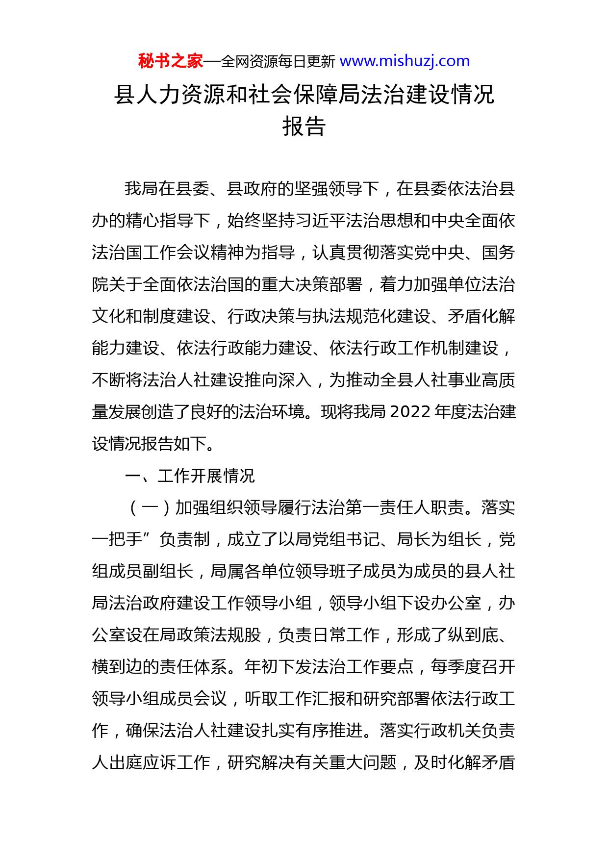 秘书之家—全网资源每日更新www.mishuzj.com县人力资源和社会保障局法治建设情况报告我局在县委、县政府的坚强领导下,在县委依法治县办的精心指导下,始终坚持习近平法治思想和中央全面依法治国工作会议精神为指导,认真贯彻落实党中央、国务院关于全面依法治国的重大决策部署,着力加强单位法治文化和制度建设、行政决策与执法规范化建设、矛盾化解能力建设、依法行政能力建设、依法行政工作机制建设,不断将法治人社建设推向深入,为推动全县人社事业高质量发展创造了良好的法治环境。现将我局2022年度法治建设情况报告如下。一、工作开展情况(一)加强组织领导履行法治第一责任人职责。落实一把手”负责制,成立了以局党组书记、局长为组长,党组成员副组长,局属各单位领导班子成员为成员的县人社局法治政府建设工作领导小组,领导小组下设办公室,办公室设在局政策法规股,负责日常工作,形成了纵到底、横到边的责任体系。年初下发法治工作要点,每季度召开领导小组成员会议,听取工作汇报和研究部署依法行政工作,确保法治人社建设扎实有序推进。落实行政机关负责人出庭应诉工作,研究解决有关重大问题,及时化解矛盾秘书之家—全网资源每日更新www.mishuzj.com纠纷案件。坚决贯彻落实县委县政府重要工作决策部署,积极发挥人社职能,进一步完善政策、优化服务,全力完成各项工作任务。(二)深入推进行政审批服务便民化工作。根据上级业务部门的政务服务事项标准化工作部署要求,认真研究梳理我县人社系统行政审批和公共服务事项清单目录,切实做好窗口办理和网上办理等标准化建设,优化行政审批和网上办事流程。紧紧国绕窗口标准化建设,线下设立7个综合一窗,推行“前台综合受理、后台分类审批、统一窗口出件”的服务模式,实现“代理办、打包办、提速办、简便办”;梳理141项政务服务清单,依托XX省人力资源和社会保障公共服务平台以及XX省金保工程一体化平台,全面实现了企业高频事项“网上办”,企业单位参保从“最多跑一次”变为“零次跑”。常态化组织开展岗位大练兵、领导干部走流程,扎实推进政务服务“好差评”,群众满意率达99%以上。加强社会信用体系建设,在网站及时作出公开承诺。建立健全“双公示”信息归集制度,及时开展“双公示”工作。进一步加强事中事后监管,共开展“双随机、一公开”检查3批次,检查企业15家。(三)着力提高千部法治思维和行政能力。一是局党组带头学法。通过党组理论学习中心组等形式开展法律法秘书之家—全网资源每日更新www.mishuzj.com规的学习,深入学习贯彻《劳动法》《保障农民工工资支付条例》等,提升班子成员依法行政能力。二是加强对干部法治学习。利用支部学习、党建云平台、人社系统比武大练兵APP等学习平台,认真落实年度学法制度和学法计划,以集中学习和自学两种形式展开。组织学习了《劳动合同法》《就业促进法》《公务员法》《社会保险法》《工伤保险条例》《劳动保障监察条例》等内容,进一步提高广大干部职工依法行政能力。三是提升干部行政能力。组织局系统业务领导和股级干部职工讲解业务相关法律和政策“人社大讲堂”3次。加强人社工作人员服务能力和服务水平培训教育,积极派员参加上级部门组织的行政执法等各种培训,不断地加强专业知识的学习,提高法治水平,更好地依法行政及工作人员的执法行为。(四)深入开展普法活动营造用法氛围。一是开展创业就业宣传活动。在XX就业APP、政府网站、村民微信群、就业创业服务平台微信公众号、就业官方抖音等平台大力引导广大农民增强‘“就业一人,脱贫一家”的意识,鼓励引导农民走出家门进厂门,实现就业增收;通过县、乡、村三级公共就业服务平台,提升就业服务精细化水平,減少农民工盲目出行导致的跨区域流动;二是积极开展社保宣传工作。推进社会保险扩面征缴,大力开展以贯彻《社会保险法》为主题的咨询活动,现场为群众解疑秘书之家—全网资源每日更新www.mishuzj.com释惑,接受社保政策的咨询,使社保政策家喻户晓,群众参保意识大大提高,取得了良好的效果,共派发各类社保宣传材料20000余份。三是积极开展“法律六进”活动。把法律进机关、进乡村、进社区、进学校、进企业、进单位落实到位。“五一”劳动节期间,组织干部在县世纪广场开展专场劳动关系、农民工权益保护等方面进行宣传。在社区内设置宣传栏、发放宣传册等,广泛宣传人社工作政策、程序等,切实提高人力资源社会保障宣传的普及度和社会知晓度。(五)规范行政执法努力化解矛盾纠纷。一是劳动人事争议案件调解仲裁效能不断提升。劳动人事争议仲裁院当期受理案件67件,仲裁调解结案175件。仲裁裁决结案46件(其中一裁终局42件),审理中案件6件,涉案金额92.92万元。截至目前期限内结案率为100%,调解成功率为71.25%。二是治理拖欠农民工工资力度进一步加大。劳动监察执法大队主动巡查用人单位120户,书面审查用人单位32户;受理投诉举报15件;办结率99%,开展《保障农民工工资支付条例》等法律法规广场宣传1次。同时畅通举报投诉渠道,在建筑领域全面推行农民工欠薪维权一码通、进一步规范了建筑工地维权公示牌,对内不断提升服务质量,对外不断加强日常巡查与书面审查力度,发