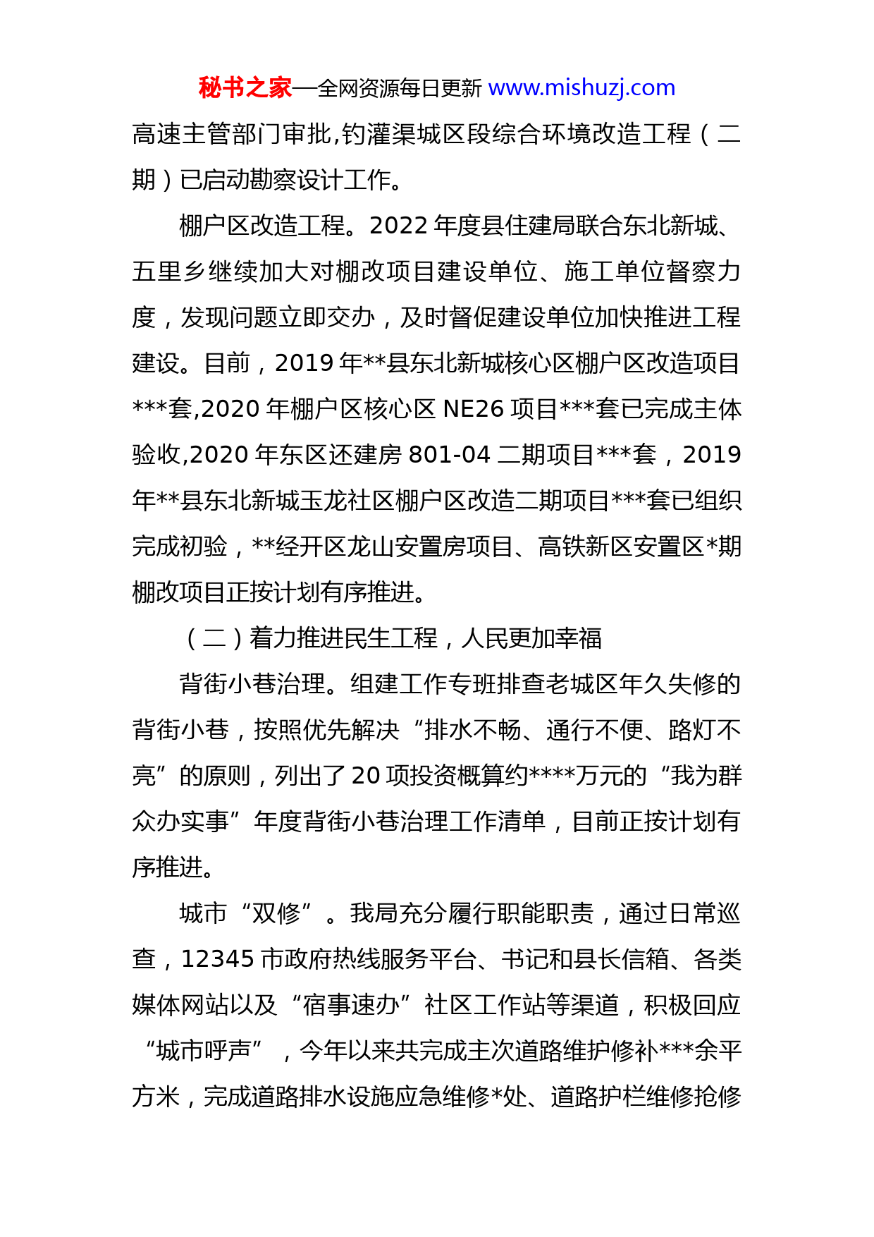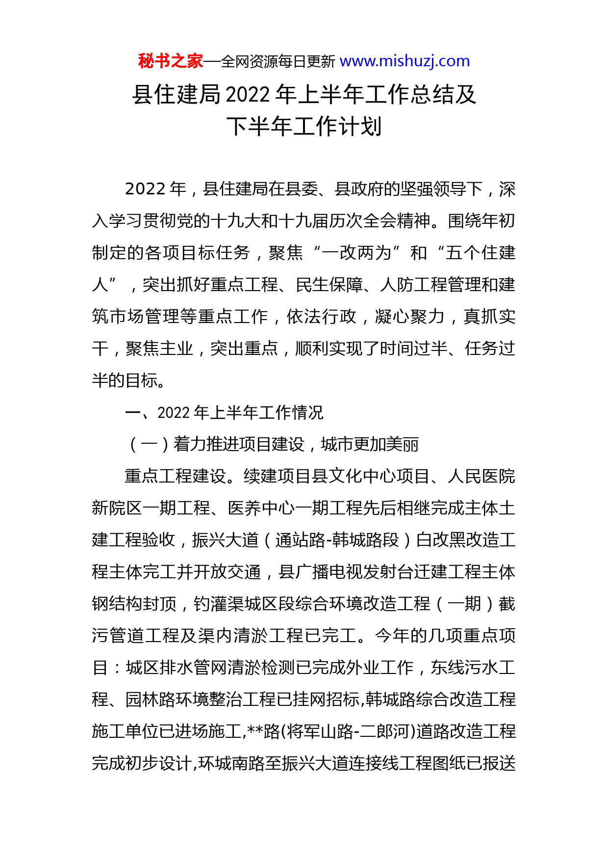 秘书之家—全网资源每日更新www.mishuzj.com县住建局2022年上半年工作总结及下半年工作计划2022年,县住建局在县委、县政府的坚强领导下,深入学习贯彻党的十九大和十九届历次全会精神。围绕年初制定的各项目标任务,聚焦“一改两为”和“五个住建人”,突出抓好重点工程、民生保障、人防工程管理和建筑市场管理等重点工作,依法行政,凝心聚力,真抓实干,聚焦主业,突出重点,顺利实现了时间过半、任务过半的目标。一、2022年上半年工作情况(一)着力推进项目建设,城市更加美丽重点工程建设。续建项目县文化中心项目、人民医院新院区一期工程、医养中心一期工程先后相继完成主体土建工程验收,振兴大道(通站路-韩城路段)白改黑改造工程主体完工并开放交通,县广播电视发射台迁建工程主体钢结构封顶,钓灌渠城区段综合环境改造工程(一期)截污管道工程及渠内清淤工程已完工。今年的几项重点项目:城区排水管网清淤检测已完成外业工作,东线污水工程、园林路环境整治工程已挂网招标,韩城路综合改造工程施工单位已进场施工,路(将军山路-二郎河)道路改造工程完成初步设计,环城南路至振兴大道连接线工程图纸已报送秘书之家—全网资源每日更新www.mishuzj.com高速主管部门审批,钓灌渠城区段综合环境改造工程(二期)已启动勘察设计工作。棚户区改造工程。2022年度县住建局联合东北新城、五里乡继续加大对棚改项目建设单位、施工单位督察力度,发现问题立即交办,及时督促建设单位加快推进工程建设。目前,2019年县东北新城核心区棚户区改造项目套,2020年棚户区核心区NE26项目套已完成主体验收,2020年东区还建房801-04二期项目套,2019年县东北新城玉龙社区棚户区改造二期项目套已组织完成初验,经开区龙山安置房项目、高铁新区安置区期棚改项目正按计划有序推进。(二)着力推进民生工程,人民更加幸福背街小巷治理。组建工作专班排查老城区年久失修的背街小巷,按照优先解决“排水不畅、通行不便、路灯不亮”的原则,列出了20项投资概算约万元的“我为群众办实事”年度背街小巷治理工作清单,目前正按计划有序推进。城市“双修”。我局充分履行职能职责,通过日常巡查,12345市政府热线服务平台、书记和县长信箱、各类媒体网站以及“宿事速办”社区工作站等渠道,积极回应“城市呼声”,今年以来共完成主次道路维护修补余平方米,完成道路排水设施应急维修处、道路护栏维修抢修秘书之家—全网资源每日更新www.mishuzj.com次共计块等修补工作。建立了城区条道路、条绿道、个公园、个广场约万平方园林绿化的分区管理目录,完成新增和改造万㎡绿地面积、个街头绿地、公里绿道的生态修复工作。惠民项目谋划。根据群众诉求和城区街巷、公园、道路、排水短板,结合“宿事速办”工作要求,谋划改造项目项,并按照谋划项目清单,推进各项目建设进度,目前,富康路中学坡道改造、松滋二站向阳河口拦水坝、城西路高速桥积水点整治、康复巷支弄排水管道改造、向阳河两侧空置地环境整治项目均已启动设计等前期工作。城乡供水一体化。城乡供水一体化项目稳步推进,已完成项目可研报告编制,完成水资源论证报告编制,千岭三水厂地块控制性详细规划和项目土地房屋征收补偿工作实施方案已经县政府批准,项目近期一阶段第三自来水厂及配水管网工程初步设计和三水厂、五里加压站规划建筑设计方案通过专家评审,近期准备挂网招标。乡镇政府驻地污水处理项目目前完成了对项目EPCO招标招标文件等文件进行了修改完善和初步审查,计划6月底挂网招标。污水提质提质增效。实施管网排查整治和管网新建改造工程,我县管网病害点得到修复,城区污水收集体系逐步健全,污水有效收集,污水处理厂进水浓度得到提升,2022年5月19日,顺利通过市住建局、市生态环境秘书之家—全网资源每日更新www.mishuzj.com局联合验收,完成了整改销号工作。信访维稳工作。紧紧围绕县委县政府中心工作,局党组召开信访化解专题会议,细化任务,由党组成员牵头成立个信访化解专班,坚持矛盾有因、问题有解、化解有方,以钉钉子精神攻坚化解“骨头案”“钉子案”,努力做到“事心双解”。以“‘一改两为’我做什么”为契机,践行群众路线,站稳群众立场,一切以群众意愿为本、以群众利益为重、以群众满意为准,带着感情和责任做好听民声、纾民困、护民利、聚民心各项工作。目前已成功化解重复信访户等历史遗留信访积案,及时化解方名居住户信访矛盾隐患,积极稳控协调解等小区业主反馈诉求。(三)着力推进标准管理,行业更规范建筑市场执法监管。全面加强实名制管理,开展了关键岗位人员到岗履职行为执法检查,系统更新率和到岗率达%以上;开展了首轮监理企业资质动态核查,全县监理企业均处于良性运营状态;践行一改两为五做到,主动服务企业,对照县政府7号文件,牵头兑现企业升级奖励万元;全面启动信用评价系统,我县家企业登录入驻,其中AAA企业家(全市AAA企业仅家),AA企业家,A企业家,为下一步在全市招投标市场积累信用加分优势打下坚实基础,增加企业中标概率。强化建筑业产值秘书之家—全网资源每日更新www.mishuzj.com入统,上半年新增入库企业家,第一季度建筑业产值总量亿元,同比增长%,增速全市县排名第五。房地产市场监管。修