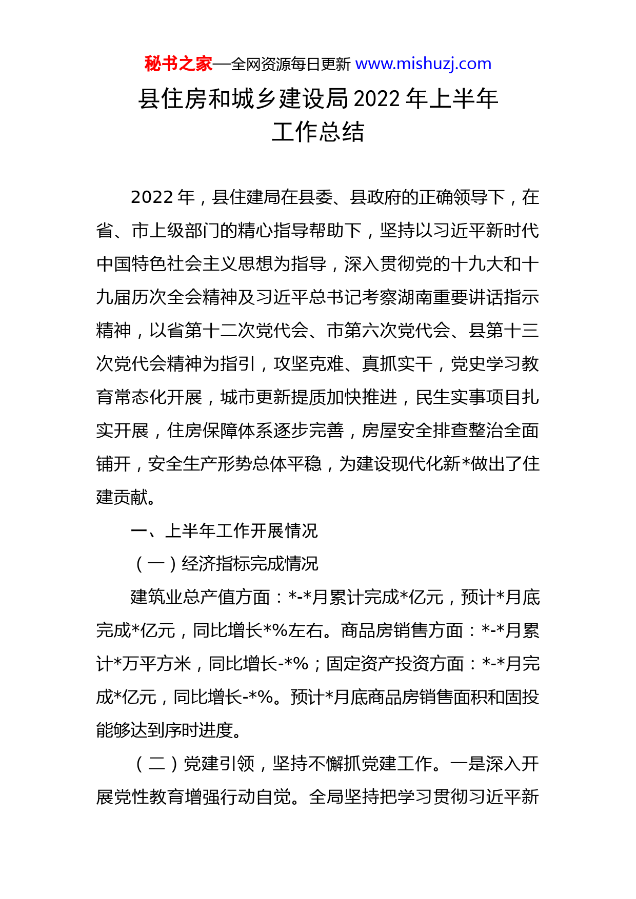 秘书之家—全网资源每日更新www.mishuzj.com县住房和城乡建设局2022年上半年工作总结2022年,县住建局在县委、县政府的正确领导下,在省、市上级部门的精心指导帮助下,坚持以习近平新时代中国特色社会主义思想为指导,深入贯彻党的十九大和十九届历次全会精神及习近平总书记考察湖南重要讲话指示精神,以省第十二次党代会、市第六次党代会、县第十三次党代会精神为指引,攻坚克难、真抓实干,党史学习教育常态化开展,城市更新提质加快推进,民生实事项目扎实开展,住房保障体系逐步完善,房屋安全排查整治全面铺开,安全生产形势总体平稳,为建设现代化新做出了住建贡献。一、上半年工作开展情况(一)经济指标完成情况建筑业总产值方面:-月累计完成亿元,预计月底完成亿元,同比增长%左右。商品房销售方面:-月累计万平方米,同比增长-%;固定资产投资方面:-月完成亿元,同比增长-%。预计月底商品房销售面积和固投能够达到序时进度。(二)党建引领,坚持不懈抓党建工作。一是深入开展党性教育增强行动自觉。全局坚持把学习贯彻习近平新秘书之家—全网资源每日更新www.mishuzj.com时代中国特色社会主义思想作为首要政治任务,持续深化巩固党史学习教育成果,不断引导党员干部深刻把握“两个确立”,自觉做到“两个维护”。二是持续规范党内政治生活。严格落实“三会一课”、组织生活会、民主生活会、主题党日活动等组织生活制度,促进各项党内政治生活扎实开展,充分发挥“学习强国”、“干部网络学习”、“新湖南”等信息化平台作用,推进党员学习教育常态化、全覆盖,稳步提升党员政治素养。三是在学用结合中补钙铸魂。开展“喜迎二十大”、“领导讲党课”和““我为群众办实事”等主题党日活动次,党支部集中学习场次,全体党员信念更加坚定、党性更加坚强。四是突出抓主抓重,夯实党建基础。坚持把党建工作与中心工作同研究、同安排、同考核。先后次召开党组会议专题研究部署党建工作,班子成员深入各支部开展党建专项督查次,严格落实党支部联系点制度,督促落实班子成员联系包抓乡村振兴联系村党支部制度,将责任层层压实。顺利完成驻村人员调配优化工作,确保乡村振兴取得实效。五是坚定不移推进全面从严治党。集中观看《巡视利剑》等警示片,《榜样》等先进模范影片。深刻剖析“专案”根源,以案为鉴、以案促改、举一反三,下重力、出重手、求实效,治标治本。建立廉政目标责任制,细化措施落实主体责任,制订了《2022年党风廉政建设和反腐败工作责秘书之家—全网资源每日更新www.mishuzj.com任分工》、《党组党风廉政建设主体责任清单》。开展重点环节问题专项治理活动,从细节着手消除腐败发生。突出“三重一大”事项,切实找准廉政风险点,确定风险等级,形成廉政风险防控清单。六是坚决落实意识形态工作责任。局党组召开次专题会议研究意识形态工作。成立意识形态工作领导小组,层层签订《意识形态工作责任书》。制定了《意识形态工作方案》、《网络意识形态工作方案》,建立了意识形态工作联席会议制度,坚持正面宣传,健全住建系统网络意识形态的主阵地。(三)提质扩容,狠抓城乡建设高质量发展。以建设宜居、绿色、韧性、智慧、人文城市为目标,不断提升城市建设管理水平,促进城市高质量发展。一是狠抓垃圾处理。投资亿元,建成怀化市第一家县级生活垃圾焚烧发电厂,年初已点火投产。二是狠抓污水治理。2022年省、市下达我县任务指标为:完成个乡镇,厂站的乡镇污水处理设施建设。截至目前,已完成污水管网铺设公里,年度任务占比%。完成大江口镇、龙潭镇、两丫坪镇污水处理厂区“三通一平”建设,其中大江口镇污水调节池建成已完工。三是狠抓城镇老旧小区改造。2022年个老旧小区项目总投资额万元,至月底,已完成投资万元,占比%。2022年计划完成个老旧小区改造,投资万元,项目EPC招标已挂网,预计月底开工。四是狠抓既有住宅加装秘书之家—全网资源每日更新www.mishuzj.com电梯。县住建局积极谋划、多措并举扎实推动电梯加装工作,制定《县城既有住宅加装电梯情况排查摸底工作方案》《县城区既有多层住宅增设电梯工作办理实施细则》,与老旧小区改造工作同步推进。截至目前,共完成加装电梯审查台,开工台,完工台。在县(市)区方阵排名第二,经验做法在全市推广。五是狠抓城镇燃气建设。县城管道天然气综合利用项目总投资亿元,目前完成投资亿元(占%)。乡镇管道天然气项目,2022年计划投资万元,-月完成投资万元,占比%。双井、低庄共铺设主管网公里,场站土地调规中。六是狠抓城市基础设施建设。完成县城市棚户区改扩翻基础设施配套项目二期纬八路(菲芽幼儿园段)米建设,粮贸中路完成%工程量。完成县国有煤炭企业工矿棚户区改造配套基础设施建设项目纬五路%工程量。正在开展县城市棚户区改扩翻基础设施配套项目三期工程纬八路(农商银苑段)前期初步设计等前期工作。(四)紧盯目标,持续抓好住房保障工作。一是全力以赴抓好农村危房改造。2022年计划实施危房改造户,截至目前,已开工户,开工率%,竣工户,竣工率%。二是大力推进农村住房安全管理工作。年初我县被省住建厅列为农村住房安全监管和共同缔造示范县(全省仅县)。县领导高度重视该项工作,县政
