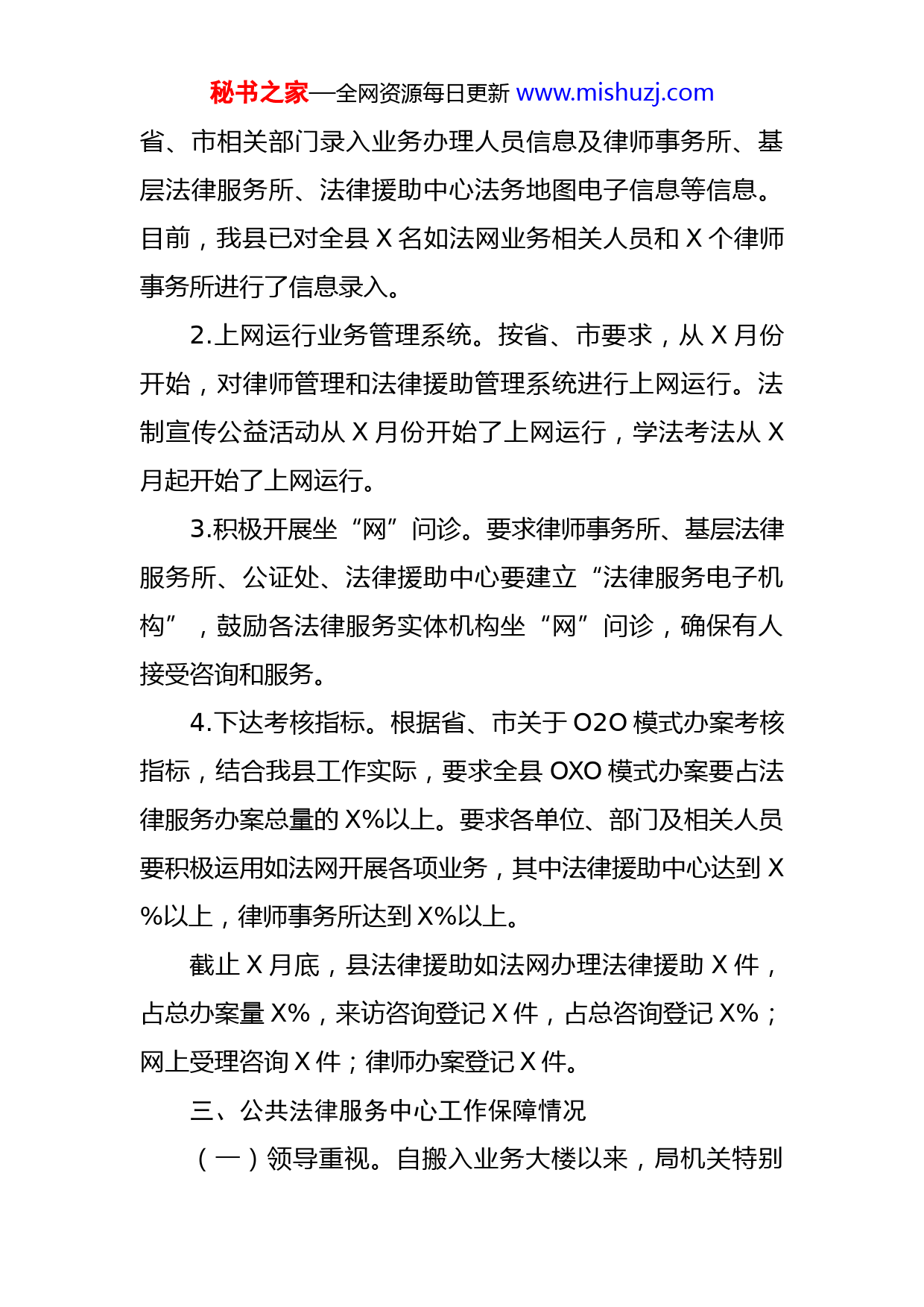 秘书之家—全网资源每日更新www.mishuzj.com县公共法律服务中心建设运行情况汇报一、公共法律服务中心建设情况桂阳县公共法律服务中心依托县司法局业务楼建设建成,位于业务楼一楼,于X年X月中旬投入使用,正式对外提供法律服务。该中心室内面积X㎡,总投资X万,设置了两个办事厅和监控室、打印室、等候大厅等功能室,服务内容覆盖了法律援助、公证服务、法律咨询、人民调解等司法行政相关法律服务及其他便民服务措施,并根据服务内容设置了X个岗位。二、公共法律服务中心运行管理情况(一)重视业务培训根据省市工作安排,召集如法网相关工作人员参加各级各类型培训。在年初根据省司法厅工作安排,积极参加如法网操做系统(法律援助)远程网络视频培训;另外,针对实践中存在的问题,还参加了市司法局举办的如法网特邀技术专家培训会。(二)树立目标,强化考核1.做好原始数据录入。根据省、市要求,要求“如法网”涉及股室、律师事务所、基层法律服务所及相关人员要高度重视“如法网”的使用,积极运用“如法网”开展律师管理、法律援助、法制宣传等业务活动;及时配合秘书之家—全网资源每日更新www.mishuzj.com省、市相关部门录入业务办理人员信息及律师事务所、基层法律服务所、法律援助中心法务地图电子信息等信息。目前,我县已对全县X名如法网业务相关人员和X个律师事务所进行了信息录入。2.上网运行业务管理系统。按省、市要求,从X月份开始,对律师管理和法律援助管理系统进行上网运行。法制宣传公益活动从X月份开始了上网运行,学法考法从X月起开始了上网运行。3.积极开展坐“网”问诊。要求律师事务所、基层法律服务所、公证处、法律援助中心要建立“法律服务电子机构”,鼓励各法律服务实体机构坐“网”问诊,确保有人接受咨询和服务。4.下达考核指标。根据省、市关于O2O模式办案考核指标,结合我县工作实际,要求全县OXO模式办案要占法律服务办案总量的X%以上。要求各单位、部门及相关人员要积极运用如法网开展各项业务,其中法律援助中心达到X%以上,律师事务所达到X%以上。截止X月底,县法律援助如法网办理法律援助X件,占总办案量X%,来访咨询登记X件,占总咨询登记X%;网上受理咨询X件;律师办案登记X件。三、公共法律服务中心工作保障情况(一)领导重视。自搬入业务大楼以来,局机关特别秘书之家—全网资源每日更新www.mishuzj.com重视公共法律服务中心建设。首先,争取该项目为今年市法律服务中心试点县,得到省、市领导的重视,推动中心的顺利建成。其次,明确分管领导及责任股室,保障公共法律服务中心与股室的衔接,确保中心工作顺利开展。再次,在县司法行政工作会议上,下发《关于落实省司法厅<关于加快如法网建设与应用的通知>的通知》,强调县公共法律服务中心工作的重要性,确保中心及如法网相关工作的落实情况。(二)健全组织体系。年初,经局机关领导班子研究明确,如法网和公共法律服务中心由谭家南副局长分管,县法律援助中心负责管理,具体负责如法网和公共法律服务中心前台接待,X法律服务热线来电和网上咨询的接待、录入、分流、督办、统计等工作。为充分发挥公共法律服务中心的作用,经局领导班子决定,在县法律援助中心、县公证处、政策法规股原有人员基础上,通过股室人员调解、政府购买方式增加人员力量到公共法律服务中心,完善中心人员结构,并且特别安排专人负责中心接待工作,包括如法网网上咨询接待工作。