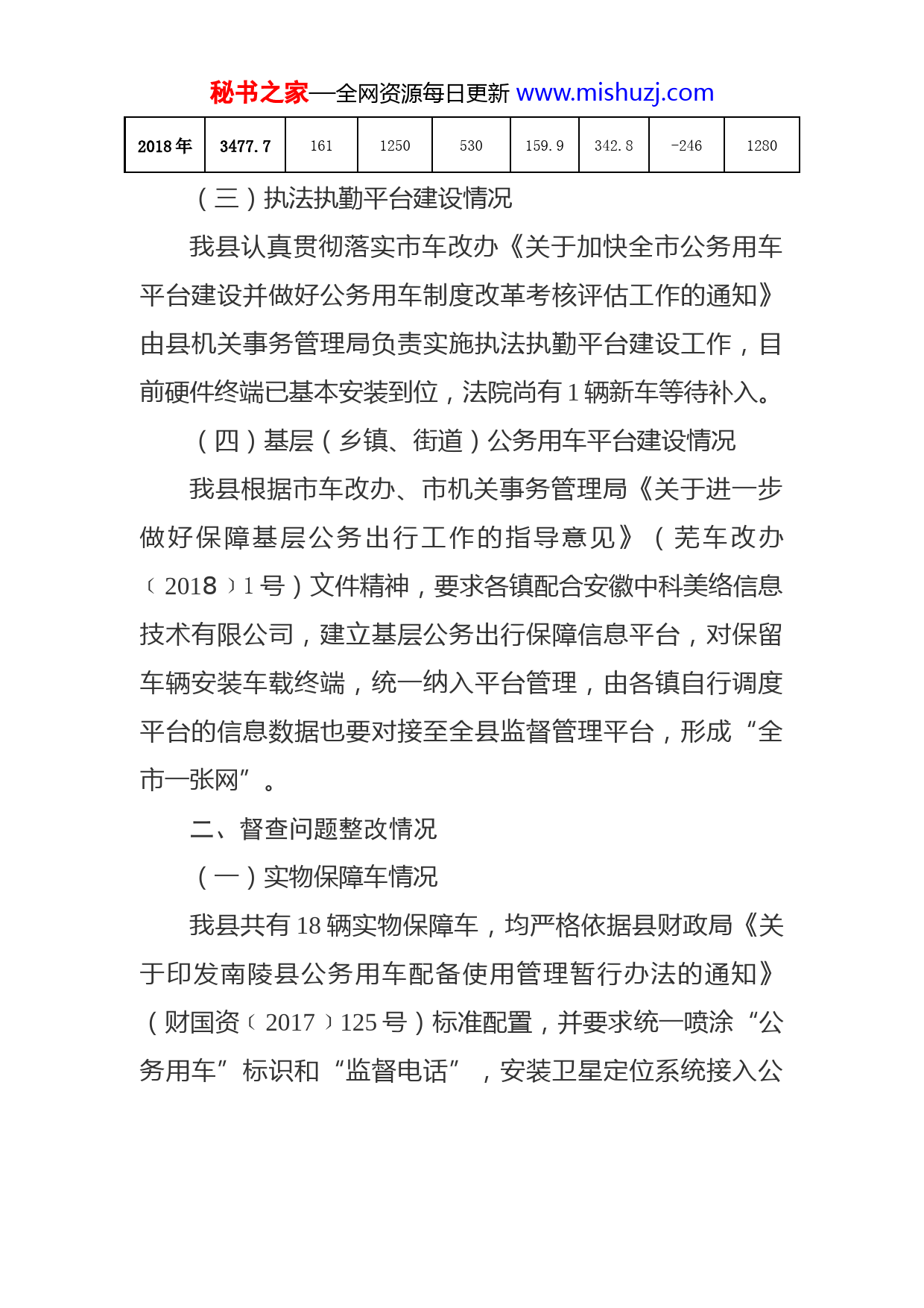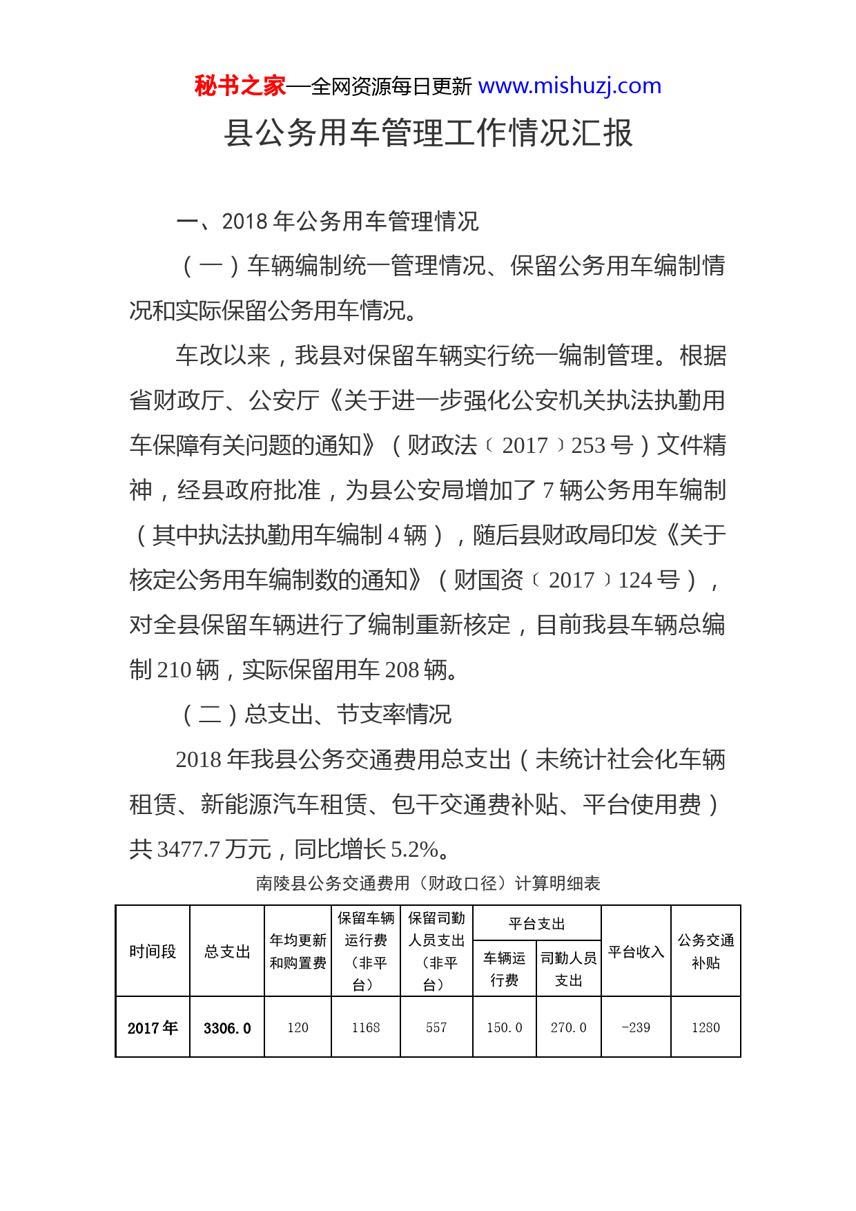 秘书之家—全网资源每日更新www.mishuzj.com县公务用车管理工作情况汇报一、2018年公务用车管理情况(一)车辆编制统一管理情况、保留公务用车编制情况和实际保留公务用车情况。车改以来,我县对保留车辆实行统一编制管理。根据省财政厅、公安厅《关于进一步强化公安机关执法执勤用车保障有关问题的通知》(财政法﹝2017﹞253号)文件精神,经县政府批准,为县公安局增加了7辆公务用车编制(其中执法执勤用车编制4辆),随后县财政局印发《关于核定公务用车编制数的通知》(财国资﹝2017﹞124号),对全县保留车辆进行了编制重新核定,目前我县车辆总编制210辆,实际保留用车208辆。(二)总支出、节支率情况2018年我县公务交通费用总支出(未统计社会化车辆租赁、新能源汽车租赁、包干交通费补贴、平台使用费)共3477.7万元,同比增长5.2%。南陵县公务交通费用(财政口径)计算明细表时间段总支出年均更新和购置费保留车辆运行费(非平台)保留司勤人员支出(非平台)平台支出平台收入公务交通补贴车辆运行费司勤人员支出2017年3306.01201168557150.0270.0-2391280秘书之家—全网资源每日更新www.mishuzj.com2018年3477.71611250530159.9342.8-2461280(三)执法执勤平台建设情况我县认真贯彻落实市车改办《关于加快全市公务用车平台建设并做好公务用车制度改革考核评估工作的通知》由县机关事务管理局负责实施执法执勤平台建设工作,目前硬件终端已基本安装到位,法院尚有1辆新车等待补入。(四)基层(乡镇、街道)公务用车平台建设情况我县根据市车改办、市机关事务管理局《关于进一步做好保障基层公务出行工作的指导意见》(芜车改办﹝2018﹞1号)文件精神,要求各镇配合安徽中科美络信息技术有限公司,建立基层公务出行保障信息平台,对保留车辆安装车载终端,统一纳入平台管理,由各镇自行调度平台的信息数据也要对接至全县监督管理平台,形成“全市一张网”。二、督查问题整改情况(一)实物保障车情况我县共有18辆实物保障车,均严格依据县财政局《关于印发南陵县公务用车配备使用管理暂行办法的通知》(财国资﹝2017﹞125号)标准配置,并要求统一喷涂“公务用车”标识和“监督电话”,安装卫星定位系统接入公秘书之家—全网资源每日更新www.mishuzj.com车管理信息平台。目前县督查室、县财政局、县审计局、县机关事务管理局正在开展联合专项督查工作。(二)班子副职用车情况根据巡查整改要求,我县已对四大班子及党委部门副职领导的相对固定用车模式进行调整,县领导用车时,由本人或所在部门办公室在公务用车平台提交用车申请,通过调度室进行随机派车,改变之前相对固定的派车模式。各乡镇班子副职未配备实物保障车辆,也无相对固定用车保障。(三)基层公务出行规范管理情况我县通过对保留车辆安装定位系统、进行标识化管理、定点停放、定点维修、节假日用车报备,各用车单位均建立纸质或线上的派车填单审批等制度,公务出行更加规范参改人员基本能自觉遵守各项制度规定,做到“坐车不拿钱、拿钱不坐车”,“公车私用”现象基本杜绝。三、存在问题与下一步工作计划(一)公务用车管理机制不顺自2016年3月完成车改以来,车改办作为临时改革机构持续运行近三年,难以满足常态化、长效化的全县公务用车管理工作需要,需上级部门尽快出台专项管理办法,明确县、镇两级公务用车管理部门,理顺管理机制、巩固改革成果,推动公务出行更加规范有序。秘书之家—全网资源每日更新www.mishuzj.com(二)乡镇公务出行保障成本升高车改后,我县各乡镇公务出行存在以下难题:一是乡镇公共交通相对市区及城区覆盖极为有限,干部出行成本较高。二是保障范围外频繁地下乡入村,是乡镇干部的工作日常,车改后车辆保留过少,非实物保障车辆由原来的40辆减少至8辆,已难以满足正常工作需要。三是乡镇有近一半在编工作人员为事业混编混岗,保障范围外出行车辆供应不足,保障范围内出行没有车补保障,同工不同酬的现状,一定程度上挫伤了此类人群的工作积极性。四是乡镇保障平台效能较差,理论上仅有1辆应急车通过平台调度,由于规模有限,反而比纸质派车单更为繁琐,且每年需增加近3万元的软件服务费用,经县车改办多次协调,仍有个别乡镇未与中科美络签订平台服务合同。除保留车辆外,我县各镇主要采用3种方式补充保障公务出行,依然存在诸多问题:一是采用新能源租赁车辆,但相关技术尚不成熟,且租赁成本相对于购买成本更高,与其租车使用,不如直接增加各镇新能源车辆编制。二是使用社会化租赁车辆,但我县除籍山镇(城关镇)外,绝大部分乡镇很难找到正规社会化车源,且使用成本相对于新能源租车更高。三是采取按距离远近定额制报销的办法予以保障,不仅最大化利用了乡镇干部的存量汽车资源,也解决了保障范围内其他身份人员的公务出行问题,得到秘书之家—全网资源每日更新www.mishuzj.com过中央和省车改办的肯定和推广,《人民日报》也进行过相关报道。经过近三年的实践,我县各乡镇基本确立了以包干制为主,其他方式为辅的保障模式,不过仍存在诸多挑战:例如补助标准不够统一、打折算法较为繁琐、用车情况尚不透明、档案管理有待完善、监督检查仍需强化。我县参考目前较为成熟的网约顺风车模式,将信息化管理技术、存量资源共享理念与