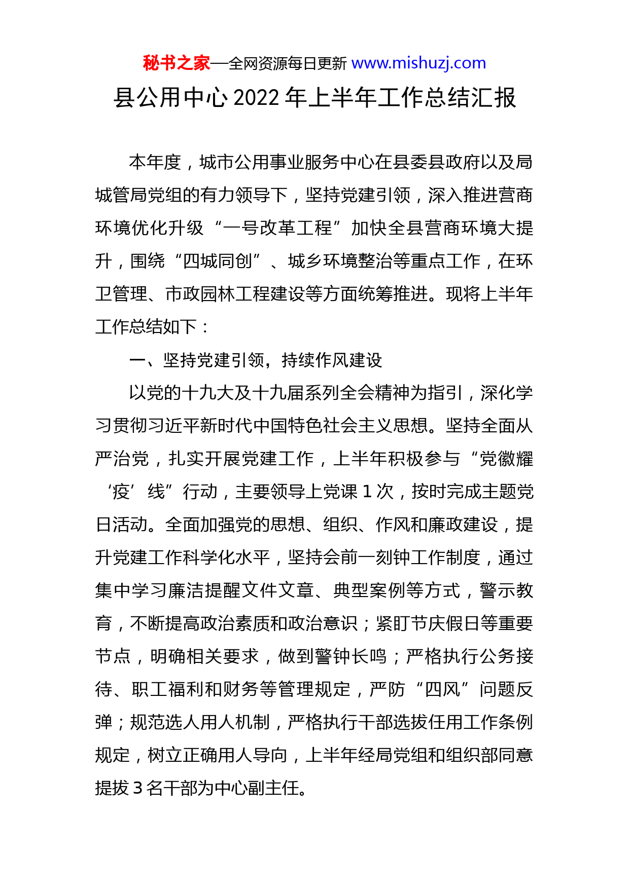 秘书之家—全网资源每日更新www.mishuzj.com县公用中心2022年上半年工作总结汇报本年度,城市公用事业服务中心在县委县政府以及局城管局党组的有力领导下,坚持党建引领,深入推进营商环境优化升级“一号改革工程”加快全县营商环境大提升,围绕“四城同创”、城乡环境整治等重点工作,在环卫管理、市政园林工程建设等方面统筹推进。现将上半年工作总结如下:一、坚持党建引领,持续作风建设以党的十九大及十九届系列全会精神为指引,深化学习贯彻习近平新时代中国特色社会主义思想。坚持全面从严治党,扎实开展党建工作,上半年积极参与“党徽耀‘疫’线”行动,主要领导上党课1次,按时完成主题党日活动。全面加强党的思想、组织、作风和廉政建设,提升党建工作科学化水平,坚持会前一刻钟工作制度,通过集中学习廉洁提醒文件文章、典型案例等方式,警示教育,不断提高政治素质和政治意识;紧盯节庆假日等重要节点,明确相关要求,做到警钟长鸣;严格执行公务接待、职工福利和财务等管理规定,严防“四风”问题反弹;规范选人用人机制,严格执行干部选拔任用工作条例规定,树立正确用人导向,上半年经局党组和组织部同意提拔3名干部为中心副主任。秘书之家—全网资源每日更新www.mishuzj.com二、强抓重点工作,推进精细管理围绕城乡环境综合整治、城市功能与品质提升主要目标任务,多方面开展工作助力“四城同创”。(一)环境卫生保洁方面加强环境卫生管理。督促检查环卫第三方运营企业深圳市升阳升人居环境服务有限公司泰和分公司做好生活垃圾日常清扫清运。定期清洗路面、公交站台、道路护栏等,累计清除各类垃圾杂物、建筑垃圾、水面漂浮垃圾等约6万吨。同时修整公厕设施,上半年修整公厕外排水沟等4处。积极开展工程建设,一是继续完善填埋场库区雨污分流,全面修复覆膜;加强对垃圾填埋场周边环境整治,清除垃圾杂草、疏通沟渠、清洗路面等,有效提升垃圾填埋场环境;二是聘请第三方对垃圾场渗滤液处理站的存量渗滤液进行应急处理,运行时间从3月至6月,预计2022年投入约200万元;三是继续推进垃圾填埋场封场工作,项目自2021年12月确定采取原位封场方式,按照相关规范和技术标准,实施垃圾填埋场封场处置,2022上半年基本完成前期环评、图审、设计施工图编制,计划启动招标工作。(二)生活垃圾分类方面一是加强组织学习。泰和县生活垃圾分类工作领导小秘书之家—全网资源每日更新www.mishuzj.com组召开联席会议组织学习《2022年江西省生活垃圾分类工作要点》和《2022年吉安市生活垃圾分类工作实施方案(征求意见稿)》,分解任务、制定方案、组织落实。三是强化培训宣传。依托2022年3月1日起施行的《江西省生活垃圾管理条例》,立足行政执法,通过法制部门领学、集体研学、执法队员和环卫保洁员自学及竞赛答题等方式,掌握垃圾分类投放责任人、管理责任人以及收集、运输、处理服务企业等涉及查处重点事项,做好管理和执法的有效衔接。同时,通过召开视频会,在县政府网站公开有关内容,各种显示屏播放及印发宣传册子500余份等形式大力宣传《江西省生活垃圾管理条例》,与其它多单位合作开展进社区、进校园、进商户等活动,通过设置宣传台、发放宣传册、赠送环保袋等方式,将垃圾分类知识送到学生和市民手中。三是持续推进垃圾分类设施建设,在原有的泽盛物业管理小区(一期)、行政服务中心、实验三小、机关幼儿园等4个试点区域基础上,实施垃圾分类建设运营一体化项目,目前招标文件已确定,正在挂网公示,尽快按时开标。(三)市政设施管理方面一是做好市政设施维护。对快阁旁混凝土井进行加固加高、清理污水处理厂旁污水井及周边环境,同时加固河秘书之家—全网资源每日更新www.mishuzj.com堤。及时修复市政设施。修复县城范围内的破损水泥路面355.3平方米,修复沥青路面257.8平方米,更换维修各类雨污水井盖37套。其中投入10万元专项整治窨井盖,包括井圈井盖的修补更换、防坠网更换补齐等。二是结合污水提质增效,推进管网及污水处理设施设备建设,新建污水管网4.88公里(含祥和大道西延4.68公里,泰垦路0.2公里),完成投资512万元;污水管网清淤检测23公里(含新建小区11公里,祥和大道西延12公里),病害修复0.07公里(含澄江河(胜利路南延段)0.02公里,因杨溪水桥西侧管径太小,新增大管径管网0.05公里),错混接点改造6处(含澄江河(快阁-中山路)4处,泰和大道桂花村周边2处),共完成投资约100万元。三是积极推进城区雨污管网及配套设施建设工作,已于2021年11月通过县委县政府讨论审议,目前配合发改委、财政局完成专项债及中央预算资金申报前期工作及项目立项报批,多次讨论完善招标文件,待报批后尽快挂网招标。(四)亮化绿化养护方面一是管护路灯亮化。每日安排人员值班,对县城主次干道进行巡查。排查县城主次干道、小街小巷路灯线路故障,排查县城主次干道电缆故障15处,修灯150余套,更换电缆线780米,各类亮化配件设备排除故障、更换新件100余次。二是推进路灯节能改造,实施“暗改亮”工秘书之家—全网资源每日更新www.mishuzj.com作,保障城区亮灯率,照亮百姓门前路。完成中央祥和公园及泰洋花苑小区周边道路路灯安装项目、白凤大道及政府周边道路LED节能改造项目,总投资约271万元,改造灯具1194