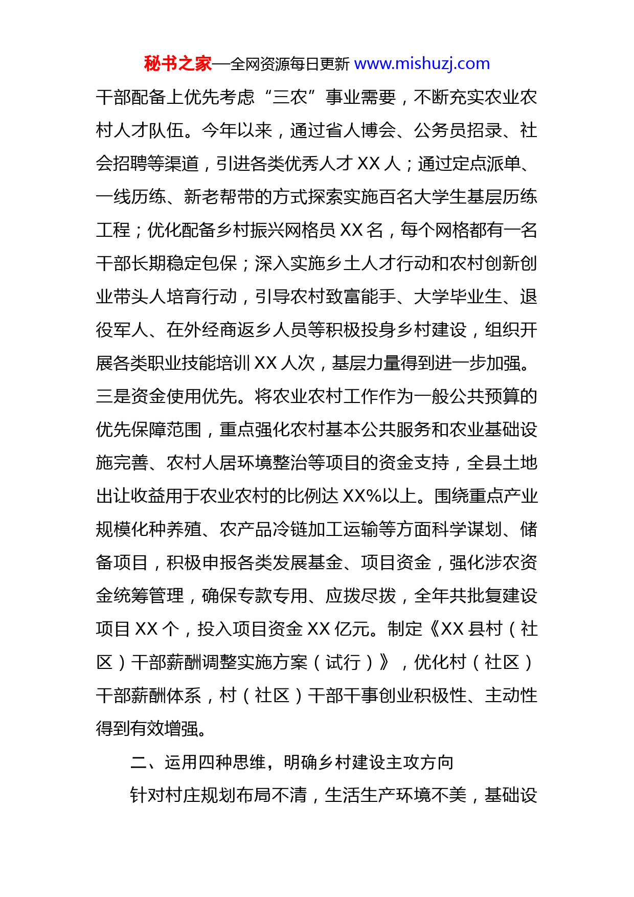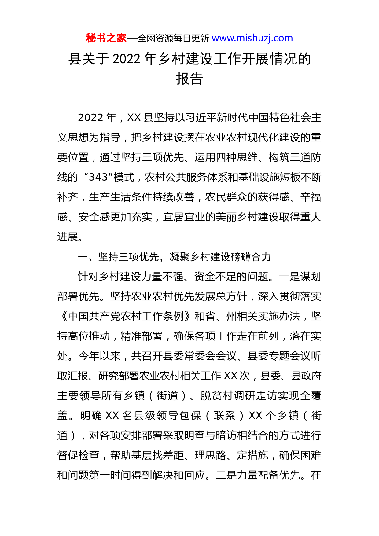秘书之家—全网资源每日更新www.mishuzj.com县关于2022年乡村建设工作开展情况的报告2022年,XX县坚持以习近平新时代中国特色社会主义思想为指导,把乡村建设摆在农业农村现代化建设的重要位置,通过坚持三项优先、运用四种思维、构筑三道防线的“343”模式,农村公共服务体系和基础设施短板不断补齐,生产生活条件持续改善,农民群众的获得感、辛福感、安全感更加充实,宜居宜业的美丽乡村建设取得重大进展。一、坚持三项优先,凝聚乡村建设磅礴合力针对乡村建设力量不强、资金不足的问题。一是谋划部署优先。坚持农业农村优先发展总方针,深入贯彻落实《中国共产党农村工作条例》和省、州相关实施办法,坚持高位推动,精准部署,确保各项工作走在前列,落在实处。今年以来,共召开县委常委会会议、县委专题会议听取汇报、研究部署农业农村相关工作XX次,县委、县政府主要领导所有乡镇(街道)、脱贫村调研走访实现全覆盖。明确XX名县级领导包保(联系)XX个乡镇(街道),对各项安排部署采取明查与暗访相结合的方式进行督促检查,帮助基层找差距、理思路、定措施,确保困难和问题第一时间得到解决和回应。二是力量配备优先。在秘书之家—全网资源每日更新www.mishuzj.com干部配备上优先考虑“三农”事业需要,不断充实农业农村人才队伍。今年以来,通过省人博会、公务员招录、社会招聘等渠道,引进各类优秀人才XX人;通过定点派单、一线历练、新老帮带的方式探索实施百名大学生基层历练工程;优化配备乡村振兴网格员XX名,每个网格都有一名干部长期稳定包保;深入实施乡土人才行动和农村创新创业带头人培育行动,引导农村致富能手、大学毕业生、退役军人、在外经商返乡人员等积极投身乡村建设,组织开展各类职业技能培训XX人次,基层力量得到进一步加强。三是资金使用优先。将农业农村工作作为一般公共预算的优先保障范围,重点强化农村基本公共服务和农业基础设施完善、农村人居环境整治等项目的资金支持,全县土地出让收益用于农业农村的比例达XX%以上。围绕重点产业规模化种养殖、农产品冷链加工运输等方面科学谋划、储备项目,积极申报各类发展基金、项目资金,强化涉农资金统筹管理,确保专款专用、应拨尽拨,全年共批复建设项目XX个,投入项目资金XX亿元。制定《XX县村(社区)干部薪酬调整实施方案(试行)》,优化村(社区)干部薪酬体系,村(社区)干部干事创业积极性、主动性得到有效增强。二、运用四种思维,明确乡村建设主攻方向针对村庄规划布局不清,生活生产环境不美,基础设秘书之家—全网资源每日更新www.mishuzj.com施及公共服务不足,农民思想观念不新的问题。一是运用前瞻性思维加快乡村规划编制实施。按照《乡村建设行动实施方案》和全国乡村建设会议精神以及省、州相关规定,将全县村(社区)分为基本城镇化城市化类XX个、集聚提升类XX个、城郊融合类XX个、特色保护类XX个,以省、州级美丽乡村建设示范点为重点,统筹考虑各村人口现状、产业发展、交通区位、基础设施等因素,在“三区三线”基础上合理布局村庄建设、产业发展、公共服务用地,确保规划可持续、管长远、可操作、能见效。二是运用全局性思维加快乡村人居环境建设。坚持“一户一宅”的规定,印发《XX县耕地保护管控机制》、《XX县农村村民住宅建设管理办法(试行)》、《XX县农民建房管理中村规民约的自律自治探索试点实施》等系列方案,农村宅基地审批、农房建设管控机制进一步完善,全年共审批农村村民建房XX宗,审批面积XX亩,整改乱占耕地图斑XX个,整改面积XX亩,农村“乱搭乱建”现象得到有效遏制。持续深入推进村庄清洁行动,分级推进农村改厕和污水、垃圾治理,农村生产生活环境得到有效整治,人居环境长效管护机制基本建立,2022年全县新(改)建农村户用卫生厕所XX户,完成州下达目标任务XX%;改造乡镇污水管网XX公里,完成XX镇XX村黑臭水体治理及XX村农村生活污水处理试点探索;行政村生活垃圾收运秘书之家—全网资源每日更新www.mishuzj.com处置覆盖率达XX%,XX户以上自然村寨覆盖率达XX%。三是运用系统性思维加快乡村基础设施建设。将公共基础设施建设的重点放在农村,持续改善交通、网络、水利等基础条件,全县行政村所在地有线光纤和XX户以上集中居住自然村寨4G网络全覆盖,建制村XX%通硬化路,城乡公交覆盖率达XX%,农村饮水安全持续巩固;不断提升农村教育、医疗、养老、托幼等公共服务水平,努力推进城乡基本公共服务标准统一、制度并轨,确保农民在农村就可以享受到优质的公共服务资源。四是运用整体性思维加快乡村精神文明建设。依托新时代文明实践中心、新时代学习大讲堂、新时代农民讲习所等阵地,积极开展以党的创新理论、省第XX次党代会精神为主题的宣讲XX场次,持续教育引导广大农民听党话、感党恩、跟党走。成功创建全国文明村XX个,省级文明村镇XX个,州级文明村镇XX个,县级及以上文明村镇创建率达XX%。扎实开展“推进移风易俗树立文明乡风”专项行动,持续对农村滥办酒席、低俗婚闹、高价彩礼、厚葬薄养、封建迷信等陈规陋习开展治理,降低群众“人情负担”。三、构筑三道防线,保障乡村建设行稳致远针对乡村建设组织力不强、社会环境不优、建设成效不佳的问题。一是党建引领保障