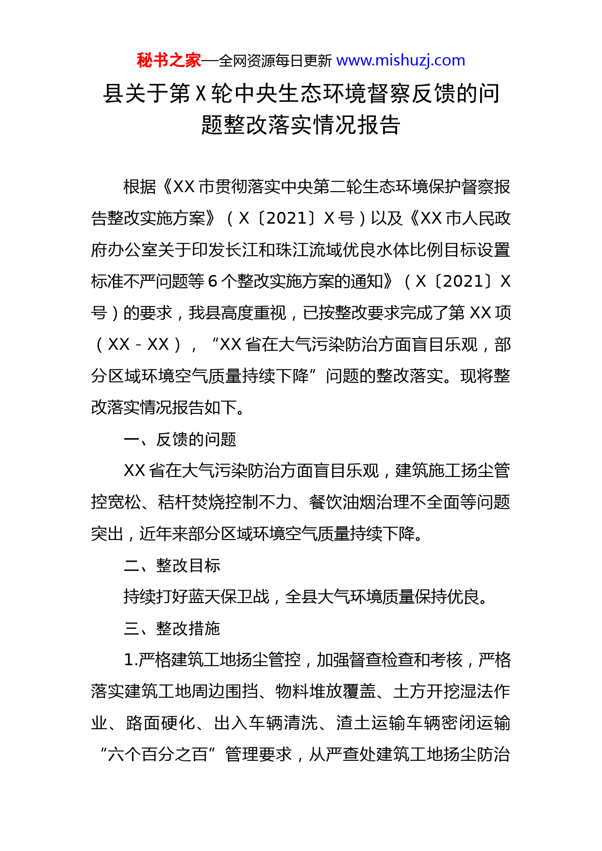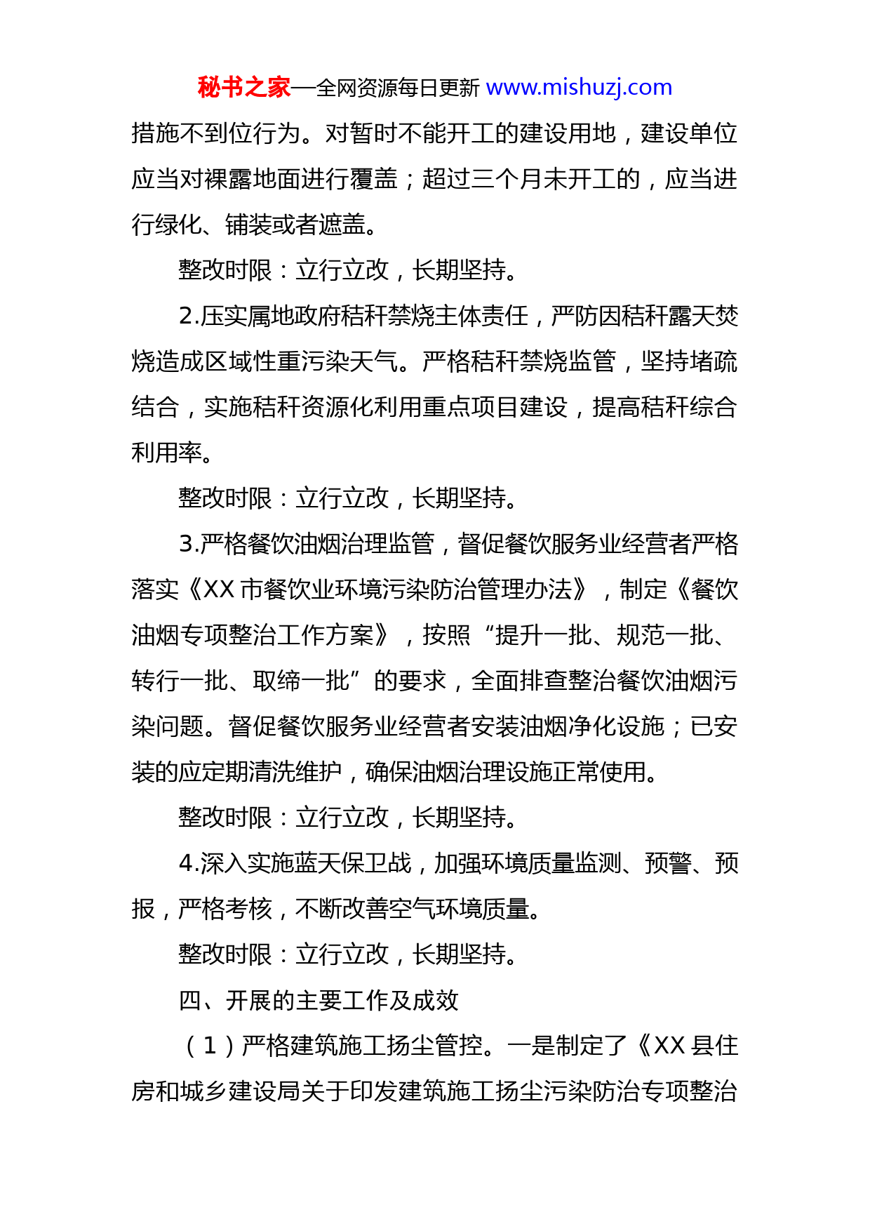 秘书之家—全网资源每日更新www.mishuzj.com县关于第X轮中央生态环境督察反馈的问题整改落实情况报告根据《XX市贯彻落实中央第二轮生态环境保护督察报告整改实施方案》(X〔2021〕X号)以及《XX市人民政府办公室关于印发长江和珠江流域优良水体比例目标设置标准不严问题等6个整改实施方案的通知》(X〔2021〕X号)的要求,我县高度重视,已按整改要求完成了第XX项(XX-XX),“XX省在大气污染防治方面盲目乐观,部分区域环境空气质量持续下降”问题的整改落实。现将整改落实情况报告如下。一、反馈的问题XX省在大气污染防治方面盲目乐观,建筑施工扬尘管控宽松、秸杆焚烧控制不力、餐饮油烟治理不全面等问题突出,近年来部分区域环境空气质量持续下降。二、整改目标持续打好蓝天保卫战,全县大气环境质量保持优良。三、整改措施1.严格建筑工地扬尘管控,加强督查检查和考核,严格落实建筑工地周边围挡、物料堆放覆盖、土方开挖湿法作业、路面硬化、出入车辆清洗、渣土运输车辆密闭运输“六个百分之百”管理要求,从严查处建筑工地扬尘防治秘书之家—全网资源每日更新www.mishuzj.com措施不到位行为。对暂时不能开工的建设用地,建设单位应当对裸露地面进行覆盖;超过三个月未开工的,应当进行绿化、铺装或者遮盖。整改时限:立行立改,长期坚持。2.压实属地政府秸秆禁烧主体责任,严防因秸秆露天焚烧造成区域性重污染天气。严格秸秆禁烧监管,坚持堵疏结合,实施秸秆资源化利用重点项目建设,提高秸秆综合利用率。整改时限:立行立改,长期坚持。3.严格餐饮油烟治理监管,督促餐饮服务业经营者严格落实《XX市餐饮业环境污染防治管理办法》,制定《餐饮油烟专项整治工作方案》,按照“提升一批、规范一批、转行一批、取缔一批”的要求,全面排查整治餐饮油烟污染问题。督促餐饮服务业经营者安装油烟净化设施;已安装的应定期清洗维护,确保油烟治理设施正常使用。整改时限:立行立改,长期坚持。4.深入实施蓝天保卫战,加强环境质量监测、预警、预报,严格考核,不断改善空气环境质量。整改时限:立行立改,长期坚持。四、开展的主要工作及成效(1)严格建筑施工扬尘管控。一是制定了《XX县住房和城乡建设局关于印发建筑施工扬尘污染防治专项整治秘书之家—全网资源每日更新www.mishuzj.com方案的通知》,成立建筑施工扬尘污染防治工作领导小组全面负责建筑施工扬尘污染防治工作统一领导、统一部署、统一安排,确保按方案要求完成各项工作任务。二是加强对建筑工地扬尘污染集中排查整治,对县城区内的建筑工地出入口“三池一设备”等设施不全、环卫防护不当等问题,按照相关规范要求督促整改落实。三是加大对建筑渣土及散装物料运输车辆监管力度,严查严惩渣土运输车辆未办审批备案手续、覆盖密闭不严、沿途撒漏污染路面等违法违规行为,建立健全建筑工地出入口设置、渣土运输、处置审批管理机制,促成规范化渣土运输企业组建,实现规范管理。四是在主要路段开展扬尘防治工作,出动道路清扫车进行卫生清扫,洒水降尘。每天持续出动环卫工人300余人、机械化保洁作业车共计15辆(其中洗扫车5辆、洒水车6辆、高压冲洗车2辆、吸污车1辆、雾炮车1辆)对全县主次道路进行清扫保洁及洒水降尘工作,保洁达12小时以上,清扫面积约201万平方米,机械化清扫保洁率达71.55%。五是加大对建筑施工工地的检查力度,按要求组织开展建筑工地施工围挡巡查,结合日常监督对XX县在建项目进行建筑工地文明施工、扬尘治理情况现场监督检查,要求各施工工地严格执行建设工地文明施工“六个百分百”,最大限度减少建筑工地扬尘对空气质量的影响,确保我县空气质量达标。秘书之家—全网资源每日更新www.mishuzj.com(2)严格秸秆禁烧监管,提高秸秆综合利用率。积极推进秸秆“肥料化、饲料化、能源化、基料化、原料化”利用。一是组织召开2022年秋季秸秆露天禁烧工作会,印发《XX县农业农村局关于加强2022年秸秆露天焚烧管控工作的通知》到全县8个乡镇(街道),并成立了秸秆露天禁烧工作指导与督促小组,每月到各乡镇(街道)进行秸秆露天禁烧指导及督查工作。每月下达乡镇(街道)进行秸秆露天焚烧指导和督查工作2次,有效控制秸秆露天焚烧现象。二是积极推进秸秆“肥料化、饲料化、能源化、基料化、原料化”利用,截止到2022年10月份,秸秆还田已完成12.25万亩,完成全年任务12.6万亩的97.22%,饲料化利用完成30892吨,完成率占全年任务数31500吨的98.07%。到2022年,全县秸秆综合利用率达到90%以上。(3)加强餐饮油烟治理监管。一是督促餐饮服务业经营者严格落实《XX市餐饮业环境污染防治管理办法》,加强日常监督检查,按照“提升一批、规范一批、转行一批、取缔一批”的要求,全面排查整治餐饮油烟污染问题。在受理食品经营许可申请时,根据餐饮业选址负面清单确定是否核发《食品经营许可证》,并发放《XX市餐饮业污染防治告知书》到许可申请单位。二是制定了《XX县城区餐饮业油烟污染专项整治工作方案》,联合XX街秘书之家—全网资源每日更新www.mishuzj.com道、XX街道对XX县城区餐饮行业开展专项整治工作,督促餐饮服务业安装油烟净化设施,并定期清洗维护,确保油烟治理设施正常使用。三是持续餐饮业现场监督检查,围绕证照办理