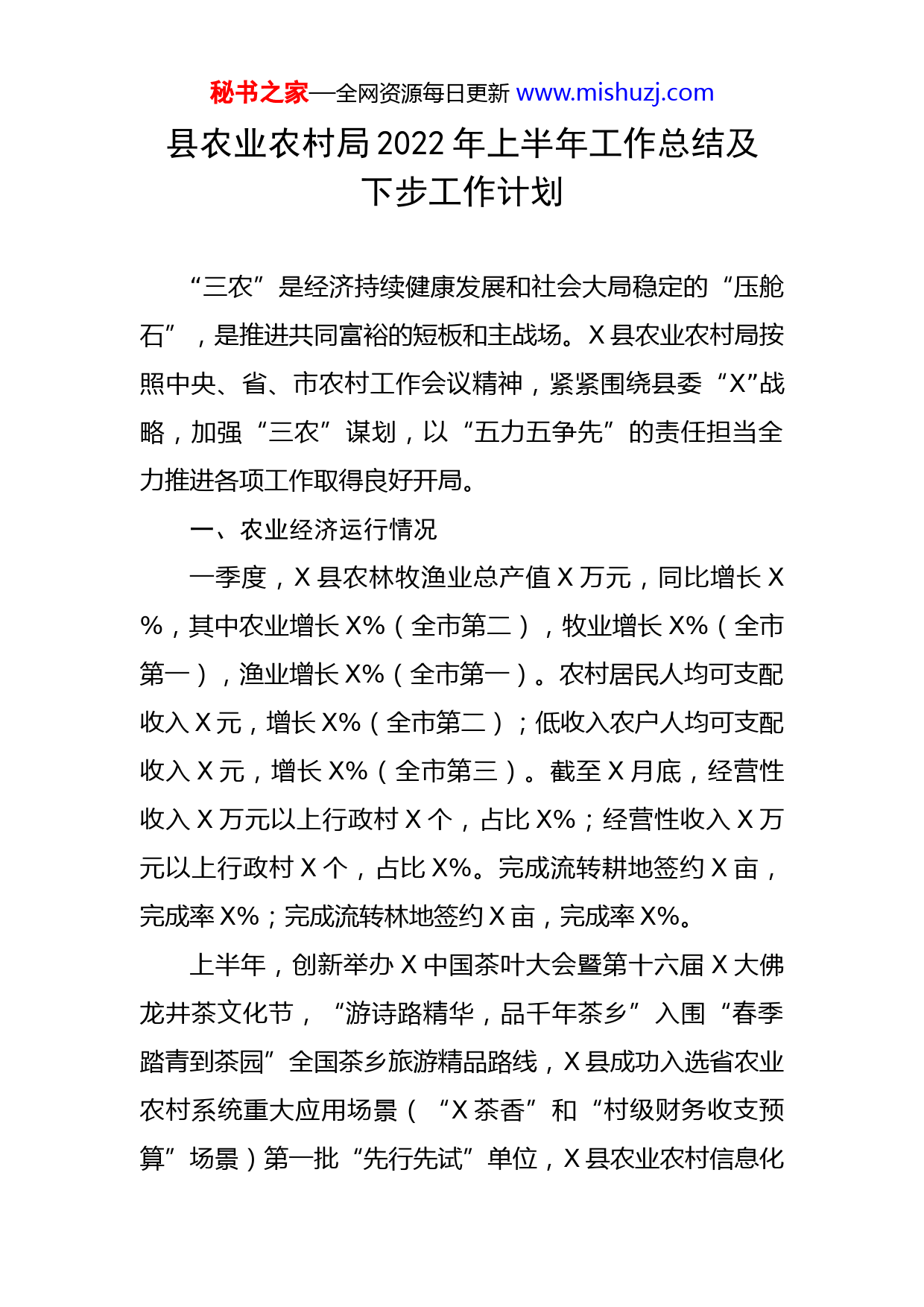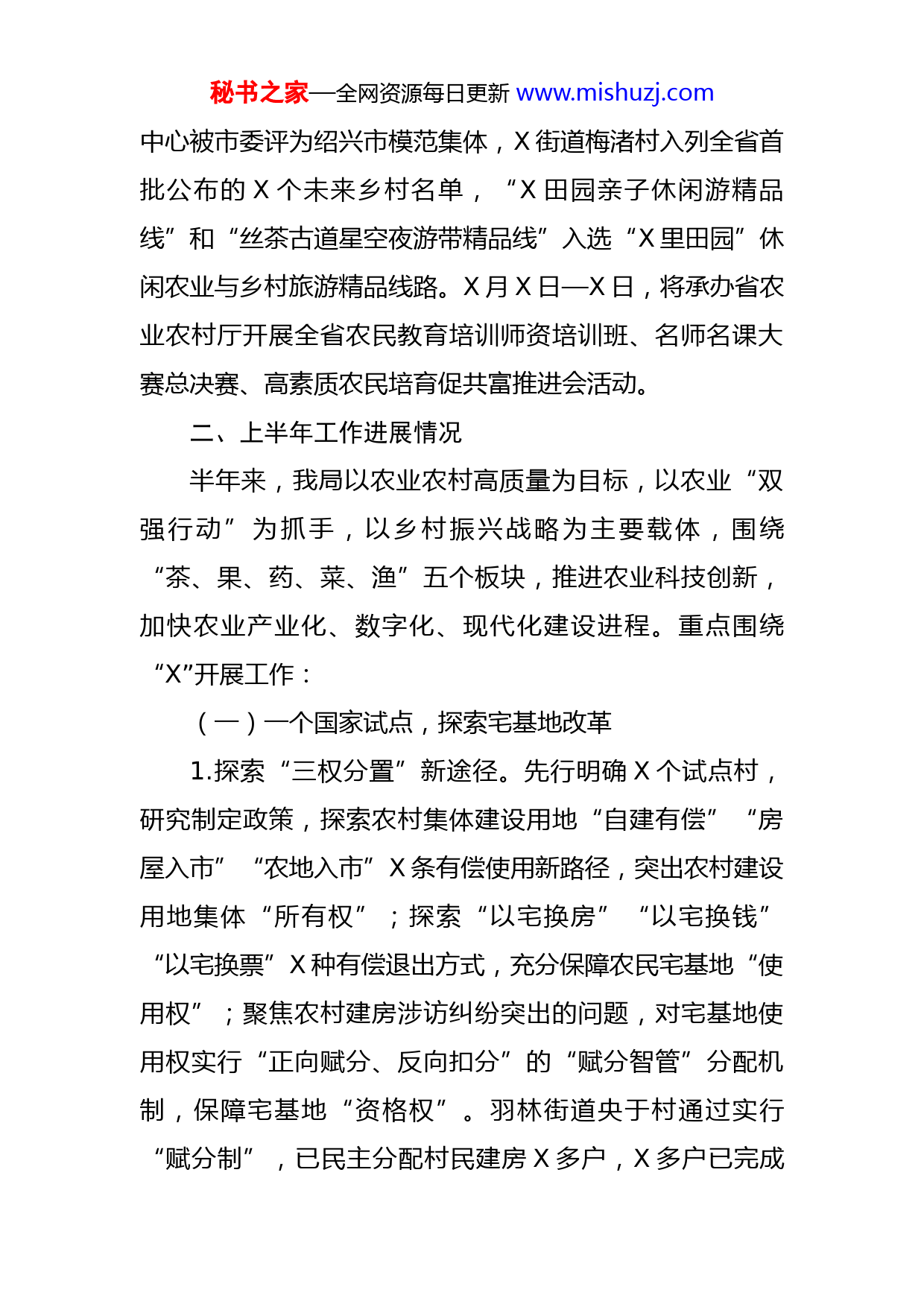 秘书之家—全网资源每日更新www.mishuzj.com县农业农村局2022年上半年工作总结及下步工作计划“三农”是经济持续健康发展和社会大局稳定的“压舱石”,是推进共同富裕的短板和主战场。X县农业农村局按照中央、省、市农村工作会议精神,紧紧围绕县委“X”战略,加强“三农”谋划,以“五力五争先”的责任担当全力推进各项工作取得良好开局。一、农业经济运行情况一季度,X县农林牧渔业总产值X万元,同比增长X%,其中农业增长X%(全市第二),牧业增长X%(全市第一),渔业增长X%(全市第一)。农村居民人均可支配收入X元,增长X%(全市第二);低收入农户人均可支配收入X元,增长X%(全市第三)。截至X月底,经营性收入X万元以上行政村X个,占比X%;经营性收入X万元以上行政村X个,占比X%。完成流转耕地签约X亩,完成率X%;完成流转林地签约X亩,完成率X%。上半年,创新举办X中国茶叶大会暨第十六届X大佛龙井茶文化节,“游诗路精华,品千年茶乡”入围“春季踏青到茶园”全国茶乡旅游精品路线,X县成功入选省农业农村系统重大应用场景(“X茶香”和“村级财务收支预算”场景)第一批“先行先试”单位,X县农业农村信息化秘书之家—全网资源每日更新www.mishuzj.com中心被市委评为绍兴市模范集体,X街道梅渚村入列全省首批公布的X个未来乡村名单,“X田园亲子休闲游精品线”和“丝茶古道星空夜游带精品线”入选“X里田园”休闲农业与乡村旅游精品线路。X月X日—X日,将承办省农业农村厅开展全省农民教育培训师资培训班、名师名课大赛总决赛、高素质农民培育促共富推进会活动。二、上半年工作进展情况半年来,我局以农业农村高质量为目标,以农业“双强行动”为抓手,以乡村振兴战略为主要载体,围绕“茶、果、药、菜、渔”五个板块,推进农业科技创新,加快农业产业化、数字化、现代化建设进程。重点围绕“X”开展工作:(一)一个国家试点,探索宅基地改革1.探索“三权分置”新途径。先行明确X个试点村,研究制定政策,探索农村集体建设用地“自建有偿”“房屋入市”“农地入市”X条有偿使用新路径,突出农村建设用地集体“所有权”;探索“以宅换房”“以宅换钱”“以宅换票”X种有偿退出方式,充分保障农民宅基地“使用权”;聚焦农村建房涉访纠纷突出的问题,对宅基地使用权实行“正向赋分、反向扣分”的“赋分智管”分配机制,保障宅基地“资格权”。羽林街道央于村通过实行“赋分制”,已民主分配村民建房X多户,X多户已完成秘书之家—全网资源每日更新www.mishuzj.com建房。2.扩大“共富搬迁”新红利。对基础条件差、地处地质灾害区、不宜居住的偏远自然村进行生态大搬迁,通过宅基地有偿退出等探索,改善农民居住环境、提高农户生活品质,提高资源利用率,同时加快区域协调发展进程,助力乡村振兴和共同富裕。目前,已上报第一批搬迁自然村X个,共涉及X户、X人,并由乡镇(街道)揭榜挂帅。房屋搬迁用地面积约X亩,搬迁区域内符合复垦的面积约X亩。搬迁后,设置农民集聚居住区安置地块共X个。其中,羽林街道在重新选址中,镜岭镇、回山镇、儒岙镇、沃洲镇、X街道等X个乡镇(街道)已在入户签约、政策处理、方案设计中,南明街道安置地块已完成地下室基础底板混凝土浇筑。3.实现“一码管宅”新统一。投资X万元,通过分级培训、部门协调,项目指导、质量管控,扎实开展全县X个行政村的农村宅基地基础信息调查工作,为我市建立农村宅基地数字化管理(交易)系统提供数据支撑,建立包含宅基地权利人、地类、四至方位、宗地面积、房屋建筑面积以及审批、使用、流转、执法等信息在内的农村宅基地数据库,实现农村“人、地、房”信息一体化的“一码管宅”。截止X月底,我县宅基地基础信息调查已完成X宗,完成任务数的X%。秘书之家—全网资源每日更新www.mishuzj.com(二)两项数字改革,实现产业链赋能1.积极探索“数字赋能乡村发展”通过《省级乡村振兴产业发展示范建设县》、《X县茶产业创新服务综合体》项目实施,搭建乡村数字化产业管理平台、茶业全产业链数字化平台,推动茶产业转型升级和高质量发展。截至X月底,省级乡村振兴产业发展示范县建设项目已完成形象进度的X%(X月份迎接省级验收),“寻茶记”茶生活馆完成建设,“茶产业大脑”已完成形象进度的X%,茶农“X农码”总赋码X万人,完成约X个X农码的导出和X张实体交易卡制作,茶卫士注册人数达X人,应用数次X以上。推动“X炒年糕”品牌、门店、运营、监管全链条数字化发展,促进X特色小吃产业良性、高质量发展,建设炒年糕门店数字化管理平台,目前管理平台初步建成,已有X家门店接入该系统。做好消薄应用场景数字化建设,打造“一屏展现、一屏分析、一屏考核、一屏共享、一屏体验”的多维立体数智消薄平台,为乡村振兴事业提供优秀的“X经验”。目前,消薄平台方案根据第一次数字化项目预审会议建议完善中。2.积极探索“数字赋能绿色发展”加快推进第一批省级多跨场景应用即“肥药两制”数字化改革,即“X农优品”应用,引导主体实名购买、按量施用。推进测土配方、完善“X样施”数据,引导种植主体秘书之家—全网资源每日更新www.mishuzj.com定额制施用,不断促进药、肥减量增效使用,减轻农业面源污染,改善农业生态环境,助力农业高质量绿色发展。其他省级数字化