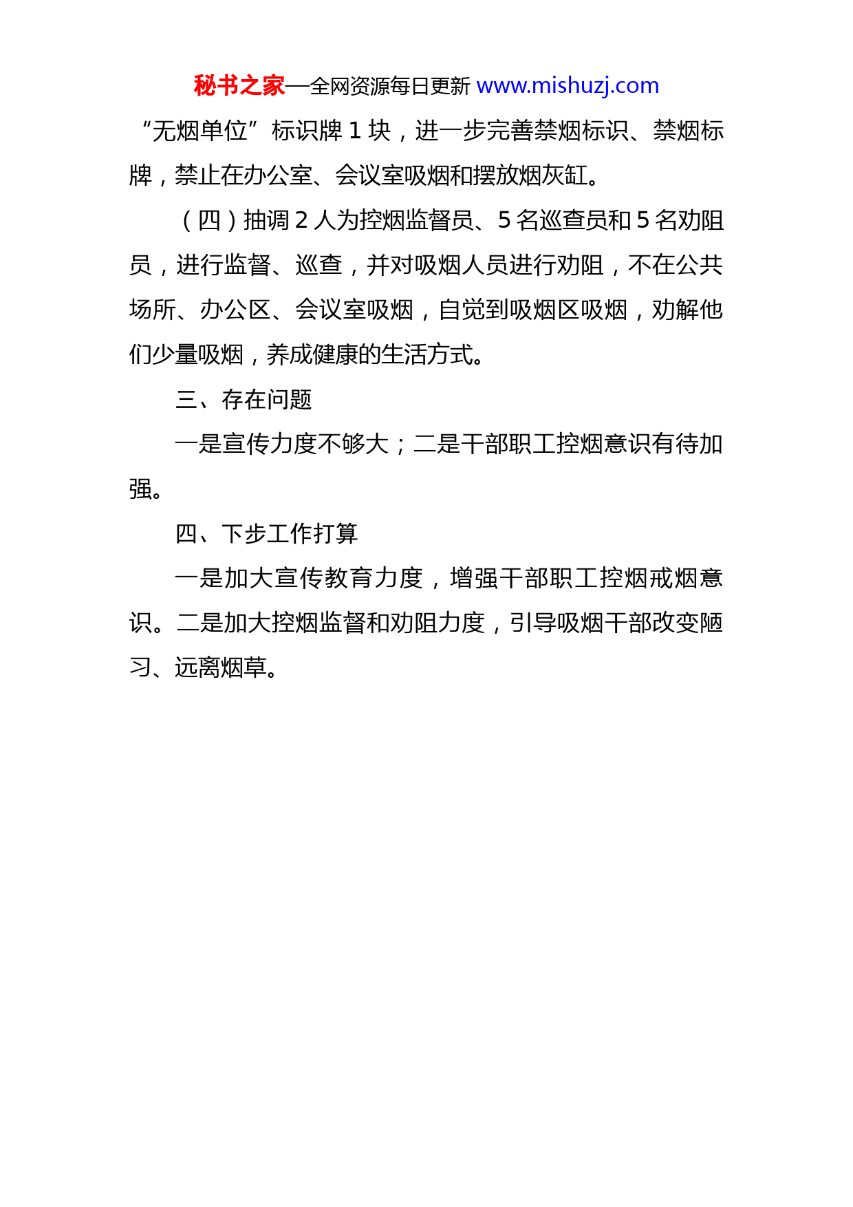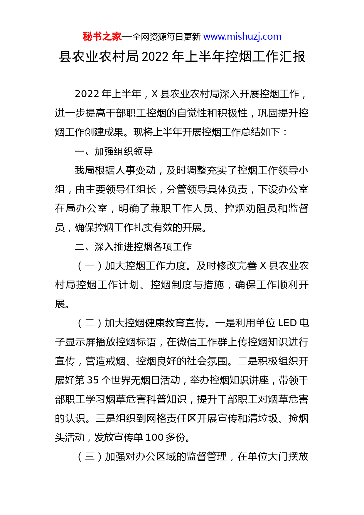 秘书之家—全网资源每日更新www.mishuzj.com县农业农村局2022年上半年控烟工作汇报2022年上半年,X县农业农村局深入开展控烟工作,进一步提高干部职工控烟的自觉性和积极性,巩固提升控烟工作创建成果。现将上半年开展控烟工作总结如下:一、加强组织领导我局根据人事变动,及时调整充实了控烟工作领导小组,由主要领导任组长,分管领导具体负责,下设办公室在局办公室,明确了兼职工作人员、控烟劝阻员和监督员,确保控烟工作扎实有效的开展。二、深入推进控烟各项工作(一)加大控烟工作力度。及时修改完善X县农业农村局控烟工作计划、控烟制度与措施,确保工作顺利开展。(二)加大控烟健康教育宣传。一是利用单位LED电子显示屏播放控烟标语,在微信工作群上传控烟知识进行宣传,营造戒烟、控烟良好的社会氛围。二是积极组织开展好第35个世界无烟日活动,举办控烟知识讲座,带领干部职工学习烟草危害科普知识,提升干部职工对烟草危害的认识。三是组织到网格责任区开展宣传和清垃圾、捡烟头活动,发放宣传单100多份。(三)加强对办公区域的监督管理,在单位大门摆放秘书之家—全网资源每日更新www.mishuzj.com“无烟单位”标识牌1块,进一步完善禁烟标识、禁烟标牌,禁止在办公室、会议室吸烟和摆放烟灰缸。(四)抽调2人为控烟监督员、5名巡查员和5名劝阻员,进行监督、巡查,并对吸烟人员进行劝阻,不在公共场所、办公区、会议室吸烟,自觉到吸烟区吸烟,劝解他们少量吸烟,养成健康的生活方式。三、存在问题一是宣传力度不够大;二是干部职工控烟意识有待加强。四、下步工作打算一是加大宣传教育力度,增强干部职工控烟戒烟意识。二是加大控烟监督和劝阻力度,引导吸烟干部改变陋习、远离烟草。
