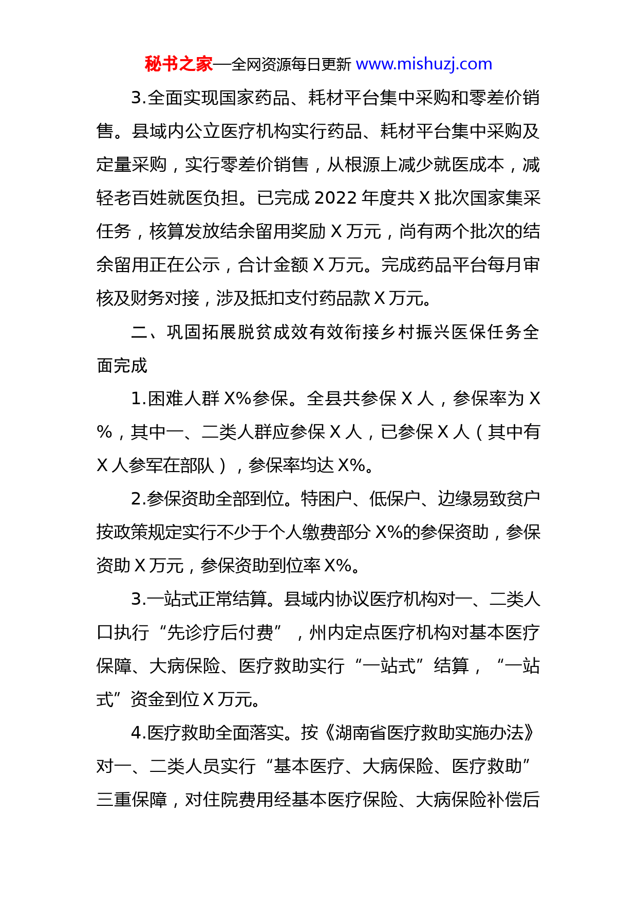 秘书之家—全网资源每日更新www.mishuzj.com县医疗保障局2022年上半年工作总结及下半年工作计划2022年以来,在县委、县政府的坚强领导下,坚持以人民健康为中心,以“放管服”改革优化营商环境为抓手,着力健全工作机制,提高医保服务能力,加强基金监管,落实医保政策待遇,推动健康X建设,巩固拓展脱贫攻坚成果,推进乡村振兴。现将上半年工作情况总结如下:一、基本医疗保险基金收支正常1.城镇职工基本医疗保险基金运行高效平稳。2022年X-X月X日基金总收入X万元,总支出X万元,当期结余X万元,累计结余X万元。2.城乡居民基本医疗保险基金运行平稳。2022年全县城乡居民参保X人,个人部分与各级财政补贴按每个X元测算,基金总收入应为X亿元。2022年X-X月基金总支出X万元,按《X县城乡居民医保基金预算管控实施细则》测算,扣除X%风险金X万元,大病保险上解X万元(X元/人),精神病治疗医保包干费用X万元,县医共体可管控基金为X亿元,月管控线为X万元,X-X月阶段性管控结余X万元。年底医保基金有望节支X万元以上,医共体有望节余X余万元。秘书之家—全网资源每日更新www.mishuzj.com3.全面实现国家药品、耗材平台集中采购和零差价销售。县域内公立医疗机构实行药品、耗材平台集中采购及定量采购,实行零差价销售,从根源上减少就医成本,减轻老百姓就医负担。已完成2022年度共X批次国家集采任务,核算发放结余留用奖励X万元,尚有两个批次的结余留用正在公示,合计金额X万元。完成药品平台每月审核及财务对接,涉及抵扣支付药品款X万元。二、巩固拓展脱贫成效有效衔接乡村振兴医保任务全面完成1.困难人群X%参保。全县共参保X人,参保率为X%,其中一、二类人群应参保X人,已参保X人(其中有X人参军在部队),参保率均达X%。2.参保资助全部到位。特困户、低保户、边缘易致贫户按政策规定实行不少于个人缴费部分X%的参保资助,参保资助X万元,参保资助到位率X%。3.一站式正常结算。县域内协议医疗机构对一、二类人口执行“先诊疗后付费”,州内定点医疗机构对基本医疗保障、大病保险、医疗救助实行“一站式”结算,“一站式”资金到位X万元。4.医疗救助全面落实。按《湖南省医疗救助实施办法》对一、二类人员实行“基本医疗、大病保险、医疗救助”三重保障,对住院费用经基本医疗保险、大病保险补偿后秘书之家—全网资源每日更新www.mishuzj.com自付费用仍超过其近X个月家庭总收的人员,本人村部申请、乡镇入户核实、医保局核查报销数据,集体研究符合政策的,作为三类救助对象进行医疗再救助。截止2022年X月X日,一、二类人群住院X人次,总费用X万元,政策范围内费用X万元,总补偿X万元,其中基本医疗保险补偿X万元、大病保险X万元、医疗救助X万元。综合报销比例达总费用的X%,政策范围内报销比例达X%。门诊就诊X人次,总费用X万元,政策范围内费用X万元,综合报销X万元,综合报销达总费用的X%,政策范围内报销比例达X%。按月对符合救助条件的X户三类对象进行医疗再救助X万元,确保不因病致贫。三、医保政策待遇全面落实1.城乡居民待遇落实。截止2022年X月X日,基本医疗住院补偿X人次,总费用X万元,基本补偿X万元;大病保险补偿X万元,医疗救助X人次X万元。普通门诊共补偿X人次,补偿X万元(含“两病”X人次补偿X万元),特殊门诊X人次,补偿X万元,大病特药补偿X人次X万元。总费用报销比例X%(政策内报销比例X%,因普通病人的大病还未对付)。2.城镇职工待遇落实。截止2022年X月X日住院X人次,总费用X万元(政策内费用X万元),统筹支付X万元,总费用报销比例X%(政策内报销比例X%),大病秘书之家—全网资源每日更新www.mishuzj.com互助支出X万元。慢性病门诊共报销X人次X万元。大病特药报销X人次X万元。四、打击欺诈骗保保持高压态势1、扎实开展打击欺诈骗保套保挪用贪占医保基金集中整治“回头看”行动推进清廉医保建设。与县内X家医院(X家社会办医院)、X家药店、县外X家医院(州直X家公立医院、X家社会办医院、X家吉首市医院),签订2022年医保协议,确定管控支付限额和次均管控费用。严格落实《湘西自治州开展打击欺诈骗保套保挪用贪占医保基金集中整治“回头看”实施方案》文件精神,召开全县打击欺诈骗保套保挪用贪占医保基金集中整治“回头看”会议,与县纪委、县卫健局共同开展医院联合检查,主动参与全州X县市交叉飞行检查,组织干部分批到祚阳市、江永县、洞口县、会同县学习,完成县域内X家医疗机构X家协议零售药店的自查自纠工作,对发现问题及时纠正整改到位。全县X家两定医药机构,已检查X家,检查覆盖闰率为X%。处理处罚X家,处理率为X%。拒付基金X元,处罚X万元。对虚假购药套现的药店负责人及参保人各处以X倍的处罚,因涉及的两人主动承认,主动接受处罚,经卫健、公安、法院、纪委多部分联合审定后,套现的参保人为公职人员,由纪委立案查处,但不移交司法部门处理。对X家药店处以暂停X个月协议的处理。秘书之家—全网资源每日更新www.mishuzj.com2.建立健全管理体系。编制《2022年X县医保局工作手册》,统筹健全考评体系。对干部,落实岗位量化积分平时考核管理,全面改进和强化工作作风和执行力。对医院,严格协议管理,特别是住院次均费用管理,推进“六星医院”考评,规范医疗行为。对药店,签订协议,推进诚信药店考评,规范协议药店