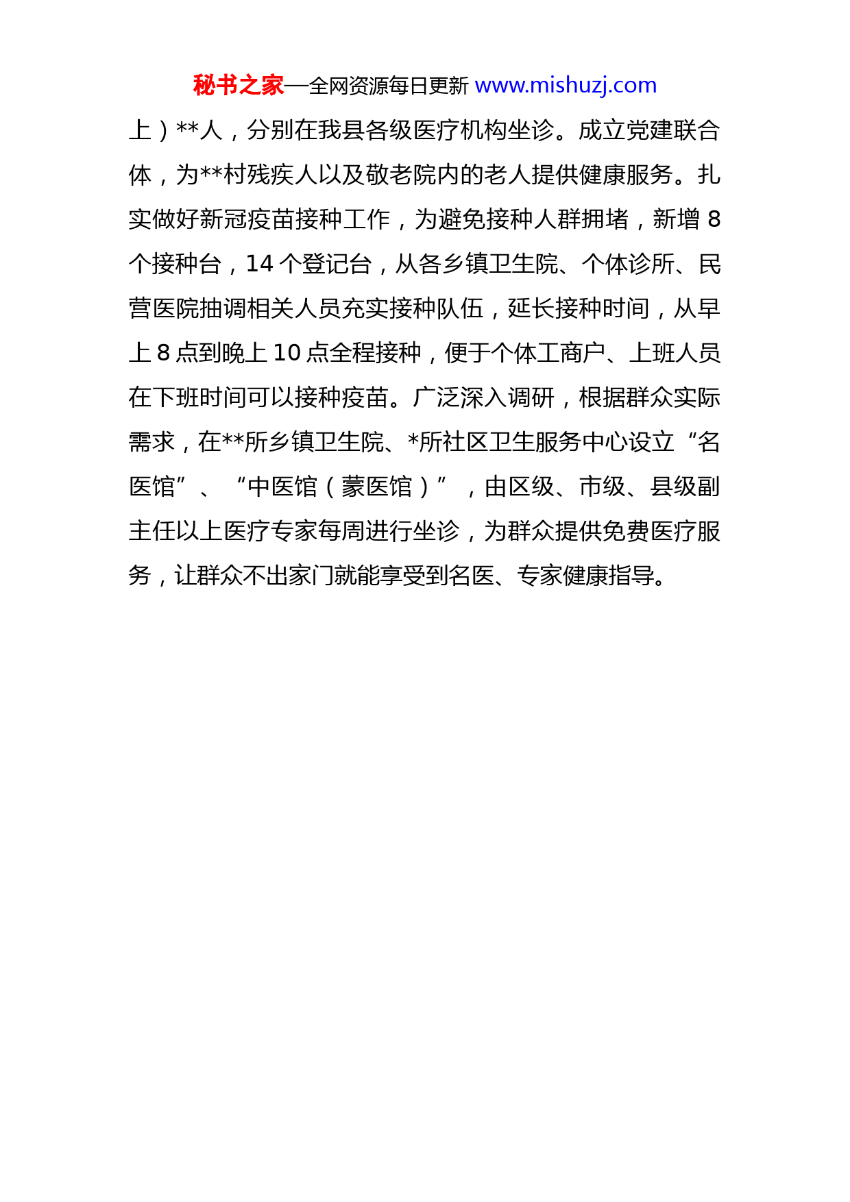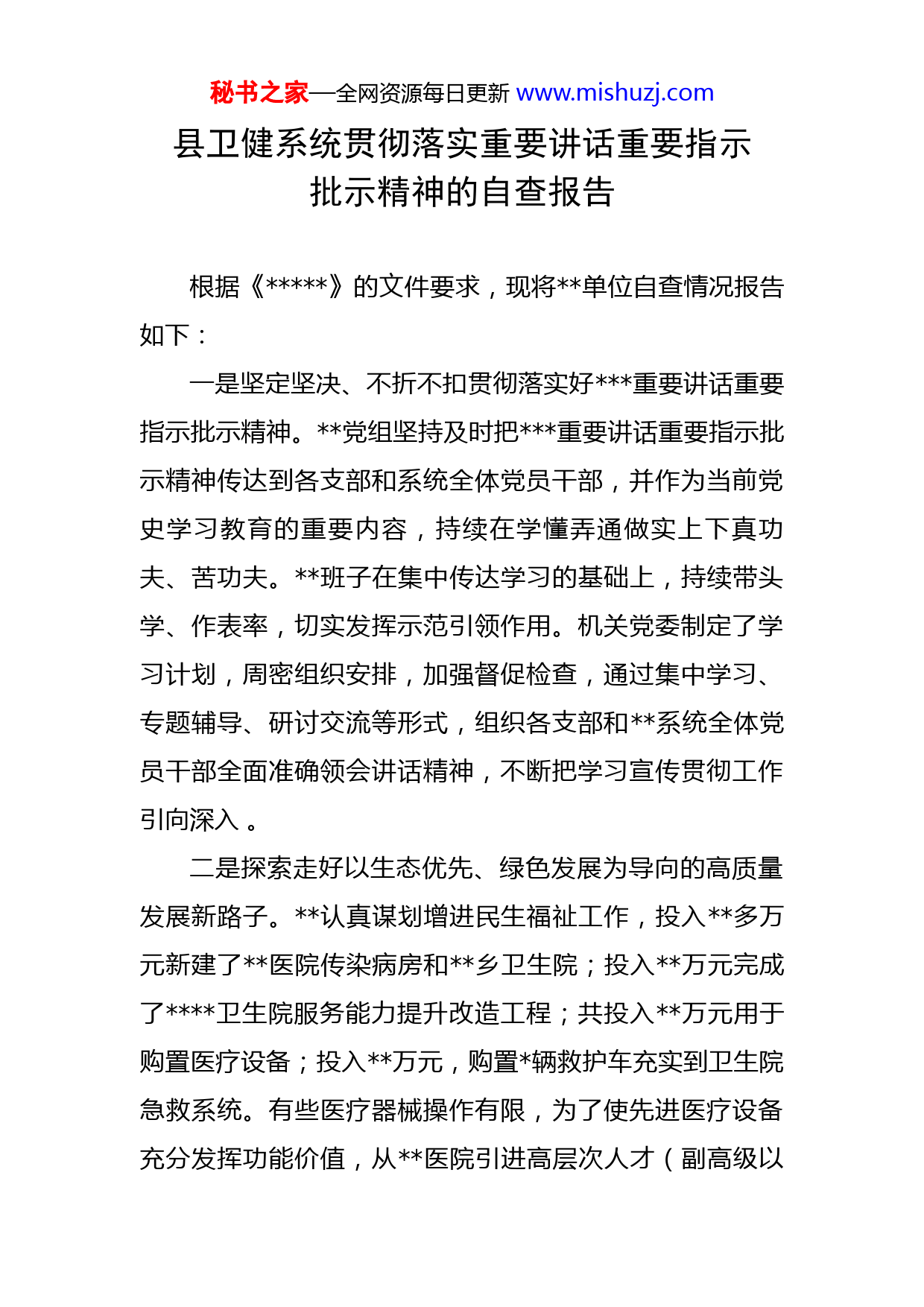 秘书之家—全网资源每日更新www.mishuzj.com县卫健系统贯彻落实重要讲话重要指示批示精神的自查报告根据《》的文件要求,现将单位自查情况报告如下:一是坚定坚决、不折不扣贯彻落实好重要讲话重要指示批示精神。党组坚持及时把重要讲话重要指示批示精神传达到各支部和系统全体党员干部,并作为当前党史学习教育的重要内容,持续在学懂弄通做实上下真功夫、苦功夫。班子在集中传达学习的基础上,持续带头学、作表率,切实发挥示范引领作用。机关党委制定了学习计划,周密组织安排,加强督促检查,通过集中学习、专题辅导、研讨交流等形式,组织各支部和系统全体党员干部全面准确领会讲话精神,不断把学习宣传贯彻工作引向深入。二是探索走好以生态优先、绿色发展为导向的高质量发展新路子。认真谋划增进民生福祉工作,投入多万元新建了医院传染病房和乡卫生院;投入万元完成了卫生院服务能力提升改造工程;共投入万元用于购置医疗设备;投入万元,购置辆救护车充实到卫生院急救系统。有些医疗器械操作有限,为了使先进医疗设备充分发挥功能价值,从医院引进高层次人才(副高级以秘书之家—全网资源每日更新www.mishuzj.com上)人,分别在我县各级医疗机构坐诊。成立党建联合体,为村残疾人以及敬老院内的老人提供健康服务。扎实做好新冠疫苗接种工作,为避免接种人群拥堵,新增8个接种台,14个登记台,从各乡镇卫生院、个体诊所、民营医院抽调相关人员充实接种队伍,延长接种时间,从早上8点到晚上10点全程接种,便于个体工商户、上班人员在下班时间可以接种疫苗。广泛深入调研,根据群众实际需求,在所乡镇卫生院、所社区卫生服务中心设立“名医馆”、“中医馆(蒙医馆)”,由区级、市级、县级副主任以上医疗专家每周进行坐诊,为群众提供免费医疗服务,让群众不出家门就能享受到名医、专家健康指导。