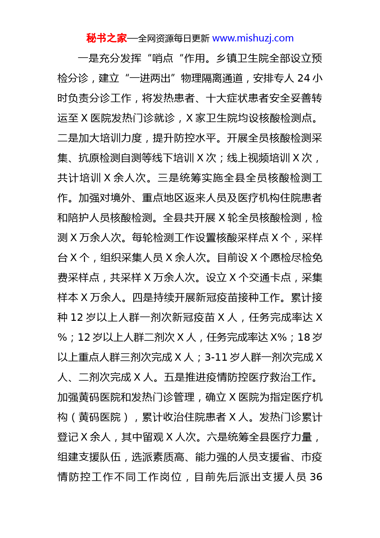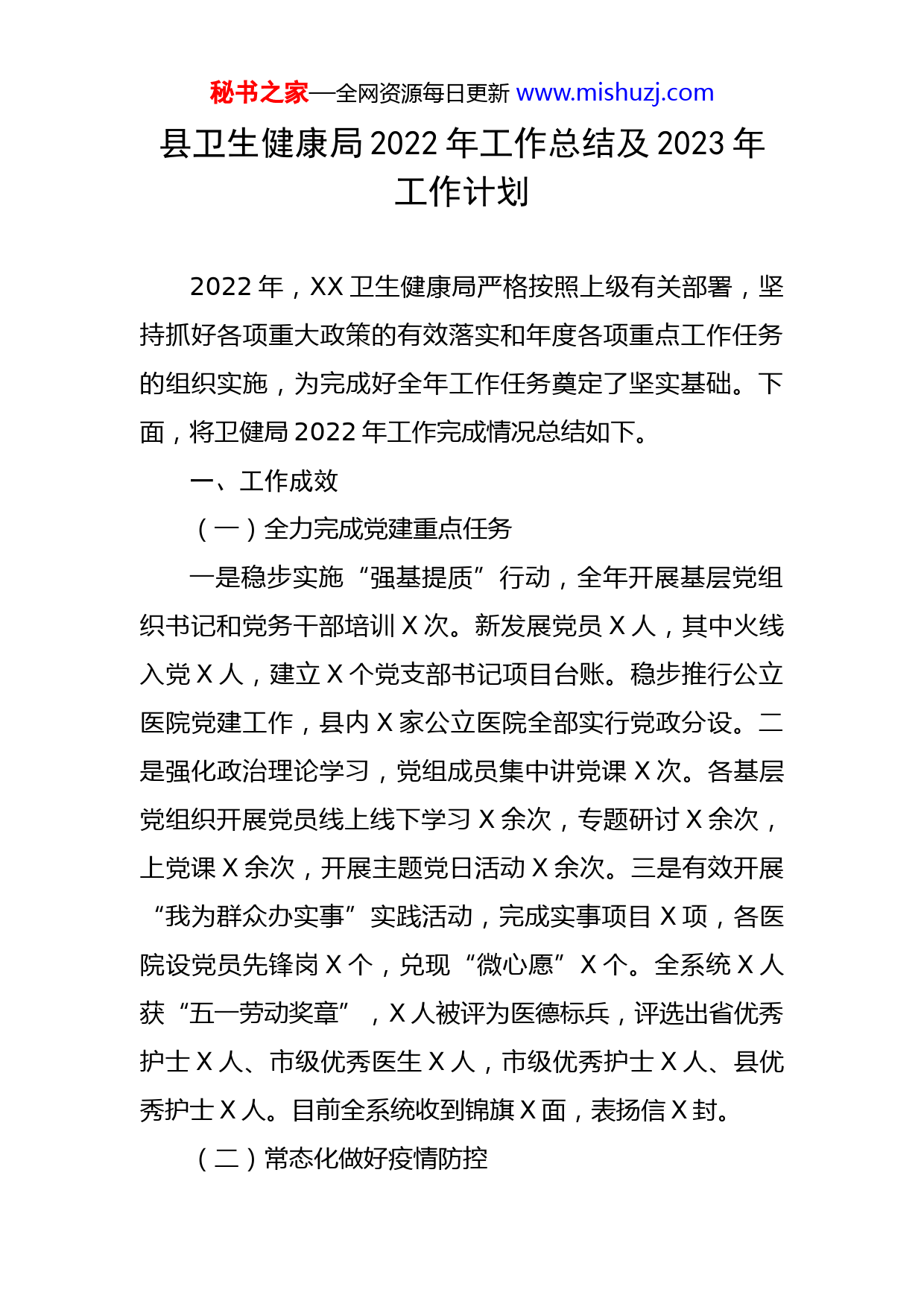 秘书之家—全网资源每日更新www.mishuzj.com县卫生健康局2022年工作总结及2023年工作计划2022年,XX卫生健康局严格按照上级有关部署,坚持抓好各项重大政策的有效落实和年度各项重点工作任务的组织实施,为完成好全年工作任务奠定了坚实基础。下面,将卫健局2022年工作完成情况总结如下。一、工作成效(一)全力完成党建重点任务一是稳步实施“强基提质”行动,全年开展基层党组织书记和党务干部培训X次。新发展党员X人,其中火线入党X人,建立X个党支部书记项目台账。稳步推行公立医院党建工作,县内X家公立医院全部实行党政分设。二是强化政治理论学习,党组成员集中讲党课X次。各基层党组织开展党员线上线下学习X余次,专题研讨X余次,上党课X余次,开展主题党日活动X余次。三是有效开展“我为群众办实事”实践活动,完成实事项目X项,各医院设党员先锋岗X个,兑现“微心愿”X个。全系统X人获“五一劳动奖章”,X人被评为医德标兵,评选出省优秀护士X人、市级优秀医生X人,市级优秀护士X人、县优秀护士X人。目前全系统收到锦旗X面,表扬信X封。(二)常态化做好疫情防控秘书之家—全网资源每日更新www.mishuzj.com一是充分发挥“哨点“作用。乡镇卫生院全部设立预检分诊,建立“一进两出”物理隔离通道,安排专人24小时负责分诊工作,将发热患者、十大症状患者安全妥善转运至X医院发热门诊就诊,X家卫生院均设核酸检测点。二是加大培训力度,提升防控水平。开展全员核酸检测采集、抗原检测自测等线下培训X次;线上视频培训X次,共计培训X余人次。三是统筹实施全县全员核酸检测工作。加强对境外、重点地区返来人员及医疗机构住院患者和陪护人员核酸检测。全县共开展X轮全员核酸检测,检测X万余人次。每轮检测工作设置核酸采样点X个,采样台X个,组织采集人员X余人次。目前设X个愿检尽检免费采样点,共采样X万余人次。设立X个交通卡点,采集样本X万余人。四是持续开展新冠疫苗接种工作。累计接种12岁以上人群一剂次新冠疫苗X人,任务完成率达X%;12岁以上人群二剂次X人,任务完成率达X%;18岁以上重点人群三剂次完成X人;3-11岁人群一剂次完成X人、二剂次完成X人。五是推进疫情防控医疗救治工作。加强黄码医院和发热门诊管理,确立X医院为指定医疗机构(黄码医院),累计收治住院患者X人。发热门诊累计登记X余人,其中留观X人次。六是统筹全县医疗力量,组建支援队伍,选派素质高、能力强的人员支援省、市疫情防控工作不同工作岗位,目前先后派出支援人员36秘书之家—全网资源每日更新www.mishuzj.com批,24842人次。(三)卫生健康工作实现新跨越面对新冠肺炎疫情给医院发展带来的不利影响,我县公立医院综合改革绩效评价连续X年达到全省优秀等级。公立医院逐利机制被破除,就医秩序得到改善,群众满意度连续三年稳定在X%以上。深化医改服务有新突破。一是县级医院可诊治疾病X种,乡镇卫生院诊治疾病X种,村卫生室诊治疾病X种,外请专家诊治疾病X种,目前,住院总人次数X人次,县域内就诊率X%,县外转诊率持续保持在X%以下。二是促进优质医疗资源下沉,组建医疗联合体医疗服务体系,充分发挥县级医院的龙头带动作用,以覆盖全县所有公立医疗机构。截至目前,下派专家和医护人员X人次,治疗患者X人次。三是推进药品网上集中采购政策有新成效。许多品种药价大幅降低,使患者在经济上切实得到实惠。X医院、X医院药占比分别为X%和X%,处于省内较低水平。医疗服务能力有新提升。一是X医院卒中中心目前完成溶栓病例X例,其中出血性卒中X例。二是X医院开展CRRT(连续肾脏替代治疗)技术、甲状腺结节消融术、彩超定位经皮肾镜碎石取石术等新技术,新项目X项。三是X获门诊患者满意度排名全省第一名;X家县直医院住院患者满意度排名均高于全国平均水平,其中X获全省第二名。秘书之家—全网资源每日更新www.mishuzj.com四是持续提升村卫生室服务能力。全县X家村卫生室药品配备均达到了X种以上,诊疗设备齐全,配有健康一体机、电脑和打印机等办公用品,满足基本医疗需求。注册乡村医生X人,实现村卫生室全覆盖。五是生命安全急救保障更牢固。“120”医务人员出车X次,安全转诊X人次,院内、院前成功抢救危重患者X人次,全年出色完成中高考、各类大型会议等医疗保障任务X次,医护人员X人次。六是加强网络与信息安全管理,全县X家县直医疗机构及X家乡镇卫生院均已建立远程会诊系统,目前全县各医疗机构已实现远程会诊全覆盖,2022年共开展远程培训X余次,参会X余人次。中医药发展实现新提升。目前,全县能提供中医药服务的医疗机构X家,掌握中医药适宜技术6种以上并配备适宜中医诊疗设备的村卫生室X所,中药种类达X种,开放中医病床总数X张。组织中医医护人员开展疫情防控救治及院感知识培训X次,培训X余人次。目前,我县中医防控干预小组指导用药X余人次,全县居家隔离人员共发放中药X万余剂次。(四)持续深入巩固健康扶贫成果一是继续做好大病专项救治工作。在原有定点医院和救治病种不变的基础上,进一步加强临床路径管理,提高医疗质量,调整政策覆盖人群,将低收入人口纳入大病救秘书之家—全网资源每日更新www.mishuzj.com治范围。全县共有大病专项救治脱贫患者X人,全部给予救治,救治率X%。二是严格落实“先诊疗、后付费”政策。