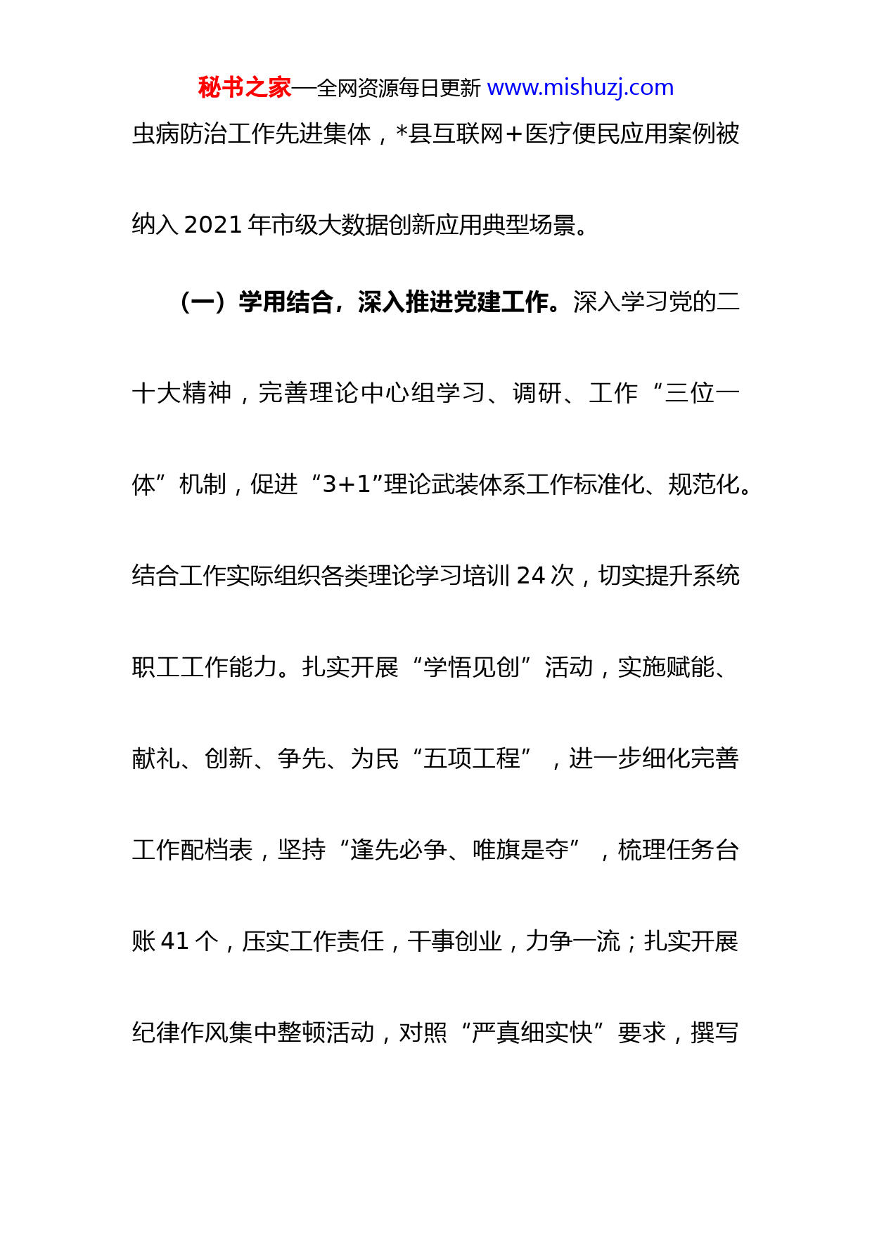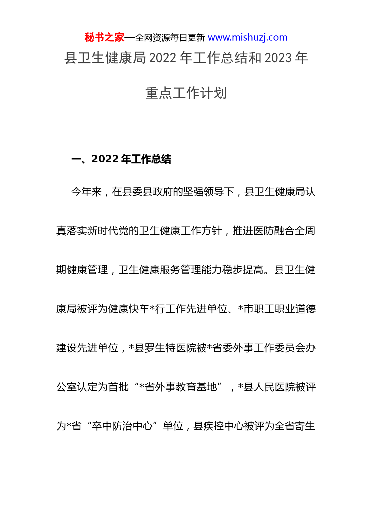 秘书之家—全网资源每日更新www.mishuzj.com县卫生健康局2022年工作总结和2023年重点工作计划一、2022年工作总结今年来,在县委县政府的坚强领导下,县卫生健康局认真落实新时代党的卫生健康工作方针,推进医防融合全周期健康管理,卫生健康服务管理能力稳步提高。县卫生健康局被评为健康快车行工作先进单位、市职工职业道德建设先进单位,县罗生特医院被省委外事工作委员会办公室认定为首批“省外事教育基地”,县人民医院被评为省“卒中防治中心”单位,县疾控中心被评为全省寄生秘书之家—全网资源每日更新www.mishuzj.com虫病防治工作先进集体,县互联网+医疗便民应用案例被纳入2021年市级大数据创新应用典型场景。(一)学用结合,深入推进党建工作。深入学习党的二十大精神,完善理论中心组学习、调研、工作“三位一体”机制,促进“3+1”理论武装体系工作标准化、规范化。结合工作实际组织各类理论学习培训24次,切实提升系统职工工作能力。扎实开展“学悟见创”活动,实施赋能、献礼、创新、争先、为民“五项工程”,进一步细化完善工作配档表,坚持“逢先必争、唯旗是夺”,梳理任务台账41个,压实工作责任,干事创业,力争一流;扎实开展纪律作风集中整顿活动,对照“严真细实快”要求,撰写秘书之家—全网资源每日更新www.mishuzj.com心得体会40余份,结合岗位职责,查找存在问题110条,整改到位110条。完善内部监督制约机制,加强廉政风险点排查监督,构建“一体推进不敢腐、不能腐、不想腐”的体制机制,推动全面从严治党工作向纵深发展。(二)常抓不懈,持续抓好常态化疫情防控。坚持“外防输入、内防反弹”总策略和“动态清零”总方针不动摇始终把人民群众生命安全和身体健康放在第一位。严格落实“人物同防”,今年累计健康服务境外来人480人,疫情重点地区来人50174人;将36类重点人群26.6万余人纳入“应检尽检”范围,加密检测频次,共检测核酸样本6067.6万份;加强定点医院县人民医院左山院区建设,设秘书之家—全网资源每日更新www.mishuzj.com置救治床位105张(其中负压病房10间),负压救护车3辆,建立三支应急梯队,并配齐配足所需物资;提升隔离转运能力,全县储备隔离点20处、隔离房间5053个,配备救护车86辆,其中负压救护车33辆;提升核酸检测能力,设立全员核酸检测采样点849个,配备采样人员4017名,检测人员216名,建成高标准核酸检测实验室12处,其中核酸检测车1台,日检测能力达7.92万管;提升流调溯源能力,建有县级专家流调队15支155人、镇街流调队307支1603人,开展了“4+2”模式轮训和常态化实战练兵,切实提升流调人员专技水平;积极构建“免疫屏障”,全县累计接种新冠病毒疫苗211.25万余剂秘书之家—全网资源每日更新www.mishuzj.com次,其中第一剂78.94万余人,第二剂次76.38万余人,第三剂次接种55.93万人。(三)攻坚克难,医疗卫生服务能力稳步提升。医疗卫生重点项目建设有序推进。县人民医院北院区已于7月份全面启用,县人民医院黑虎山传染病院区、县疾控中心项目,县妇幼保健院新院区、光明医疗综合服务中心项目建设进展顺利。医共体建设不断深入。认真学习三明医改经验,推进医疗、医保、医药“三医”联动。充分发挥县级医院龙头作用,以资源下沉、人才下沉、技术协作为重点的整合型医疗服务体系实现规范化运作;加强对医共体的绩效考核,促进优质医疗资源下沉,推动医疗服务模式从秘书之家—全网资源每日更新www.mishuzj.com以治病为中心转向以健康为中心;整合县域内公立医疗机构,建成医学影像、心电诊断、远程诊疗中心,加快建设医学检验、病理诊断、消毒供应等县域医疗服务中心,实现医疗资源同质共享,结果互认;建成卒中、胸痛、危重儿童、危重孕产妇、急诊急救五大县域救治中心,完成县域创伤中心建设,形成了立体化医疗服务体系。县人民医院老年医学科、疼痛科被评为市级重点专科。中医药服务水平不断提升。构建“专科+专病集群”点面结合、全专互补的中医医联体新模式,深入推进“五个全科化”建设工作。县中医医院实现中医“日间病房”结算;脾胃病科和脑病科加入齐鲁中医药优势专科集群;打造中医医共体,秘书之家—全网资源每日更新www.mishuzj.com建设智慧中药房,成立特色诊疗区;组织参加“西医学中医”培训,促进中西医跨界融合,壮大中医人才队伍;打造精品国医堂4个,中医药特色村卫生室48个。(四)强基固本,基层卫生服务能力全面提升。深入开展万名医护下基层活动。积极对接省、市万名医护下基层活动,引进优质医疗资源。县内二级及以上公立医院建立与镇卫生院对口联系帮扶机制,提高基层服务能力和群众健康水平。优质服务基层行活动成效显著。全县5家基层医疗卫生机构通过优质服务基层行推荐标准,13家基层医疗机构达到基本标准,累计建成省级示范村卫生室7处,市级示范村卫生室41处,县级示范村卫生室281处。加大基秘书之家—全网资源每日更新www.mishuzj.com层卫生人才队伍建设。今年招聘医疗卫生类人才282名,申报引进高层次人才56名、申报免费医学生19名。加大全科医生培训力度,组织55人参加2022年度全科医生转岗培训。加快推进服务模式转变。结合档案复核开展电子健康档案质量提升行动,建立完善电子健康档案782301份,建档率93%,规范电子健康档案485027份,居民规范化电子
