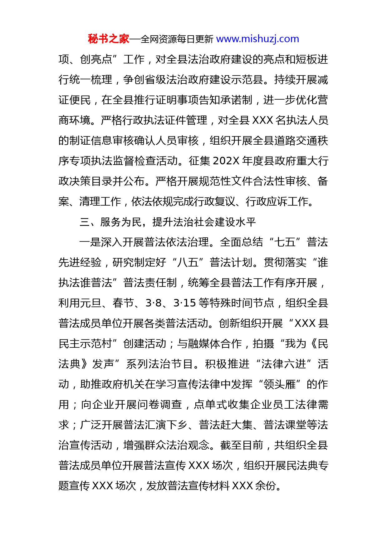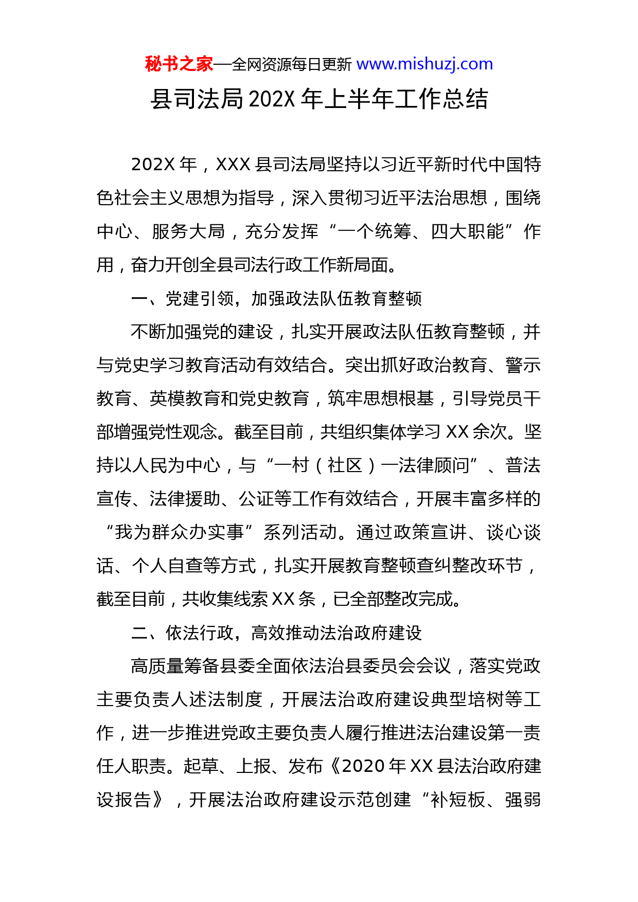 秘书之家—全网资源每日更新www.mishuzj.com县司法局202X年上半年工作总结202X年,XXX县司法局坚持以习近平新时代中国特色社会主义思想为指导,深入贯彻习近平法治思想,围绕中心、服务大局,充分发挥“一个统筹、四大职能”作用,奋力开创全县司法行政工作新局面。一、党建引领,加强政法队伍教育整顿不断加强党的建设,扎实开展政法队伍教育整顿,并与党史学习教育活动有效结合。突出抓好政治教育、警示教育、英模教育和党史教育,筑牢思想根基,引导党员干部增强党性观念。截至目前,共组织集体学习XX余次。坚持以人民为中心,与“一村(社区)一法律顾问”、普法宣传、法律援助、公证等工作有效结合,开展丰富多样的“我为群众办实事”系列活动。通过政策宣讲、谈心谈话、个人自查等方式,扎实开展教育整顿查纠整改环节,截至目前,共收集线索XX条,已全部整改完成。二、依法行政,高效推动法治政府建设高质量筹备县委全面依法治县委员会会议,落实党政主要负责人述法制度,开展法治政府建设典型培树等工作,进一步推进党政主要负责人履行推进法治建设第一责任人职责。起草、上报、发布《2020年XX县法治政府建设报告》,开展法治政府建设示范创建“补短板、强弱秘书之家—全网资源每日更新www.mishuzj.com项、创亮点”工作,对全县法治政府建设的亮点和短板进行统一梳理,争创省级法治政府建设示范县。持续开展减证便民,在全县推行证明事项告知承诺制,进一步优化营商环境。严格行政执法证件管理,对全县XXX名执法人员的制证信息审核确认人员审核,组织开展全县道路交通秩序专项执法监督检查活动。征集202X年度县政府重大行政决策目录并公布。严格开展规范性文件合法性审核、备案、清理工作,依法依规完成行政复议、行政应诉工作。三、服务为民,提升法治社会建设水平一是深入开展普法依法治理。全面总结“七五”普法先进经验,研究制定好“八五”普法计划。贯彻落实“谁执法谁普法”普法责任制,统筹全县普法工作有序开展,利用元旦、春节、3·8、3·15等特殊时间节点,组织全县普法成员单位开展各类普法活动。创新组织开展“XXX县民主示范村”创建活动;与融媒体合作,拍摄“我为《民法典》发声”系列法治节目。积极推进“法律六进”活动,助推政府机关在学习宣传法律中发挥“领头雁”的作用;向企业开展问卷调查,点单式收集企业员工法律需求;广泛开展普法汇演下乡、普法赶大集、普法课堂等法治宣传活动,增强群众法治观念。截至目前,共组织全县普法成员单位开展普法宣传XXX场次,组织开展民法典专题宣传XXX场次,发放普法宣传材料XXX余份。秘书之家—全网资源每日更新www.mishuzj.com二是完善公共法律服务体系。统筹全县公共法律服务体系建设,以政府法律顾问、优秀律师为主体,成立专业法律服务队。实行法律援助三归零制度,建立法律援助工作流程标准体系,全面启用“法援在线”综合管理平台,实现服务流程标准化。开展保全证据公证等新型公证服务,严格落实“一次办好”,积极服务民生。上半年共受理指派法律援助案件XXX件,同比增长XX%,结案XXX件,同比增长XX%;共办理各类公证XXX件,同比下降XX%。三是提升律师行业管理服务水平。加强律师执业监管,开展律师行业突出问题专项治理,进一步规范律师执业行为。组织律师参加《公司审判实务系列首期课程》等十余项线上课程培训活动。缴纳律师事务所2020年度会费,顺利完成2020年度律师执业年度考核工作。四是加强社区矫正工作。深入贯彻落实“六不准”规定,着力完善突发事件信息报告、重要情况调度等制度,严格落实分段评估、分类管理等审批制度,提高社区矫正工作规范执法水平。成立特殊人群管控工作专班,扎实开展好安保维稳工作。坚持自查与智能化核查相结合,档案自查与评查相结合,对社区矫正对象进行实时监管,严防脱管失控和重新违法犯罪。截至目前,共有社区矫正对象XXX人,上半年接收社区矫正对象XX人,手机定位成功秘书之家—全网资源每日更新www.mishuzj.com率达到XX%以上。五是提升人民调解工作。加强人民调解组织建设,健全调解工作网络。充分发挥乡镇、村(社区)调委会作用,提高涉法纠纷、群体纠纷的调解实效。截止到目前,已完成调解案件XXX件,同比增长XX%,调解成功XXX件,成功率达到100%。六是建设“枫桥式司法所”。按照“统一规划、分步实施、重点突破、稳步推进”的思路,不断加强品牌调解室创建、调解员队伍建设,全力推进司法所建设规范提升工程。截至目前,已完成XX个司法所的规范化建设工作,其余司法所正在规划打造中。我县司法行政工作虽取得了一定的成绩,但也存在着以下问题:一是县委依法治县委员会办公室统筹协调力度不大,法治政府示范创建推动力量不足;二是法律顾问作用发挥不足,县级财政配套资金不到位;三是司法所建设场地协调不到位,资金不足;四是农村基层干部法律知识缺乏,普通群众法律意识淡薄,处理社会事务的能力和水平不高。下一步,XXX县司法局将继续立足职能,聚力攻坚,精准助力全县乡村振兴、优化营商环境等重大战略,夯实好法治品牌培树工作,做好普法扶贫“双精准”工作,努力为加快建设“富强、活力、幸福、美丽”新时代现代化秘书之家—全网资源每日更新www.mishuzj.com新XXX提供坚强