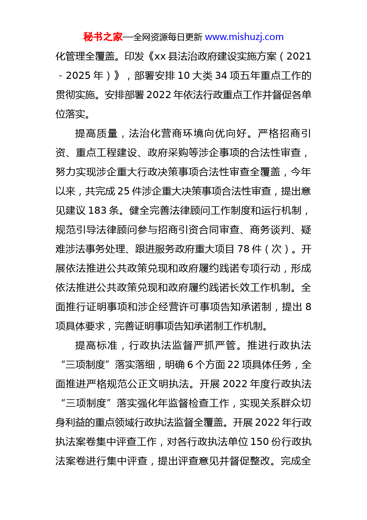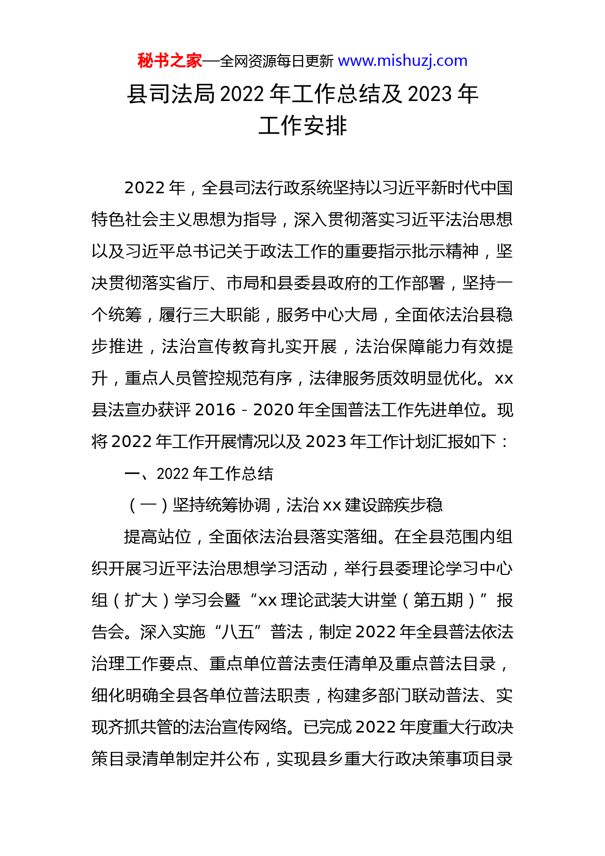 秘书之家—全网资源每日更新www.mishuzj.com县司法局2022年工作总结及2023年工作安排2022年,全县司法行政系统坚持以习近平新时代中国特色社会主义思想为指导,深入贯彻落实习近平法治思想以及习近平总书记关于政法工作的重要指示批示精神,坚决贯彻落实省厅、市局和县委县政府的工作部署,坚持一个统筹,履行三大职能,服务中心大局,全面依法治县稳步推进,法治宣传教育扎实开展,法治保障能力有效提升,重点人员管控规范有序,法律服务质效明显优化。xx县法宣办获评2016-2020年全国普法工作先进单位。现将2022年工作开展情况以及2023年工作计划汇报如下:一、2022年工作总结(一)坚持统筹协调,法治xx建设蹄疾步稳提高站位,全面依法治县落实落细。在全县范围内组织开展习近平法治思想学习活动,举行县委理论学习中心组(扩大)学习会暨“xx理论武装大讲堂(第五期)”报告会。深入实施“八五”普法,制定2022年全县普法依法治理工作要点、重点单位普法责任清单及重点普法目录,细化明确全县各单位普法职责,构建多部门联动普法、实现齐抓共管的法治宣传网络。已完成2022年度重大行政决策目录清单制定并公布,实现县乡重大行政决策事项目录秘书之家—全网资源每日更新www.mishuzj.com化管理全覆盖。印发《xx县法治政府建设实施方案(2021-2025年)》,部署安排10大类34项五年重点工作的贯彻实施。安排部署2022年依法行政重点工作并督促各单位落实。提高质量,法治化营商环境向优向好。严格招商引资、重点工程建设、政府采购等涉企事项的合法性审查,努力实现涉企重大行政决策事项合法性审查全覆盖,今年以来,共完成25件涉企重大决策事项合法性审查,提出意见建议183条。健全完善法律顾问工作制度和运行机制,规范引导法律顾问参与招商引资合同审查、商务谈判、疑难涉法事务处理、跟进服务政府重大项目78件(次)。开展依法推进公共政策兑现和政府履约践诺专项行动,形成依法推进公共政策兑现和政府履约践诺长效工作机制。全面推行证明事项和涉企经营许可事项告知承诺制,提出8项具体要求,完善证明事项告知承诺制工作机制。提高标准,行政执法监督严抓严管。推进行政执法“三项制度”落实落细,明确6个方面22项具体任务,全面推进严格规范公正文明执法。开展2022年度行政执法“三项制度”落实强化年监督检查工作,实现关系群众切身利益的重点领域行政执法监督全覆盖。开展2022年行政执法案卷集中评查工作,对各行政执法单位150份行政执法案卷进行集中评查,提出评查意见并督促整改。完成全秘书之家—全网资源每日更新www.mishuzj.com县行政执法数据统计年报工作,强化xx省行政执法综合管理监督平台应用工作。提高水平,合法性审查工作有条有理。严格落实《xx县人民政府重大事项合法性审查提前介入机制运行规则》,将合法性审查的“关口”前移。落实政府组成部门合法性审查机构全覆盖,县乡两级共有56个行政单位设立专门合法性审查机构,共有47个行政单位聘请法律顾问或公职律师参与合法性审查。持续加强我县合法性审查业务能力建设,组织开展合法性审查业务培训。今年以来,已完成合法性审查48件,提出合法性审查意见313条,参与其他涉法性事务70余件。完成6件县政府制定行政规范性文件按法定程序报送省人民政府、县人大常委会备案审查。组织对19件省、市立法草案征求意见稿认真研究并及时反馈意见,并按要求报送立法项目建议。提高质效,行政复议案件办理高质高效。2022年以来,办理县本级行政机关行政应诉案件17件,协调指导办理县政府部门办理行政应诉案件18件,行政机关负责人出庭率达100%。办理、受理行政复议案件22件,其中涉及房地产、工程招投标、罚款金额巨大等重大、疑难、复杂行政复议案件5件,已办结15件,经调解后撤回申请结案率58.33%。行政机关负责人出庭应诉率100%。(二)坚持标本兼治,维护社会稳定和谐平安秘书之家—全网资源每日更新www.mishuzj.com社区矫正监管创新创优。目前在册社区矫正对象360人,实施“电子腕带+手机定位+APP管理+微信”核查四重监管,技防监管全覆盖。聚焦主题主线,开展“抓管理防风险保安全”护航党的大会专项活动和全县社区矫正隐患排查整治专项行动,建立重大风险隐患排查清单和重点对象工作台账,常态化开展矛盾纠纷排查,落实重点社区矫正对象“二级包案”制度,完善社区矫正对象外出管理等多项制度。注重教育教化,结合重要时间节点开展警示教育和主题走访活动,组织集中教育4000余人次,个别谈话教育千余人次,实地查访重点社区矫正对象50余人次。结合,组织社区矫正对象积极参加乡村振兴、疫情防控、移风易俗等中心工作2000余人次。着力帮困扶助,开展“送温暖”活动,对符合司法救助条件的对象积极帮助其申请司法救助,今年以来共为3名社区矫正对象申请获得了司法救助共计45000元;摸排查访社区矫正对象就业情况,开展2022年度社区矫正对象就业技能培训。严格规范执法,常态化开展社区矫正工作督查,开展社区矫正案卷检查工作,及时指出社区矫正执法过程中的问题并督促整改,确保社区矫正工作提质增效;组织社区矫正岗位技能大练兵大比武活动,提升社区矫正工作人员业务能力。安置帮教工作扎实推进。严格落实“必接必送”要求和《xx县安置帮教工作