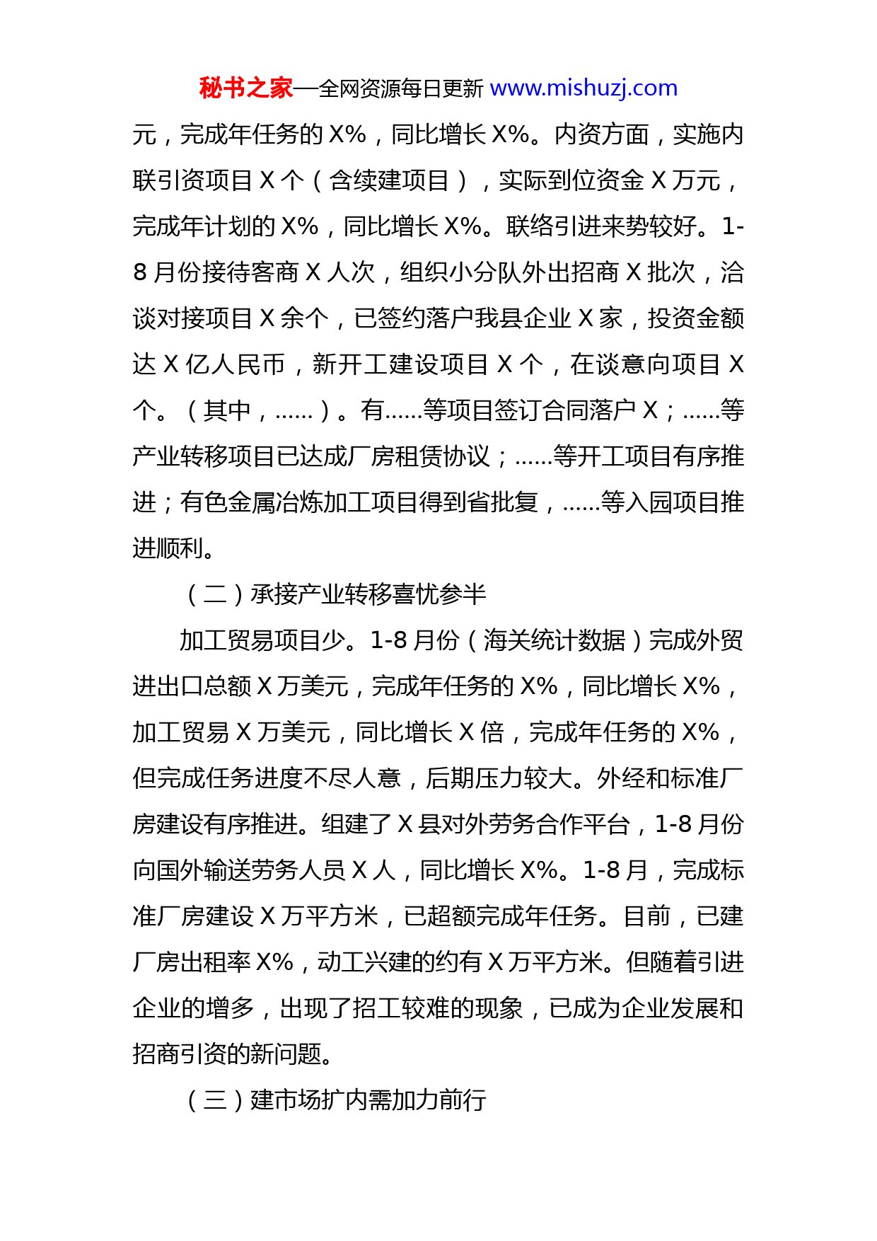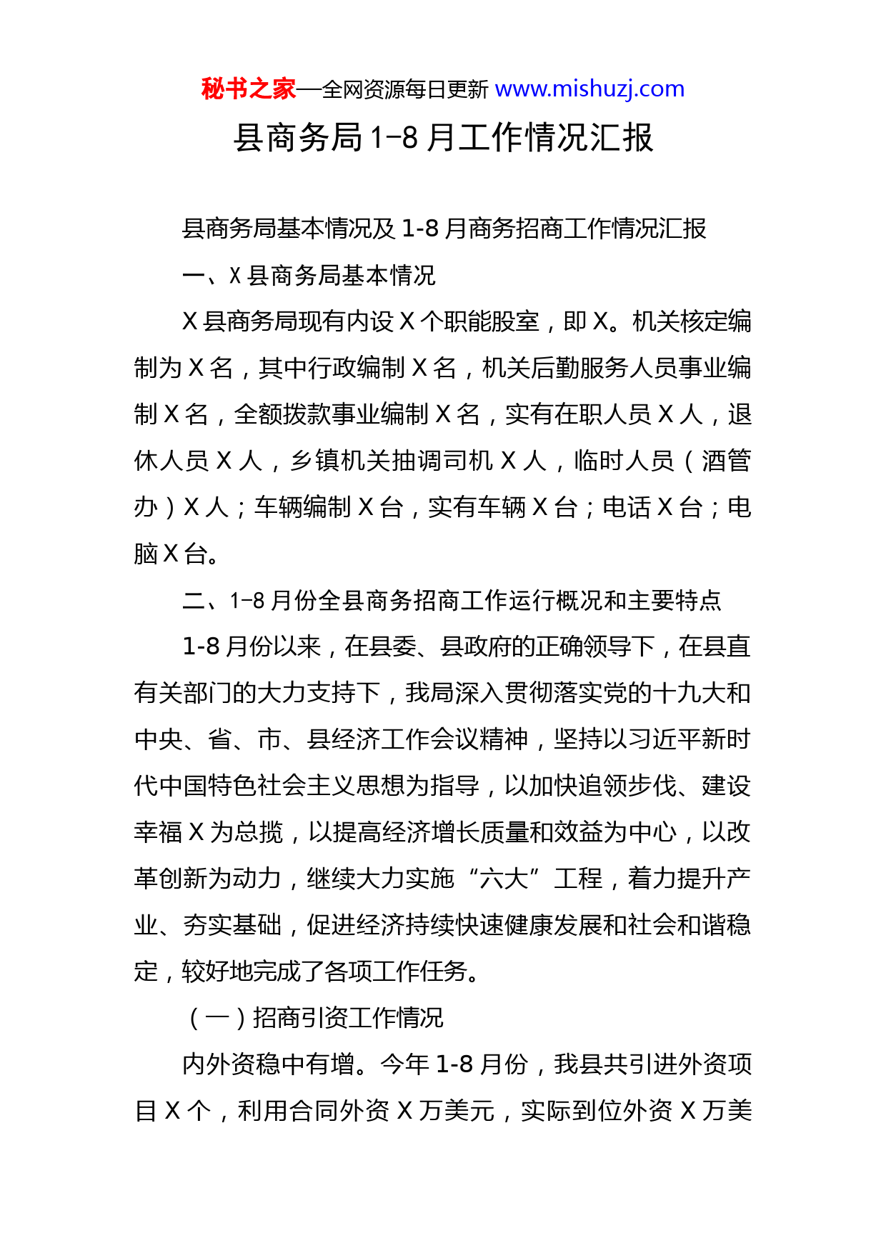 秘书之家—全网资源每日更新www.mishuzj.com县商务局1-8月工作情况汇报县商务局基本情况及1-8月商务招商工作情况汇报一、X县商务局基本情况X县商务局现有内设X个职能股室,即X。机关核定编制为X名,其中行政编制X名,机关后勤服务人员事业编制X名,全额拨款事业编制X名,实有在职人员X人,退休人员X人,乡镇机关抽调司机X人,临时人员(酒管办)X人;车辆编制X台,实有车辆X台;电话X台;电脑X台。二、1-8月份全县商务招商工作运行概况和主要特点1-8月份以来,在县委、县政府的正确领导下,在县直有关部门的大力支持下,我局深入贯彻落实党的十九大和中央、省、市、县经济工作会议精神,坚持以习近平新时代中国特色社会主义思想为指导,以加快追领步伐、建设幸福X为总揽,以提高经济增长质量和效益为中心,以改革创新为动力,继续大力实施“六大”工程,着力提升产业、夯实基础,促进经济持续快速健康发展和社会和谐稳定,较好地完成了各项工作任务。(一)招商引资工作情况内外资稳中有增。今年1-8月份,我县共引进外资项目X个,利用合同外资X万美元,实际到位外资X万美秘书之家—全网资源每日更新www.mishuzj.com元,完成年任务的X%,同比增长X%。内资方面,实施内联引资项目X个(含续建项目),实际到位资金X万元,完成年计划的X%,同比增长X%。联络引进来势较好。1-8月份接待客商X人次,组织小分队外出招商X批次,洽谈对接项目X余个,已签约落户我县企业X家,投资金额达X亿人民币,新开工建设项目X个,在谈意向项目X个。(其中,……)。有……等项目签订合同落户X;……等产业转移项目已达成厂房租赁协议;……等开工项目有序推进;有色金属冶炼加工项目得到省批复,……等入园项目推进顺利。(二)承接产业转移喜忧参半加工贸易项目少。1-8月份(海关统计数据)完成外贸进出口总额X万美元,完成年任务的X%,同比增长X%,加工贸易X万美元,同比增长X倍,完成年任务的X%,但完成任务进度不尽人意,后期压力较大。外经和标准厂房建设有序推进。组建了X县对外劳务合作平台,1-8月份向国外输送劳务人员X人,同比增长X%。1-8月,完成标准厂房建设X万平方米,已超额完成年任务。目前,已建厂房出租率X%,动工兴建的约有X万平方米。但随着引进企业的增多,出现了招工较难的现象,已成为企业发展和招商引资的新问题。(三)建市场扩内需加力前行秘书之家—全网资源每日更新www.mishuzj.com加速商贸流通发展。今年1-8月份,社会消费品零售总额保持上升态势,累计实现X亿元,同比增长X%,总量增幅排全市第X,但与我县今年社会消费品零售总额的增长预期目标X%有一定差距,主要原因是我县限额以上法人企业占比太低。继续推进“万村千乡市场工程”拉动内需。结合“民生X工程”,今年向上争取X家农家店建设指标已完成建设任务,目前,……已签订合同。有序推进……的提质改造,并将该四个市场纳入市“为民办实事”考核项目,五星饶家井农贸市场已正式营业。屠宰管理方面。1-8月份屠宰场共屠宰生猪X头,比去年同期增加X多头,预计X月底可超过X头,肉品出场合格率X%,病害猪无害化处理率达X%,处理私宰肉品X公斤,肉品市场运营已步入正轨。加大酒类的查处力度。1-8月份,执法人员出动X次,实现酒类“随附单”率X%以上,查处高档假酒X余瓶、白水杜康假酒一起,共价值X万多元。发放宣传资料X余份,立案查处无证无照经营户X家,下发责令整改通知书X份。成立X县加油站整治工作领导小组。制定了《X县成品油市场专项整治工作方案》,年初,我局联合……等部门对全县成品油市场开展了为期X天的专项整治工作,共下发整改通知书X余份,对……的非法加油站点实施了关闭或取缔;对非法提供散油的经营户进行了严厉的批评教育。X月召开了全县加油站年检工作会议,督促企业按时参秘书之家—全网资源每日更新www.mishuzj.com加年检。全县X家加油站目前已有X家企业参加了年检。行政审批服务情况。1-8月份,我局驻政务中心窗口共办理业务X件,其中外商投资企业设立与变更X件,酒类零售X件,酒类批发证X件,成品油审批件X件,备案单用途商业预付卡X家,无一件延期与投诉。三、当前存在的主要困难和原因分析(一)对外经贸合作下行压力大、外贸产品结构有待进一步优化。一是国际市场尚未有效复苏,全国对外进出口贸易呈下降趋势,企业订单减少。二是国际市场有色金属价格不稳定。受金融危机的影响,国际市场有色金属价格波动相当大,市场不确定因素多,利润微薄,企业不敢做多。三是外贸进出口及加工贸易企业主体偏少,缺乏龙头企业,规模以上项目少,品种单一。四是由于矿产资源整合,XX矿业等外贸企业缺乏加工原料;而南方石墨和银星有色去年在X体现业绩分别为X万美元、X万美元。像……等部分在X落地的企业因X商检、海关手续办理不及广东便捷等多方面原因,仍在广东等地报关,不在X体现外贸进出口业绩。(二)外资招商难,引进的外资企业数量较少、规模较小、项目储备不多。一是实际到位外资情况很不理想,我县的外资多属梯度内资,真正的外资项目很少。从数据上看,下半年合同外资余额仅有X万美元,而距X万美元秘书之家—全网资源每日更新www.mishuzj.com的市任务还差X万元美元,完成任务还需多引项目来支撑;二是外资统计口径严。近几年,国家、省商务部门统计的外资数据和国家外汇管理局统计的外汇