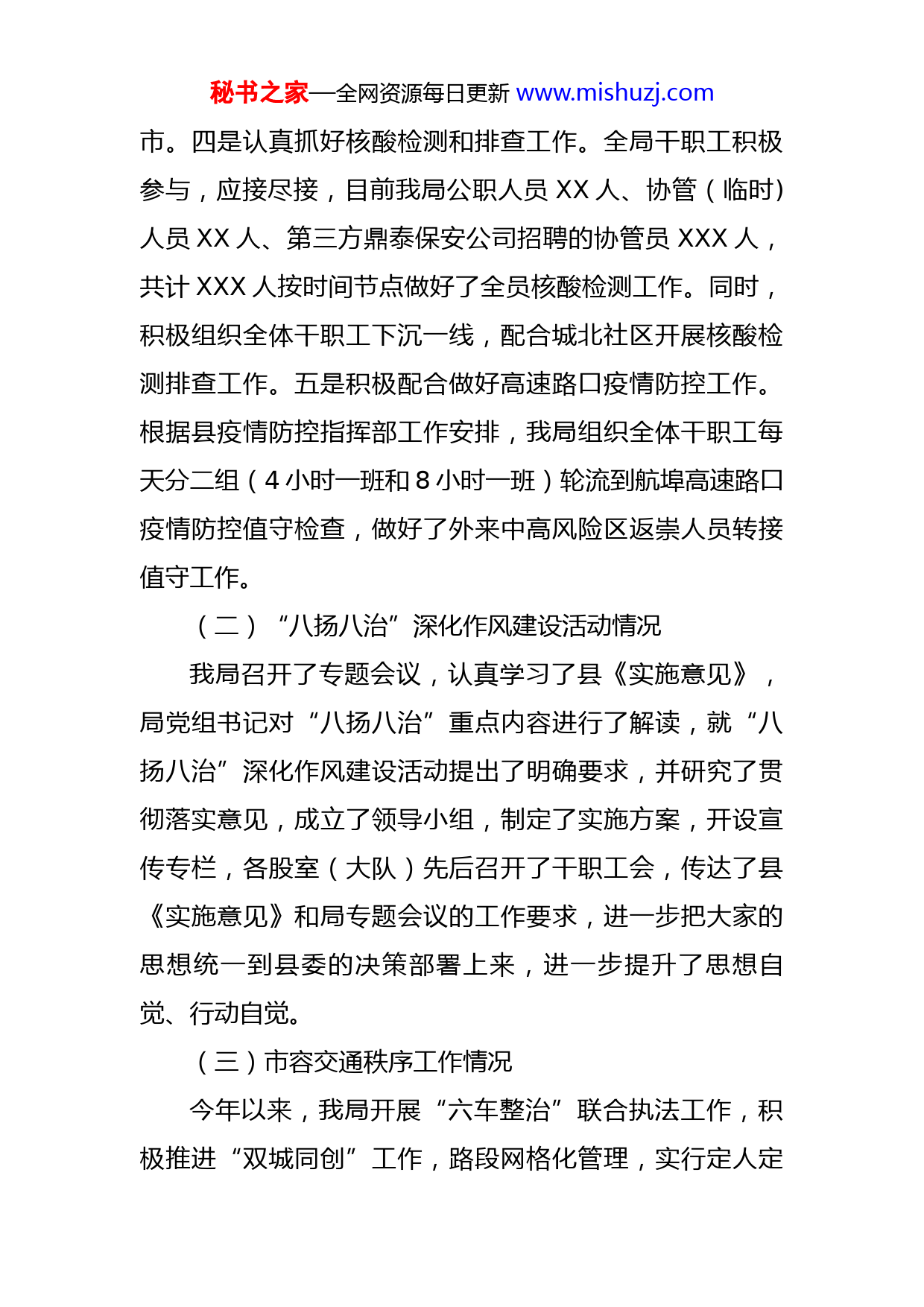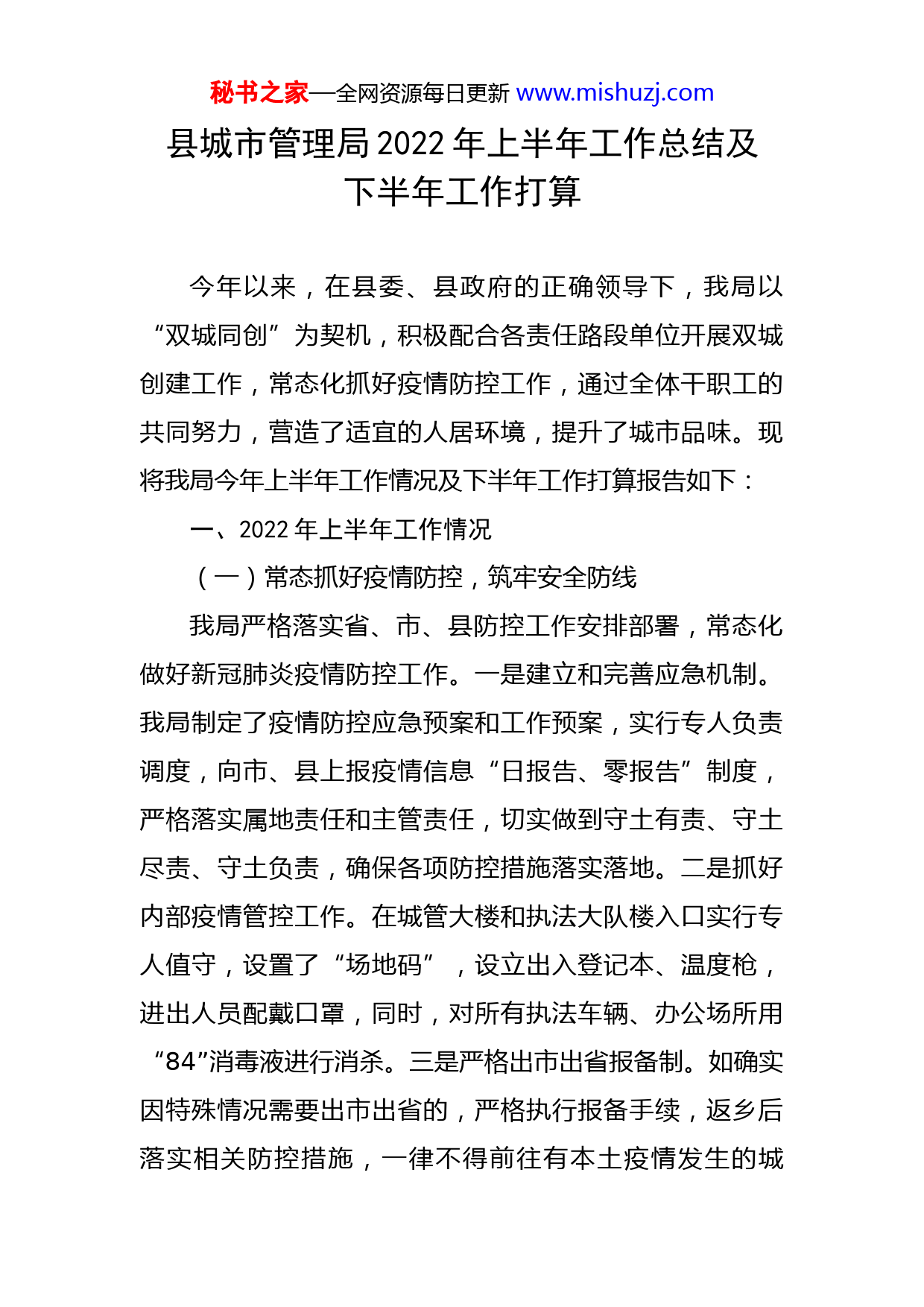 秘书之家—全网资源每日更新www.mishuzj.com县城市管理局2022年上半年工作总结及下半年工作打算今年以来,在县委、县政府的正确领导下,我局以“双城同创”为契机,积极配合各责任路段单位开展双城创建工作,常态化抓好疫情防控工作,通过全体干职工的共同努力,营造了适宜的人居环境,提升了城市品味。现将我局今年上半年工作情况及下半年工作打算报告如下:一、2022年上半年工作情况(一)常态抓好疫情防控,筑牢安全防线我局严格落实省、市、县防控工作安排部署,常态化做好新冠肺炎疫情防控工作。一是建立和完善应急机制。我局制定了疫情防控应急预案和工作预案,实行专人负责调度,向市、县上报疫情信息“日报告、零报告”制度,严格落实属地责任和主管责任,切实做到守土有责、守土尽责、守土负责,确保各项防控措施落实落地。二是抓好内部疫情管控工作。在城管大楼和执法大队楼入口实行专人值守,设置了“场地码”,设立出入登记本、温度枪,进出人员配戴口罩,同时,对所有执法车辆、办公场所用“84”消毒液进行消杀。三是严格出市出省报备制。如确实因特殊情况需要出市出省的,严格执行报备手续,返乡后落实相关防控措施,一律不得前往有本土疫情发生的城秘书之家—全网资源每日更新www.mishuzj.com市。四是认真抓好核酸检测和排查工作。全局干职工积极参与,应接尽接,目前我局公职人员XX人、协管(临时)人员XX人、第三方鼎泰保安公司招聘的协管员XXX人,共计XXX人按时间节点做好了全员核酸检测工作。同时,积极组织全体干职工下沉一线,配合城北社区开展核酸检测排查工作。五是积极配合做好高速路口疫情防控工作。根据县疫情防控指挥部工作安排,我局组织全体干职工每天分二组(4小时一班和8小时一班)轮流到航埠高速路口疫情防控值守检查,做好了外来中高风险区返崇人员转接值守工作。(二)“八扬八治”深化作风建设活动情况我局召开了专题会议,认真学习了县《实施意见》,局党组书记对“八扬八治”重点内容进行了解读,就“八扬八治”深化作风建设活动提出了明确要求,并研究了贯彻落实意见,成立了领导小组,制定了实施方案,开设宣传专栏,各股室(大队)先后召开了干职工会,传达了县《实施意见》和局专题会议的工作要求,进一步把大家的思想统一到县委的决策部署上来,进一步提升了思想自觉、行动自觉。(三)市容交通秩序工作情况今年以来,我局开展“六车整治”联合执法工作,积极推进“双城同创”工作,路段网格化管理,实行定人定秘书之家—全网资源每日更新www.mishuzj.com岗定责任管理城区市容交通秩序,不断加强管理和日常巡查工作,取得了良好效果。1、整治市容市貌。开展了校园周边环境、农贸市场周边秩序、永胜路、站前路、县府西路、中山路、建材市场、胜利市场沿河路、宝水市场、月池市场等周边秩序进行专项整治,劝离、引导XXX户进入农贸市场统一销售,劝导自产自销菜农XXX起,对XXX起违规占道经营、出店经营行为采取了暂扣物品措施;对婴幼尽有两起占道进行责令整改与处罚。每段路落实人员定岗巡查,并通过落实路段管理,强化对桥南各路段进行巡查,整治店外店堆放悬挂乱晒XXX处;整治出店经营XXX家;整治各学校周边流动摊贩XXX处;店面装修审批XX家;余土审批X家;开业、店庆占道审批X家;开业、店庆未经审批私自占道处罚X家;各路段审批店铺装饰装修XX家。2、整治交通秩序。春节期间免费开放临时停车点,设立提示牌XX块;对非机动车乱停乱放行为进行整治,共扣缴不按规定停放的电动车XXX辆。整治非机动车乱停乱放XXX起,对机动车占道进行抄牌XX辆。3、治理噪音扰民。联合公安、文化稽查、环保等职能部门对县城KTV音量分贝测试XX家,店外、超市音响音量控制XX起;在高考期间联合各职能部门对噪音扰民的KTV广场舞进行整改与劝阻,劝阻整改广场舞X处。秘书之家—全网资源每日更新www.mishuzj.com4、治理餐饮业油烟。一是对县城夜宵、烧烤、餐饮店及机关食堂、县属单位食堂、桥北区企业XX家已安装油烟净化设施进行排查运转、清洗情况,清洗率为100%。二是对新、改、扩建XX家的餐饮业单位要安装排放达标的油烟净化设施。三是对XX家已安装油烟净化设施,但不能达排放责令限期整改,目前已整改到位。四是对X家未按规定安装油烟净化器设施,责令限期安装油烟净化设施,目前已安装到位。油烟净化器排查XXX家。5、户外广告管理工作。我局开展户外广告专项整治行动,对城区道路两侧店牌、高空(墙体)广告等设施安全情况进行全面排查整治,拆除破损店招X处,并责令XX处店招牌进行整改,清理残留广告垃圾XX处,清理XXX余处牛皮癣、小广告、破旧条幅。6、工地源头扬尘管理工作。一是严控在建工地源头污染。各工地设置冲洗平台,加强对城区建筑工地出入口的日常管控工作,督促工地安排保洁人员和洒水车,落实建筑渣土及物料运输车辆的保洁措施,做好出场前的保洁和路面降尘工作。二是严格出场时渣土车辆的密闭运输检查。运输车辆渣土不得超过车厢挡板高度并覆盖,运输车辆应当在除泥、冲洗干净后方可驶出作业场所。三是严格规定时间、地点、路线运输渣土。对县城区范围内的所有运输渣土、建筑垃圾、混凝土车辆进行报备。四是规范建秘书之家—全网资源每日更新www.mishuzj.com筑