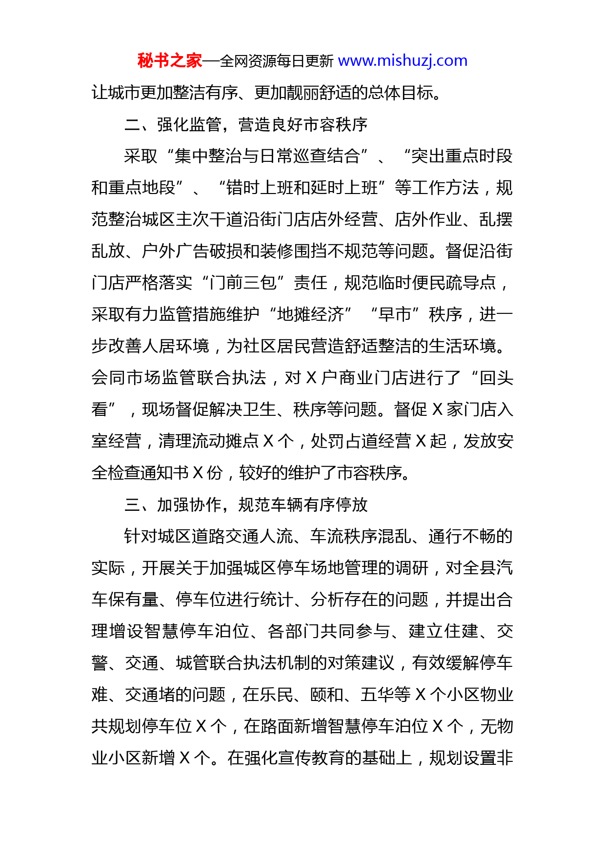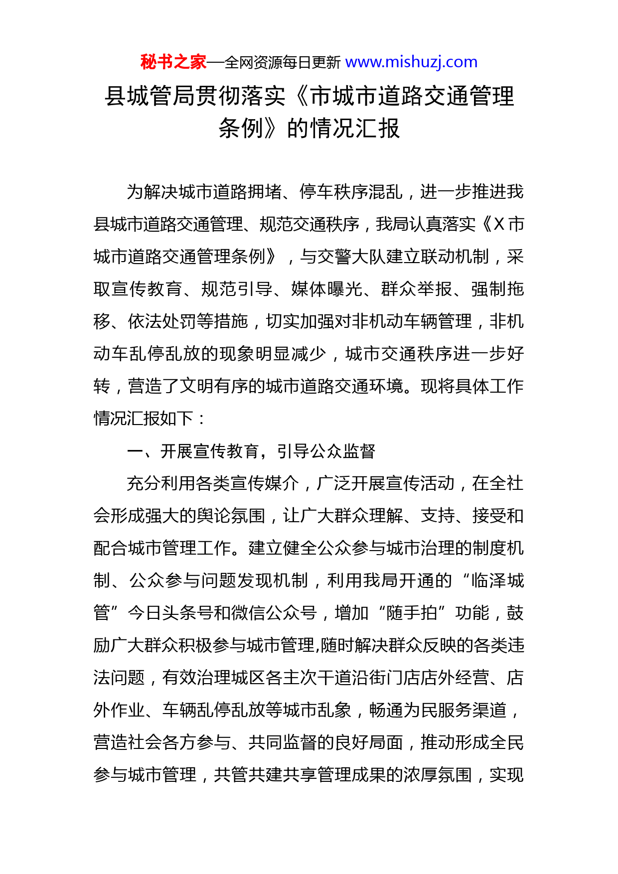 秘书之家—全网资源每日更新www.mishuzj.com县城管局贯彻落实《市城市道路交通管理条例》的情况汇报为解决城市道路拥堵、停车秩序混乱,进一步推进我县城市道路交通管理、规范交通秩序,我局认真落实《X市城市道路交通管理条例》,与交警大队建立联动机制,采取宣传教育、规范引导、媒体曝光、群众举报、强制拖移、依法处罚等措施,切实加强对非机动车辆管理,非机动车乱停乱放的现象明显减少,城市交通秩序进一步好转,营造了文明有序的城市道路交通环境。现将具体工作情况汇报如下:一、开展宣传教育,引导公众监督充分利用各类宣传媒介,广泛开展宣传活动,在全社会形成强大的舆论氛围,让广大群众理解、支持、接受和配合城市管理工作。建立健全公众参与城市治理的制度机制、公众参与问题发现机制,利用我局开通的“临泽城管”今日头条号和微信公众号,增加“随手拍”功能,鼓励广大群众积极参与城市管理,随时解决群众反映的各类违法问题,有效治理城区各主次干道沿街门店店外经营、店外作业、车辆乱停乱放等城市乱象,畅通为民服务渠道,营造社会各方参与、共同监督的良好局面,推动形成全民参与城市管理,共管共建共享管理成果的浓厚氛围,实现秘书之家—全网资源每日更新www.mishuzj.com让城市更加整洁有序、更加靓丽舒适的总体目标。二、强化监管,营造良好市容秩序采取“集中整治与日常巡查结合”、“突出重点时段和重点地段”、“错时上班和延时上班”等工作方法,规范整治城区主次干道沿街门店店外经营、店外作业、乱摆乱放、户外广告破损和装修围挡不规范等问题。督促沿街门店严格落实“门前三包”责任,规范临时便民疏导点,采取有力监管措施维护“地摊经济”“早市”秩序,进一步改善人居环境,为社区居民营造舒适整洁的生活环境。会同市场监管联合执法,对X户商业门店进行了“回头看”,现场督促解决卫生、秩序等问题。督促X家门店入室经营,清理流动摊点X个,处罚占道经营X起,发放安全检查通知书X份,较好的维护了市容秩序。三、加强协作,规范车辆有序停放针对城区道路交通人流、车流秩序混乱、通行不畅的实际,开展关于加强城区停车场地管理的调研,对全县汽车保有量、停车位进行统计、分析存在的问题,并提出合理增设智慧停车泊位、各部门共同参与、建立住建、交警、交通、城管联合执法机制的对策建议,有效缓解停车难、交通堵的问题,在乐民、颐和、五华等X个小区物业共规划停车位X个,在路面新增智慧停车泊位X个,无物业小区新增X个。在强化宣传教育的基础上,规划设置非秘书之家—全网资源每日更新www.mishuzj.com机动车停车位X处,并对原有的X处非机动停车位标识标线进行了更新。与交警大队建立联动机制,采取宣传教育、规范引导、媒体曝光、群众举报、强制拖移、依法处罚等措施,切实加强对非机动车辆管理。配合交警部门开展城区交通秩序专项整治行动X次,劝导车辆有序停放X台(次),发放宣传资料X多份,非机动车乱停乱放的现象明显减少,城市交通秩序进一步好转,营造了文明有序的城市道路交通环境。四、齐抓共管,建立联合执法机制针对城区主干道、繁华商业区、学校、医院等乱停乱靠现象突出路段,开展违法停车大整治,采取巡逻控制和定点严管相结合的方式,综合运用民警现场执法、粘贴《违法停车处理告知单》、清障车拖移、电视台曝光等手段,全面加大管理力度,促进规范停车。特别是在学生上学、放学的时间,可采取集中时段规范停车的措施,避免出现高峰时段交通拥堵、车辆乱停乱放的现象,为办事群众和外来旅游人员营造一个干净、整齐、有序的市容环境。对个别商户、住户利用物体故意占用公用停车位的行为进行耐心劝说教育和严厉处罚。要在媒体平台上曝光车辆违规乱停放、行人乱穿行、乱占用公共停车位等不文明交通现象,在全社会形成良好的氛围。