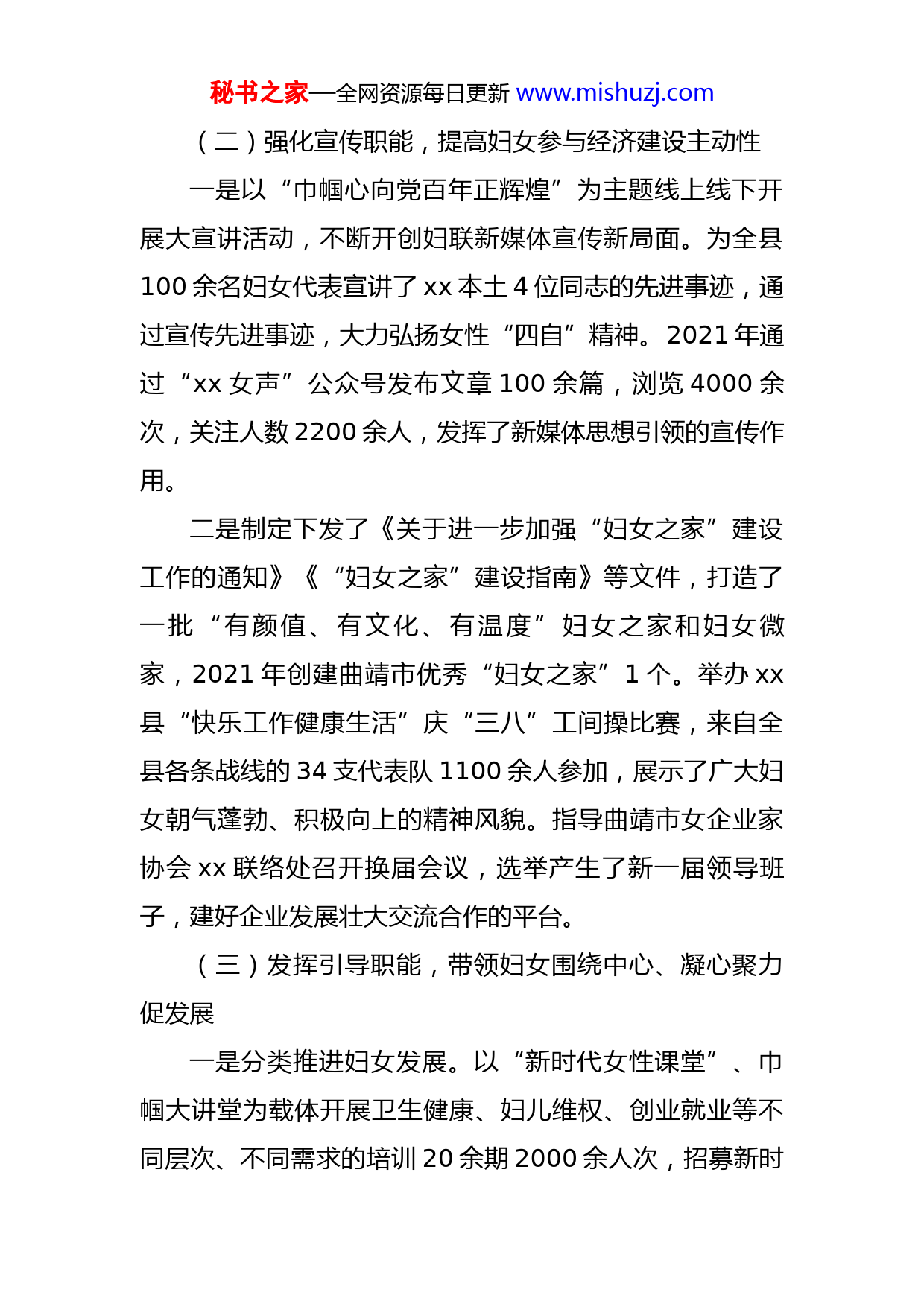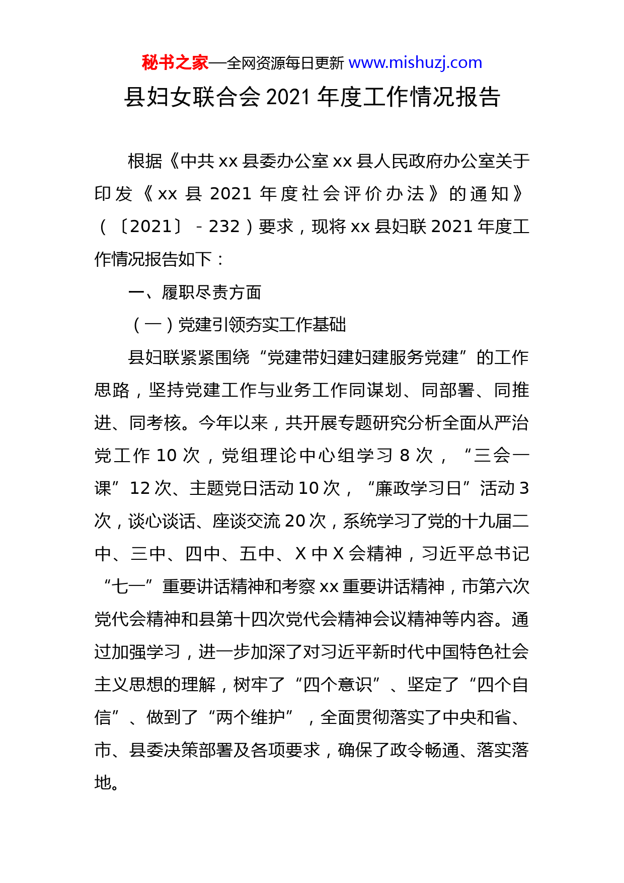 秘书之家—全网资源每日更新www.mishuzj.com县妇女联合会2021年度工作情况报告根据《中共xx县委办公室xx县人民政府办公室关于印发《xx县2021年度社会评价办法》的通知》(〔2021〕-232)要求,现将xx县妇联2021年度工作情况报告如下:一、履职尽责方面(一)党建引领夯实工作基础县妇联紧紧围绕“党建带妇建妇建服务党建”的工作思路,坚持党建工作与业务工作同谋划、同部署、同推进、同考核。今年以来,共开展专题研究分析全面从严治党工作10次,党组理论中心组学习8次,“三会一课”12次、主题党日活动10次,“廉政学习日”活动3次,谈心谈话、座谈交流20次,系统学习了党的十九届二中、三中、四中、五中、X中X会精神,习近平总书记“七一”重要讲话精神和考察xx重要讲话精神,市第六次党代会精神和县第十四次党代会精神会议精神等内容。通过加强学习,进一步加深了对习近平新时代中国特色社会主义思想的理解,树牢了“四个意识”、坚定了“四个自信”、做到了“两个维护”,全面贯彻落实了中央和省、市、县委决策部署及各项要求,确保了政令畅通、落实落地。秘书之家—全网资源每日更新www.mishuzj.com(二)强化宣传职能,提高妇女参与经济建设主动性一是以“巾帼心向党百年正辉煌”为主题线上线下开展大宣讲活动,不断开创妇联新媒体宣传新局面。为全县100余名妇女代表宣讲了xx本土4位同志的先进事迹,通过宣传先进事迹,大力弘扬女性“四自”精神。2021年通过“xx女声”公众号发布文章100余篇,浏览4000余次,关注人数2200余人,发挥了新媒体思想引领的宣传作用。二是制定下发了《关于进一步加强“妇女之家”建设工作的通知》《“妇女之家”建设指南》等文件,打造了一批“有颜值、有文化、有温度”妇女之家和妇女微家,2021年创建曲靖市优秀“妇女之家”1个。举办xx县“快乐工作健康生活”庆“三八”工间操比赛,来自全县各条战线的34支代表队1100余人参加,展示了广大妇女朝气蓬勃、积极向上的精神风貌。指导曲靖市女企业家协会xx联络处召开换届会议,选举产生了新一届领导班子,建好企业发展壮大交流合作的平台。(三)发挥引导职能,带领妇女围绕中心、凝心聚力促发展一是分类推进妇女发展。以“新时代女性课堂”、巾帼大讲堂为载体开展卫生健康、妇儿维权、创业就业等不同层次、不同需求的培训20余期2000余人次,招募新时秘书之家—全网资源每日更新www.mishuzj.com代女性课堂公益讲师52人、志愿者112人,充实课堂师资力量。为160余名妇女开展健康知识讲座2期,引导居民养成良好的个人卫生生活习惯。举办xx县乡村振兴巾帼致富带头人培训班,为170余名妇女讲授生猪养殖和魔芋种植知识,提高她们的致富能力。举办了为期8天的新时代女性课堂—育婴员和保育员技能培训,200余名妇女参加。二是重点推进妇女创业就业。组织围绕民生工作,以实施妇女创业贷款项目为抓手,推动妇女创业就业。第一时间通过“xx女声”“xxM”等平台发布2021年创业贷款公告,提高创业担保贷款的知晓率,使广大创业人员能普受惠、得实惠。截止目前,已发放创业贷款1320万元,帮扶74名创业者,带动300余人就业。发挥“巾帼巧手致富示范基地”、“巾帼农业示范基地”等“妇”字号示范基地作用,带动农村妇女因地制宜发展特色优势产业,促进农村产业兴旺。目前创建全国巾帼脱贫示范基地1个、省级巾帼脱贫示范基地4个,“巧女子”创业增收示范点11个,帮助数以千计的妇女实现就业。组织3名养殖女能手参加xx省巾帼科技致富带头人培训班,5名女企业家参加曲靖市创业创新培训,提高妇女的综合素质与致富能力。(四)履行维权职能,推动妇女儿童共享社会发展成秘书之家—全网资源每日更新www.mishuzj.com果一是创新机制,提升服务水平。实施妇女儿童权益保护“五项机制”,为妇女儿童的合法权益筑起了保护屏障。做好新一轮“两规划”编制工作。xx县实施妇女儿童发展规划(2011—2020年)终期评估工作顺利通过市考评验收,新一轮编制工作已经启动,县妇儿工委办定期组织相关单位召开会议,力求务实高效推进新规划的编制工作。成立xx县妇女儿童权益纠纷人民调解委员会和xx县中小学心理健康教育指导中心,制定印发了《关于进一步加强婚姻家庭纠纷人民调解工作的实施意见》和《关于成立xx县中小学心理健康指导中心的通知》,在全市率先建成首家融合警务、检察、审判为一体的综合性未成年人保护中心,使全县未成年人保护力量再升级、再发力。二是充实队伍,强化社会维权。推荐1名维权干部担任人民调解员和人民陪审员,积极参与法院、检察院等部门受理的家庭暴力、家事纠纷、离婚等婚姻家庭方面的案件调解审理工作,帮助化解矛盾纠纷。对涉及未成年人的离婚、抚养费、抚养权等亲情关系诉讼,及时加强对家长的亲职教育,以审判案例培育和践行社会主义核心价值观,促进家庭和睦社会和谐。截至目前,受理来信来访18件,办结18件,办结率达100%,认真落实12338热线“两查一通报”制度,确保热线服务作用有效发挥。秘书之家—全网资源每日更新www.mishuzj.com三是开展活动,扩大维权覆盖面。开展“弘扬婚育新风维护女性权益构建幸福家庭”宣传活动10余次,1000余名群众参加。利用“三八”妇女节、“六一”儿童节、禁毒宣传咨询月等契机开展维权