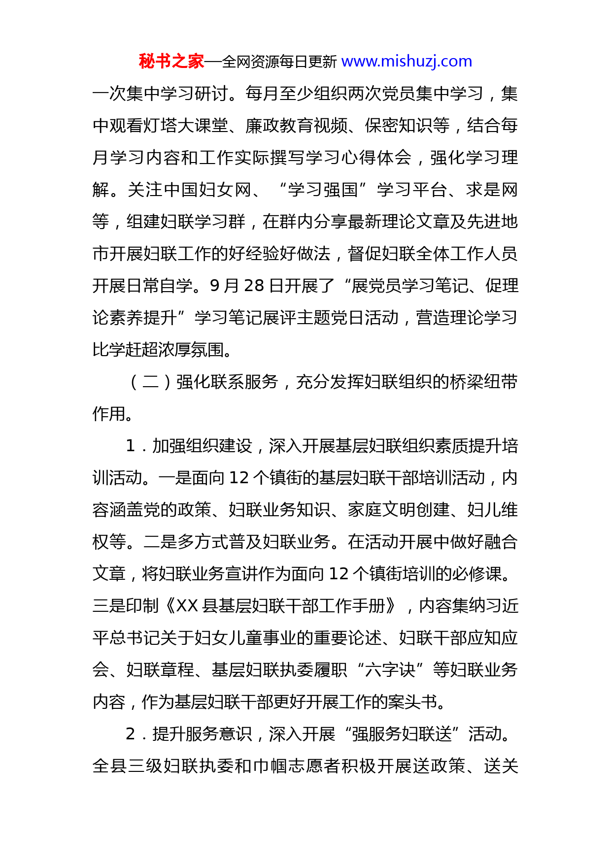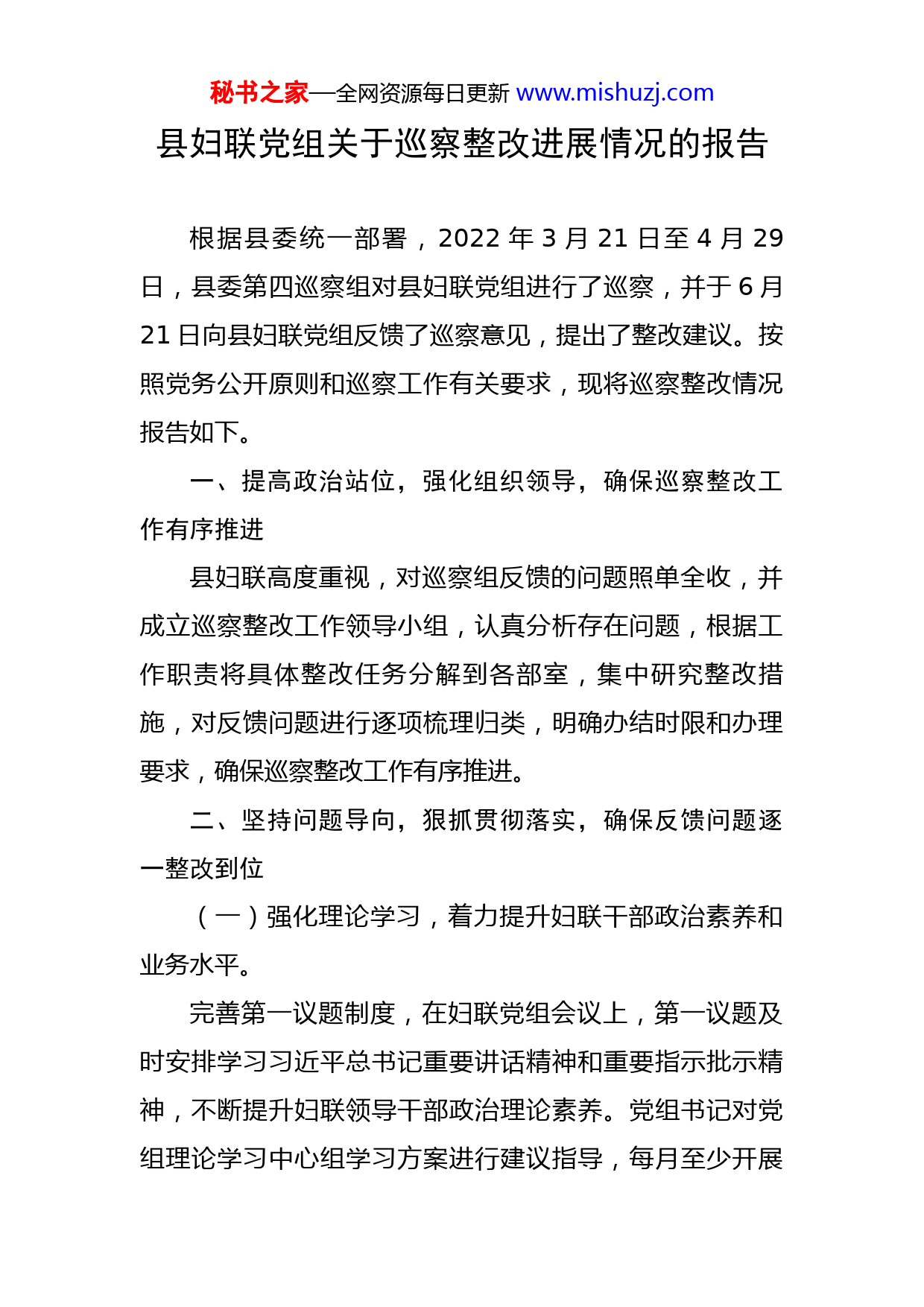 秘书之家—全网资源每日更新www.mishuzj.com县妇联党组关于巡察整改进展情况的报告根据县委统一部署,2022年3月21日至4月29日,县委第四巡察组对县妇联党组进行了巡察,并于6月21日向县妇联党组反馈了巡察意见,提出了整改建议。按照党务公开原则和巡察工作有关要求,现将巡察整改情况报告如下。一、提高政治站位,强化组织领导,确保巡察整改工作有序推进县妇联高度重视,对巡察组反馈的问题照单全收,并成立巡察整改工作领导小组,认真分析存在问题,根据工作职责将具体整改任务分解到各部室,集中研究整改措施,对反馈问题进行逐项梳理归类,明确办结时限和办理要求,确保巡察整改工作有序推进。二、坚持问题导向,狠抓贯彻落实,确保反馈问题逐一整改到位(一)强化理论学习,着力提升妇联干部政治素养和业务水平。完善第一议题制度,在妇联党组会议上,第一议题及时安排学习习近平总书记重要讲话精神和重要指示批示精神,不断提升妇联领导干部政治理论素养。党组书记对党组理论学习中心组学习方案进行建议指导,每月至少开展秘书之家—全网资源每日更新www.mishuzj.com一次集中学习研讨。每月至少组织两次党员集中学习,集中观看灯塔大课堂、廉政教育视频、保密知识等,结合每月学习内容和工作实际撰写学习心得体会,强化学习理解。关注中国妇女网、“学习强国”学习平台、求是网等,组建妇联学习群,在群内分享最新理论文章及先进地市开展妇联工作的好经验好做法,督促妇联全体工作人员开展日常自学。9月28日开展了“展党员学习笔记、促理论素养提升”学习笔记展评主题党日活动,营造理论学习比学赶超浓厚氛围。(二)强化联系服务,充分发挥妇联组织的桥梁纽带作用。1.加强组织建设,深入开展基层妇联组织素质提升培训活动。一是面向12个镇街的基层妇联干部培训活动,内容涵盖党的政策、妇联业务知识、家庭文明创建、妇儿维权等。二是多方式普及妇联业务。在活动开展中做好融合文章,将妇联业务宣讲作为面向12个镇街培训的必修课。三是印制《XX县基层妇联干部工作手册》,内容集纳习近平总书记关于妇女儿童事业的重要论述、妇联干部应知应会、妇联章程、基层妇联执委履职“六字诀”等妇联业务内容,作为基层妇联干部更好开展工作的案头书。2.提升服务意识,深入开展“强服务妇联送”活动。全县三级妇联执委和巾帼志愿者积极开展送政策、送关秘书之家—全网资源每日更新www.mishuzj.com爱、送温暖、送法律等活动。县妇联多次开展慰问活动,在六一儿节期间开展“爱心妈妈”慰问活动,为留守儿童送上学习用品等;八一期间,慰问了最美兵妈妈、困难老兵;为援护归来的抗疫勇士、援青干部家属送上关心关爱;联合爱心企业对困难企业“两癌”妇女进行慰问救助等。同时结合时间节点,开展网络文明、网络安全、家风家教、妇女维权、两癌防治、垃圾分类等宣传活动。镇村妇联执委也开展了巾帼宣讲、美丽庭院创建、洁净扶贫、儿童关爱等活动,提升履职能力的同时,也提高了基层妇女群众的满意度。3.坚持“人民至上”,以扎实工作着力满足群众需求。今年以来,在面向群众开展创业就业培训工作中,注重了解群众需求,采取“列单—点单—送单”的方式,相继在12个镇街开展家政技能培训14场次,受众人次1100余人,培训内容针对性强,每场培训结束后,以调查问卷和随机询问的方式,及时了解群众反馈和满意度。在姜店镇举办电商培训,通过妇联三级组织体系进行提前通知预告,吸引真正有需求的妇女群众参加培训,反馈良好。加强“XX女性”公众号在基层妇联组织中的宣传力度,丰富公众号内容,将群众关心的上级政策、红色故事、家庭家教、妇女维权、技能培训等实用知识等充实进公众号内容中,提高公众号的吸引力。秘书之家—全网资源每日更新www.mishuzj.com4.强化自身建设,通过学习不断提升业务工作能力。在日常学习中增加对婚姻家庭相关法律法规的学习,逐步提升学法用法和服务水平。邀请专家老师开展婚姻家庭及相关法律法规的业务培训,着力提升妇联系统工作人员的普法意识和普法能力。微信公众号持续开设“普法微课堂”,大力宣传妇女儿童权益保护相关法律法规,在朋友圈及镇街妇联群里广泛转发宣传。成立县家庭教育法治工作站、镇家庭教育法治工作所,与司法系统结合,提升面向妇女群众的普法服务水平。8月份,县妇联开展两期2022暑期法制教育大讲堂进基层活动。同时,加强镇街、村级普法宣传活动。9月20日,XXXX镇妇联开展“开学第一课法治进校园”活动。9月28日,XX镇妇联开展“法治宣传进校园护航青春正成长”教育活动。5.规范开展评选树优工作,营造良好的示范带动氛围。以强化示范引领为导向,制定具体评选流程,规范化开展各项评选树优活动。党组会对评选事项进行研究,制定方案,广泛发动,严格审核、公示等程序,并对评选出的优秀事迹进行展评宣传。6.加大日常督导,持续开展“美丽庭院”创建整改提升行动。加大宣传力度,充分利用线上线下渠道、多种宣传方式对“美丽庭院”创建工作进行广泛宣传。以“四不两直”随机抽查+常规检查的方式加强督导检查力度,对秘书之家—全网资源每日更新www.mishuzj.com在日常创建中表现突出的示范户给予物质奖励。通过“宣传+督导+激励”的