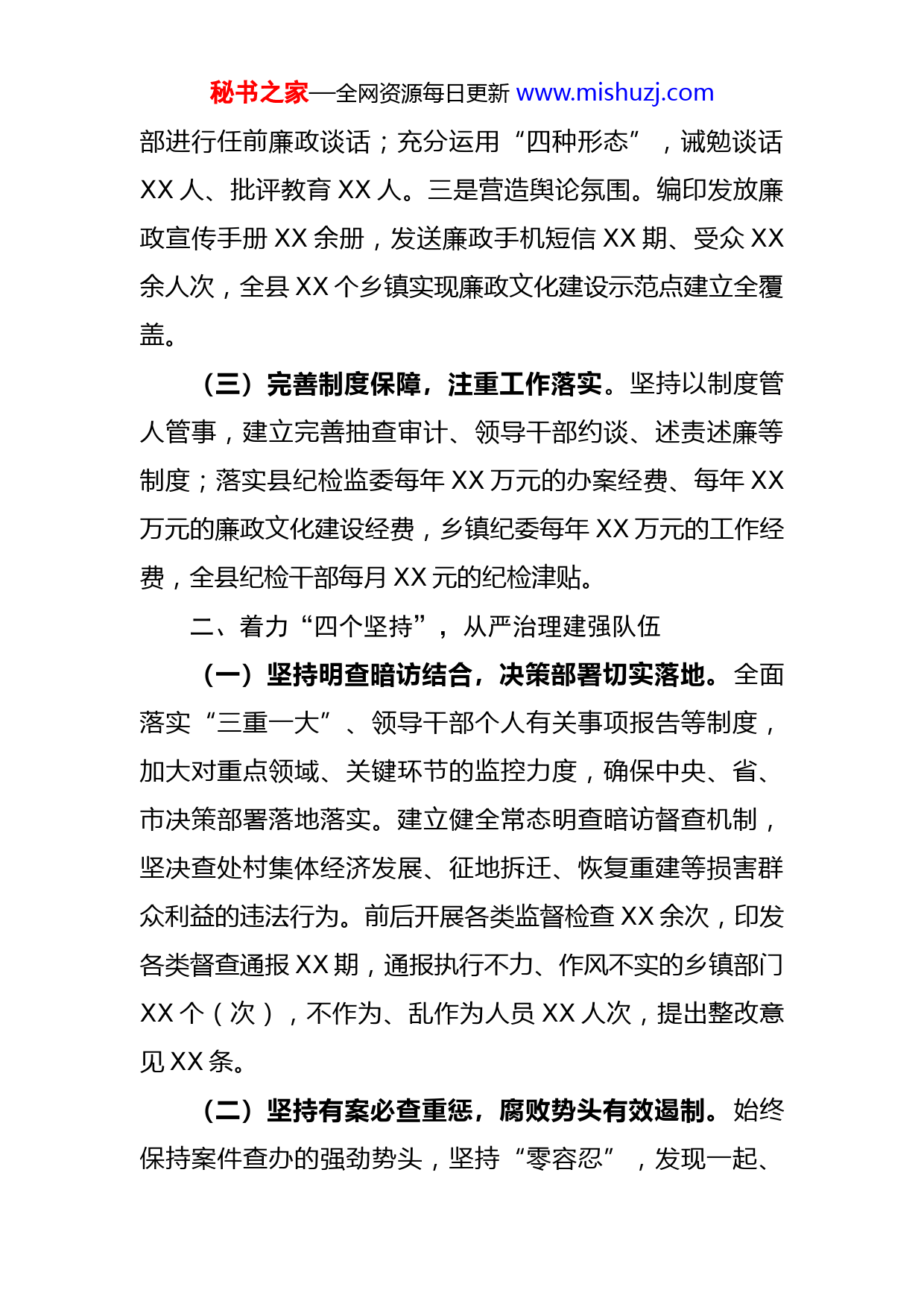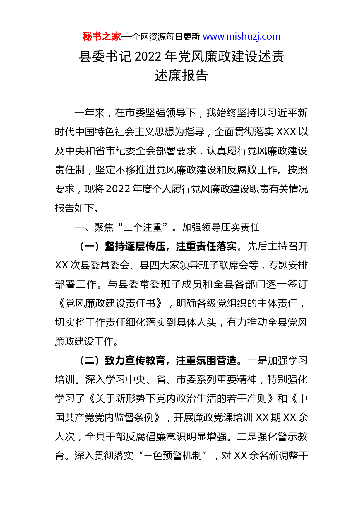 秘书之家—全网资源每日更新www.mishuzj.com县委书记2022年党风廉政建设述责述廉报告一年来,在市委坚强领导下,我始终坚持以习近平新时代中国特色社会主义思想为指导,全面贯彻落实XXX以及中央和省市纪委全会部署要求,认真履行党风廉政建设责任制,坚定不移推进党风廉政建设和反腐败工作。按照要求,现将2022年度个人履行党风廉政建设职责有关情况报告如下。一、聚焦“三个注重”,加强领导压实责任(一)坚持逐层传压,注重责任落实。先后主持召开XX次县委常委会、县四大家领导班子联席会等,专题安排部署工作。与县委常委班子成员和全县各部门逐一签订《党风廉政建设责任书》,明确各级党组织的主体责任,切实将工作责任细化落实到具体人头,有力推动全县党风廉政建设工作。(二)致力宣传教育,注重氛围营造。一是加强学习培训。深入学习中央、省、市委系列重要精神,特别强化学习了《关于新形势下党内政治生活的若干准则》和《中国共产党党内监督条例》,开展廉政党课培训XX期XX余人次,全县干部反腐倡廉意识明显增强。二是强化警示教育。深入贯彻落实“三色预警机制”,对XX余名新调整干秘书之家—全网资源每日更新www.mishuzj.com部进行任前廉政谈话;充分运用“四种形态”,诫勉谈话XX人、批评教育XX人。三是营造舆论氛围。编印发放廉政宣传手册XX余册,发送廉政手机短信XX期、受众XX余人次,全县XX个乡镇实现廉政文化建设示范点建立全覆盖。(三)完善制度保障,注重工作落实。坚持以制度管人管事,建立完善抽查审计、领导干部约谈、述责述廉等制度;落实县纪检监委每年XX万元的办案经费、每年XX万元的廉政文化建设经费,乡镇纪委每年XX万元的工作经费,全县纪检干部每月XX元的纪检津贴。二、着力“四个坚持”,从严治理建强队伍(一)坚持明查暗访结合,决策部署切实落地。全面落实“三重一大”、领导干部个人有关事项报告等制度,加大对重点领域、关键环节的监控力度,确保中央、省、市决策部署落地落实。建立健全常态明查暗访督查机制,坚决查处村集体经济发展、征地拆迁、恢复重建等损害群众利益的违法行为。前后开展各类监督检查XX余次,印发各类督查通报XX期,通报执行不力、作风不实的乡镇部门XX个(次),不作为、乱作为人员XX人次,提出整改意见XX条。(二)坚持有案必查重惩,腐败势头有效遏制。始终保持案件查办的强劲势头,坚持“零容忍”,发现一起、秘书之家—全网资源每日更新www.mishuzj.com查处一起。建立群众举报“四亲自”制度,即:在处理重大问题中亲自接访群众代表、亲自安排部署调查、亲自听取调查情况反馈、亲自审阅调查结果;建立健全“联办联查”机制,全年共核实各类案件线索XX件,立案XX件,结案XX件,结案率100%;查处违纪人员XX人,腐败案件发生率降低了XX%。(三)坚持强化纠风治乱,干群关系更加密切。持续破除“四风”积弊顽症,加力整治“庸、懒、散、浮、拖”突出问题,全年开展各类效能督查XX次,全县通报XX人。建立完善了党风廉政建设社会评价反馈整改机制,积极引导干部群众对全县党风廉政工作客观公正评价;积极通过搭建信访举报平台、“开门大接访”等形式,畅通群众信访渠道,全年收到各类信访汇报XX件,办结XX件,办结率100%。(四)坚持严格干部选任,干部热情有效激发。认真落实省委“六个重视选用”、市委“四个一线”用人导向,有序开展干部选人各项工作。县XX个乡镇配备乡镇纪委书记XX人、专职纪委副书记XX人,基层纪检队伍不断壮大。切实抓好干部培养培训,不断提高干部整体素质;认真落实干部职工健康体检、谈心谈话等关爱措施,不断激发干部干事创业热情。三、践行“三个带头”,廉洁自律垂范争先秘书之家—全网资源每日更新www.mishuzj.com(一)带头加强学习筑牢防线。始终把学习放在首位,深入学习XXX,以及省、市纪委全会精神,不断提高廉洁从政和遵纪守法的意识,增强贯彻落实党的方针、政策的自觉性、坚定性,正确面对各种诱惑,时刻筑牢思想道德防线,永葆共产党人的廉洁本色。(二)带头廉洁从政做好表率。始终保持惩治贪腐高压态势,对违反廉政规定和党纪政纪的行为,坚持“零容忍”的态度,依法查办、顶格处理、绝不姑息。持续深入开展廉政警示教育,警醒鞭策干部要深刻吸取身边发生的腐败案件教训,时刻做到警钟长鸣。致力健全完善顶层设计,坚持用制度约束党员领导干部,不断巩固“不能腐、不敢腐、不愿腐”的良好政治生态。(三)带头严于律己树好形象。带头落实中央八项规定精神,严格落实“三不直接分管”原则,自觉接受广大干部群众对自己“八小时之外”的监督,个人下乡调研不搞排场、不搞形式,没有“跑官要官”、拉票贿选等违纪违规行为。切实履行好“班长”职责,加强对班子成员教育、管理、督促,杜绝裙带风。坚持“亲君子,远小人”,对自己的子女亲属和身边工作人员,经常教育、严格要求,不准打着个人旗号去办私事、谋私利。一年来,个人尽管严格落实党风廉政建设“两个责任”,躬身做全县反腐倡廉的“领头雁”,但仍然存在对秘书之家—全网资源每日更新www.mishuzj.com干部管理略显失之于软、失之于宽,警示教育没有做到经常化、制度化,全县党风廉政建设社会满意度评价排名靠后等问题。下步工作中,我将继续履行好党风廉政建设第一责