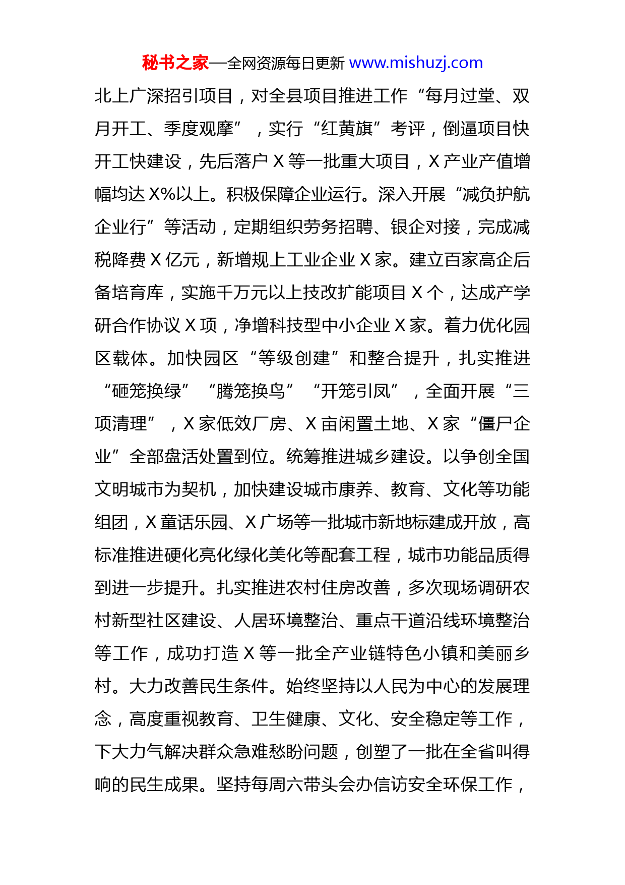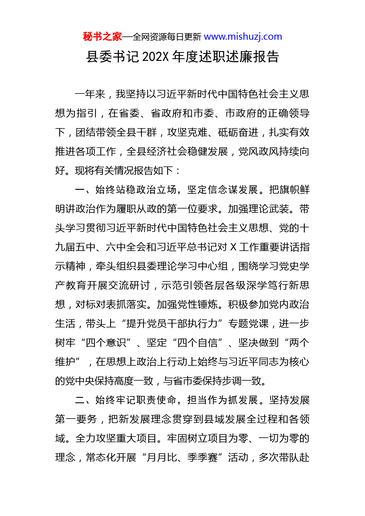 秘书之家—全网资源每日更新www.mishuzj.com县委书记202X年度述职述廉报告一年来,我坚持以习近平新时代中国特色社会主义思想为指引,在省委、省政府和市委、市政府的正确领导下,团结带领全县干群,攻坚克难、砥砺奋进,扎实有效推进各项工作,全县经济社会稳健发展,党风政风持续向好。现将有关情况报告如下:一、始终站稳政治立场,坚定信念谋发展。把旗帜鲜明讲政治作为履职从政的第一位要求。加强理论武装。带头学习贯彻习近平新时代中国特色社会主义思想、党的十九届五中、六中全会和习近平总书记对X工作重要讲话指示精神,牵头组织县委理论学习中心组,围绕学习党史学产教育开展交流研讨,示范引领各层各级深学笃行新思想,对标对表抓落实。加强党性锤炼。积极参加党内政治生活,带头上“提升党员干部执行力”专题党课,进一步树牢“四个意识”、坚定“四个自信”、坚决做到“两个维护”,在思想上政治上行动上始终与习近平同志为核心的党中央保持高度一致,与省市委保持步调一致。二、始终牢记职责使命,担当作为抓发展。坚持发展第一要务,把新发展理念贯穿到县域发展全过程和各领域。全力攻坚重大项目。牢固树立项目为零、一切为零的理念,常态化开展“月月比、季季赛”活动,多次带队赴秘书之家—全网资源每日更新www.mishuzj.com北上广深招引项目,对全县项目推进工作“每月过堂、双月开工、季度观摩”,实行“红黄旗”考评,倒逼项目快开工快建设,先后落户X等一批重大项目,X产业产值增幅均达X%以上。积极保障企业运行。深入开展“减负护航企业行”等活动,定期组织劳务招聘、银企对接,完成减税降费X亿元,新增规上工业企业X家。建立百家高企后备培育库,实施千万元以上技改扩能项目X个,达成产学研合作协议X项,净增科技型中小企业X家。着力优化园区载体。加快园区“等级创建”和整合提升,扎实推进“砸笼换绿”“腾笼换鸟”“开笼引凤”,全面开展“三项清理”,X家低效厂房、X亩闲置土地、X家“僵尸企业”全部盘活处置到位。统筹推进城乡建设。以争创全国文明城市为契机,加快建设城市康养、教育、文化等功能组团,X童话乐园、X广场等一批城市新地标建成开放,高标准推进硬化亮化绿化美化等配套工程,城市功能品质得到进一步提升。扎实推进农村住房改善,多次现场调研农村新型社区建设、人居环境整治、重点干道沿线环境整治等工作,成功打造X等一批全产业链特色小镇和美丽乡村。大力改善民生条件。始终坚持以人民为中心的发展理念,高度重视教育、卫生健康、文化、安全稳定等工作,下大力气解决群众急难愁盼问题,创塑了一批在全省叫得响的民生成果。坚持每周六带头会办信访安全环保工作,秘书之家—全网资源每日更新www.mishuzj.com常态化开展安全隐患大排查大整治大执法,高分通过省食品安全示范城市现场评审,国省安全生产巡察督导交办问题全部整改到位。三、始终注重强基固本,凝心聚力促发展。始终把加强抓好党建作为最大政绩,从严管好班子、带好队伍,政治生态积极向好。推动主体责任落实。严格落实全面从严治党主体责任,主动担起第一责任人责任,制定落实主体责任清单,明确了县委领导班子X项、县委主要负责同志X项、班子成员X项具体责任,督促班子成员履行“一岗双责”。全力支持纪检监察机关依纪依规履责,持续深化“正风肃纪镇村行”专项行动,立案查处违纪违法案件X件,以反腐倡廉的实际成效取信于民。充分发挥巡视“利剑”作用,做好巡视巡察反馈意见整改“后半篇文章”,有关做法得到省委巡视办充分肯定。强化基层组织建设。完成全省农村发展党员违规违纪问题排查整顿试点工作,“四查四对照”做法得到省委组织部肯定。创新开展“党建+村企结对、党建+集体增收、党建+安全生产”等活动,助推“万企联万村、共走振兴路”行动,基层组织活动的吸引力和感染力不断增强。压实意识形态责任。推行党委(党组)意识形态工作责任制清单制管理,X次召开专题会议研究意识形态工作,组织X轮责任制落实情况专项巡察,扎实推进新时代文明实践中心全国试点建设工作,秘书之家—全网资源每日更新www.mishuzj.com多元投入推进文化强县建设的做法被省委宣传部重点推介。四、始终带头以身作则,当好表率助发展。始终把勤政廉政作为立身之本、从政之基。带头执行民主集中制。严格落实“三重一大”事项集体决策、“末位发言”等制度,对事关全县经济社会发展的重大事项,一律提交常委会集体讨论、集体决定,保证决策科学民主。带头依法依规用权。认真贯彻市委《党政正职监督实施办法》要求,刚性执行“一把手”四个不直接分管等制度,在工程招标、土地出让等方面,不打招呼、不开口子、不写条子。带头做到廉洁自律。严格遵守党的各项纪律和国家法律法规,严格落实中央八项规定及其实施细则和省市委作风建设规定,主动接受各方面监督,及时报告个人重大事项,坚决同不正之风和消极腐败现象作斗争,带动形成政治清明、政府清廉、干部清正的良好政治生态。回顾一年的工作,虽然取得了一些成绩,但对照上级要求和群众期盼,还存在一些差距,主要是:以系统性思维推进工作还需要加强,特别是在创新工作举措、招引重大项目、破解发展难题上还需有更