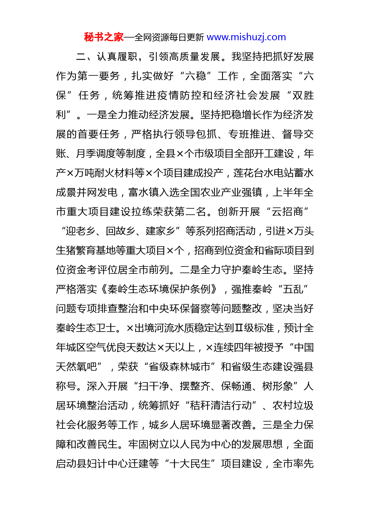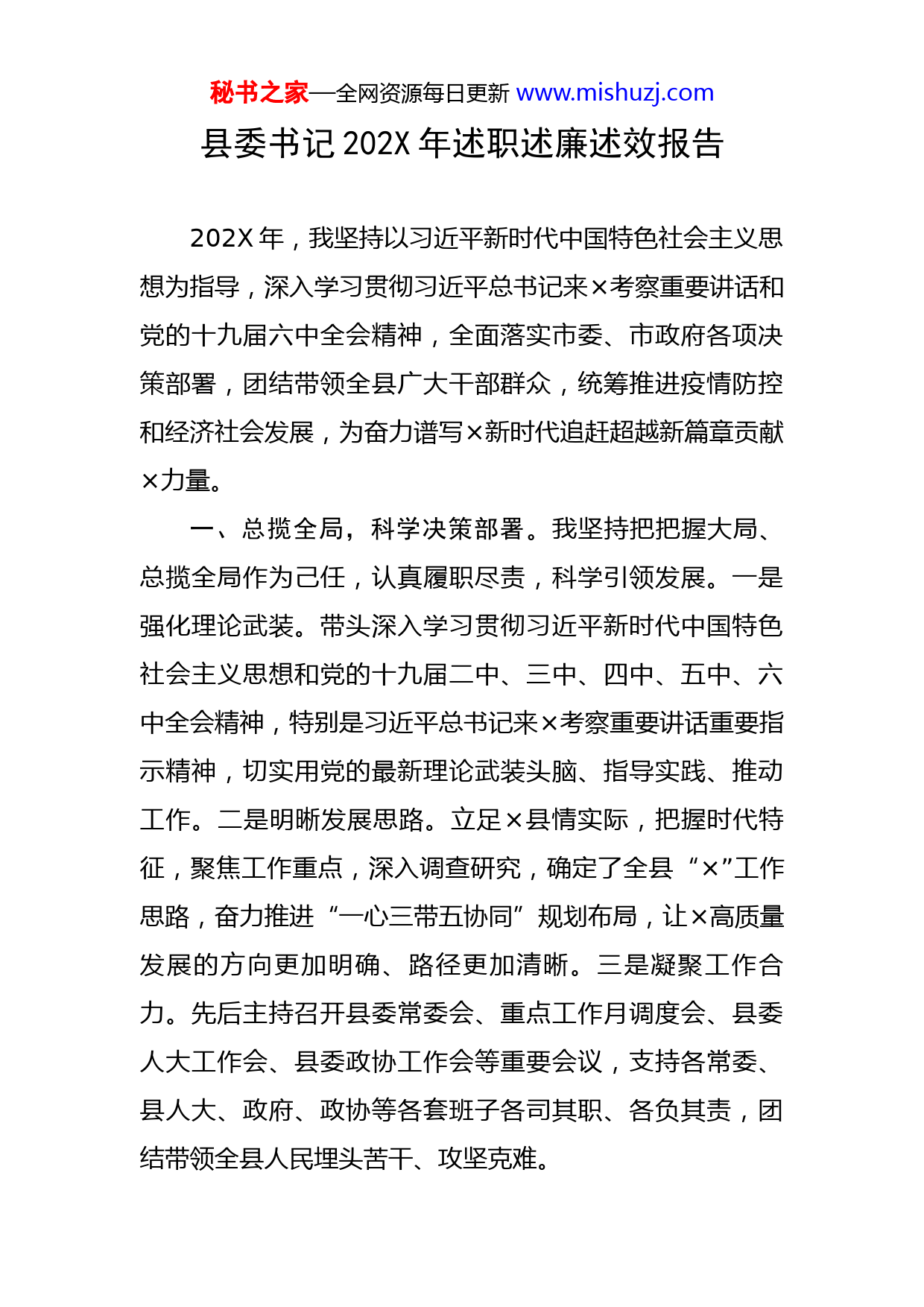 秘书之家—全网资源每日更新www.mishuzj.com县委书记202X年述职述廉述效报告202X年,我坚持以习近平新时代中国特色社会主义思想为指导,深入学习贯彻习近平总书记来×考察重要讲话和党的十九届六中全会精神,全面落实市委、市政府各项决策部署,团结带领全县广大干部群众,统筹推进疫情防控和经济社会发展,为奋力谱写×新时代追赶超越新篇章贡献×力量。一、总揽全局,科学决策部署。我坚持把把握大局、总揽全局作为己任,认真履职尽责,科学引领发展。一是强化理论武装。带头深入学习贯彻习近平新时代中国特色社会主义思想和党的十九届二中、三中、四中、五中、六中全会精神,特别是习近平总书记来×考察重要讲话重要指示精神,切实用党的最新理论武装头脑、指导实践、推动工作。二是明晰发展思路。立足×县情实际,把握时代特征,聚焦工作重点,深入调查研究,确定了全县“×”工作思路,奋力推进“一心三带五协同”规划布局,让×高质量发展的方向更加明确、路径更加清晰。三是凝聚工作合力。先后主持召开县委常委会、重点工作月调度会、县委人大工作会、县委政协工作会等重要会议,支持各常委、县人大、政府、政协等各套班子各司其职、各负其责,团结带领全县人民埋头苦干、攻坚克难。秘书之家—全网资源每日更新www.mishuzj.com二、认真履职,引领高质量发展。我坚持把抓好发展作为第一要务,扎实做好“六稳”工作,全面落实“六保”任务,统筹推进疫情防控和经济社会发展“双胜利”。一是全力推动经济发展。坚持把稳增长作为经济发展的首要任务,严格执行领导包抓、专班推进、督导交账、月季调度等制度,全县×个市级项目全部开工建设,年产×万吨耐火材料等×个项目建成投产,莲花台水电站蓄水成景并网发电,富水镇入选全国农业产业强镇,上半年全市重大项目建设拉练荣获第二名。创新开展“云招商”“迎老乡、回故乡、建家乡”等系列招商活动,引进×万头生猪繁育基地等重大项目×个,招商到位资金和省际项目到位资金考评位居全市前列。二是全力守护秦岭生态。坚持严格落实《秦岭生态环境保护条例》,强推秦岭“五乱”问题专项排查整治和中央环保督察等问题整改,坚决当好秦岭生态卫士。×出境河流水质稳定达到Ⅱ级标准,预计全年城区空气优良天数达×天以上,×连续四年被授予“中国天然氧吧”,荣获“省级森林城市”和省级生态建设强县称号。深入开展“扫干净、摆整齐、保畅通、树形象”人居环境整治活动,统筹抓好“秸秆清洁行动”、农村垃圾社会化服务等工作,城乡人居环境显著改善。三是全力保障和改善民生。牢固树立以人民为中心的发展思想,全面启动县妇计中心迁建等“十大民生”项目建设,全市率先秘书之家—全网资源每日更新www.mishuzj.com开通×G网络运营,我县再次被评为国家卫生县城;深入创建义务教育优质均衡发展县、省级健康促进县,×被评为全国“阳光校餐”数据平台项目示范县;扎实开展矛盾纠纷大排查大调处大化解百日行动,积极创建新时代“枫桥经验”×版乡村治理样板村,×被评为国家信访工作“三无”县、全省平安县。三、从严治党,优化政治生态。我坚持把抓好党建作为最大政绩,切实履行第一责任人职责,推动全面从严治党向纵深发展。一是全面加强政治建设。坚持以党的政治建设为统领,创新建立干部政治素质动态评价系统和干部“活”档案,建成全县党员“党性体检诊疗中心”,“闭环式”干部政治素质考查机制在中国组织人事报、×组信息、当代×专题报道。二是不断夯实基层基础。持续深化“党旗引领脱贫路”主题实践活动,扎实推进“五件实事硬事”,大力推行“三建三带”模式,全市率先成立农民工党委、西街商圈市场党支部等党组织,市委党建工作领导小组第二次会议暨基层党建工作现场观摩会在我县召开,全市党建项目建设观摩综合测评成绩排名第一,“红心向党、银以为荣”老干工作经验在全省离退休党建现场观摩会上交流。三是着力锻造过硬队伍。认真贯彻中央《关于进一步激励广大干部新时代新担当新作为的意见》,细化落实“三项机制”,创新“四推三看三考”办秘书之家—全网资源每日更新www.mishuzj.com法,树立“重实干重实绩”的鲜明用人导向。今年以来,提拔重用优秀年轻干部×名,占比×%,为×名疫情防控一线干部晋升职级,运用“三项机制”调整任用干部×人,占比×%。四是持续强化正风反腐。压茬推进巡察工作,扎实开展赵正永严重违纪违法案以案促改工作,深入推进“转作风、夯责任、抓落实、促发展”作风建设、领导干部违规插手干预工程建设和矿产开发突出问题等专项整治,全县政治生态不断优化。四、廉洁自律,永葆清正本色。我坚持把清正廉洁作为第一操守,自觉当好“关键少数”,永葆共产党人的政治本色。一是旗帜鲜明讲政治。牢记共产党员第一身份和为党工作第一职责,凡事从政治高度出发,凡事从全局角度考虑,凡事从群众维度谋划,真正将增强“四个意识”、坚定“四个自信”、做到“两个维护”落实在行动上。二是驰而不息转作风。认真贯彻《解决形式主义突出问题为基层减负的具体措施》,严格执行“今日之事不过夜,明日之事不过周,拿不下来就让位,在位就要负全责”的硬要求,教育引导全县干部牢记“心态决