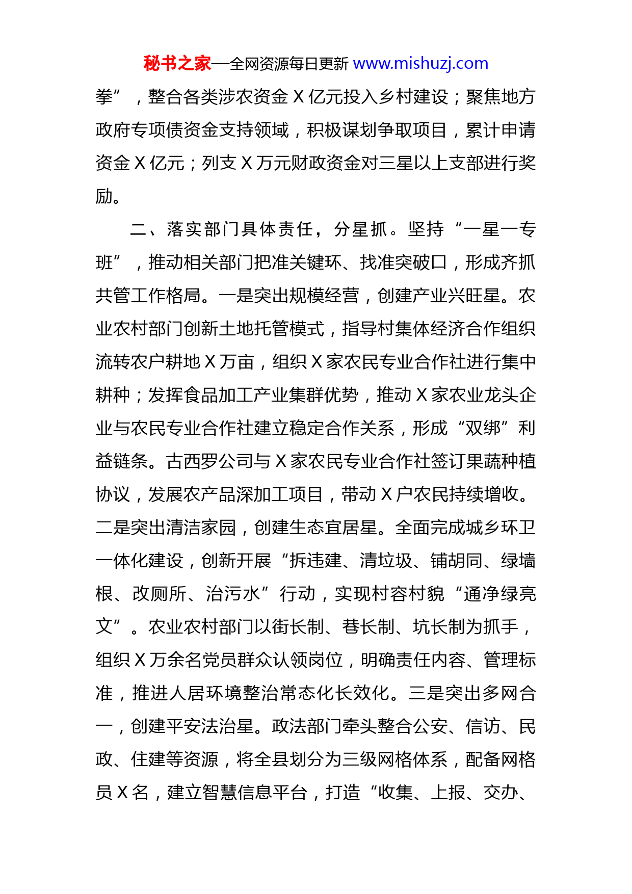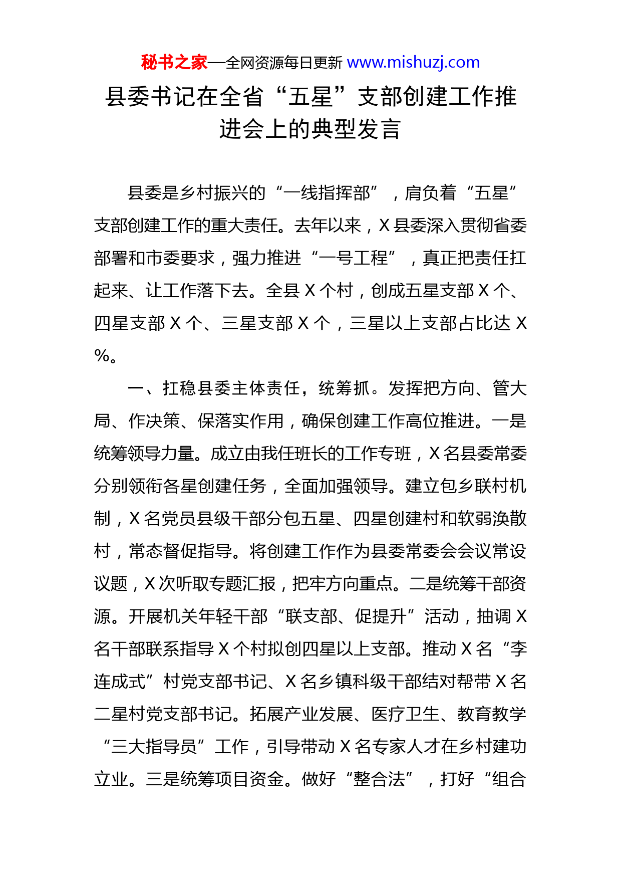 秘书之家—全网资源每日更新www.mishuzj.com县委书记在全省“五星”支部创建工作推进会上的典型发言县委是乡村振兴的“一线指挥部”,肩负着“五星”支部创建工作的重大责任。去年以来,X县委深入贯彻省委部署和市委要求,强力推进“一号工程”,真正把责任扛起来、让工作落下去。全县X个村,创成五星支部X个、四星支部X个、三星支部X个,三星以上支部占比达X%。一、扛稳县委主体责任,统筹抓。发挥把方向、管大局、作决策、保落实作用,确保创建工作高位推进。一是统筹领导力量。成立由我任班长的工作专班,X名县委常委分别领衔各星创建任务,全面加强领导。建立包乡联村机制,X名党员县级干部分包五星、四星创建村和软弱涣散村,常态督促指导。将创建工作作为县委常委会会议常设议题,X次听取专题汇报,把牢方向重点。二是统筹干部资源。开展机关年轻干部“联支部、促提升”活动,抽调X名干部联系指导X个村拟创四星以上支部。推动X名“李连成式”村党支部书记、X名乡镇科级干部结对帮带X名二星村党支部书记。拓展产业发展、医疗卫生、教育教学“三大指导员”工作,引导带动X名专家人才在乡村建功立业。三是统筹项目资金。做好“整合法”,打好“组合秘书之家—全网资源每日更新www.mishuzj.com拳”,整合各类涉农资金X亿元投入乡村建设;聚焦地方政府专项债资金支持领域,积极谋划争取项目,累计申请资金X亿元;列支X万元财政资金对三星以上支部进行奖励。二、落实部门具体责任,分星抓。坚持“一星一专班”,推动相关部门把准关键环、找准突破口,形成齐抓共管工作格局。一是突出规模经营,创建产业兴旺星。农业农村部门创新土地托管模式,指导村集体经济合作组织流转农户耕地X万亩,组织X家农民专业合作社进行集中耕种;发挥食品加工产业集群优势,推动X家农业龙头企业与农民专业合作社建立稳定合作关系,形成“双绑”利益链条。古西罗公司与X家农民专业合作社签订果蔬种植协议,发展农产品深加工项目,带动X户农民持续增收。二是突出清洁家园,创建生态宜居星。全面完成城乡环卫一体化建设,创新开展“拆违建、清垃圾、铺胡同、绿墙根、改厕所、治污水”行动,实现村容村貌“通净绿亮文”。农业农村部门以街长制、巷长制、坑长制为抓手,组织X万余名党员群众认领岗位,明确责任内容、管理标准,推进人居环境整治常态化长效化。三是突出多网合一,创建平安法治星。政法部门牵头整合公安、信访、民政、住建等资源,将全县划分为三级网格体系,配备网格员X名,建立智慧信息平台,打造“收集、上报、交办、秘书之家—全网资源每日更新www.mishuzj.com反馈”闭环,健全“村报告、乡处理、县办结”机制,及时解决矛盾纠纷、安全隐患、突发事故等。四是突出人文关怀,创建文明幸福星。宣传部门聚焦农村弱势群体,汇聚群团组织和公益组织力量,创设X家童伴之家、夕阳红乐园、母爱加油站,提供作业辅导、心理疏导、技能培训等关爱服务,切实增强群众幸福感获得感。县妇联大力支持母爱加油站建设,定期组织开展喜闻乐见的文体活动,丰富留守妇女乡村文化生活。三、压紧乡镇直接责任,逐村抓。坚持一切工作到支部,抓班子、带队伍,补短板、强弱项。一是逐村强班子。建立村级班子建设评估制度,乡镇每半年对村级班子进行分析研判,撤换村支部书记X名,调整“两委”干部X名。依托农村党支部书记学院,乡镇党委书记带领村“两委”成员开展两轮培训,着力提高综合素质和履职能力。二是逐村抓进度。紧扣创建重点任务,实行台账式管理、节点化推进,加强跟踪督导,确保工作落实。谷金楼集村细化X项具体任务,制作亮灯展示墙,完成一项,点亮一灯。韩张镇实行“早课”制度,利用乡镇日例会,每天组织X名村党支部书记上台说进展、谈体会、讲经验。三是逐村补短板。村村全面摸排,对发展思路不清、信访矛盾突出、人居环境较差等问题,落实派驻工作机制,精准施策、有效破解。张果屯镇针对部分村农业产业发展薄弱问秘书之家—全网资源每日更新www.mishuzj.com题,牵头成立西红柿产业发展党委,推动后孙黑等X个村找准产业发展方向,实现“一村一品”。实践证明,“五星”支部创建将基层党建贯穿乡村振兴全过程,在X焕发出强大的生命力。全县X%的村明确主导产业,村级集体经济年收入X万元以上村增长至X%,果蔬种植、畜牧养殖加工等特色产业集群产值达到X亿元,生活垃圾一体化处理村占比X%,信访积案综合化解率达到X%,“三零”创建覆盖面实现X%,我县先后被评为国家“四好农村路”示范县、义务教育优质均衡先行创建县、党建引领乡村治理试点县。下一步,我们将全面贯彻落实本次会议要求,蓄势赋能、乘势而上,奋力谱写高质量创建推动高质量发展新篇章!