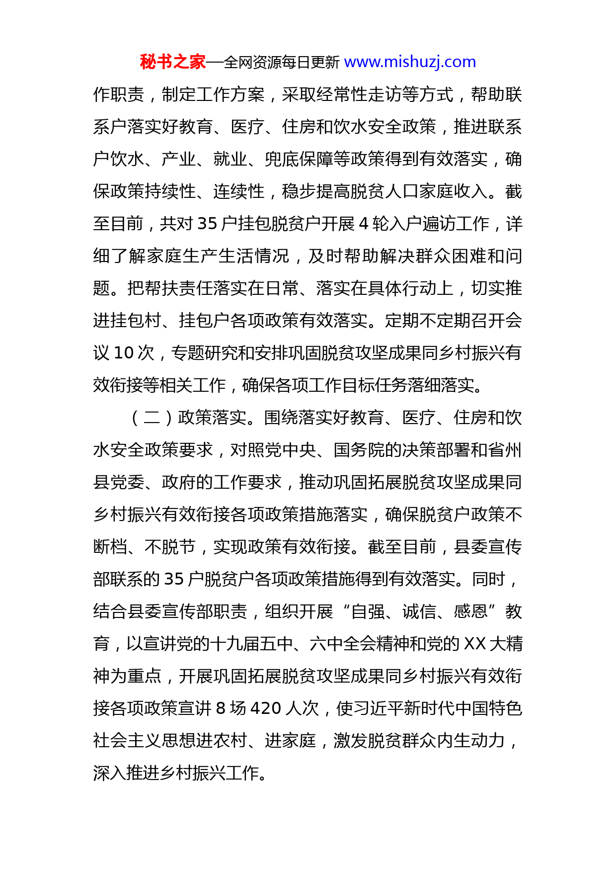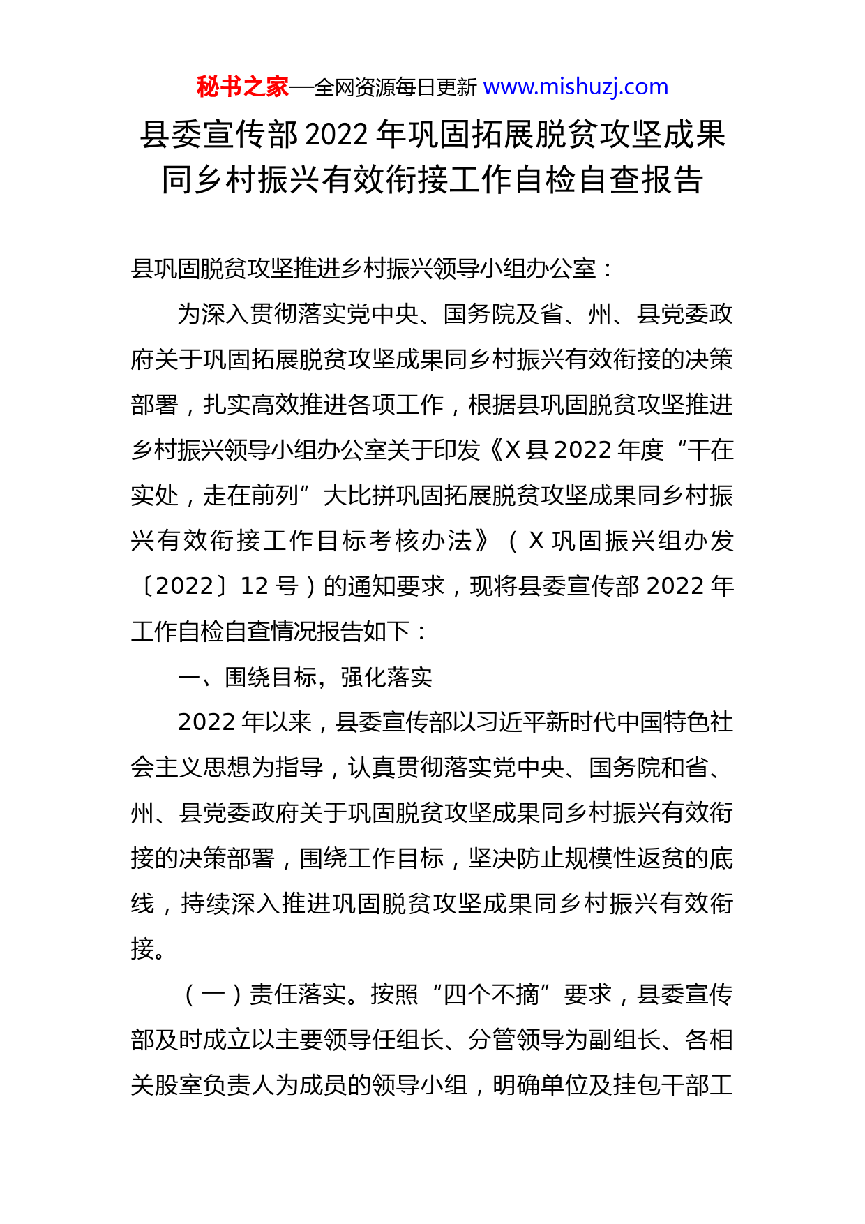 秘书之家—全网资源每日更新www.mishuzj.com县委宣传部2022年巩固拓展脱贫攻坚成果同乡村振兴有效衔接工作自检自查报告县巩固脱贫攻坚推进乡村振兴领导小组办公室:为深入贯彻落实党中央、国务院及省、州、县党委政府关于巩固拓展脱贫攻坚成果同乡村振兴有效衔接的决策部署,扎实高效推进各项工作,根据县巩固脱贫攻坚推进乡村振兴领导小组办公室关于印发《X县2022年度“干在实处,走在前列”大比拼巩固拓展脱贫攻坚成果同乡村振兴有效衔接工作目标考核办法》(X巩固振兴组办发〔2022〕12号)的通知要求,现将县委宣传部2022年工作自检自查情况报告如下:一、围绕目标,强化落实2022年以来,县委宣传部以习近平新时代中国特色社会主义思想为指导,认真贯彻落实党中央、国务院和省、州、县党委政府关于巩固脱贫攻坚成果同乡村振兴有效衔接的决策部署,围绕工作目标,坚决防止规模性返贫的底线,持续深入推进巩固脱贫攻坚成果同乡村振兴有效衔接。(一)责任落实。按照“四个不摘”要求,县委宣传部及时成立以主要领导任组长、分管领导为副组长、各相关股室负责人为成员的领导小组,明确单位及挂包干部工秘书之家—全网资源每日更新www.mishuzj.com作职责,制定工作方案,采取经常性走访等方式,帮助联系户落实好教育、医疗、住房和饮水安全政策,推进联系户饮水、产业、就业、兜底保障等政策得到有效落实,确保政策持续性、连续性,稳步提高脱贫人口家庭收入。截至目前,共对35户挂包脱贫户开展4轮入户遍访工作,详细了解家庭生产生活情况,及时帮助解决群众困难和问题。把帮扶责任落实在日常、落实在具体行动上,切实推进挂包村、挂包户各项政策有效落实。定期不定期召开会议10次,专题研究和安排巩固脱贫攻坚成果同乡村振兴有效衔接等相关工作,确保各项工作目标任务落细落实。(二)政策落实。围绕落实好教育、医疗、住房和饮水安全政策要求,对照党中央、国务院的决策部署和省州县党委、政府的工作要求,推动巩固拓展脱贫攻坚成果同乡村振兴有效衔接各项政策措施落实,确保脱贫户政策不断档、不脱节,实现政策有效衔接。截至目前,县委宣传部联系的35户脱贫户各项政策措施得到有效落实。同时,结合县委宣传部职责,组织开展“自强、诚信、感恩”教育,以宣讲党的十九届五中、六中全会精神和党的XX大精神为重点,开展巩固拓展脱贫攻坚成果同乡村振兴有效衔接各项政策宣讲8场420人次,使习近平新时代中国特色社会主义思想进农村、进家庭,激发脱贫群众内生动力,深入推进乡村振兴工作。秘书之家—全网资源每日更新www.mishuzj.com(三)工作落实。按照“四个不摘”和“一平台一基金三机制一办法”6个专项行动,“两不愁三保障”要求,组织干部职工开展挂包户日常走访工作,落实好各项工作措施。一是挂包干部常态化坚持防返贫动态监测工作机制,采取入户走访等方式,了解脱贫户家庭生产生活情况,同时加强入户情况分析研判,持续跟踪收入变化、“两不愁三保障”及饮水安全巩固情况,做到早发现、早干预、早帮扶,坚决杜绝体外循环,切实做到“应纳尽纳、应扶尽扶、有序退出”,坚决守住不发生规模性返贫的底线。二是开展助农促春耕生产工作。开展巩固脱贫攻坚成果推进乡村振兴工作以来,县委宣传部采取单位出资、个人捐资等方式,为六X村困难群众、挂包干部送去3680元的慰问物资;帮扶村调整后,单位主要领导及挂包干部结合助农促春耕工作对X镇X村35户挂包户进行走访,由干部捐款为每户挂包户购买180元春耕生产所需化肥2袋,共70袋,目前已送到挂包农户家中。三是组织开展农村人居环境整治工作。按照全县人居环境整治要求,县委宣传部干部职工积极组织X村10个村民小组开展“治脏乱、净环境、改户厕”等人居环境整治,出动人员23人次,参与群众1000多人次,清理乱堆杂物21处,清理垃圾8吨,动员村民在庭院内外发展小花园、小菜园、小果园,实现生态美、环境美的目标。四是与X村党总支开展秘书之家—全网资源每日更新www.mishuzj.com“双联双强”活动,宣传乡村振兴及安全生产、产业发展等政策,充分发挥村党支部、党员的示范带动作用,促进X村发展。(四)固效成效。以巩固粮食产业为核心和基础,紧紧围绕半坡村茶叶、核桃种植面积广、群众种植积极性高的优势,壮大重点特色产业,同时牵头举办X镇首届茶文化节。推进X茶叶提升到180元/公斤,实现茶叶变“金叶”,促进茶叶产业提质增效,带动35户脱贫户及易返贫致贫户持续实现增收。按照茶叶产业发展规模化、产业化要求,打造茶叶之乡品牌,组织开展茶文化节,由县文联组织“彝乡茶韵·多彩X”美术、摄影采风创作培训,助力X茶文化和民族文化对外宣传,扩大影响,提升X茶叶产业的知名度影响力。在抓好特色产业发展的同时,围绕生猪、肉牛、中药材等重点产业,巩固传统产业,推动重点产业发展。动员农户成立农民专业合作社,农户在平等互利的基础上,与农民合作社签订农产品购销合同,形成稳定的购销关系。深入挖掘茶叶、核桃等产业潜力,采取招商引资方式,引入茶叶加工生产企业,提升茶叶生产加工能力,创造更多就业岗位,吸纳脱贫人口和易返贫致贫人口劳动力就地就近就业,打造产业集群,延长产业链条;结合辖区丰富的生态资源和茶产业发展,积极动员