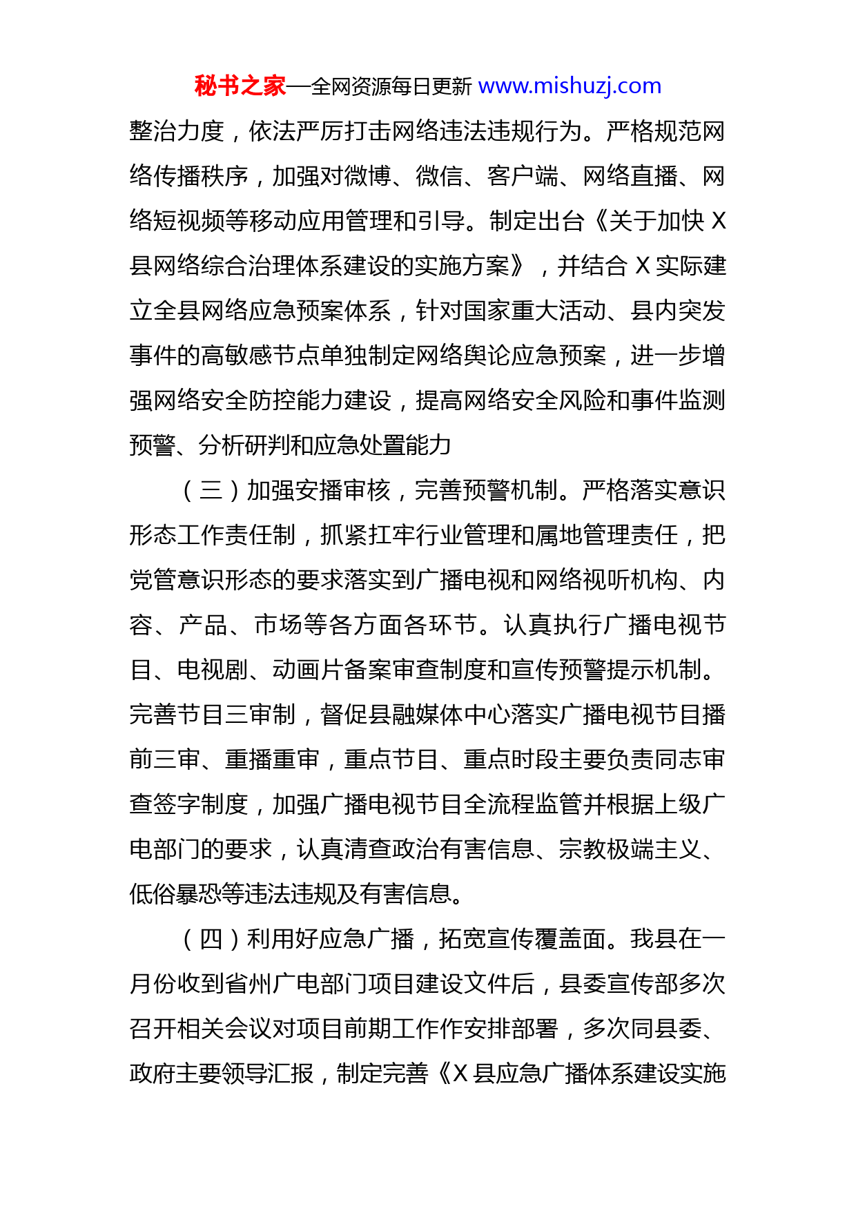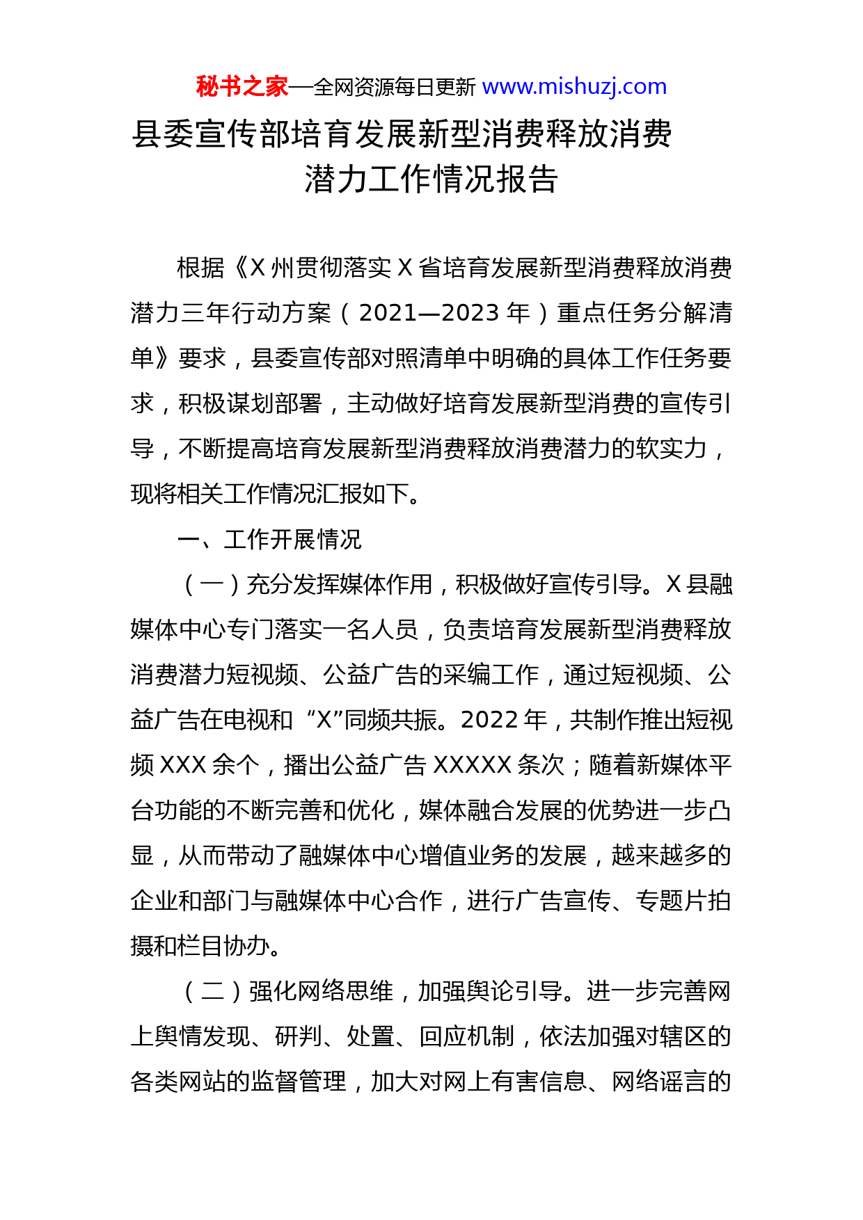 秘书之家—全网资源每日更新www.mishuzj.com县委宣传部培育发展新型消费释放消费潜力工作情况报告根据《X州贯彻落实X省培育发展新型消费释放消费潜力三年行动方案(2021—2023年)重点任务分解清单》要求,县委宣传部对照清单中明确的具体工作任务要求,积极谋划部署,主动做好培育发展新型消费的宣传引导,不断提高培育发展新型消费释放消费潜力的软实力,现将相关工作情况汇报如下。一、工作开展情况(一)充分发挥媒体作用,积极做好宣传引导。X县融媒体中心专门落实一名人员,负责培育发展新型消费释放消费潜力短视频、公益广告的采编工作,通过短视频、公益广告在电视和“X”同频共振。2022年,共制作推出短视频XXX余个,播出公益广告XXXXX条次;随着新媒体平台功能的不断完善和优化,媒体融合发展的优势进一步凸显,从而带动了融媒体中心增值业务的发展,越来越多的企业和部门与融媒体中心合作,进行广告宣传、专题片拍摄和栏目协办。(二)强化网络思维,加强舆论引导。进一步完善网上舆情发现、研判、处置、回应机制,依法加强对辖区的各类网站的监督管理,加大对网上有害信息、网络谣言的秘书之家—全网资源每日更新www.mishuzj.com整治力度,依法严厉打击网络违法违规行为。严格规范网络传播秩序,加强对微博、微信、客户端、网络直播、网络短视频等移动应用管理和引导。制定出台《关于加快X县网络综合治理体系建设的实施方案》,并结合X实际建立全县网络应急预案体系,针对国家重大活动、县内突发事件的高敏感节点单独制定网络舆论应急预案,进一步增强网络安全防控能力建设,提高网络安全风险和事件监测预警、分析研判和应急处置能力(三)加强安播审核,完善预警机制。严格落实意识形态工作责任制,抓紧扛牢行业管理和属地管理责任,把党管意识形态的要求落实到广播电视和网络视听机构、内容、产品、市场等各方面各环节。认真执行广播电视节目、电视剧、动画片备案审查制度和宣传预警提示机制。完善节目三审制,督促县融媒体中心落实广播电视节目播前三审、重播重审,重点节目、重点时段主要负责同志审查签字制度,加强广播电视节目全流程监管并根据上级广电部门的要求,认真清查政治有害信息、宗教极端主义、低俗暴恐等违法违规及有害信息。(四)利用好应急广播,拓宽宣传覆盖面。我县在一月份收到省州广电部门项目建设文件后,县委宣传部多次召开相关会议对项目前期工作作安排部署,多次同县委、政府主要领导汇报,制定完善《X县应急广播体系建设实施秘书之家—全网资源每日更新www.mishuzj.com方案》,目前,全县XXX个自然村已安装应急广播,通过采用购买服务的方式,依托县网络公司开展“村村通”安装维护工作,利用应急广播广泛宣传X省培育发展新型消费释放消费潜力相关政策,实现政策宣传全覆盖,进一步提供群众知晓率。二、存在的主要问题及意见建议一年来,县委宣传部在培育发展新型消费释放消费潜力工作上充分发挥宣传引导作用,工作成效明显,但也还存在一些问题改进提升。一是宣传发动还需发力,受疫情影响,文旅宣传在过去一年内相对滞后;二是宣传手段单一,覆盖面还需进一步提升;三是网络管控难度大,网络监督合力有待加强。三、下步工作计划下步工作中,X县将紧扣迎接、宣传、贯彻党的二十大这条主线,立足新发展阶段、完整准确全面贯彻新发展理念、构建新发展格局,更好的服务融入全县工作大局,坚持稳中求进、守正创新、敢于斗争,在培育发展新型消费释放消费潜力工作宣传引导上下功夫,全面展现新气象、新担当、新作为,奋力推进培育发展新型消费释放消费潜力工作取得实效。(一)突出工作重点,唱响网络主旋律。坚持以习近平新时代中国特色社会主义思想为指引,以宣传学习贯彻秘书之家—全网资源每日更新www.mishuzj.com落实党的二十大精神为主线,牢牢把握网络意识形态工作领导权和主动权,切实加强网上正面宣传,旗帜鲜明坚持正确政治方向、舆论导向、价值取向,深化新时代中国特色社会主义和中国梦宣传教育,唱响主旋律,凝聚正能量,提高网络综合治理能力,为培育发展新型消费释放消费潜力营造良好网上舆论氛围。(二)发挥媒体力量,传递网络最强音。继续指导县内各政务新媒体进一步加强依托以“党的二十大”主题,进一步做好培育发展新型消费释放消费潜力工作的宣传引导力度,积极发布形式多样、内容丰富的宣传内容,及时转载中央、省、州主流媒体相关权威稿件。增强宣传实效,充分运用县内新媒体矩阵,高扬主旋律,提振精气神。(三)加强媒体宣传,强化舆论引导力。一是充分发挥应急广播和各类媒介作用,广泛开展政策宣传,全面拓宽培育发展新型消费释放消费潜力的覆盖面,提供群众政策知晓率。二是立足网上网下“两个战场”,健全网上舆情应对处置机制,备足用好网上舆情处置力量。特别是加大对微信、微博、移动互联网等传播渠道的管控,切断“负能量”的传播,维护好网络意识形态安全。加强对重点网站、重点应用、重点环节的监控,及时封堵、删除各类有害信息,并落地查人,依法处理,防止形成现实危秘书之家—全网资源每日更新www.mishuzj.com害。