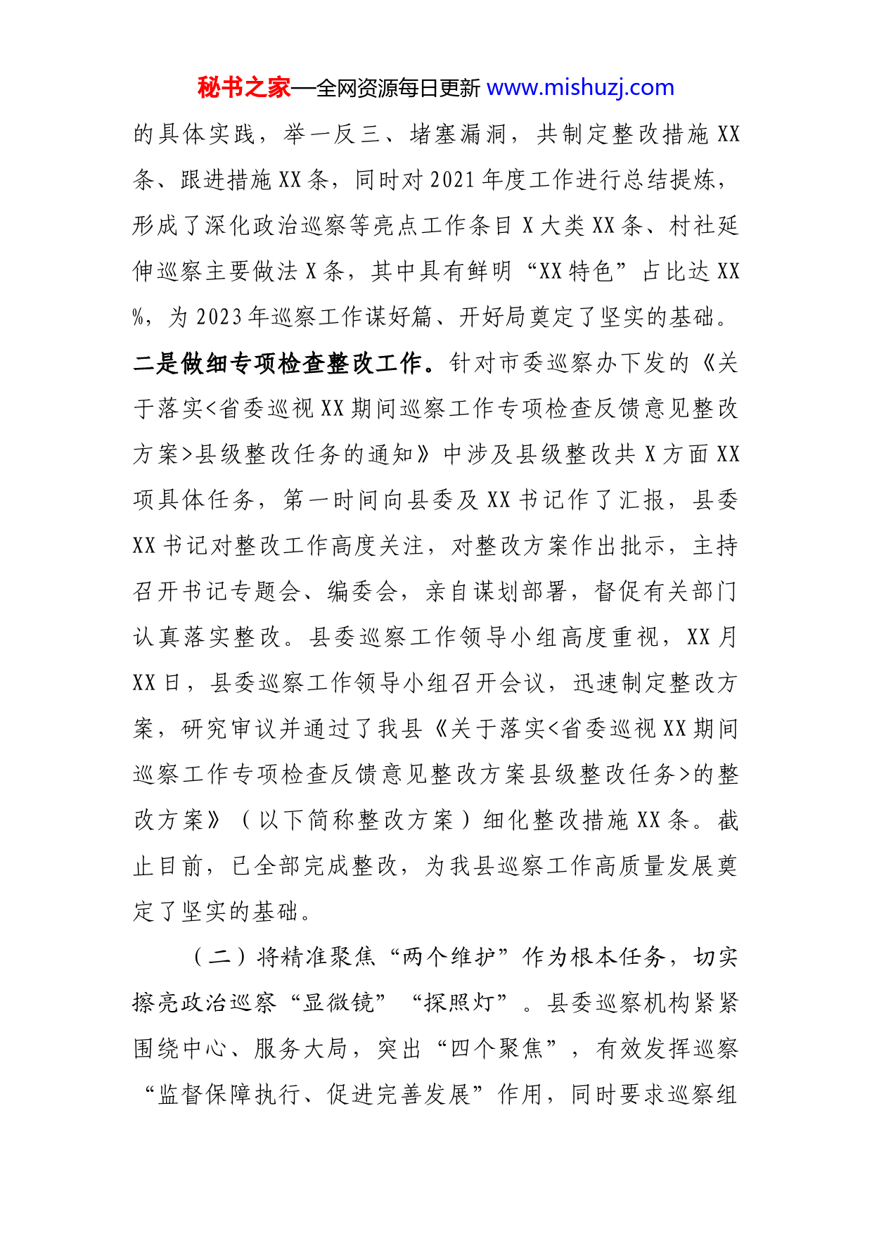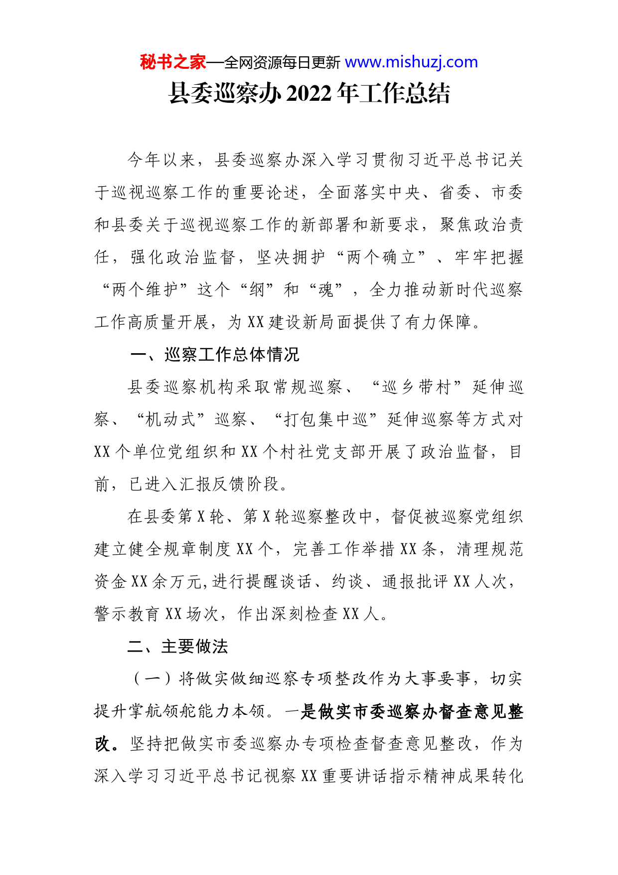 秘书之家—全网资源每日更新www.mishuzj.com县委巡察办2022年工作总结今年以来,县委巡察办深入学习贯彻习近平总书记关于巡视巡察工作的重要论述,全面落实中央、省委、市委和县委关于巡视巡察工作的新部署和新要求,聚焦政治责任,强化政治监督,坚决拥护“两个确立”、牢牢把握“两个维护”这个“纲”和“魂”,全力推动新时代巡察工作高质量开展,为XX建设新局面提供了有力保障。一、巡察工作总体情况县委巡察机构采取常规巡察、“巡乡带村”延伸巡察、“机动式”巡察、“打包集中巡”延伸巡察等方式对XX个单位党组织和XX个村社党支部开展了政治监督,目前,已进入汇报反馈阶段。在县委第X轮、第X轮巡察整改中,督促被巡察党组织建立健全规章制度XX个,完善工作举措XX条,清理规范资金XX余万元,进行提醒谈话、约谈、通报批评XX人次,警示教育XX场次,作出深刻检查XX人。二、主要做法(一)将做实做细巡察专项整改作为大事要事,切实提升掌航领舵能力本领。一是做实市委巡察办督查意见整改。坚持把做实市委巡察办专项检查督查意见整改,作为深入学习习近平总书记视察XX重要讲话指示精神成果转化秘书之家—全网资源每日更新www.mishuzj.com的具体实践,举一反三、堵塞漏洞,共制定整改措施XX条、跟进措施XX条,同时对2021年度工作进行总结提炼,形成了深化政治巡察等亮点工作条目X大类XX条、村社延伸巡察主要做法X条,其中具有鲜明“XX特色”占比达XX%,为2023年巡察工作谋好篇、开好局奠定了坚实的基础。二是做细专项检查整改工作。针对市委巡察办下发的《关于落实<省委巡视XX期间巡察工作专项检查反馈意见整改方案>县级整改任务的通知》中涉及县级整改共X方面XX项具体任务,第一时间向县委及XX书记作了汇报,县委XX书记对整改工作高度关注,对整改方案作出批示,主持召开书记专题会、编委会,亲自谋划部署,督促有关部门认真落实整改。县委巡察工作领导小组高度重视,XX月XX日,县委巡察工作领导小组召开会议,迅速制定整改方案,研究审议并通过了我县《关于落实<省委巡视XX期间巡察工作专项检查反馈意见整改方案县级整改任务>的整改方案》(以下简称整改方案)细化整改措施XX条。截止目前,已全部完成整改,为我县巡察工作高质量发展奠定了坚实的基础。(二)将精准聚焦“两个维护”作为根本任务,切实擦亮政治巡察“显微镜”“探照灯”。县委巡察机构紧紧围绕中心、服务大局,突出“四个聚焦”,有效发挥巡察“监督保障执行、促进完善发展”作用,同时要求巡察组秘书之家—全网资源每日更新www.mishuzj.com在巡察同时积极组织被巡察党组织学习党的巡察知识,提升主动接受巡察意识,充分发挥巡察“宣传队”“播种机”作用。一是聚焦落实党组织政治责任,加大对习近平总书记重要论述、党的政治理论学习贯彻情况和落实上级决策部署情况的监督检查。二是聚焦严明政治纪律和政治规矩,加强对党规党纪、新形势下党内政治生活若干准则的监督检查,重遏制、强高压、长震慑,促进全面从严治党。三是聚焦破除形式主义、官僚主义,重点监督不求实效、漠视现实的工作表现,推动“斗争精神”在基层生根开花。四是聚焦整治群众身边腐败和不正之风,紧扣民心就是最大的政治,着力推动解决关系群众切身利益的实际问题,厚植党的执政基础。不断加强边巡边改力度,责令执行制度不严的相关责任人做出深刻书面检讨,推动解决了关系群众切身利益的吃水困难、土地确权、农民工工资、村委公章移交、危房改造、生活出行难等实际问题。先后在XX等市县媒体刊发巡察文章X篇,特别将推动解决群众实事形成巡察微故事X篇,进一步提升了巡察影响力。(三)将高质量推进巡察全覆盖作为目标导向,切实形成系统集成协同高效的监督格局。一是县级巡察突出重点有序。紧紧围绕中心、服务大局,统筹安排常规和专项巡察;优先选取涉及脱贫攻坚、惠民利民政策落实等党组秘书之家—全网资源每日更新www.mishuzj.com织作为巡察对象;特别注重对被巡察党组织的下属单位和企业党组织开展延伸巡察,确保巡察监督实现横向到边、纵向到底全覆盖。二是村社延伸巡察突出探索创新。强调落实党的领导、压实主体责任,建立完善了《关于推动巡察向村社延伸的实施办法(试行)》等X项工作制度,根据群众互评、乡镇自评、巡察办与职能部门联评、领导小组终评分类结果,按照“三统一、三优先、三不留”工作标准,严格执行“五个责任制”工作原则、“二十四字”工作流程、“三个不少于”工作标准,统筹采用“机动式直接巡”、“巡乡带村巡”或“打包集中巡”方式对,组建“小分队”、“尖刀班”开展“背包式”巡察,对XX个村社党组织开展了延伸巡察,将巡察利剑直插基层,着力发现和推动查处群众身边的不正之风和腐败问题,有效打通了全面从严治党“最后一公里”,人民群众的获得感、幸福感和安全感得到不断增强。三是监督格局突出协同高效。健全完善巡察监督与纪律监督、监察监督、派驻监督“四个全覆盖”,推动形成系统集成、协同高效的监督格局,主动参与纪委监委日常监督检查,学用借鉴纪委监委监督方法,贯通开展县委政府重点工作监督检查,特别是疫情期间,安排巡察组人员参与了县纪委监委疫情防控、森林防火监督检查,巡察
