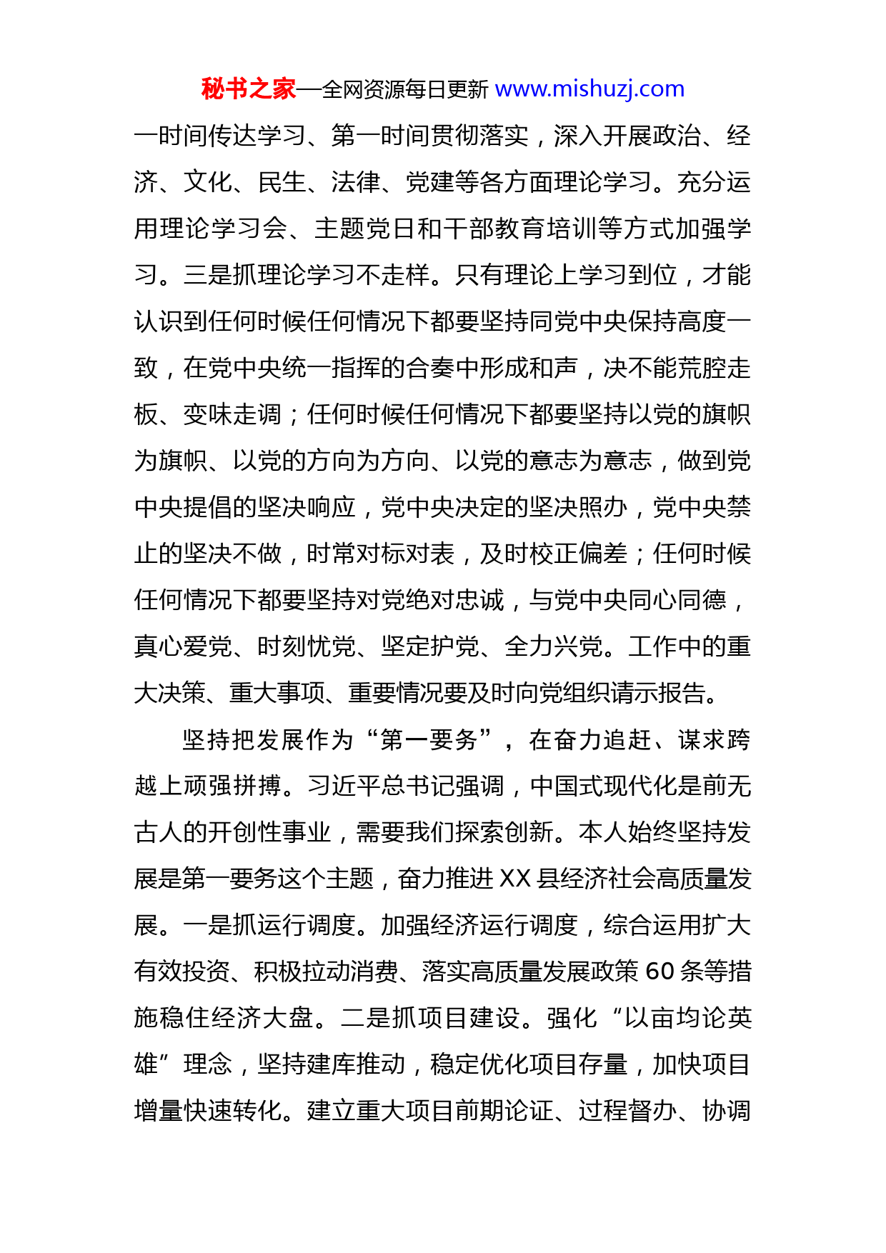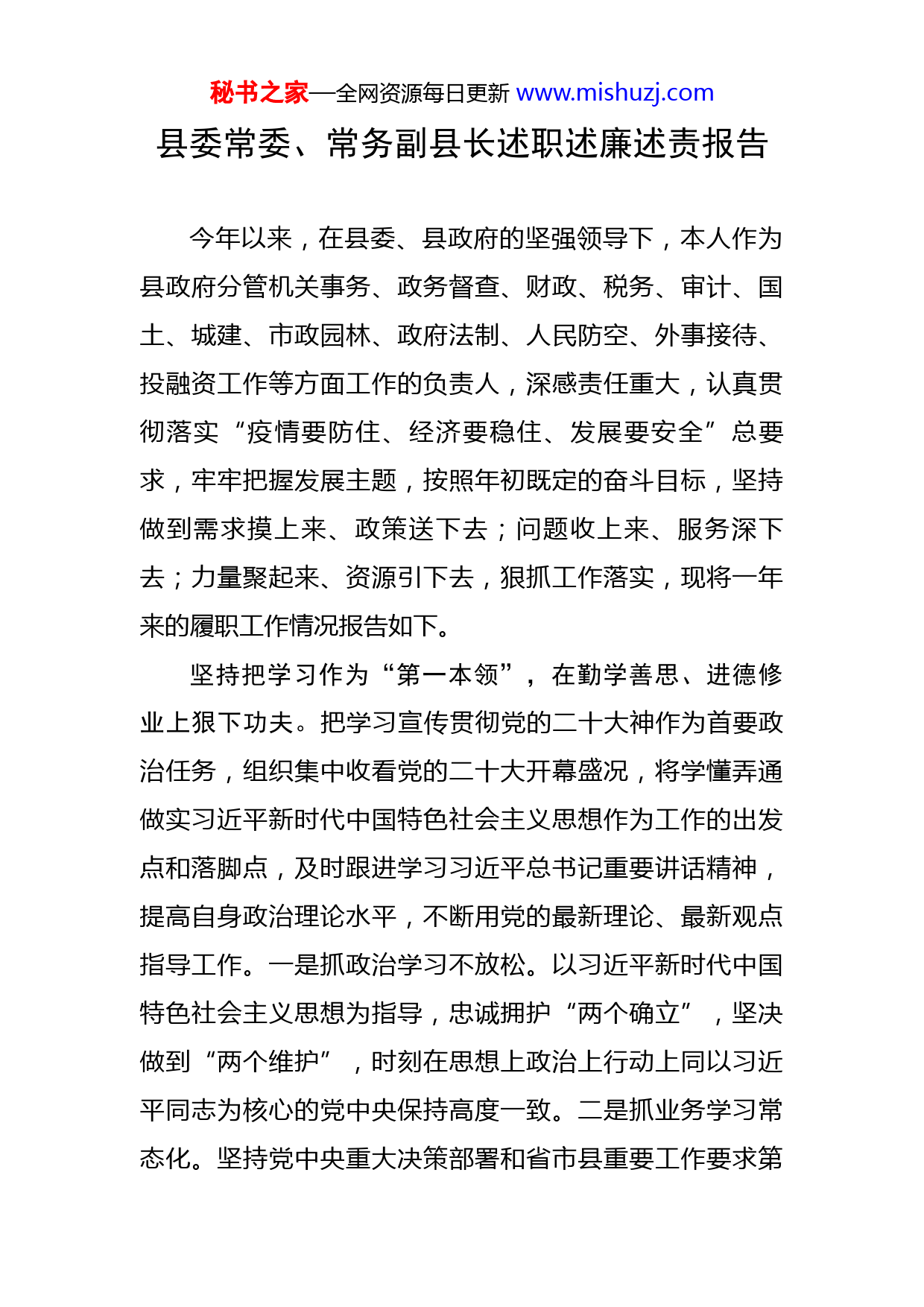 秘书之家—全网资源每日更新www.mishuzj.com县委常委、常务副县长述职述廉述责报告今年以来,在县委、县政府的坚强领导下,本人作为县政府分管机关事务、政务督查、财政、税务、审计、国土、城建、市政园林、政府法制、人民防空、外事接待、投融资工作等方面工作的负责人,深感责任重大,认真贯彻落实“疫情要防住、经济要稳住、发展要安全”总要求,牢牢把握发展主题,按照年初既定的奋斗目标,坚持做到需求摸上来、政策送下去;问题收上来、服务深下去;力量聚起来、资源引下去,狠抓工作落实,现将一年来的履职工作情况报告如下。坚持把学习作为“第一本领”,在勤学善思、进德修业上狠下功夫。把学习宣传贯彻党的二十大神作为首要政治任务,组织集中收看党的二十大开幕盛况,将学懂弄通做实习近平新时代中国特色社会主义思想作为工作的出发点和落脚点,及时跟进学习习近平总书记重要讲话精神,提高自身政治理论水平,不断用党的最新理论、最新观点指导工作。一是抓政治学习不放松。以习近平新时代中国特色社会主义思想为指导,忠诚拥护“两个确立”,坚决做到“两个维护”,时刻在思想上政治上行动上同以习近平同志为核心的党中央保持高度一致。二是抓业务学习常态化。坚持党中央重大决策部署和省市县重要工作要求第秘书之家—全网资源每日更新www.mishuzj.com一时间传达学习、第一时间贯彻落实,深入开展政治、经济、文化、民生、法律、党建等各方面理论学习。充分运用理论学习会、主题党日和干部教育培训等方式加强学习。三是抓理论学习不走样。只有理论上学习到位,才能认识到任何时候任何情况下都要坚持同党中央保持高度一致,在党中央统一指挥的合奏中形成和声,决不能荒腔走板、变味走调;任何时候任何情况下都要坚持以党的旗帜为旗帜、以党的方向为方向、以党的意志为意志,做到党中央提倡的坚决响应,党中央决定的坚决照办,党中央禁止的坚决不做,时常对标对表,及时校正偏差;任何时候任何情况下都要坚持对党绝对忠诚,与党中央同心同德,真心爱党、时刻忧党、坚定护党、全力兴党。工作中的重大决策、重大事项、重要情况要及时向党组织请示报告。坚持把发展作为“第一要务”,在奋力追赶、谋求跨越上顽强拼搏。习近平总书记强调,中国式现代化是前无古人的开创性事业,需要我们探索创新。本人始终坚持发展是第一要务这个主题,奋力推进XX县经济社会高质量发展。一是抓运行调度。加强经济运行调度,综合运用扩大有效投资、积极拉动消费、落实高质量发展政策60条等措施稳住经济大盘。二是抓项目建设。强化“以亩均论英雄”理念,坚持建库推动,稳定优化项目存量,加快项目增量快速转化。建立重大项目前期论证、过程督办、协调秘书之家—全网资源每日更新www.mishuzj.com服务等相关制度,明确协调保障、推进服务、督查考核和责任追究等内容,实现项目工作制度化、规范化、常态化,形成“权责清晰、管理科学、配合有力、协调高效”的项目推进工作新格局。三是抓招商引资。坚持定期外出招商引资制度,面对招商引资的一场场硬仗,拿出积极的态度、开放的思维、科学的方法,持续不断地去研究、推介、招引、服务,让更多大项目好项目落实落地。四是抓产业发展。准绘制产业链图谱,形成产业链龙头骨干企业、主要配套企业、关键产品技术攻关、重点产业区域布局等清单,瞄准行业领军企业吸引投资,精准招引一批“填空型”企业、“补充型”项目,夯实招引补链、金融活链、科技强链。坚持把创新作为“第一动力”,在解放思想、锐意进取上大胆探索。作为基层领导干部,我们要学会坚持用马克思主义政治家的标准严格要求自己,不断提高政治判断力、政治领悟力、政治执行力,善于研判国内国际发展大势大局,牢记“国之大者”,善谋国之大计、党之大计,造福人民、赢得民心。要按照党的二十大要求,不断增强推动高质量发展本领、服务群众本领、防范化解风险本领。一是保持踔厉奋发的精神状态。牢固树立正确政绩观,把握好潜绩与显绩的关系,把握好当前与长远的关系,把握好保稳与求进的关系,把握好战略与策略的关系秘书之家—全网资源每日更新www.mishuzj.com等方向能紧跟县委步伐,保持昂扬奋进的精神状态和一往无前的奋斗姿态,坚定信心、保持定力,准确判断和把握形势。二是加强守正创新的思路举措。主动适应新形势、新变革、新发展和不断拓展工作视野,持之以恒的强化理论学习和全力提高思想理论水平,准确把握中央决策部署切实增强做好本职工作的坚定性。三是夯实担当有为的工作成效。习近平总书记曾在《之江新语》中指出,不求“官”有多大,但求无愧于民;做人要有人品,当“官”要有“官德”。我们在平时中,要学会通过解剖麻雀的方法为决策提供真情实据,特别是自查自己是否是“躺平式干部”,推出更多有效的惩罚措施。坚持把为民作为“第一追求”,在心系群众、改善民生上不遗余力。坚守无私奉献和艰苦奋斗的精神,把个人价值的实现与社会需要、群众需求紧密结合起来,坚持党的事业第一、人民的利益第一。树立正确的政绩观,积极工作,不断完善和提高自己,脚踏实地的投入到工作中去。深入基层一线、项目工地,现场办公、现场协调解决问