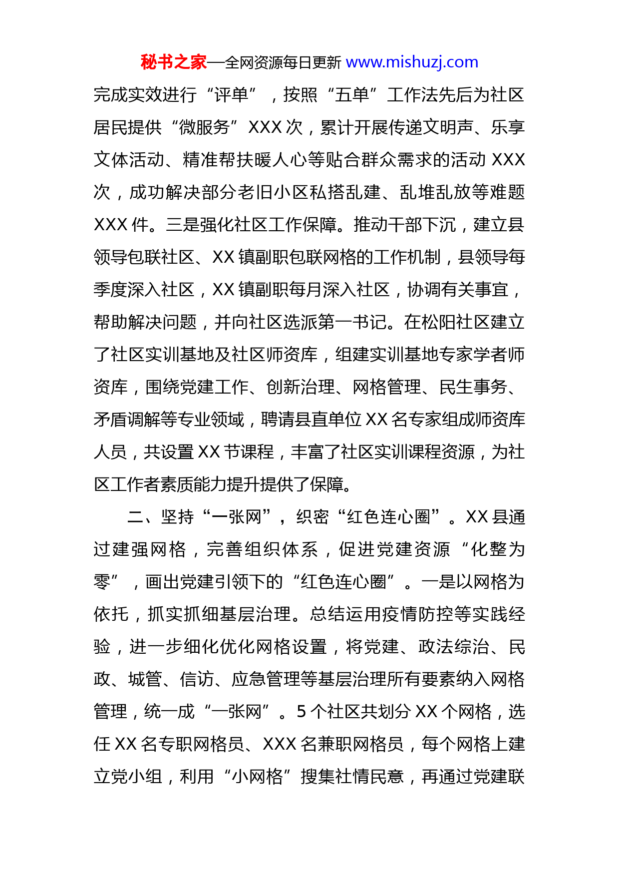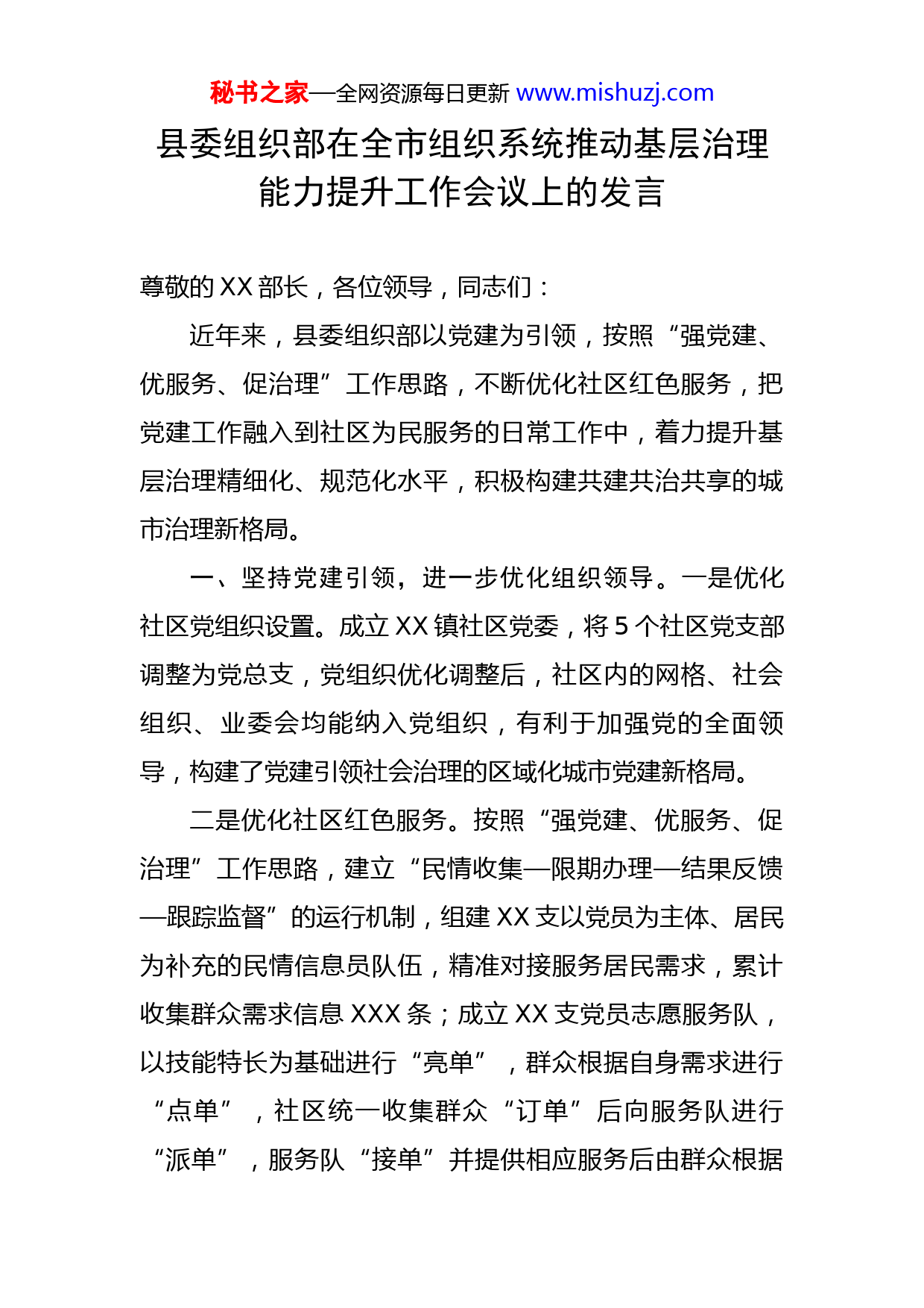 秘书之家—全网资源每日更新www.mishuzj.com县委组织部在全市组织系统推动基层治理能力提升工作会议上的发言尊敬的XX部长,各位领导,同志们:近年来,县委组织部以党建为引领,按照“强党建、优服务、促治理”工作思路,不断优化社区红色服务,把党建工作融入到社区为民服务的日常工作中,着力提升基层治理精细化、规范化水平,积极构建共建共治共享的城市治理新格局。一、坚持党建引领,进一步优化组织领导。一是优化社区党组织设置。成立XX镇社区党委,将5个社区党支部调整为党总支,党组织优化调整后,社区内的网格、社会组织、业委会均能纳入党组织,有利于加强党的全面领导,构建了党建引领社会治理的区域化城市党建新格局。二是优化社区红色服务。按照“强党建、优服务、促治理”工作思路,建立“民情收集—限期办理—结果反馈—跟踪监督”的运行机制,组建XX支以党员为主体、居民为补充的民情信息员队伍,精准对接服务居民需求,累计收集群众需求信息XXX条;成立XX支党员志愿服务队,以技能特长为基础进行“亮单”,群众根据自身需求进行“点单”,社区统一收集群众“订单”后向服务队进行“派单”,服务队“接单”并提供相应服务后由群众根据秘书之家—全网资源每日更新www.mishuzj.com完成实效进行“评单”,按照“五单”工作法先后为社区居民提供“微服务”XXX次,累计开展传递文明声、乐享文体活动、精准帮扶暖人心等贴合群众需求的活动XXX次,成功解决部分老旧小区私搭乱建、乱堆乱放等难题XXX件。三是强化社区工作保障。推动干部下沉,建立县领导包联社区、XX镇副职包联网格的工作机制,县领导每季度深入社区,XX镇副职每月深入社区,协调有关事宜,帮助解决问题,并向社区选派第一书记。在松阳社区建立了社区实训基地及社区师资库,组建实训基地专家学者师资库,围绕党建工作、创新治理、网格管理、民生事务、矛盾调解等专业领域,聘请县直单位XX名专家组成师资库人员,共设置XX节课程,丰富了社区实训课程资源,为社区工作者素质能力提升提供了保障。二、坚持“一张网”,织密“红色连心圈”。XX县通过建强网格,完善组织体系,促进党建资源“化整为零”,画出党建引领下的“红色连心圈”。一是以网格为依托,抓实抓细基层治理。总结运用疫情防控等实践经验,进一步细化优化网格设置,将党建、政法综治、民政、城管、信访、应急管理等基层治理所有要素纳入网格管理,统一成“一张网”。5个社区共划分XX个网格,选任XX名专职网格员、XXX名兼职网格员,每个网格上建立党小组,利用“小网格”搜集社情民意,再通过党建联秘书之家—全网资源每日更新www.mishuzj.com席会议,针对性解决问题。二是以社区为轴心,抓共建促联合治理。深化党员“双报到”,驻区单位与社区签订共建协议,在职党员到社区报到,实行县、镇、社区三级联动;XX个单位和XXXX名在职党员充分发挥作用,在疫情防控、人口快查、疫苗接种、创建文明城市以及其他社区工作中发挥积极作用。三是以社区为圆心,抓引领促同心共治。通过加强与物业企业、社区社会组织沟通联系,协助服务,实现共建单位、物业企业与社区社会组织“平时+战时”模式的随时切换,“平时”注重服务,“战时”就地转化志愿者。通过志愿服务队的形式互助解决服务需求,定向激励驻区单位认领实事项目,鼓励多方志愿者开展社会志愿服务,满足居民个性化需求,打造出党建引领、共建共享的邻里家园。推动社区成立居民志愿者服务队,通过开展多元化志愿服务,不断提升辖区居民的获得感、幸福感和满意度。三、坚持深化服务,强化“一名党员一面旗”理念。XX县坚持抓好社区服务平台建设,不断强化“一名党员一面旗”理念,打造多方参与的服务圈,将党建融入万家灯火,把服务送到千家万户。一是优化社区党群服务中心建设。不断整合优质资源,实现组织共建、资源共享、功能优化的系统建设。5个社区党群服务中心按照“易进入、可开放、能共享”的原则,面向群众开放;加强社区秘书之家—全网资源每日更新www.mishuzj.com综合服务阵地建设,合理划分社区党群服务中心功能区域,打造“15分钟便民服务圈”;同时,推进党建、政务、服务信息整合融合,开展“政策找人、服务上门”活动,深化“一站式”服务,变“群众跑腿”为“服务上门”。目前5个社区全部设置了办公室、志愿服务站、党员活动室、少儿活动室、文化活动中心、调解室等功能区,建设了“一站式”服务大厅和敞开式综合服务柜台,统一制作制度牌匾,购置办公设备等推进基本公共服务事项进驻社区办理,同时在党群服务中心安排了党员志愿服务岗,积极开展党务政策咨询、办理业务等服务。二是完善行政服务中心服务功能。依托行政综合服务中心,受理市场准入、医保养老、民生保障等多方面行政审批服务事项,为居民提供基本公共服务和政策、业务咨询等;加强党群服务中心信息化建设,完善自助服务设置,推动“互联网+政务服务”向社区延伸;紧贴广大党员群众实际需求,在相应区域设立休息区,提供便民设施,配备活动器材,做到服务群众“零距离”;提供图书角、儿童活动园地、远程教育基地等场所和设施,为居民学习教育提供便利;设立集中管理平台,全面推广“红色管家”“志愿XX”等手机端软件,实现便