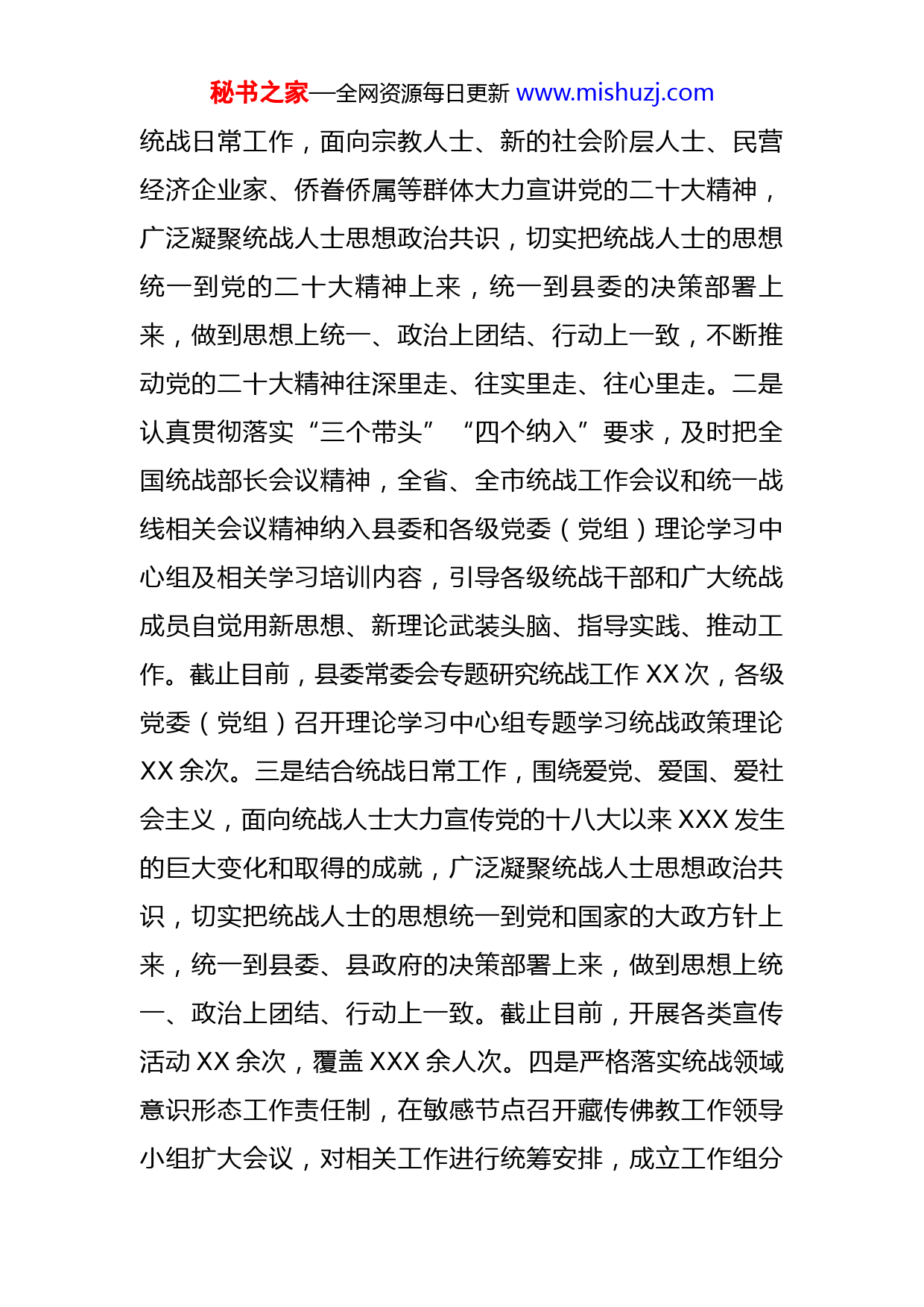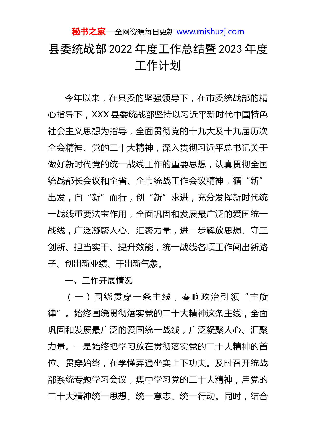 秘书之家—全网资源每日更新www.mishuzj.com县委统战部2022年度工作总结暨2023年度工作计划今年以来,在县委的坚强领导下,在市委统战部的精心指导下,XXX县委统战部坚持以习近平新时代中国特色社会主义思想为指导,全面贯彻党的十九大及十九届历次全会精神、党的二十大精神,深入贯彻习近平总书记关于做好新时代党的统一战线工作的重要思想,认真贯彻全国统战部长会议和全省、全市统战工作会议精神,循“新”出发,向“新”而行,创“新”求进,充分发挥新时代统一战线重要法宝作用,全面巩固和发展最广泛的爱国统一战线,广泛凝聚人心、汇聚力量,进一步解放思想、守正创新、担当实干、提升效能,统一战线各项工作闯出新路子、创出新业绩、干出新气象。一、工作开展情况(一)围绕贯穿一条主线,奏响政治引领“主旋律”。始终围绕贯彻落实党的二十大精神这条主线,全面巩固和发展最广泛的爱国统一战线,广泛凝聚人心、汇聚力量。一是始终把学习放在贯彻落实党的二十大精神的首位、贯穿始终,在学懂弄通坐实上下功夫。及时召开统战部系统专题学习会议,集中学习党的二十大精神,用党的二十大精神统一思想、统一意志、统一行动。同时,结合秘书之家—全网资源每日更新www.mishuzj.com统战日常工作,面向宗教人士、新的社会阶层人士、民营经济企业家、侨眷侨属等群体大力宣讲党的二十大精神,广泛凝聚统战人士思想政治共识,切实把统战人士的思想统一到党的二十大精神上来,统一到县委的决策部署上来,做到思想上统一、政治上团结、行动上一致,不断推动党的二十大精神往深里走、往实里走、往心里走。二是认真贯彻落实“三个带头”“四个纳入”要求,及时把全国统战部长会议精神,全省、全市统战工作会议和统一战线相关会议精神纳入县委和各级党委(党组)理论学习中心组及相关学习培训内容,引导各级统战干部和广大统战成员自觉用新思想、新理论武装头脑、指导实践、推动工作。截止目前,县委常委会专题研究统战工作XX次,各级党委(党组)召开理论学习中心组专题学习统战政策理论XX余次。三是结合统战日常工作,围绕爱党、爱国、爱社会主义,面向统战人士大力宣传党的十八大以来XXX发生的巨大变化和取得的成就,广泛凝聚统战人士思想政治共识,切实把统战人士的思想统一到党和国家的大政方针上来,统一到县委、县政府的决策部署上来,做到思想上统一、政治上团结、行动上一致。截止目前,开展各类宣传活动XX余次,覆盖XXX余人次。四是严格落实统战领域意识形态工作责任制,在敏感节点召开藏传佛教工作领导小组扩大会议,对相关工作进行统筹安排,成立工作组分秘书之家—全网资源每日更新www.mishuzj.com别进驻寺庙开展稳维工;围绕迎接党的二十大胜利召开,制定统战领域风险隐患排查机制,分领域开展风险排查,定期研判、定期上报风险隐患情况,确保统战领域持续和谐稳定。(二)围绕落实一项条例,构建统战工作“大格局”。始终围绕贯彻落实《中国共产党统一战线工作条例》,持续加强党对统一战线工作的集中统一领导,全面构建大统战格局。一是全面履行县委主体责任,先后由县委书记主持召开县委统战部部长会议、县委民族工作会议,制定印发统战工作要点,对工作进行全面安排部署,构建了运行规范、机制完善的统战工作格局。二是进一步理顺统一战线领导小组统一领导下的统战各领域工作体制机制,明确乡镇(街道)统战工作由党(工)委委员负责,民族宗教工作任务重的乡镇(街道)由党(工)委副书记负责,并由村(社区)副书记兼任宗教干事。同时,明确统一战线工作领导小组成员单位由领导班子成员分管统战工作,形成了统战部牵头协调,相关部门各司其责的工作机制。三是把《条例》列入全县各级党组织学习重点内容,组织各乡镇(街道)及统战成员单位自行开展《条例》培训学习XX余次,培训XXX余人次,推动各级各部门认真履行统战工作主体责任,确保《条例》各项规定贯彻落实。同时,将《条例》学习宣传贯彻情况列入全县综秘书之家—全网资源每日更新www.mishuzj.com合考核内容,加强督促检查,推动《条例》落地落实。四是进一步调整充实县委统战部、县民宗局领导班子成员,全面加强统战工作力量,同时注重发挥舆论宣传辐射作用,利用XXX统战公众号等新媒体发布各类文章,大力宣传了统战知识、展示了统战风采。(三)围绕促进五大关系,谱写统战工作“新篇章”。始终围绕积极促进政党关系、民族关系、宗教关系、阶层关系、海内外同胞关系和谐,巩固和发展最广泛的爱国统一战线,推动新形势下统战各项重点工作提质增效、落地落实。一是协助民盟中央、九三学社、全省党外中青班等民主党派人士围绕XXX保护治理,农村“两污”治理等工作开展专题民主监督,为积极探索民主监督有效形式,推动民主监督更加积极主动、有力管用提供了思路和举措。二是聚焦巩固全国民族团结进步示范县创建成果,制定出台《XXX县全国民族团结进步示范县巩固提升工作2022年任务清单》,为全面巩固拓展全国民族团结进步示范县创建成果打好顶层基础;大力推进“十县百乡千村万户”示范引领建设工程,投资XXXX实施了民族团结进步示范乡,民族团结进步示范村产业发展配套道路建设;大力实施少数民族优秀文化传承保护工程,编