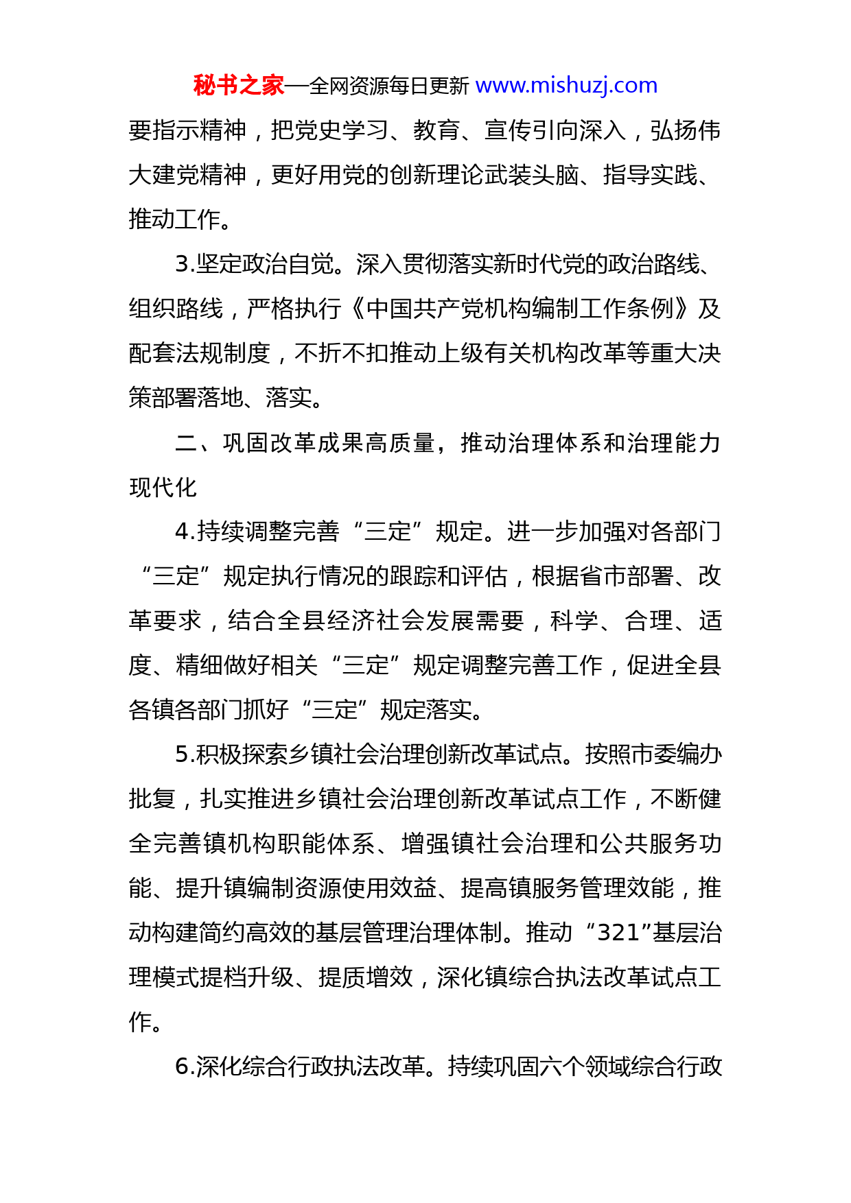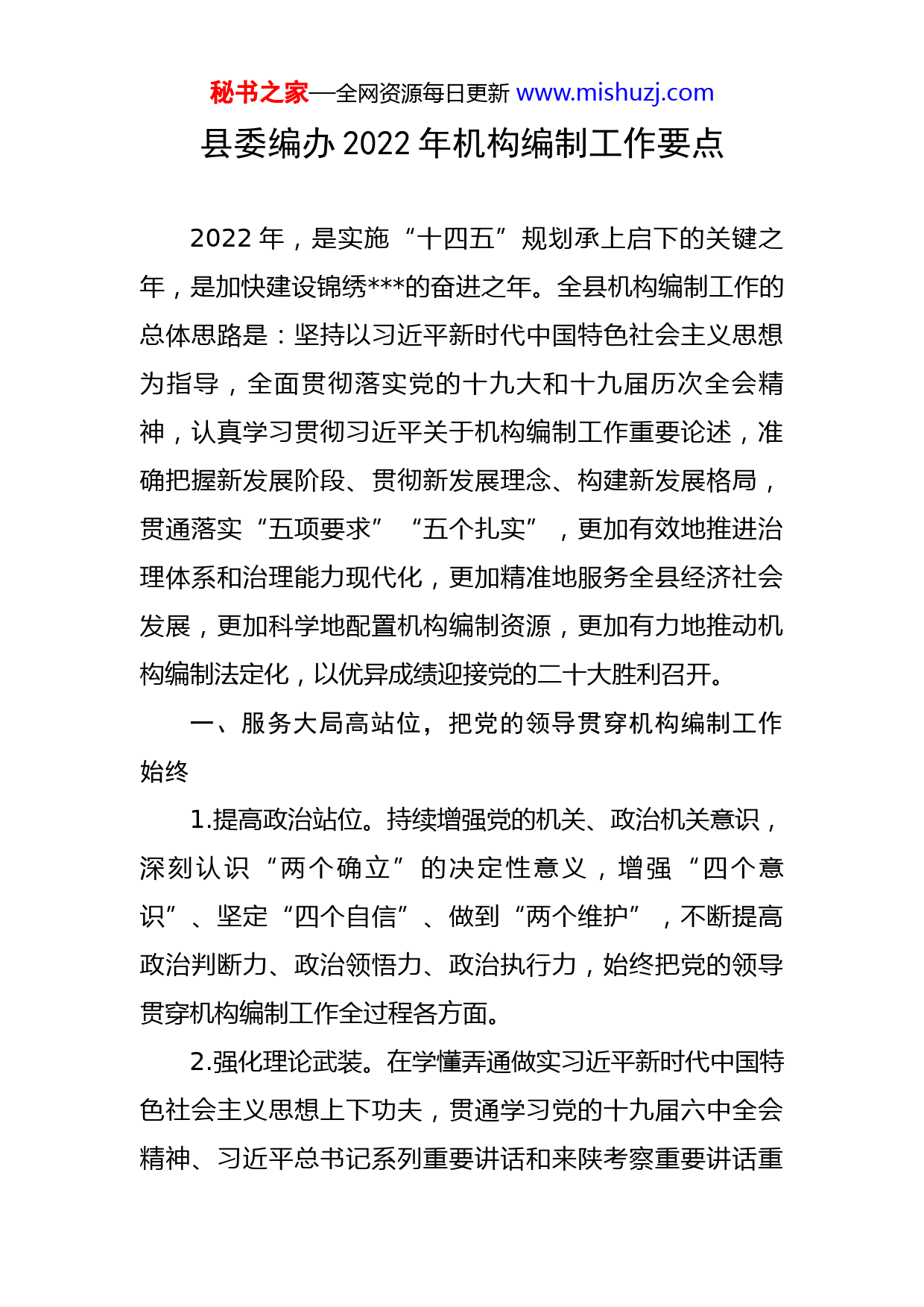 秘书之家—全网资源每日更新www.mishuzj.com县委编办2022年机构编制工作要点2022年,是实施“十四五”规划承上启下的关键之年,是加快建设锦绣的奋进之年。全县机构编制工作的总体思路是:坚持以习近平新时代中国特色社会主义思想为指导,全面贯彻落实党的十九大和十九届历次全会精神,认真学习贯彻习近平关于机构编制工作重要论述,准确把握新发展阶段、贯彻新发展理念、构建新发展格局,贯通落实“五项要求”“五个扎实”,更加有效地推进治理体系和治理能力现代化,更加精准地服务全县经济社会发展,更加科学地配置机构编制资源,更加有力地推动机构编制法定化,以优异成绩迎接党的二十大胜利召开。一、服务大局高站位,把党的领导贯穿机构编制工作始终1.提高政治站位。持续增强党的机关、政治机关意识,深刻认识“两个确立”的决定性意义,增强“四个意识”、坚定“四个自信”、做到“两个维护”,不断提高政治判断力、政治领悟力、政治执行力,始终把党的领导贯穿机构编制工作全过程各方面。2.强化理论武装。在学懂弄通做实习近平新时代中国特色社会主义思想上下功夫,贯通学习党的十九届六中全会精神、习近平总书记系列重要讲话和来陕考察重要讲话重秘书之家—全网资源每日更新www.mishuzj.com要指示精神,把党史学习、教育、宣传引向深入,弘扬伟大建党精神,更好用党的创新理论武装头脑、指导实践、推动工作。3.坚定政治自觉。深入贯彻落实新时代党的政治路线、组织路线,严格执行《中国共产党机构编制工作条例》及配套法规制度,不折不扣推动上级有关机构改革等重大决策部署落地、落实。二、巩固改革成果高质量,推动治理体系和治理能力现代化4.持续调整完善“三定”规定。进一步加强对各部门“三定”规定执行情况的跟踪和评估,根据省市部署、改革要求,结合全县经济社会发展需要,科学、合理、适度、精细做好相关“三定”规定调整完善工作,促进全县各镇各部门抓好“三定”规定落实。5.积极探索乡镇社会治理创新改革试点。按照市委编办批复,扎实推进乡镇社会治理创新改革试点工作,不断健全完善镇机构职能体系、增强镇社会治理和公共服务功能、提升镇编制资源使用效益、提高镇服务管理效能,推动构建简约高效的基层管理治理体制。推动“321”基层治理模式提档升级、提质增效,深化镇综合执法改革试点工作。6.深化综合行政执法改革。持续巩固六个领域综合行政秘书之家—全网资源每日更新www.mishuzj.com执法改革成果,加强制度化提炼总结,推动改革在更大领域更大范围推行,进一步整合精简执法队伍,减少执法层级,逐步规范执法队伍人员编制管理。7.稳步深化事业单位改革。根据省市安排,适时推进公益类事业单位改革。持续提升全县事业单位履职评估考核工作水平,有效运用履职评估考核结果,促进事业单位公益服务质量不断提升。8.推进政法领域相关改革。根据省市统一部署,不断完善政法领域体制机制。推进公安管理体制改革,积极探索公安系统“队所合一”警务机制,优化公安机关机构编制资源保障。9.深化有关领域体制改革。按照省市安排,积极做好教育督导、金融监管、应急管理、疾病预防控制、乡村振兴机构改革等工作。三、配置资源高效益,保障经济社会发展需要10.服务经济发展。贯彻新发展理念,服务新发展格局,紧扣建设锦绣主题,围绕“5775”发展战略,聚焦项目建设、优化营商环境、科技创新、招商引资、经开区高质量发展、人才引进等关键领域,不断优化配置机构编制资源。11.保障社会民生事业。加强事业编制资源挖潜服务高质量发展,统筹做好教育资源优化配置和动态调整工作。秘书之家—全网资源每日更新www.mishuzj.com用好事业单位人才编制“周转池”,积极做好高层次人才引进招录工作。深入推进公立医院等公益二类事业单位编制备案管理和县域医共体编制人事一体化改革探索工作。进一步优化编制资源配置,将有限的编制资源向群众关切的重点民生领域倾斜。四、法治建设高水平,持续推进机构编制法定化12.强化《条例》贯彻落实。持续开展《中国共产党机构编制工作条例》宣传“五进”活动,将《条例》纳入党校干部教育主体班次、公务员培训内容;不断健全完善机构编制配套法规制度;严格执行机构编制动议、论证、审议决定、组织实施、监督问责等程序要求;落实好机构编制报告、合法合规性审查、规范性文件审核等制度。13.强化机构编制监督检查。坚持把机构编制监督检查和机构编制审批放在同等位置,树立“向监管要效益”的思想,积极探索《机构编制执行情况和使用效益评估实施办法》,通过监督检查和评估,强化机构编制资源统筹调配,提升编制资源使用效益。认真落实《机构编制监督检查工作办法》,在将机构编制管理纳入审计、巡察、目标责任考核的基础上,主动出击,积极开展机构编制督查,将督查与重大改革督导、编委决策事项落实、《条例》执行、“12310”投诉举报电话等有机结合,对发现的机构编制违规问题,严格责任追究。进一步加强机构编制问题整秘书之家—全网资源每日更新www.mishuzj.com改力度。14.强化机构编制日常管理。管好用好机构编制实名制管理系统,健全完善全县机构编制基础台账,依规办理人员上下编。全面落实