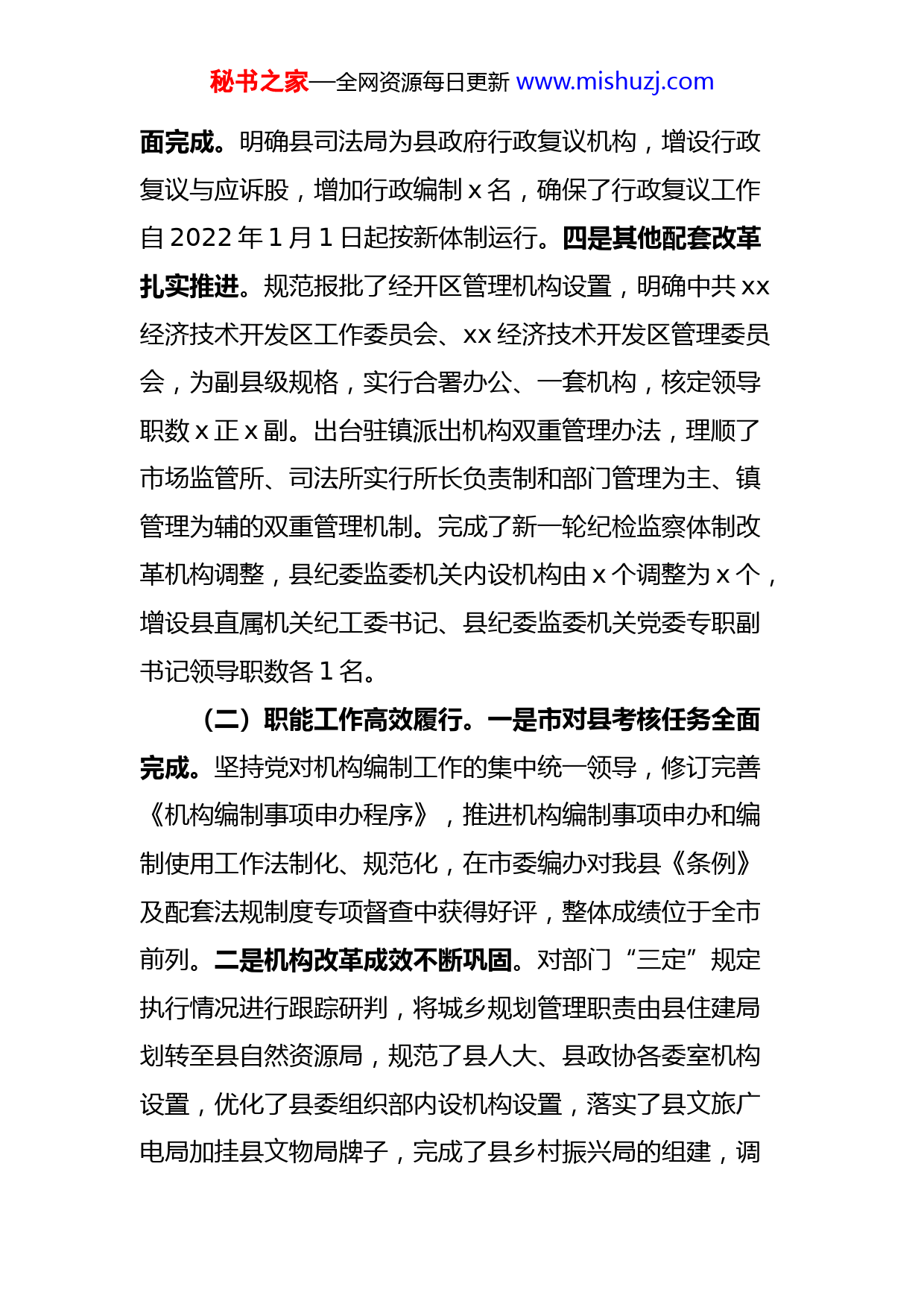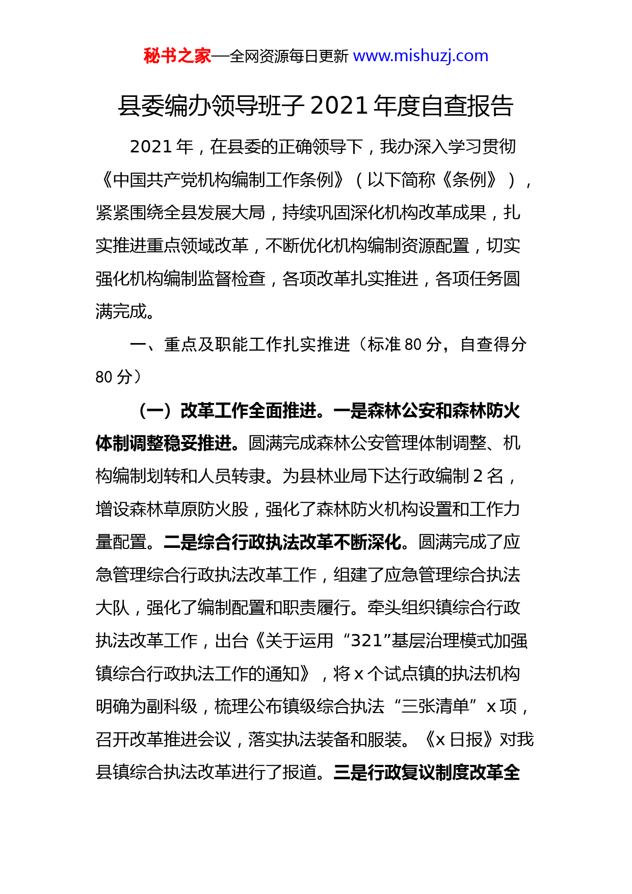 秘书之家—全网资源每日更新www.mishuzj.com县委编办领导班子2021年度自查报告2021年,在县委的正确领导下,我办深入学习贯彻《中国共产党机构编制工作条例》(以下简称《条例》),紧紧围绕全县发展大局,持续巩固深化机构改革成果,扎实推进重点领域改革,不断优化机构编制资源配置,切实强化机构编制监督检查,各项改革扎实推进,各项任务圆满完成。一、重点及职能工作扎实推进(标准80分,自查得分80分)(一)改革工作全面推进。一是森林公安和森林防火体制调整稳妥推进。圆满完成森林公安管理体制调整、机构编制划转和人员转隶。为县林业局下达行政编制2名,增设森林草原防火股,强化了森林防火机构设置和工作力量配置。二是综合行政执法改革不断深化。圆满完成了应急管理综合行政执法改革工作,组建了应急管理综合执法大队,强化了编制配置和职责履行。牵头组织镇综合行政执法改革工作,出台《关于运用“321”基层治理模式加强镇综合行政执法工作的通知》,将x个试点镇的执法机构明确为副科级,梳理公布镇级综合执法“三张清单”x项,召开改革推进会议,落实执法装备和服装。《x日报》对我县镇综合执法改革进行了报道。三是行政复议制度改革全秘书之家—全网资源每日更新www.mishuzj.com面完成。明确县司法局为县政府行政复议机构,增设行政复议与应诉股,增加行政编制x名,确保了行政复议工作自2022年1月1日起按新体制运行。四是其他配套改革扎实推进。规范报批了经开区管理机构设置,明确中共xx经济技术开发区工作委员会、xx经济技术开发区管理委员会,为副县级规格,实行合署办公、一套机构,核定领导职数x正x副。出台驻镇派出机构双重管理办法,理顺了市场监管所、司法所实行所长负责制和部门管理为主、镇管理为辅的双重管理机制。完成了新一轮纪检监察体制改革机构调整,县纪委监委机关内设机构由x个调整为x个,增设县直属机关纪工委书记、县纪委监委机关党委专职副书记领导职数各1名。(二)职能工作高效履行。一是市对县考核任务全面完成。坚持党对机构编制工作的集中统一领导,修订完善《机构编制事项申办程序》,推进机构编制事项申办和编制使用工作法制化、规范化,在市委编办对我县《条例》及配套法规制度专项督查中获得好评,整体成绩位于全市前列。二是机构改革成效不断巩固。对部门“三定”规定执行情况进行跟踪研判,将城乡规划管理职责由县住建局划转至县自然资源局,规范了县人大、县政协各委室机构设置,优化了县委组织部内设机构设置,落实了县文旅广电局加挂县文物局牌子,完成了县乡村振兴局的组建,调秘书之家—全网资源每日更新www.mishuzj.com整优化了县总工会、县妇联、团县委三个群团机关的编制资源配置,进一步统筹盘活全县行政事业编制资源。三是事业单位改革和公益服务不断改善。强化重点领域机构设置,设立县统战事务服务中心,核定事业编制x名,副科级职数1名;将中小企业服务中心升格为正科级,加挂县电子商务服务中心牌子,核定科级领导职数1正2副;聚焦提升公共文化服务质量,落实县图书馆机构单独设置;强化烈士纪念设施保护,在县退役军人服务中心加挂烈士纪念设施保护所牌子,划转补充人员x名。加强重点领域编制保障,为县疾控中心增加疫情防控及健康教育专项编制x名,为县委宣传部增加文化产业发展专项编制2名,为县财政局增加国资国企监管专项编制x名,积极化解县电影公司改革遗留问题,实现自收自支事业单位全面清零。四是机构编制使用效益不断增强。核定x名周转事业编制,用于县委选派机关事业单位工作人员到县属重点国有企业任职保留人事关系,助推了县内经营管理型人才培养;核准县融媒体中心等x个事业单位使用周转池编制x名,解决了高层次人才引进和干部队伍“青黄不接”问题。全年办理公务员招录、事业单位公开招聘及特岗落编x名,落实干部流动用编x名,办理干部流动x人次,退休、辞职、辞退下编x名。五是机构编制核查和事业单位登记管理等工作圆满完成。按照中省安排,成立工作专班,历时x个秘书之家—全网资源每日更新www.mishuzj.com月,全面完成了第二次全国机构编制核查任务,实现了“机构清、编制清、领导职数清、实有人员清”目标。全面实行事业单位法人年度报告全流程网络监测,下达催办函x份、行政处罚决定x份。完成x家机关事业单位法人年度报告工作,受理核准党政群机关、事业单位办理设立登记x家、变更登记x家、注销登记x家。强化事业单位实地核查和履职评估,对x个年度报告交叉评审得分靠后和涉改事业单位进行实地核查,对县交通运输局、自然资源局、农业农村局所属x个事业单位开展履职评估,评估考核结果在机构编制管理和目标责任制考核中直接运用。(三)单项工作圆满完成。全面完成了国有资产管理、预算绩效管理、深化改革、文化产业发展、健康xx暨爱国卫生工作、便民服务及“12345”年度考核任务,各项工作均有力有效推进。二、联村帮扶工作全面落实(标准分25分,自查得分25分)始终把脱贫攻坚成果巩固与乡村振兴有效衔接作为联村帮扶的首要任务,着力在防止所联村出现规模性返贫上下功夫。一是强化支部联建。深化机关党支部与清河村党支部共建、联建,结成党员“互联对子”x个,开展共建主题党日活动x