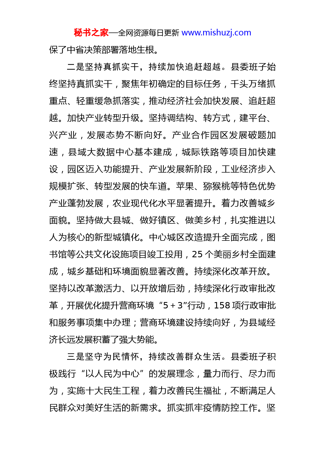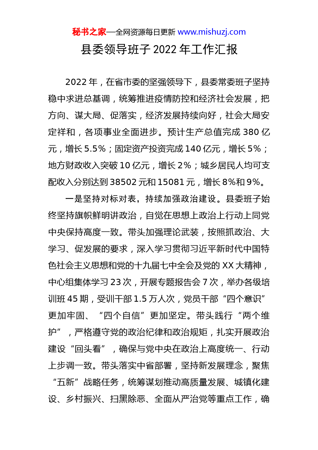 秘书之家—全网资源每日更新www.mishuzj.com县委领导班子2022年工作汇报2022年,在省市委的坚强领导下,县委常委班子坚持稳中求进总基调,统筹推进疫情防控和经济社会发展,把方向、谋大局、促落实,经济发展持续向好,社会大局安定祥和,各项事业全面进步。预计生产总值完成380亿元,增长5.5%;固定资产投资完成140亿元,增长5%;地方财政收入突破10亿元,增长2%;城乡居民人均可支配收入分别达到38502元和15081元,增长8%和9%。一是坚持对标对表,持续加强政治建设。县委班子始终坚持旗帜鲜明讲政治,自觉在思想上政治上行动上同党中央保持高度一致。带头加强理论武装,按照抓政治、大学习、促发展的要求,深入学习贯彻习近平新时代中国特色社会主义思想和党的十九届七中全会及党的XX大精神,中心组集体学习23次,开展专题报告会7次,举办各级培训班45期,受训干部1.5万人次,党员干部“四个意识”更加牢固、“四个自信”更加坚定。带头践行“两个维护”,严格遵守党的政治纪律和政治规矩,扎实开展政治建设“回头看”,确保与党中央在政治上高度统一、行动上步调一致。带头落实中省部署,坚持新发展理念,聚焦“五新”战略任务,统筹谋划推动高质量发展、城镇化建设、乡村振兴、扫黑除恶、全面从严治党等重点工作,确秘书之家—全网资源每日更新www.mishuzj.com保了中省决策部署落地生根。二是坚持真抓实干,持续加快追赶超越。县委班子始终坚持真抓实干,聚焦年初确定的目标任务,千头万绪抓重点、轻重缓急抓落实,推动经济社会加快发展、追赶超越。加快产业转型升级。坚持调结构、转方式,建平台、兴产业,发展态势不断向好。产业合作园区发展破题加速,县域大数据中心基本建成,城际铁路等项目加快建设,园区迈入功能提升、产业发展新阶段,工业经济步入规模扩张、转型发展的快车道。苹果、猕猴桃等特色优势产业蓬勃发展,农业现代化水平显著提升。着力改善城乡面貌。坚持做大县城、做好镇区、做美乡村,扎实推进以人为核心的新型城镇化。中心城区改造提升全面完成,图书馆等公共文化设施项目竣工投用,25个美丽乡村全面建成,城乡基础和环境面貌显著改善。持续深化改革开放。坚持以改革激活力、以开放增后劲,持续深化行政审批改革,开展优化提升营商环境“5+3”行动,158项行政审批和服务事项集中办理;营商环境建设持续向好,为县域经济长远发展积蓄了强大势能。三是坚守为民情怀,持续改善群众生活。县委班子积极践行“以人民为中心”的发展理念,量力而行、尽力而为,实施十大民生工程,着力改善民生福祉,不断满足人民群众对美好生活的新需求。抓实抓牢疫情防控工作。坚秘书之家—全网资源每日更新www.mishuzj.com持外防输入、内防反弹,安排专项资金3500万元,抓好摸排管控、隔离救治、宣传引导等工作,新建5个核酸检测实验室,落实扫码、测温、戴口罩以及消毒等防控措施,持续巩固抗疫成果。扎实推进脱贫攻坚同乡村振兴有效衔接。坚持“一乡一业、一村一品”,大力培育特色产业,持续做好重点领域农村基础设施建设,加快农村公路、电网、数字乡村等建设,持续实施“一村(社区)一名大学生”计划,招聘182人全部到村任职,为推进乡村振兴注入新鲜血液。大力发展民生事业。坚持保基本、兜底线、促公平、可持续,国家义务教育发展基本均衡暨省级“双高双普”县通过评估验收,城区新建3所小学投用,教育医疗事业发展实现历史性跨越。纵深推进扫黑除恶专项斗争,破获违法犯罪案件186起,抓获涉案人员245人,全县刑事发案率同比下降32.45%,人民群众有了更多的获得感、幸福感和安全感。着力抓好生态治理。牢固树立绿水青山就是金山银山的理念,扎实推进山水林田湖生态与保护修复项目,造林绿化45万亩,大气环境质量持续向好。四是抗牢主体责任,持续从严管党治党。肩负全面从严治党政治责任,对照新时代党的建设总要求,固根基、扬优势、补短板、强弱项,不断提升党的政治领导力、思想引领力、群众组织力和社会号召力。加强党建责任落秘书之家—全网资源每日更新www.mishuzj.com实。常委会、专题会8次研究党建工作,解决组织设置、“一肩挑”等重点问题,推行党组织书记履职纪实、定期巡查制度,开展党建述职评议活动,推动形成了上下联动、齐抓共管的责任格局。加强基层组织建设。严格执行支部工作条例、农村基层组织工作条例,持续推进基层党组织标准化规范化建设,整顿软弱涣散村级党组织19个。加强干部队伍建设。认真落实“三项机制”,提拔重用干部109人,其中驻村帮扶干部82人,树立了重学习、重基层、重实干、看担当的用人导向,有效激发了广大干部的精气神。加强纪律作风建设。推进巡察工作全覆盖,严肃查处群众身边的不正之风和腐败问题,党纪政务处分290人,营造了风清气正、干事创业的良好政治生态。五是狠抓自身建设,持续发挥头雁效应。县委班子始终牢记“打铁必须自身硬”,带头自我革命,自身建设得到新加强。深入开展作风建设专项行动。按照省市作风建设专项行动总体部署,一体推进四项措施,带头进行封闭学习、专题研讨、现场教学,刀刃向内、边学边查、立行立改,班子成员守初心、担使命的意识切实增强。密切联系服务群众。班子成员带着课题深入基层、听取意见,找症结、补
