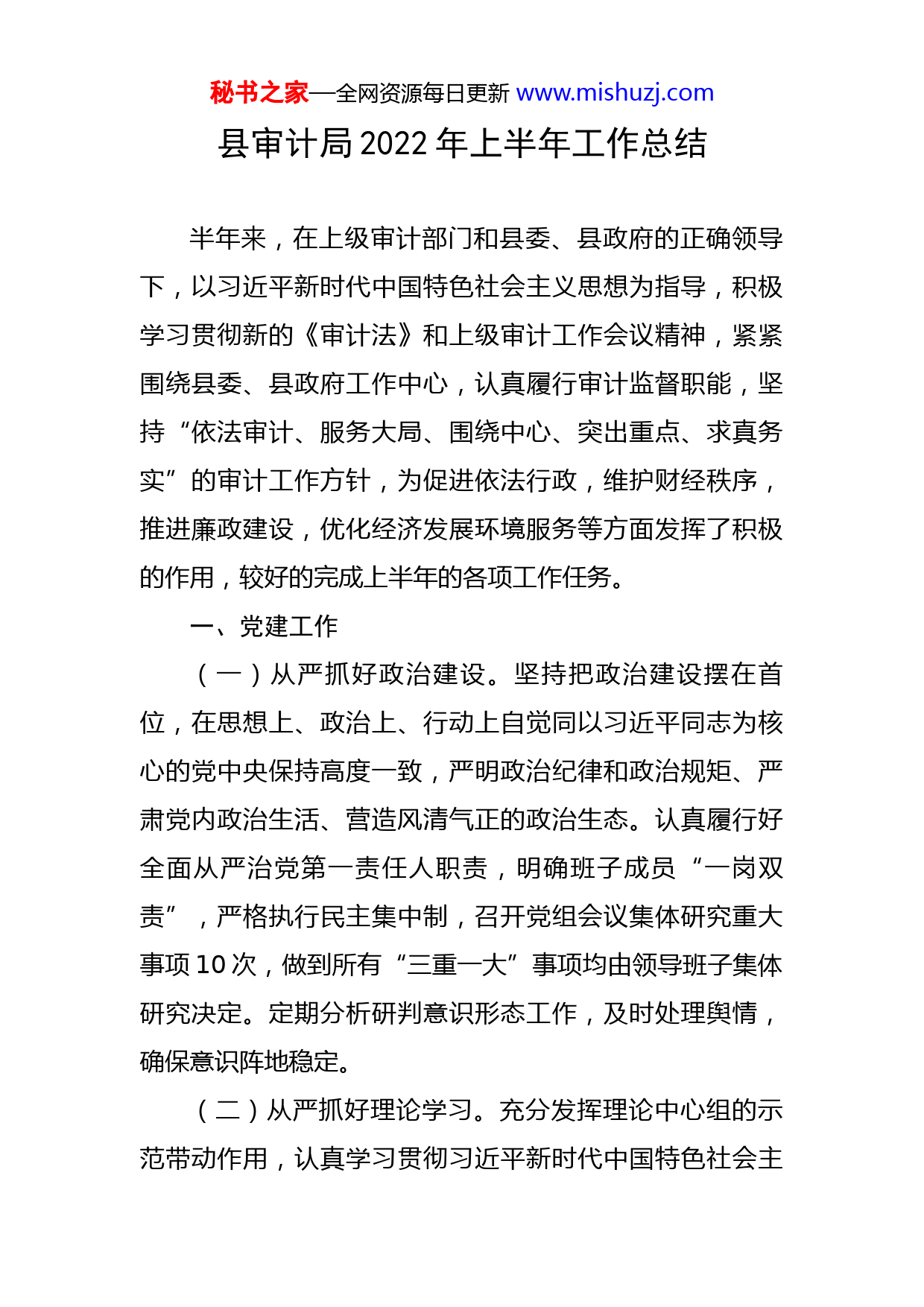 秘书之家—全网资源每日更新www.mishuzj.com县审计局2022年上半年工作总结半年来,在上级审计部门和县委、县政府的正确领导下,以习近平新时代中国特色社会主义思想为指导,积极学习贯彻新的《审计法》和上级审计工作会议精神,紧紧围绕县委、县政府工作中心,认真履行审计监督职能,坚持“依法审计、服务大局、围绕中心、突出重点、求真务实”的审计工作方针,为促进依法行政,维护财经秩序,推进廉政建设,优化经济发展环境服务等方面发挥了积极的作用,较好的完成上半年的各项工作任务。一、党建工作(一)从严抓好政治建设。坚持把政治建设摆在首位,在思想上、政治上、行动上自觉同以习近平同志为核心的党中央保持高度一致,严明政治纪律和政治规矩、严肃党内政治生活、营造风清气正的政治生态。认真履行好全面从严治党第一责任人职责,明确班子成员“一岗双责”,严格执行民主集中制,召开党组会议集体研究重大事项10次,做到所有“三重一大”事项均由领导班子集体研究决定。定期分析研判意识形态工作,及时处理舆情,确保意识阵地稳定。(二)从严抓好理论学习。充分发挥理论中心组的示范带动作用,认真学习贯彻习近平新时代中国特色社会主秘书之家—全网资源每日更新www.mishuzj.com义思想、党的十九大和党的十九届历次全会精神、《关于新形势下党内政治生活的若干准则》、《中国共产党纪律处分条例》、《中华人民共和国公职人员政务处分法》、全国两会精神以及习近平总书记参加内蒙古代表团审议时重要讲话精神,组织集中学习10次,开展党风廉政教育5次,观看警示片2次,党支部书记讲党课2次,按规定开展“主题党日”活动5次,有效地推进了全局全面从严治党工作。加强法治学习和宣传,以送法上门的形式将新修订《审计法》宣传到各部门,促进各单位增强财经法纪意识,积极支持配合审计工作。(三)从严抓好作风建设。以开展转作风、优环境、展形象、开新局”作风整治工作为抓手,注重培养德才兼备、忠诚干净担当的优秀干部。一是领导班子自觉带头贯彻执行中央八项规定及其实施细则,在重要时间、重要节点及时开展约谈提醒,提出廉政工作要求,2022年上半年开展廉政谈话1次。二是开展“驰而不息抓作风廉洁建设树新风”为主题的党风廉政建设宣传教育月活动,组织开展1次家风廉政讲堂,带领党员干部到城关镇南园社区廉政教育基地开展警示教育活动,在单位电子显示屏滚动播放廉政图片与警句,营造浓厚宣传氛围。(四)从严规范支部建设。一是认真开展党内政治生活庸俗化交易化问题专项整治,及时向在职在编的11名党秘书之家—全网资源每日更新www.mishuzj.com员通报党内政治生活庸俗化交易化问题清单并签订了党内政治生活庸俗化交易化承诺书,围绕集中治理党内政治生活庸俗化交易化问题开展专题研讨,全体在职党员认真剖析自身存在的问题,并建立整改台账。二是积极开展在职党员进社区活动,与南园社区签订党建联合体共建协议书,上半年与结对共建社区开展了以“美丽X,我是行动者”为主题的生态环保志愿服务活动。三是坚持为群众办实事,春节前夕、疫情期间对包联村进行了走访慰问,组织修建社区居民阅览室、活动室、社区公告公示栏,丰富社区居民文娱生活。四是积极参与我县市域治理现代化建设和创城活动,深入包联社区整治环境卫生、清除小广告等,改善居民生活环境。(五)坚持党建引领打赢疫情防控战役。新冠肺炎疫情防控期间,在做好本单位疫情防控工作的前提下,及时组织在职党员干部参与社区疫情防控工作。一是全体党员干部在做好个人安全防护前提下,实施“敲门行动”行动,开展核酸检测入户排查,对未做核酸人员,动员到指定核酸检测点进行采样检测。二是充分发挥临时党组织战斗堡垒作用。组织建设做到“两有两展示”。有党支部、党员名单,党员名单和组织架构展示在防控一线;有职责,临时党组织的职能职责展现在防控一线;党员在防控一线佩戴党员徽章和袖章,把鲜红的党旗插在疫情防控第秘书之家—全网资源每日更新www.mishuzj.com一线。二、审计业务工作完成情况(一)上级统审项目上半年,我局共完成4个上级统审项目,分别是:贯彻中央八项规定及其实施细则精神和落实过“紧日子”要求情况的审计、2021年1至4季度政策跟踪审计发现问题整改情况专项审计调查、X县2022年第一季度盘活存量资金专项审计调查、X县2022年优化营商环境政策措施落实情况跟踪审计。针对审计发现的问题,及时向县委审计委员会作了工作汇报,按时上报市审计局各业务科室,督促存在问题的单位及时进行整改。(二)经济责任审计按照县委组织部和纪委监委委托,对21个单位进行领导干部离任经济责任审计。上半年共完成了老牛坡党员干部教育中心等16个单位的离任经济责任审计。审计发现被审计单位存在报销票据不规范、公务接待费列支不规范、公用经费转入个人账户、固定资产未入账等问题,共涉及金额40.65万元,提出审计建议16条。(三)预算执行审计按照年初工作计划,对县本级财政2021年预算执行及决算草案进行了审计,并延伸审计县教育局、卫生健康委员会、文化旅游和体育局、林业和草原局和科学技术协会5秘书之家—全网资源每日更新www.mishuzj.com个预算执行单位,上半年,完成了县本级