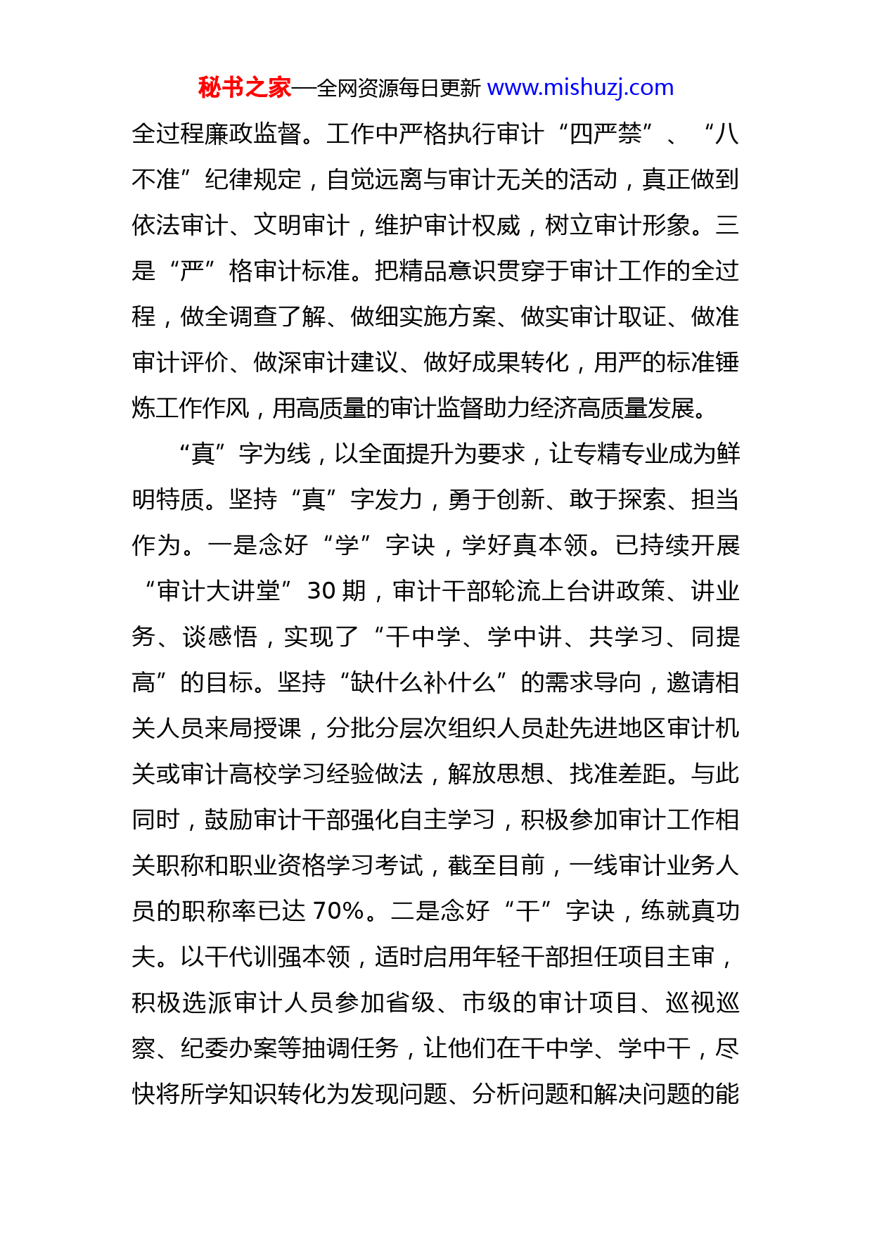 秘书之家—全网资源每日更新www.mishuzj.com县审计局“五型”机关建设工作总结XX县审计局坚持目标、问题、结果“三大导向”,围绕“政治统审、主责立审、研究促审、质效提审、科技强审、人才兴审”六条工作主线,“严”字当头、“真”字发力、“细”字用心、“实”字落地、“快”字提速,不断推进“五型”机关和干部队伍创建工作走深走实。一、工作开展情况及成效“严”字当头,以规矩意识为底线,让政治过硬成为坚强保障。XX县审计局坚持把纪律规矩挺在前面,以自身建设为着力点,促进干部作风持续优化,推动审计工作提质增效。一是“严”抓政治纪律。树牢审计机关首先是政治机关的意识,强化对习近平新时代中国特色社会主义思想、习近平总书记重要讲话精神及党中央重大决策部署等内容的学习,持续提升审计干部的政治判断力、政治领悟力、政治执行力,把政治要求贯彻落实到审计工作全过程。全面履行审计委员会办公室职责,做好组织协调、沟通联络、调查研究等工作,组织起草相关制度文件,加强各成员单位的协调联动。二是“严”明工作纪律。打铁必须自身硬。不断夯实主要领导主体责任和分管领导的“一岗双责”,加强廉政风险防控和经常性廉政教育,通过审前廉政谈话、审中风险提醒、审后廉政回访等,切实强化秘书之家—全网资源每日更新www.mishuzj.com全过程廉政监督。工作中严格执行审计“四严禁”、“八不准”纪律规定,自觉远离与审计无关的活动,真正做到依法审计、文明审计,维护审计权威,树立审计形象。三是“严”格审计标准。把精品意识贯穿于审计工作的全过程,做全调查了解、做细实施方案、做实审计取证、做准审计评价、做深审计建议、做好成果转化,用严的标准锤炼工作作风,用高质量的审计监督助力经济高质量发展。“真”字为线,以全面提升为要求,让专精专业成为鲜明特质。坚持“真”字发力,勇于创新、敢于探索、担当作为。一是念好“学”字诀,学好真本领。已持续开展“审计大讲堂”30期,审计干部轮流上台讲政策、讲业务、谈感悟,实现了“干中学、学中讲、共学习、同提高”的目标。坚持“缺什么补什么”的需求导向,邀请相关人员来局授课,分批分层次组织人员赴先进地区审计机关或审计高校学习经验做法,解放思想、找准差距。与此同时,鼓励审计干部强化自主学习,积极参加审计工作相关职称和职业资格学习考试,截至目前,一线审计业务人员的职称率已达70%。二是念好“干”字诀,练就真功夫。以干代训强本领,适时启用年轻干部担任项目主审,积极选派审计人员参加省级、市级的审计项目、巡视巡察、纪委办案等抽调任务,让他们在干中学、学中干,尽快将所学知识转化为发现问题、分析问题和解决问题的能秘书之家—全网资源每日更新www.mishuzj.com力。面对突如其来的疫情,除组织力量圆满完成全员核算检测采样任务外,积极选派9名审计干部参与疫情防控指挥部工作,充分发挥专业优势,为疫情防控数据库建设、流调信息比对、阳性病例追溯等工作贡献审计力量,一名审计干部获XX县“抗疫先锋”荣誉称号。“细”字为首,以工作清单为抓手,让精益求精成为最亮底色。细化工作流程,推行动态化清单化管理。一是建立重点工作清单。按照“11710”工作机制要求,建立重点事项台账,分解任务目标,细化落实措施,并逐一明确责任人员和完成时限。结合审计业务,制定了《审计项目进度台账》和《个人工作进度台账》,由局党组书记每周进行工作调度,确保进度与成效。二是推行党员积分台账。制定党员量化积分管理办法,以积分为抓手,激励党员干部在各项工作中打头阵、站排头、当标杆。我局“党员量化积分”工作先后在中国审计报、XX市审计局网站和XX红微信公众号进行了宣传报道。三是梳理问题及整改清单。对照市委《决定》30条,查摆“严”“真”“细”“实”“快”五方面问题25条,建立问题清单,明确整改措施及时限。四是推行“比学赶超”清单。全体审计干部制定自己的“比学赶超”清单,确定对标目标,细化学先进、比先进、赶超先进的具体措施,局党组及时督导,跟踪问效。秘书之家—全网资源每日更新www.mishuzj.com“实”字为要,以监督成效为导向,让求真务实成为永恒旋律。大兴求真务实之风,坚持工作务求实效,说实话、办实事。一是深化研究型审计。年初确定全年科研课题,开展重点选题攻关,业务骨干带着课题开展审计,让研究思维贯穿项目全过程。通过对审计立项、审计实施、审计质量、成果开发利用等各环节强化研究工作,让问题抓得更深、原因分析更透、根源找得更准。二是审计专报献良策。依法履行审计监督职责,既当保障经济安全的“卫士”,又当好县委政府重大决策的“谋士”,在“查病治病防未病”中发挥建设性作用,为XX经济社会发展作出重要贡献。去年以来,我局结合审计发现的问题,围绕经济社会发展,向县委县政府提报《审计专报》10余篇,其中领导批示7篇,内容涉及被征地农民保障资金的落实、政府投资项目的管理等多个方面,并促进有关部门建立健全规章制度16项。“快”字为纲,以创新驱动为核心,让高质高效成为过硬本领。一是转变监督方式。推进“巡审联动”,通过强化与县委巡察办的信息互通、资源共享,积极运用巡审联动的监督模式