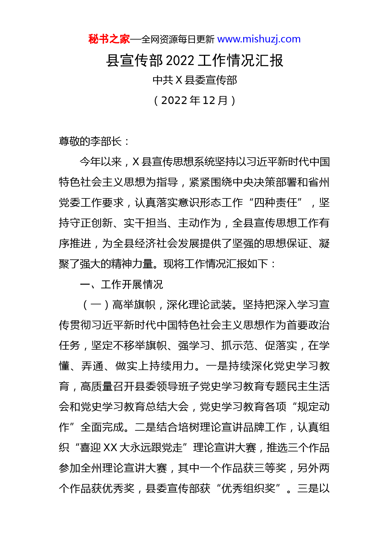 秘书之家—全网资源每日更新www.mishuzj.com县宣传部2022工作情况汇报中共X县委宣传部(2022年12月)尊敬的李部长:今年以来,X县宣传思想系统坚持以习近平新时代中国特色社会主义思想为指导,紧紧围绕中央决策部署和省州党委工作要求,认真落实意识形态工作“四种责任”,坚持守正创新、实干担当、主动作为,全县宣传思想工作有序推进,为全县经济社会发展提供了坚强的思想保证、凝聚了强大的精神力量。现将工作情况汇报如下:一、工作开展情况(一)高举旗帜,深化理论武装。坚持把深入学习宣传贯彻习近平新时代中国特色社会主义思想作为首要政治任务,坚定不移举旗帜、强学习、抓示范、促落实,在学懂、弄通、做实上持续用力。一是持续深化党史学习教育,高质量召开县委领导班子党史学习教育专题民主生活会和党史学习教育总结大会,党史学习教育各项“规定动作”全面完成。二是结合培树理论宣讲品牌工作,认真组织“喜迎XX大永远跟党走”理论宣讲大赛,推选三个作品参加全州理论宣讲大赛,其中一个作品获三等奖,另外两个作品获优秀奖,县委宣传部获“优秀组织奖”。三是以秘书之家—全网资源每日更新www.mishuzj.com理论中心组学习为龙头抓好理论武装。重新修订《党委(党组)理论中心组学习实施办法》,制定《各级党委(党组)理论学习中心组2022年专题学习重点内容安排》《党委(党组)理论学习中心组县级列席旁听工作组2022年工作计划》。1至11月,县委理论学习中心组集中学习10次,全县各级党委(党组)组织中心组学习640余次。四是抓实线上理论学习。强化“学习强国”学习平台使用和投稿推送工作,1至11月共上稿190篇。五是强化学习宣讲。把《习近平谈治国理政》第四卷和习近平总书记的重要讲话精神纳入各级党委(党组)理论中心组学习,列入干部培训教学重要内容。丰富宣讲载体,广泛深入开展面向基层的分众化、对象化、互动式宣讲共158场次,宣讲受众达7000余人次。(二)突出主线,喜迎党的XX大。将迎接宣传贯彻党的XX大作为全年工作的主线,县委常委会专题进行研究,提前谋划、周密部署、压实责任。一是积极营造社会氛围。9月21日,X县委宣传部下发《关于做好迎接党的XX大氛围营造工作的通知》,明确各乡镇、各部门围绕喜迎党的XX大开展宣传报道及氛围营造工作职责。投入资金48万元,在全县高速路口、县城主要街道制作户外广告16块;各乡镇、县级各部门在大门口或区域内醒目位置、集镇街区、公路沿线、各行政村醒目位置悬挂喜迎党的XX大秘书之家—全网资源每日更新www.mishuzj.com标语498条;单位、企业门店利用电子显示屏、橱窗、板报、专栏刊播喜迎党的XX大标语398条;各行业主管部门在广场、公园、社区、车站、体育馆、影城、出租车、宾馆酒店、旅游景点等人员密集场所的醒目位置悬挂喜迎党的XX大标语、张贴宣传海报1265条次。二是全力做好宣传报道。认真贯彻落实中共X州委宣传部《关于深化迎接党的XX大宣传报道工作的意见》,在“菌香X县”APP开设“奋进新征程建功新时代”“扎实推进作风革命效能革命”“领航中国”“非凡十年”等专栏,全方位深层次多角度反映党的十八大以来X县经济社会发展变化。利用该平台及视频号、抖音号、微信公众号、微博等及时做好党的XX大代表、召开XX大日期、党的十九届七中全会以及大会其他准备工作、党的知识、党的光荣历史和丰功伟绩等宣传报道的转载刊播工作,截止目前,共转载喜迎党的XX大相关宣传报道245条,视频7个。三是积极宣传十年成就。组织策划“喜迎XX大十年变迁看X县”“喜迎XX大,我眼中这十年”等系列宣传报道,以理论文章、主题宣传、选题报道、专访等形式集中反映X县十年来取得的历史性成就、发生的历史性变革。组织开展#X县又上分喜看家乡新变化#抖音话题短视频征集活动、“我的家乡这十年变化不一般”讲变化征文活动及“非凡十年”短视频拍摄活动,从微观角度反映干部群众对经济社会发展变秘书之家—全网资源每日更新www.mishuzj.com化的切身感受和对党的XX大召开的期盼,用可知可感可信的新闻宣传展示X县之美,凝聚起奋进新征程的磅礴伟力。四是强化文化宣传。各乡镇、各部门结合地区、民族、行业特点,以群众喜闻乐见、易于接受的方式,广泛组织开展内容丰富、形式多样的群众性文化活动18场次,参加人员2564人次,让群众在多姿多彩、喜闻乐见的文化文艺活动中获得精神滋养、增强精神力量,创作《全民喜迎XX大乘风破浪再出发》《七彩彝裳》等文艺作品。(三)健全机制,加强新闻宣传。坚持围绕中心抓宣传,凝聚人心、鼓舞斗志。一是健全新闻宣传制度。出台《X县2022年新闻宣传工作考核办法》和《关于进一步加强和规范新闻宣传工作的通知》,建立新闻宣传内容报备、新闻线索报送、新闻宣传考核通报约谈、优秀通讯员跟班学习等工作制度,县委宣传部及县融媒体中心班子成员分四组对口联系督促各乡镇、县级各部门新闻宣传和意识形态工作。定期对各乡镇各部门新闻稿件上稿情况进行通报,督促做好稿件撰写和质量提升工作。二是强化业务培训。召开全县新闻宣传工作推进会,举办骨干通讯员培训班,邀请人民网、X省日报、X州日报的资深编辑对全县骨干通讯员进行业务培训。分批次组织乡镇宣传委员和骨干通讯员到《X