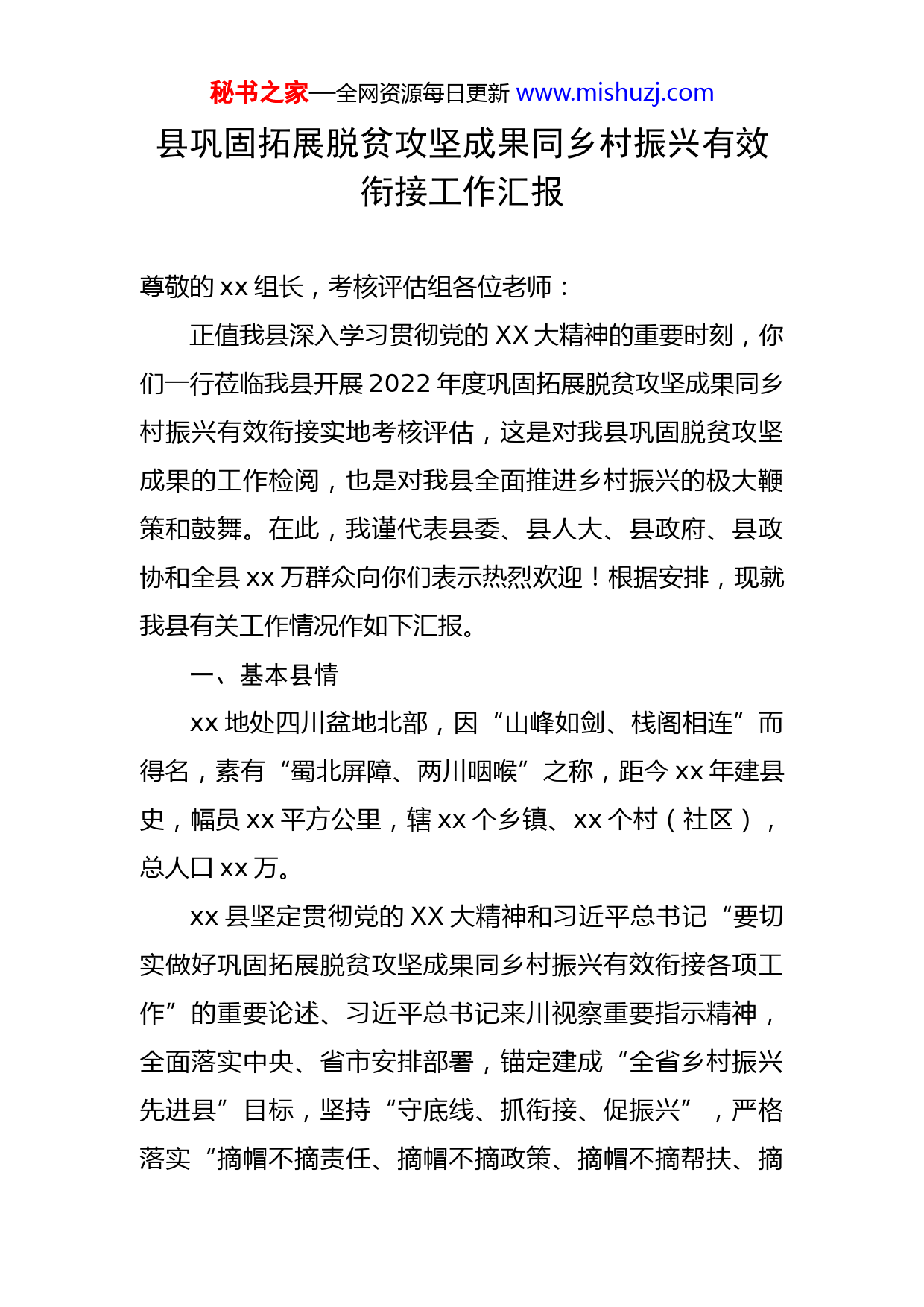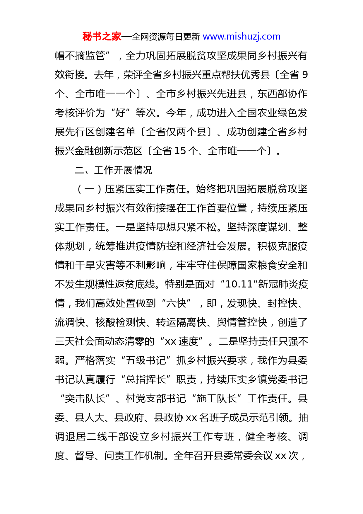 秘书之家—全网资源每日更新www.mishuzj.com县巩固拓展脱贫攻坚成果同乡村振兴有效衔接工作汇报尊敬的xx组长,考核评估组各位老师:正值我县深入学习贯彻党的XX大精神的重要时刻,你们一行莅临我县开展2022年度巩固拓展脱贫攻坚成果同乡村振兴有效衔接实地考核评估,这是对我县巩固脱贫攻坚成果的工作检阅,也是对我县全面推进乡村振兴的极大鞭策和鼓舞。在此,我谨代表县委、县人大、县政府、县政协和全县xx万群众向你们表示热烈欢迎!根据安排,现就我县有关工作情况作如下汇报。一、基本县情xx地处四川盆地北部,因“山峰如剑、栈阁相连”而得名,素有“蜀北屏障、两川咽喉”之称,距今xx年建县史,幅员xx平方公里,辖xx个乡镇、xx个村(社区),总人口xx万。xx县坚定贯彻党的XX大精神和习近平总书记“要切实做好巩固拓展脱贫攻坚成果同乡村振兴有效衔接各项工作”的重要论述、习近平总书记来川视察重要指示精神,全面落实中央、省市安排部署,锚定建成“全省乡村振兴先进县”目标,坚持“守底线、抓衔接、促振兴”,严格落实“摘帽不摘责任、摘帽不摘政策、摘帽不摘帮扶、摘秘书之家—全网资源每日更新www.mishuzj.com帽不摘监管”,全力巩固拓展脱贫攻坚成果同乡村振兴有效衔接。去年,荣评全省乡村振兴重点帮扶优秀县〔全省9个、全市唯一一个〕、全市乡村振兴先进县,东西部协作考核评价为“好”等次。今年,成功进入全国农业绿色发展先行区创建名单〔全省仅两个县〕、成功创建全省乡村振兴金融创新示范区〔全省15个、全市唯一一个〕。二、工作开展情况(一)压紧压实工作责任。始终把巩固拓展脱贫攻坚成果同乡村振兴有效衔接摆在工作首要位置,持续压紧压实工作责任。一是坚持思想只紧不松。坚持深度谋划、整体规划,统筹推进疫情防控和经济社会发展。积极克服疫情和干旱灾害等不利影响,牢牢守住保障国家粮食安全和不发生规模性返贫底线。特别是面对“10.11”新冠肺炎疫情,我们高效处置做到“六快”,即,发现快、封控快、流调快、核酸检测快、转运隔离快、舆情管控快,创造了三天社会面动态清零的“xx速度”。二是坚持责任只强不弱。严格落实“五级书记”抓乡村振兴要求,我作为县委书记认真履行“总指挥长”职责,持续压实乡镇党委书记“突击队长”、村党支部书记“施工队长”工作责任。县委、县人大、县政府、县政协xx名班子成员示范引领。抽调退居二线干部设立乡村振兴工作专班,健全考核、调度、督导、问责工作机制。全年召开县委常委会议xx次,秘书之家—全网资源每日更新www.mishuzj.com县政府常务会议xx次,县委农村工作领导小组会议xx次。三是坚持力量只增不减。调整充实巩固拓展脱贫攻坚成果同乡村振兴有效衔接专项工作领导小组,统筹用好原分管过脱贫攻坚的县领导和部门负责同志,组建县乡村振兴工作专班。对30个低收入村、255户重点监测户加派县级领导“盯穷村包穷户”联系帮扶。优化调整驻村干部xx名,组建工作队xx支,制定《xx县驻村第一书记和工作队管理办法》。6月中上旬省直部门(单位)驻村干部两期培训班在我县举办。(二)不折不扣落实政策。保持现有帮扶政策总体稳定,接续推进全面脱贫与乡村振兴有效衔接。一是对标出台配套措施。对标国家、省市出台的系列政策文件,去年我县结合实际,及时跟进出台了“1+43”〔1个管总文件:《xx县实现巩固拓展脱贫攻坚成果同乡村振兴有效衔接的实施意见》,43个实施方案:防止返贫动态监测帮扶、推动特色产业可持续发展等实施方案〕配套具体方案。今年,我县对标上级年度政策文件再次细化调整,确保衔接好、可操作、能落地。二是大力整合各类资金。全年整合涉农资金49583.5万元,到位各级财政衔接资金共计38997.5万元〔中央21397万元,省级10954万元,市级2076.76万元,县级配套4569.74万元〕。45个乡村振兴重点帮扶村安排项目137个,投入资金6961.51万秘书之家—全网资源每日更新www.mishuzj.com元,其中衔接资金5028.35万元。中省财政衔接资金用于产业发展18351.82万元,占比56.73%,符合年度中央、省级财政衔接资金用于产业比例要求。三是提升政策保障质效。2022年脱贫人口人均纯收入15172.13元,较去年增加2148.6元,增幅16.5%,义务教育适龄儿童上学率、脱贫人口基本医疗参保率、住房安全保障率均为100%。大力实施农村供水保障工程,饮水安全得到全面保障。将脱贫户中17212人纳入农村低保,应纳尽纳、应帮尽帮。四是着力补齐短板弱项。突出问题导向,组织自主排查,开展县内两轮综合督导,把排查出的问题与2021年中央考核评估、省内考核评估以及今年省级专项督查反馈的问题一体推进整改。建立问题台账,研制整改方案,逐一整改销号。(三)盯村盯户守住底线。坚持底线思维,锁定“零返贫”目标,盯村盯户补短提质。一是全覆盖开展摸排。作为全省8个防止返贫监测帮扶摸排试点县之一,我县聚焦人均纯收入、基础设施、产业发展等,对全县364个行政村(社区)综合研判,评定出低收入村30个。通过对16万农户集中排查以及日常摸排、动态监测,将1193户2858人纳入监测范围〔今年新增监测对象153户386人〕。《xx县抓实防止返贫监测帮扶摸排试点》在xx第23期刊发。二是精准化开展帮扶。出台低收入村和监测户秘书之家—全网资源每日更新www.mishuzj.com“