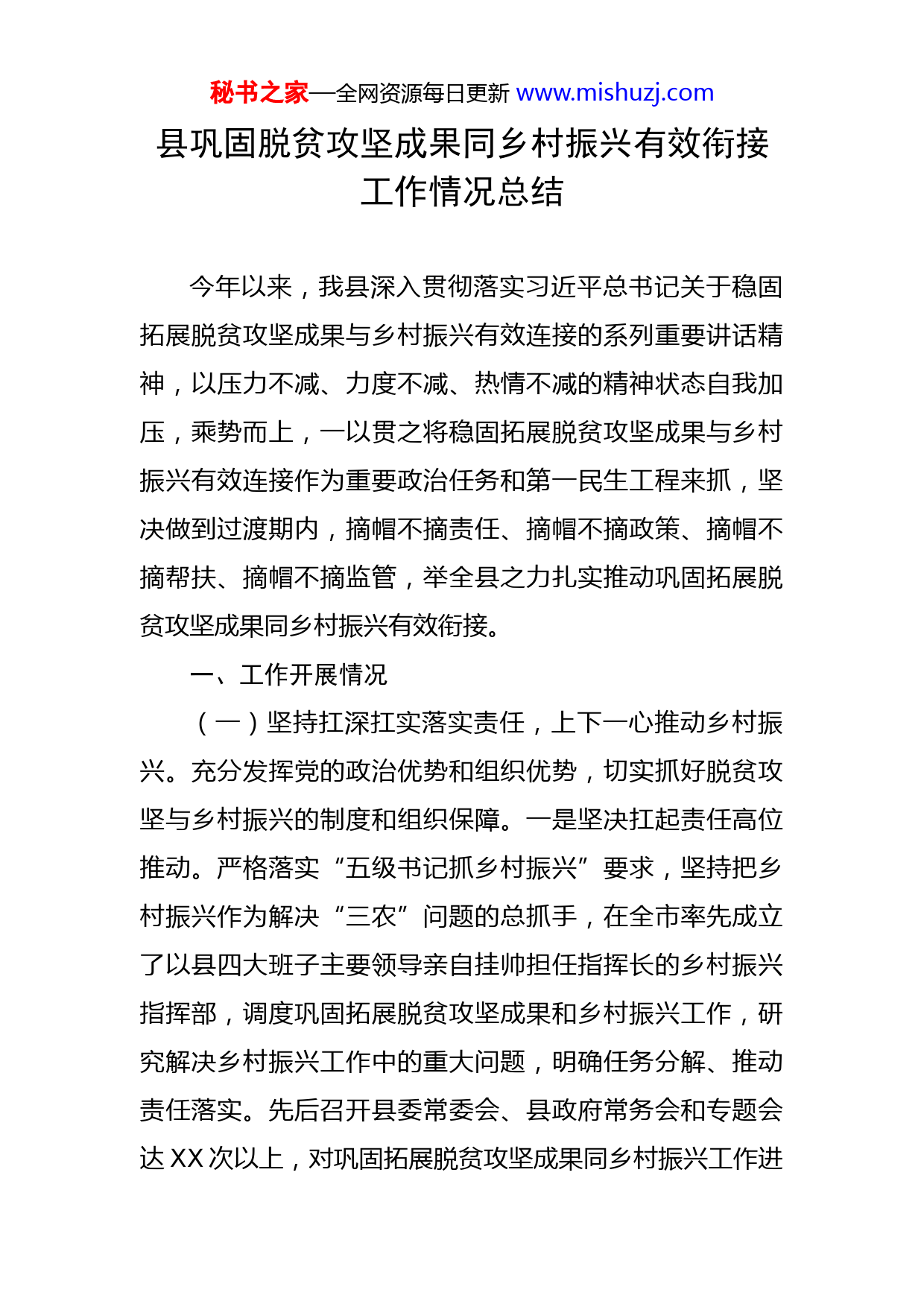 秘书之家—全网资源每日更新www.mishuzj.com县巩固脱贫攻坚成果同乡村振兴有效衔接工作情况总结今年以来,我县深入贯彻落实习近平总书记关于稳固拓展脱贫攻坚成果与乡村振兴有效连接的系列重要讲话精神,以压力不减、力度不减、热情不减的精神状态自我加压,乘势而上,一以贯之将稳固拓展脱贫攻坚成果与乡村振兴有效连接作为重要政治任务和第一民生工程来抓,坚决做到过渡期内,摘帽不摘责任、摘帽不摘政策、摘帽不摘帮扶、摘帽不摘监管,举全县之力扎实推动巩固拓展脱贫攻坚成果同乡村振兴有效衔接。一、工作开展情况(一)坚持扛深扛实落实责任,上下一心推动乡村振兴。充分发挥党的政治优势和组织优势,切实抓好脱贫攻坚与乡村振兴的制度和组织保障。一是坚决扛起责任高位推动。严格落实“五级书记抓乡村振兴”要求,坚持把乡村振兴作为解决“三农”问题的总抓手,在全市率先成立了以县四大班子主要领导亲自挂帅担任指挥长的乡村振兴指挥部,调度巩固拓展脱贫攻坚成果和乡村振兴工作,研究解决乡村振兴工作中的重大问题,明确任务分解、推动责任落实。先后召开县委常委会、县政府常务会和专题会达XX次以上,对巩固拓展脱贫攻坚成果同乡村振兴工作进秘书之家—全网资源每日更新www.mishuzj.com行谋划布局、协调推进。同时,严格落实五年过渡期“四个不摘”要求,紧密结合X实际,制定《全面推进乡村振兴加快农业农村现代化的实施意见》《关于实现巩固拓展脱贫攻坚成果同乡村振兴有效衔接的实施意见》《X县乡村振兴工作领导小组办公室关于持续开展易地扶贫搬迁“共筑行动”结对帮扶活动的通知》等指导文件,为做好巩固脱贫攻坚成果同乡村振兴有效衔接明确了工作指导思想、基本思路和目标任务。二是资源整合保障工作力量。制定县级领导干部和县直部门联系指导乡村振兴工作方案,构建“主要领导统筹抓、分管领导牵头抓、部门乡镇具体抓、指挥部办公室督查跟踪抓”的工作格局。全县调集XX名事业编制,成立县乡村振兴服务中心,专职工作人员总体稳定,有力保障工作顺利开展、有序衔接。三是扎实抓好问题排查整改。对照国家脱贫攻坚成效考核、省市督查反馈和举一反三对照排查发现问题,认真开展大排查,推动脱贫攻坚责任落实、政策落实、工作落实精准到位,全县统筹各类渠道共认领发现问题XX个,国家层面反馈的X大类XX个问题,举一反三对照排查发现问题X个,省级层面反馈问题X个,市级层面点对点反馈问题XX个,县级层面自查发现问题XX个。针对各类问题,及时制定整改方案,切实将问题分解到责任部门和乡镇,建立整改台账、列出整改清单、明确整改时限,压紧压实“双台账、双责秘书之家—全网资源每日更新www.mishuzj.com任、双销号”责任,统筹抓好脱贫攻坚问题排查整改工作。建立问题整改长效机制,坚决防止问题反弹。XXXX年,“乡村振兴云”中的各类问题全部完成整改销号,受理扶贫专线XX起,办结XX起,办结率和群众满意率XXX%。开展督查暗访、检查、审计XX次,保证整改出实效。同时,强化结果运用,考核问效选拔X人、评先选优X人、追责问责X人,为持续巩固拓展脱贫攻坚成果有效衔接乡村振兴打好基础。(二)坚持多措并举防返贫,健全防贫监测帮扶机制。把健全防返贫致贫动态监测和帮扶机制作为守住不发生规模性返贫底线的重要抓手,聚焦返贫致贫风险群体,筑牢防止返贫致贫“防火墙”。一是健全防贫监测帮扶机制。坚持常态化走访、防贫动态监测和帮扶集中排查相结合的方式,创新“XXXX”防贫长效机制,逐村逐户了解农户收入支出、产业就业、“两不愁三保障”及饮水安全等情况,通过“扫码申报、帮扶无忧、干部摸排、包村到户、筛查预警、合力监测”措施,共排查新增“三类户”XX户XX人,其中边缘易致贫户XX户XX人,突发严重困难户X户XX人,针对主要致贫返贫风险,及时比对、核查,进行综合研判,分类落实住房帮扶措施X户、医疗帮扶XX户,教育帮扶X户。同时,以政府购买服务的形式,探索建立“财政+保险+农户”的防贫保障机制,投入秘书之家—全网资源每日更新www.mishuzj.com资金XX万元为XX人次脱贫人口购买防贫保险,实现脱贫人户参保率达到XX%,累计受理脱贫户理赔件XX起,赔付金额XX万元。二是筑牢兜底保障坚固防线。强化农村低保制度与乡村振兴的有效衔接,研究制定社会兜底与乡村振兴衔接的政策措施,印发《X县进一步做好兜底保障风险防控监测预警工作方案》,按季度或按月开展数据比对分析,及时掌握监测对象中尚未纳入农村低保、特困供养等社会救助范围的人员信息,分层分类实施社会救助,持续加大保障力度,做到应保尽保、应兜尽兜、应退尽退,切实筑牢防贫返贫最后防线。截至目前,全县共纳入农村低保XX户、XXXX人(其中,建档立卡脱贫对象XXXX人),累计发放农村低保金XX万元;农村特困供养人员XXXX人,累计发放农村特困人员生活补贴XXXX万元;实施临时救助XXXX人,累计发放救助资金XXX万元。三是夯实三保障一安全成果。严格落实“控辍保学”“双线”管理和七长责任制,健全动态监测对象台账,巩固拓展控辍保学成果;持续落实学生资助政策,发放学生资助资金XXX万元,惠及学生XXXX人次;发放营养改善资金XXXX万元,发放生源地贷款XXXX笔XXX万元,认定各阶段困难学生XXXX名。稳步推进全民医保