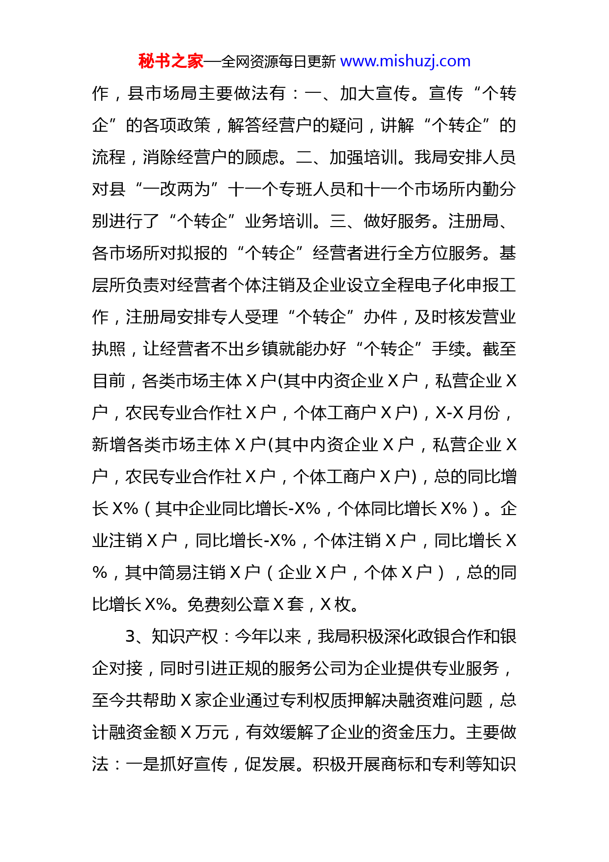秘书之家—全网资源每日更新www.mishuzj.com县市场局2022年上半年工作情况汇报一、创造经济高质量发展,圆满完成营商环境指标1、深化“放管服”改革,推进“证照分离”。全面贯彻落实国务院《关于在全国推开“证照分离”改革的通知》和省市关于“证照分离”文件精神,在全县范围内对中央层面和我省地方层面的X项涉企行政审批事项分别按照直接取消审批、审批改为备案、实行告知承诺、优化准入服务等四种方式实施“证照分离”改革。2、优化流程,高效服务,激发市场活力。企业开办全程“一窗受理”、“一网通办”。在政务服务大厅设置X台电脑,设立“网上办理自助服务区”,方便群众自助办事,加快推进只进一扇门、上一个网、最多跑一次进程;压缩企业开办时间。简化优化流程,提升工作效能,将企业开办办理环节压减为设立登记、公章刻制、发票申领X个环节,将企业开办时间压缩至X个工作日以内,其中企业注册方面保证X个工作日之内办结,公章刻制和发票申领环节同步办理,一并压缩至X个工作日以内。进一步优化企业设立登记、公章刻制和发票申领、社保登记、银行开户等环节的办理流程,全程电子化实行网上签名,半程或线下登记全面推进实名认证,实现各环节有效衔接、无缝对接。今年县委政府在全县范围内大力推进“个转企”工秘书之家—全网资源每日更新www.mishuzj.com作,县市场局主要做法有:一、加大宣传。宣传“个转企”的各项政策,解答经营户的疑问,讲解“个转企”的流程,消除经营户的顾虑。二、加强培训。我局安排人员对县“一改两为”十一个专班人员和十一个市场所内勤分别进行了“个转企”业务培训。三、做好服务。注册局、各市场所对拟报的“个转企”经营者进行全方位服务。基层所负责对经营者个体注销及企业设立全程电子化申报工作,注册局安排专人受理“个转企”办件,及时核发营业执照,让经营者不出乡镇就能办好“个转企”手续。截至目前,各类市场主体X户(其中内资企业X户,私营企业X户,农民专业合作社X户,个体工商户X户),X-X月份,新增各类市场主体X户(其中内资企业X户,私营企业X户,农民专业合作社X户,个体工商户X户),总的同比增长X%(其中企业同比增长-X%,个体同比增长X%)。企业注销X户,同比增长-X%,个体注销X户,同比增长X%,其中简易注销X户(企业X户,个体X户),总的同比增长X%。免费刻公章X套,X枚。3、知识产权:今年以来,我局积极深化政银合作和银企对接,同时引进正规的服务公司为企业提供专业服务,至今共帮助X家企业通过专利权质押解决融资难问题,总计融资金额X万元,有效缓解了企业的资金压力。主要做法:一是抓好宣传,促发展。积极开展商标和专利等知识秘书之家—全网资源每日更新www.mishuzj.com产权相关知识的宣传,不定期实地走访企业扎实推进“商标品牌”战略。同时引进专利代理机构,强化专利服务工作。我局把工作重心由专利管理转移到专利服务上,帮助企业把专利工作推向专业化。二是抓好培育,创亮点。选择扶贫带动性强、品牌辐射范围广、惠及农民多的地理标志,推动地理标志证明商标的扩大及地理标志保护产品的运用和保护,助力脱贫致富和乡村振兴。三是抓好质量,保存量。挖掘知识产权亮点,提高商标、专利申请数量与质量;同时对全县发明专利建立台账进行事前介入,防止专利流失。四是抓好突破,攻难关。帮助企业利用商标、专利进行质押贷款,解决融资难问题,助推实体经济和中小微企业发展。截至目前,我县拥有中国驰名商标X件,马德里国际商标X件,地理标志证明商标X件,X省商标品牌示范企业X家,知识产权贯标企业X家,地理标志保护产品X个。目前,我县新增授权发明专利X件,截至X月份,我县有效发明专利量为X件,发明专利万人拥有量为X件;商标注册量为X件,有效商标注册总量为X件。4、“双随机、一公开”联合抽查监管工作。县商改办根据省、市局相关工作要求和文件精神,于四月底印发《关于征求的函》,商改办整理汇总各成员单位所反馈意见,形成X县“一业一查”部门联合抽查清单,制定X县“一业一查”秘书之家—全网资源每日更新www.mishuzj.com部门联合抽查计划。截至目前县住建局、市场局已牵头开展了部门联合双随机抽查活动。平台数据显示我县单位名下任务X个,发起联合任务X个,接收联合任务X个,联合任务占比X%;信用等级任务占比X%。二、守底线、惠民生,切实保障市场消费安全1.食品安全方面:扎实开展食品生产整治提升行动。推动食品生产企业提高食品安全管理水平,鼓励食品生产加工小作坊改善生产条件,推进小作坊示范提升工作。目前,我局正在对X家食品生产企业,X家食品小作坊进行示范培育。根据我县实际情况制定《X年X县食品安全抽检监测工作实施方案》,及时组织开展食用农产品及食品监督抽检,第一季度已按要求完成监督抽检任务。截至目前,我局X年度食用农产品和食品监督抽检已完成X组,抽检不合格食品均已按要求开展核查处置工作。2.药品安全方面:自X年X月X日至X年X月X日,我局开展了为期X个月的“药品安全春风行动”。检查期间,我局严格按照省、市局加强药械化监管工作决策部署,以城乡接合部、农村地区为重点区域,以单体零售药店、个体诊所、乡镇卫生院、民营特色医院、疫苗接种单位、美容机构和电子商务经营平台等为重点