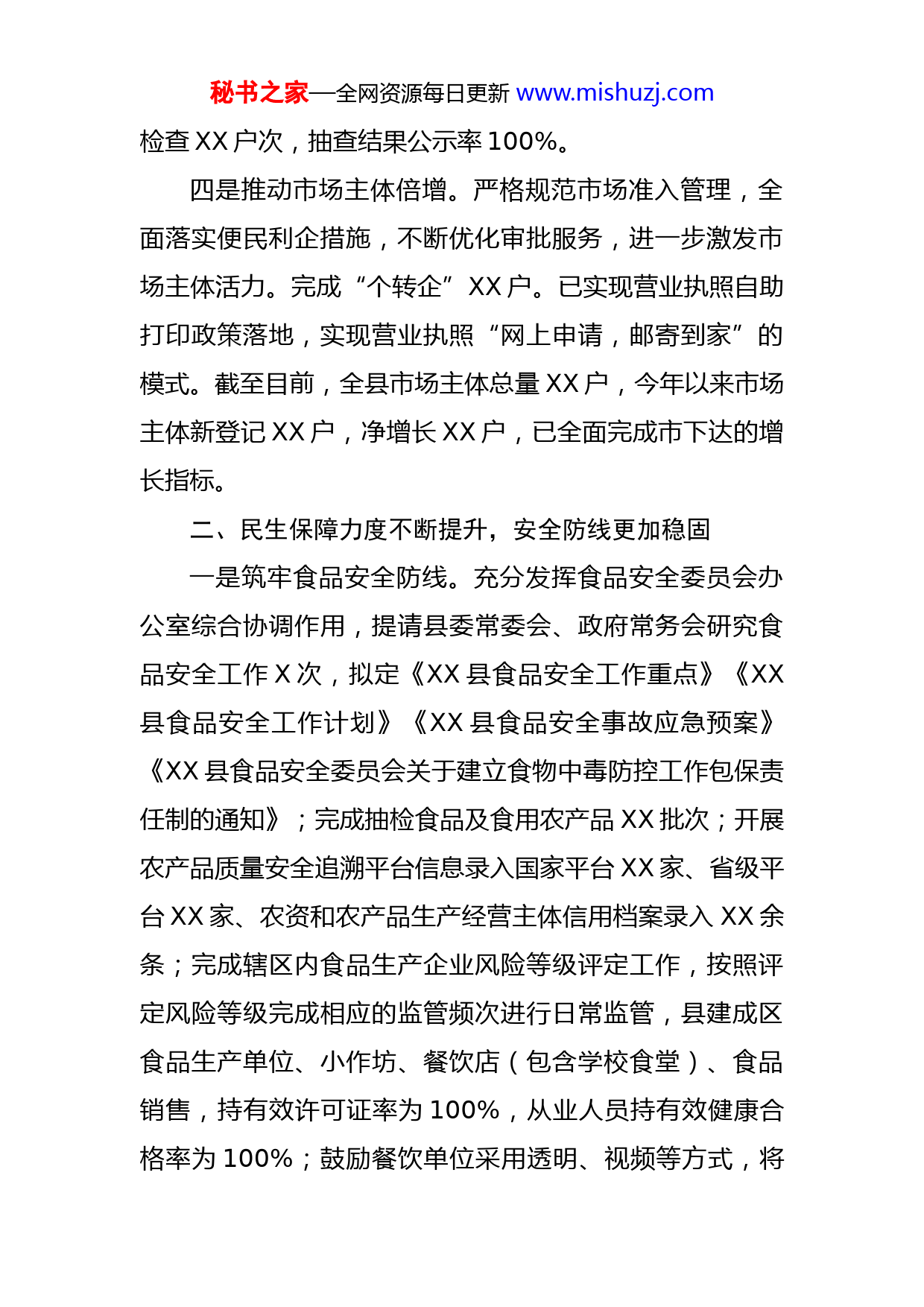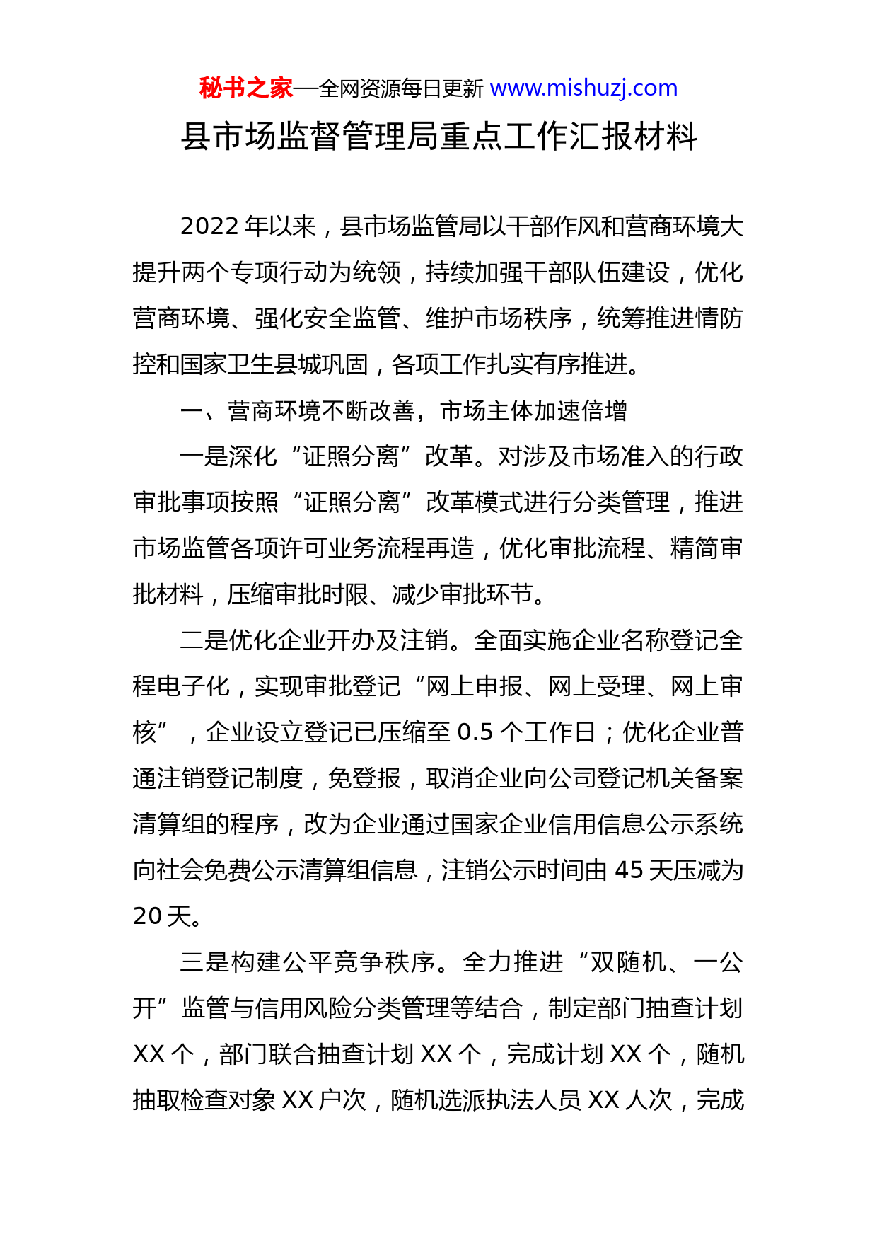 秘书之家—全网资源每日更新www.mishuzj.com县市场监督管理局重点工作汇报材料2022年以来,县市场监管局以干部作风和营商环境大提升两个专项行动为统领,持续加强干部队伍建设,优化营商环境、强化安全监管、维护市场秩序,统筹推进情防控和国家卫生县城巩固,各项工作扎实有序推进。一、营商环境不断改善,市场主体加速倍增一是深化“证照分离”改革。对涉及市场准入的行政审批事项按照“证照分离”改革模式进行分类管理,推进市场监管各项许可业务流程再造,优化审批流程、精简审批材料,压缩审批时限、减少审批环节。二是优化企业开办及注销。全面实施企业名称登记全程电子化,实现审批登记“网上申报、网上受理、网上审核”,企业设立登记已压缩至0.5个工作日;优化企业普通注销登记制度,免登报,取消企业向公司登记机关备案清算组的程序,改为企业通过国家企业信用信息公示系统向社会免费公示清算组信息,注销公示时间由45天压减为20天。三是构建公平竞争秩序。全力推进“双随机、一公开”监管与信用风险分类管理等结合,制定部门抽查计划XX个,部门联合抽查计划XX个,完成计划XX个,随机抽取检查对象XX户次,随机选派执法人员XX人次,完成秘书之家—全网资源每日更新www.mishuzj.com检查XX户次,抽查结果公示率100%。四是推动市场主体倍增。严格规范市场准入管理,全面落实便民利企措施,不断优化审批服务,进一步激发市场主体活力。完成“个转企”XX户。已实现营业执照自助打印政策落地,实现营业执照“网上申请,邮寄到家”的模式。截至目前,全县市场主体总量XX户,今年以来市场主体新登记XX户,净增长XX户,已全面完成市下达的增长指标。二、民生保障力度不断提升,安全防线更加稳固一是筑牢食品安全防线。充分发挥食品安全委员会办公室综合协调作用,提请县委常委会、政府常务会研究食品安全工作X次,拟定《XX县食品安全工作重点》《XX县食品安全工作计划》《XX县食品安全事故应急预案》《XX县食品安全委员会关于建立食物中毒防控工作包保责任制的通知》;完成抽检食品及食用农产品XX批次;开展农产品质量安全追溯平台信息录入国家平台XX家、省级平台XX家、农资和农产品生产经营主体信用档案录入XX余条;完成辖区内食品生产企业风险等级评定工作,按照评定风险等级完成相应的监管频次进行日常监管,县建成区食品生产单位、小作坊、餐饮店(包含学校食堂)、食品销售,持有效许可证率为100%,从业人员持有效健康合格率为100%;鼓励餐饮单位采用透明、视频等方式,将秘书之家—全网资源每日更新www.mishuzj.com厨房环境卫生、冷食类食品加工制作、生食类食品加工制作、烹饪和餐饮具清洗消毒等过程,向社会公众展示,目前餐饮服务单位“明厨亮灶”完成率为96.2%;完成XX个乡镇(街道)、XX个村(社区)的食物中毒防控宣传培训,签订野生菌防控承诺书XX余份,印制健康手册4万余册。指导我县获得云南省第一批天麻试生产X家企业在原料供应、生产加工、市场销售等方面进行规范生产经营;对食品经营单位开展拉网式排查检查,共办理食品类案件XX件。二是筑牢药械化安全防线。组织开展药品安全专项整治、医疗器械质量安全风险隐患排查整治、药品流通领域专项整治行动,立案查处违法案件XX起;飞行检查药品、医疗器械经营单位XX家,对在检查过程中发现的问题责令限期整改;完成药品抽检XX批次,医疗器械抽检X批次和化妆品抽检X批次;开展执业药师“挂证”行为、违法违规销售处方药专项检查,检查药店XX家,责令整改X家;超额完成不良反应“三项监测”任务。三是筑牢特种设备安全防线。组织与全县XX家特种设备使用单位签订安全生产责任书;开展特种设备安全专项整治行动,全面清理辖区内排查特种设备使用单位的建档情况、特种设备作业人员持证情况、特种设备的安全使用等情况,检查特种设备使用单位XX家,下达特种设备安全秘书之家—全网资源每日更新www.mishuzj.com监察指令书XX份,责令整改通知书XX条,查封设备X台,立案X起,截止目前,已整改完毕XX条,结案X起,剩余X起案件正在办理中。四是筑牢产品质量安全防线。推进液化石油气、化肥等产品质量专项整治和电线电缆、烟花爆竹、危化品生产企业等重点工业品安全隐患排查,检查农膜经营企业XX家,化肥销售企业XX家,未发现包装上标称GB/T20413-2006《过磷酸钙》产品标准等违法行为。责令XX县瑞丰烟花爆竹有限责任公司召回XX件不符合国家安全标准的产品并退回厂家处理;指导帮助集贸市场建立计量管理制度,建立计量投诉、申诉机制,完善公平秤的设置,规范市场计量环境,实现了集贸市场公平称检定率100%的目标;立案查处违法案件XX件。三、高质量发展动能不断积蓄,市场活力竞相迸发一是积蓄质量强县动能。积极向县政府领导汇报,制定了《XX县有机产品认证五年行动方案》,明确相关单位任务,并将奖补政策资金纳入政府专项经费,兑现XX年新申报并获得有机产品认证企业奖补资金XX万元,充分调动企业认证积极性,为有机产业发展打下坚实的基础。今年我县企业已取得XX个有机产品书,认证面积共XX万亩。二是积蓄品牌强县动能。以打好“绿色食品牌”为重点,深入挖掘地理标志资源,培育知识产权优势企业,推秘书之家—全网资源每日更新www.mishuzj.com动知识产权由数量