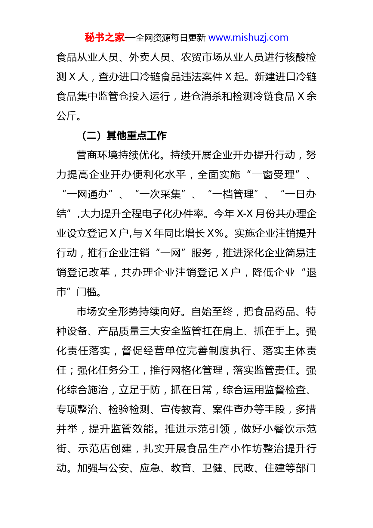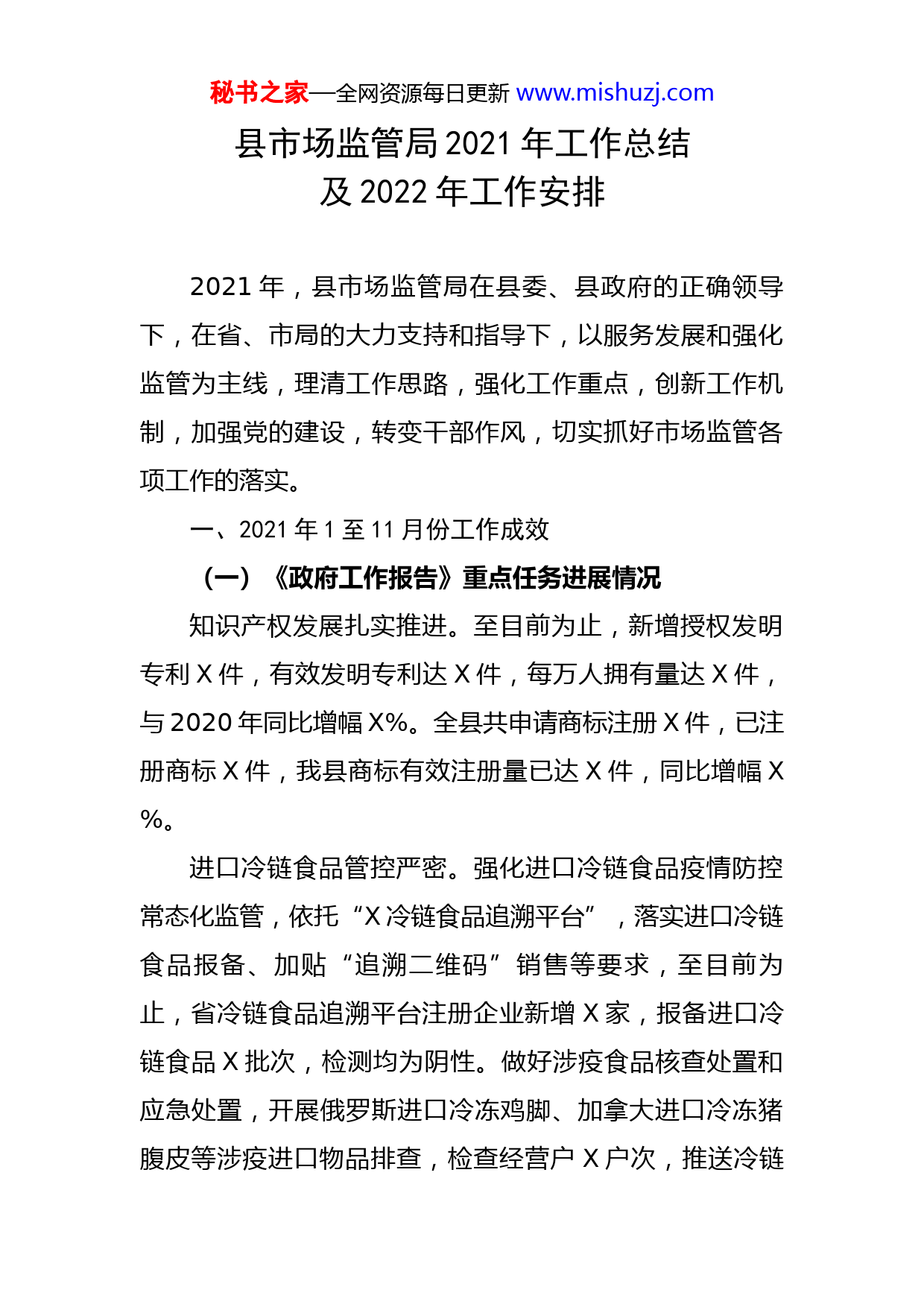 秘书之家—全网资源每日更新www.mishuzj.com县市场监管局2021年工作总结及2022年工作安排2021年,县市场监管局在县委、县政府的正确领导下,在省、市局的大力支持和指导下,以服务发展和强化监管为主线,理清工作思路,强化工作重点,创新工作机制,加强党的建设,转变干部作风,切实抓好市场监管各项工作的落实。一、2021年1至11月份工作成效(一)《政府工作报告》重点任务进展情况知识产权发展扎实推进。至目前为止,新增授权发明专利X件,有效发明专利达X件,每万人拥有量达X件,与2020年同比增幅X%。全县共申请商标注册X件,已注册商标X件,我县商标有效注册量已达X件,同比增幅X%。进口冷链食品管控严密。强化进口冷链食品疫情防控常态化监管,依托“X冷链食品追溯平台”,落实进口冷链食品报备、加贴“追溯二维码”销售等要求,至目前为止,省冷链食品追溯平台注册企业新增X家,报备进口冷链食品X批次,检测均为阴性。做好涉疫食品核查处置和应急处置,开展俄罗斯进口冷冻鸡脚、加拿大进口冷冻猪腹皮等涉疫进口物品排查,检查经营户X户次,推送冷链秘书之家—全网资源每日更新www.mishuzj.com食品从业人员、外卖人员、农贸市场从业人员进行核酸检测X人,查办进口冷链食品违法案件X起。新建进口冷链食品集中监管仓投入运行,进仓消杀和检测冷链食品X余公斤。(二)其他重点工作营商环境持续优化。持续开展企业开办提升行动,努力提高企业开办便利化水平,全面实施“一窗受理”、“一网通办”、“一次采集”、“一档管理”、“一日办结”,大力提升全程电子化办件率。今年X-X月份共办理企业设立登记X户,与X年同比增长X%。实施企业注销提升行动,推行企业注销“一网”服务,推进深化企业简易注销登记改革,共办理企业注销登记X户,降低企业“退市”门槛。市场安全形势持续向好。自始至终,把食品药品、特种设备、产品质量三大安全监管扛在肩上、抓在手上。强化责任落实,督促经营单位完善制度执行、落实主体责任;强化任务分工,推行网格化管理,落实监管责任。强化综合施治,立足于防,抓在日常,综合运用监督检查、专项整治、检验检测、宣传教育、案件查办等手段,多措并举,提升监管效能。推进示范引领,做好小餐饮示范街、示范店创建,扎实开展食品生产小作坊整治提升行动。加强与公安、应急、教育、卫健、民政、住建等部门秘书之家—全网资源每日更新www.mishuzj.com的协调联动,畅通投诉举报,推进社会参与、共治共享,筑牢安全底线。查办行政处罚案件X余起,到位罚没款X余万元。强化“三考”、“两会”期间安全保障,全力以赴做好“七一”期间安全隐患排查治理,为庆祝建党X周年营造良好氛围。质量强县战略持续推进。第二届县政府质量奖顺利评定,永驰婴童、福宁米业等X家企业分别获奖。动员推荐芊芊纸业、永驰婴童参加省市场监管局企业质量管理体系认证活动,助推企业质量管理提升。结合环保督查反馈意见整改,开展环境类检验检测机构检查,开展塑料购物袋和农用地膜、混凝土产品质量抽检活动。强力推进实施非法经营成品油行为整治专项行动,抽样监测成品油X组、车用尿素X组、液化石油气X组,查办不合格案件X起。开展打击长江刀鲚非法捕捞销售专项整治行动,积极营造长江流域(X河干流)渔获物禁捕、禁售、禁食的良好氛围。配合做好国家食品安全城市创建工作。党的建设工作坚强有力。以习近平新时代中国特色社会主义思想为指导,团结带领全系统广大干部职工围绕中心、服务大局,坚定不移推进全面从严治党和反腐败斗争。强化学习教育。认真学习习近平总书记重要讲话和关于市场监管工作指示批示精神以及中央、省、市、县重要会议精神和工作部署,切实贯彻落到实处,严格落实意识秘书之家—全网资源每日更新www.mishuzj.com形态工作责任制。开展新一轮深化“三个以案”警示教育,深入学习研讨,突出“四看四促”,持之以恒深化全局作风建设。抓好党史学习教育,开展党史专题集中学习研讨X次,邀请县委党校讲师给全系统党员职工作党史专题辅导X次;把“我为群众办实事”摆在突出位置,开展“周六大走访”活动,走访群众X户、企业X户,为群众办实事X件。抓实巡视巡察整改。切实提高政治站位,抓好中央巡视我省反馈意见整改和“大起底、改到位、建机制”专项行动工作。深入推进全面从严治党。坚持以加强全面从严治党为引领,班子成员以身作则,带头规范从政行为,带头执行廉洁自律各项规定,坚守作风纪律底线,抓实抓严、落细落小,防微杜渐,警钟长鸣。坚持在“实”字上下功夫,聚焦市场监管主责主业,坚持问题导向、目标导向,补短板、强弱项,奋力争先进位,以扎实履职尽责推动作风建设大转变和部门形象大提升。二、存在问题一是工作任务完成进度还不够快。我县发明专利申请数量较少,发明专利授权数量增长较慢,发明专利在全市综合排名处于中下水平。X-2021年度鼓励发明创造和运用的奖励政策尚未出台,企业对发明专利的申请积极性不高,甚至有些高价值专利因企业未缴纳年费而失效。二是工作推进质量还不够高。食品药品安全责任意识秘书之家—全网资源每日更新www.mishuzj.com仍需进一步增强,工作标杆还需拔高,食品生产小作坊整治提升效果不突出。部分口罩等防护产品生产企业的生