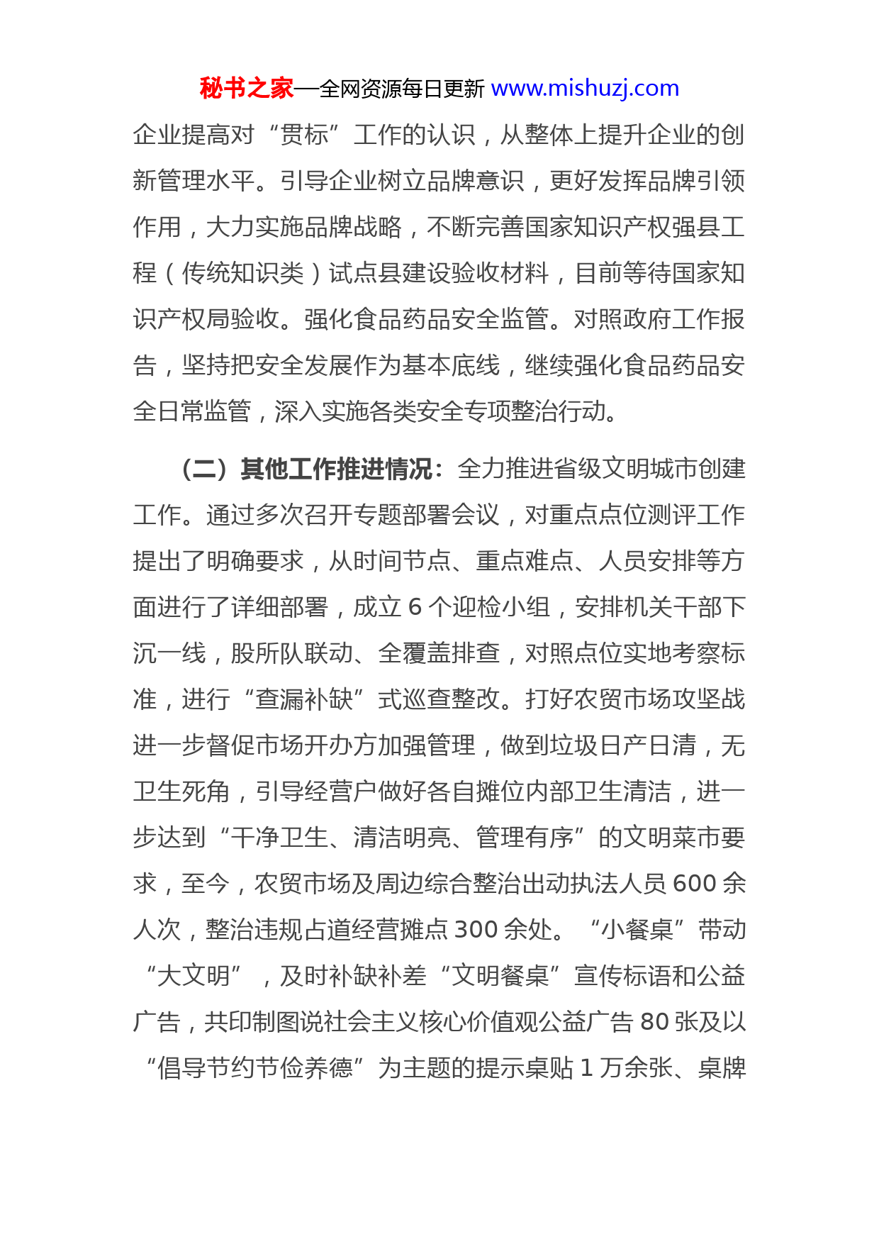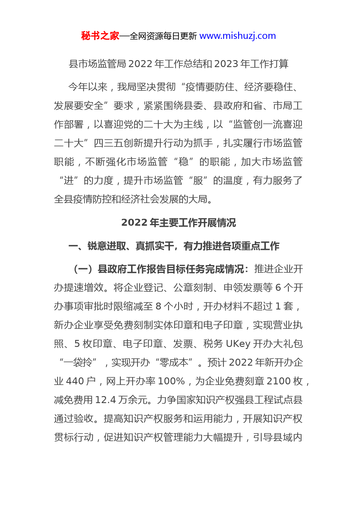 秘书之家—全网资源每日更新www.mishuzj.com县市场监管局2022年工作总结和2023年工作打算今年以来,我局坚决贯彻“疫情要防住、经济要稳住、发展要安全”要求,紧紧围绕县委、县政府和省、市局工作部署,以喜迎党的二十大为主线,以“监管创一流喜迎二十大”四三五创新提升行动为抓手,扎实履行市场监管职能,不断强化市场监管“稳”的职能,加大市场监管“进”的力度,提升市场监管“服”的温度,有力服务了全县疫情防控和经济社会发展的大局。2022年主要工作开展情况一、锐意进取、真抓实干,有力推进各项重点工作(一)县政府工作报告目标任务完成情况:推进企业开办提速增效。将企业登记、公章刻制、申领发票等6个开办事项审批时限缩减至8个小时,开办材料不超过1套,新办企业享受免费刻制实体印章和电子印章,实现营业执照、5枚印章、电子印章、发票、税务UKey开办大礼包“一袋拎”,实现开办“零成本”。预计2022年新开办企业440户,网上开办率100%,为企业免费刻章2100枚,减免费用12.4万余元。力争国家知识产权强县工程试点县通过验收。提高知识产权服务和运用能力,开展知识产权贯标行动,促进知识产权管理能力大幅提升,引导县域内秘书之家—全网资源每日更新www.mishuzj.com企业提高对“贯标”工作的认识,从整体上提升企业的创新管理水平。引导企业树立品牌意识,更好发挥品牌引领作用,大力实施品牌战略,不断完善国家知识产权强县工程(传统知识类)试点县建设验收材料,目前等待国家知识产权局验收。强化食品药品安全监管。对照政府工作报告,坚持把安全发展作为基本底线,继续强化食品药品安全日常监管,深入实施各类安全专项整治行动。(二)其他工作推进情况:全力推进省级文明城市创建工作。通过多次召开专题部署会议,对重点点位测评工作提出了明确要求,从时间节点、重点难点、人员安排等方面进行了详细部署,成立6个迎检小组,安排机关干部下沉一线,股所队联动、全覆盖排查,对照点位实地考察标准,进行“查漏补缺”式巡查整改。打好农贸市场攻坚战进一步督促市场开办方加强管理,做到垃圾日产日清,无卫生死角,引导经营户做好各自摊位内部卫生清洁,进一步达到“干净卫生、清洁明亮、管理有序”的文明菜市要求,至今,农贸市场及周边综合整治出动执法人员600余人次,整治违规占道经营摊点300余处。“小餐桌”带动“大文明”,及时补缺补差“文明餐桌”宣传标语和公益广告,共印制图说社会主义核心价值观公益广告80张及以“倡导节约节俭养德”为主题的提示桌贴1万余张、桌牌秘书之家—全网资源每日更新www.mishuzj.com400余个、包厢文明健康有你有我公益广告1000余张。推深做实“联点共建”工作,坚持每周常态化开展入户走访宣传活动,通过发放模拟测评调查问卷,宣扬“十大暖民心行动”,时时征求群众对创城工作的看法和建议,赢得居民的理解和支持。至今,共开展集中入户走访活动20余次,发放宣传材料6000余份。有效衔接脱贫攻坚和乡村振兴工作。严格落实“双包”工作责任制,履行“单位包村”工作职责,持续宣传国家、省市县巩固拓展脱贫攻坚成果同乡村振兴有效衔接工作目标、任务、措施等,掌握联系村的产业项目发展情况,协调解决村集体经济发展中遇到的难题。按照部署给予帮扶经费3万元,积极谋划并建成了“县冷链食品监管仓库”,项目建成后,可增加村集体经济纯收入3.6万元。扎实开展招商引资工作。切实履行好“双招双引”一组牵头职责,与我组成员共同做好项目招引及落地服务工作。目前,我组在谈项目31个,通过预审会项目7个,总投资16.47亿元;通过评审会项目2个,总投资13.86亿元;县公安局的百姓缘购物广场项目,县市场监管局德惠到家超市项目,华阳镇的年产5000吨链传动产品及60万套胀套、锥套、毂项目永波商贸综合体项目,交运局年产390万套光电设备项目已投产运营;领导外出招商及推进项目共计46次。秘书之家—全网资源每日更新www.mishuzj.com二、抓细抓实、稳步提质,全力助推经济社会发展(一)全力服务防控大局,为市场主体发展提供坚实基础。守好“责任田”。进一步从严重点场所常态化防控,落实重点场所双码核验,提高重点场所行业管控质效,做好检疫查验,严防疫情输入。进一步加强农贸市场、冷链和零售药店等重点领域监管,加强对冷链食品经营人员的监管,开展进口冷链食品闭环管理专项检查;进一步加强药械零售环节管控,不断加强口罩、防护服、核酸抗原检测试剂等产品的质量监管和保障,督促辖区药店严格落实疫情防控各项措施和“一退两抗”等药品购买登记上传工作,继续发挥“药店哨点”作用,今年累计报告购买“一退两抗止咳”等药品109525人次。念好“服务经”。深入践行省委“一改两为五做到”要求,出台《县市场监管局关于进一步创优营商环境发展壮大市场主体的若干举措》,聚焦各类市场主体全生命周期的痛点、难点和堵点,开展“一业一证一码”改革试点、扶持个体工商户发展、知识产权保护“一件事”集成服务改革等措施。当好“解题人”。针对企业在疫情防控形势下的发展困难,深入落实国务院和省政府稳经济一揽子政策和接续措施,开展“四送一服”“新春访百企,助力解难题”等活动,深入企业秘书之家—全网资源每日更新www.mishuzj.com走访摸