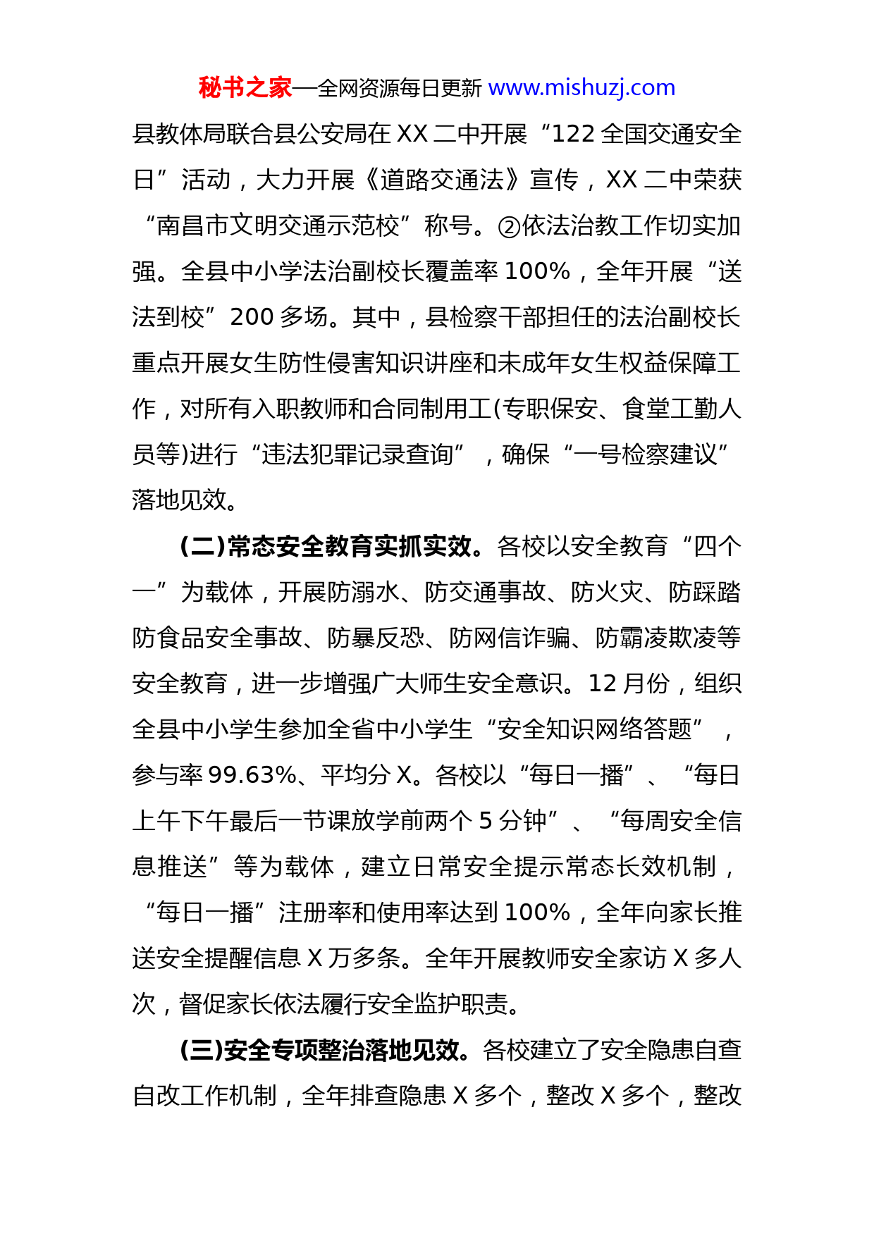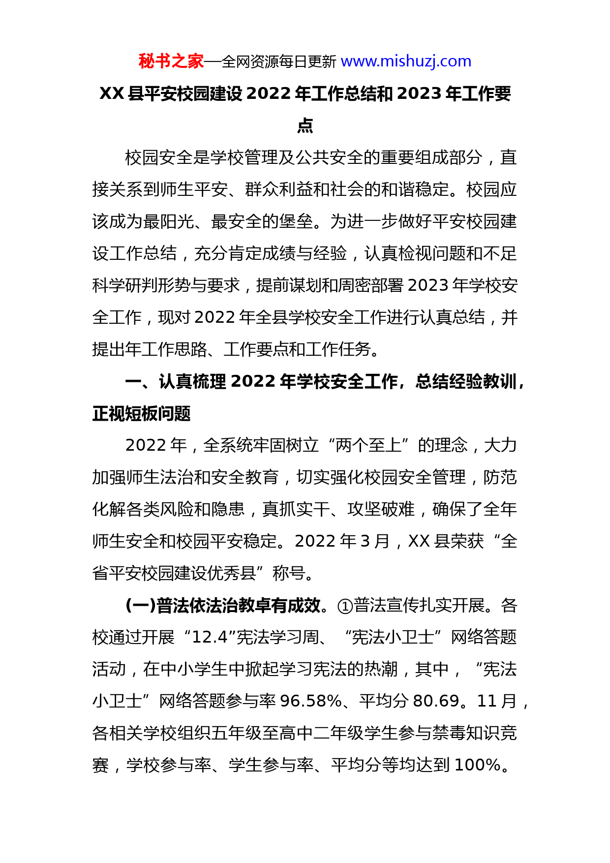 秘书之家—全网资源每日更新www.mishuzj.comXX县平安校园建设2022年工作总结和2023年工作要点校园安全是学校管理及公共安全的重要组成部分,直接关系到师生平安、群众利益和社会的和谐稳定。校园应该成为最阳光、最安全的堡垒。为进一步做好平安校园建设工作总结,充分肯定成绩与经验,认真检视问题和不足科学研判形势与要求,提前谋划和周密部署2023年学校安全工作,现对2022年全县学校安全工作进行认真总结,并提出年工作思路、工作要点和工作任务。一、认真梳理2022年学校安全工作,总结经验教训,正视短板问题2022年,全系统牢固树立“两个至上”的理念,大力加强师生法治和安全教育,切实强化校园安全管理,防范化解各类风险和隐患,真抓实干、攻坚破难,确保了全年师生安全和校园平安稳定。2022年3月,XX县荣获“全省平安校园建设优秀县”称号。(一)普法依法治教卓有成效。①普法宣传扎实开展。各校通过开展“12.4”宪法学习周、“宪法小卫士”网络答题活动,在中小学生中掀起学习宪法的热潮,其中,“宪法小卫士”网络答题参与率96.58%、平均分80.69。11月,各相关学校组织五年级至高中二年级学生参与禁毒知识竞赛,学校参与率、学生参与率、平均分等均达到100%。秘书之家—全网资源每日更新www.mishuzj.com县教体局联合县公安局在XX二中开展“122全国交通安全日”活动,大力开展《道路交通法》宣传,XX二中荣获“南昌市文明交通示范校”称号。②依法治教工作切实加强。全县中小学法治副校长覆盖率100%,全年开展“送法到校”200多场。其中,县检察干部担任的法治副校长重点开展女生防性侵害知识讲座和未成年女生权益保障工作,对所有入职教师和合同制用工(专职保安、食堂工勤人员等)进行“违法犯罪记录查询”,确保“一号检察建议”落地见效。(二)常态安全教育实抓实效。各校以安全教育“四个一”为载体,开展防溺水、防交通事故、防火灾、防踩踏防食品安全事故、防暴反恐、防网信诈骗、防霸凌欺凌等安全教育,进一步增强广大师生安全意识。12月份,组织全县中小学生参加全省中小学生“安全知识网络答题”,参与率99.63%、平均分X。各校以“每日一播”、“每日上午下午最后一节课放学前两个5分钟”、“每周安全信息推送”等为载体,建立日常安全提示常态长效机制,“每日一播”注册率和使用率达到100%,全年向家长推送安全提醒信息X万多条。全年开展教师安全家访X多人次,督促家长依法履行安全监护职责。(三)安全专项整治落地见效。各校建立了安全隐患自查自改工作机制,全年排查隐患X多个,整改X多个,整改秘书之家—全网资源每日更新www.mishuzj.com率X%。重点开展三项安全专项整治:①扎实开展防溺水专项整治。一是大力加强防溺水专题教育和宣传。各校大力实施防溺水“三警一包”措施,严格落实2022年XX县中小学校预防学生溺水专项行动任务清单X条。各校以每周安全课、主题班会、师生集会、倡议签名、LED滚动播出等为载体,开展专题宣讲、案例通报、突发灾害预警发布等形式多样的防溺水专题教育,并通过蹲点股室日常督查责任督学重点督查,以及五月份、九月份、暑期专项督查等措施开展防溺水工作跟踪问效。二是切实强化防溺水联防联控措施。属地政府和相关职能部门严格落实《2022年全县防溺水责任任务清单》(安校专委【2022】2号),XXXX管理处等乡镇(处),通过召开专题部署会议、开展巡查巡防、组织志愿者集中宣讲、完善危险水域防护设施等措施,以进一步加强学生防溺水工作。县公安派出所安排警力对危险水域进行巡查,劝阻违规下水游泳的人员尤其是未成年人。XX镇文峰社区组织蓝鹰救援队,开展水上应急救援工作;在潦河县城段投放救生圈X个、安插警示牌X多块,进一步完善了相关危险水域的安全防范设施。②扎实开展消防安全专项治理。一方面,各校大力加强防火灭火安全教育,进一步增强师生“见火不慌、抬手就打”安全意识;通过日常例会、集中培训、“119消防宣传日”等形式强化消防安全培训,进一步增强师生防火灭火能力秘书之家—全网资源每日更新www.mishuzj.com同时,扎实开展校园用火、用电、用气、用油安全检查,整治火灾隐患X多个。另一方面,各校加强消防应急管理,按照要求配备灭火器、消火栓等消防应急设施,改造用电线路X千多米,并严格落实每学期至少开展一次消防应急疏散演练活动。③扎实开展危化品安全专项整治。为深刻吸取近期发生的重大危化品爆燃事故和校园实验室危化品事故教训,各校建立健全管理制度,经常开展危化品安全检查,严格领用借用手续,切实规范实验操作,确保了危化品存放和使用安全。(四)部门联防联动建立长效。县教体局履行县委平安建设领导小组校园及周边治安综合治理专项组和县安委会校园安全专委会牵头职责,建立了校园及周边安全联防联动齐抓共管的长效工作机制。县公安局百分之百设置“护学岗”,严格落实“护校安园”行动和“高峰勤务”工作。县城管局安排人员在城区校门口及周边实行定人、定党务精品QQ群824703735为党务工作者提供大量资料,每天更新50多篇,请加QQ:962665491进行咨询!点、定岗管控,加大校园周边违规乱象的整治力度。尤其是交通安全专项治理工作成效明显,一方面,县教体局投入专项资金X多万元,用于解决校门口