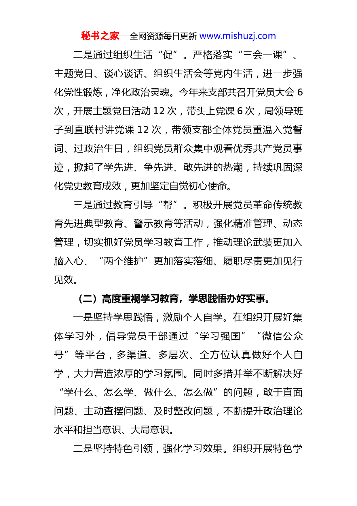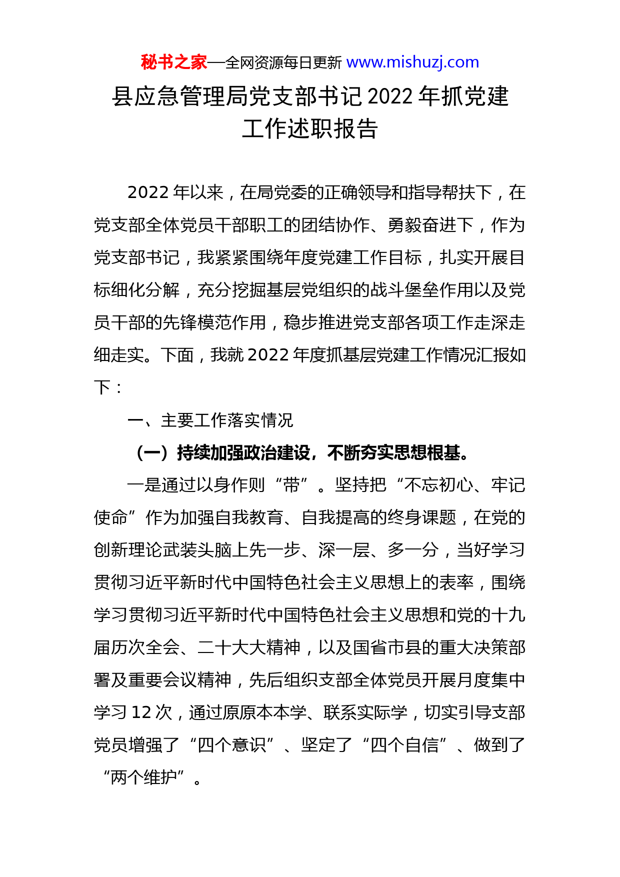 秘书之家—全网资源每日更新www.mishuzj.com县应急管理局党支部书记2022年抓党建工作述职报告2022年以来,在局党委的正确领导和指导帮扶下,在党支部全体党员干部职工的团结协作、勇毅奋进下,作为党支部书记,我紧紧围绕年度党建工作目标,扎实开展目标细化分解,充分挖掘基层党组织的战斗堡垒作用以及党员干部的先锋模范作用,稳步推进党支部各项工作走深走细走实。下面,我就2022年度抓基层党建工作情况汇报如下:一、主要工作落实情况(一)持续加强政治建设,不断夯实思想根基。一是通过以身作则“带”。坚持把“不忘初心、牢记使命”作为加强自我教育、自我提高的终身课题,在党的创新理论武装头脑上先一步、深一层、多一分,当好学习贯彻习近平新时代中国特色社会主义思想上的表率,围绕学习贯彻习近平新时代中国特色社会主义思想和党的十九届历次全会、二十大大精神,以及国省市县的重大决策部署及重要会议精神,先后组织支部全体党员开展月度集中学习12次,通过原原本本学、联系实际学,切实引导支部党员增强了“四个意识”、坚定了“四个自信”、做到了“两个维护”。秘书之家—全网资源每日更新www.mishuzj.com二是通过组织生活“促”。严格落实“三会一课”、主题党日、谈心谈话、组织生活会等党内生活,进一步强化党性锻炼,净化政治灵魂。今年来支部共召开党员大会6次,开展主题党日活动12次,带头上党课6次,局领导班子到直联村讲党课12次,带领支部全体党员重温入党誓词、过政治生日,组织党员群众集中观看优秀共产党员事迹,掀起了学先进、争先进、敢先进的热潮,持续巩固深化党史教育成效,更加坚定自觉初心使命。三是通过教育引导“帮”。积极开展党员革命传统教育先进典型教育、警示教育等活动,强化精准管理、动态管理,切实抓好党员学习教育工作,推动理论武装更加入脑入心、“两个维护”更加落实落细、履职尽责更加见行见效。(二)高度重视学习教育,学思践悟办好实事。一是坚持学思践悟,激励个人自学。在组织开展好集体学习外,倡导党员干部通过“学习强国”“微信公众号”等平台,多渠道、多层次、全方位认真做好个人自学,大力营造浓厚的学习氛围。同时多措并举不断解决好“学什么、怎么学、做什么、怎么做”的问题,敢于直面问题、主动查摆问题、及时整改问题,不断提升政治理论水平和担当意识、大局意识。二是坚持特色引领,强化学习效果。组织开展特色学秘书之家—全网资源每日更新www.mishuzj.com习活动,深刻感悟革命精神、接受红色教育、锤炼党性修养。同时积极对接公司领导到党建联系点讲述了专题党课,进一步学习领会贯彻习近平总书记“七一”重要讲话精神,在党的十九届七中全会召开后,持续抓好迎接和庆祝党的二十大宣传活动,第一时间召开党员大会集中学习习近平总书记重要讲话、《党的二十大报告》等文件精神,推动全会精神落地生根,形成指导工作实践的持久动力,促进年度目标实现的强大合力。(三)强化党员管理,增强党员队伍生机活力一是抓好发展党员工作。局党支部认真按照《中国共产党发展党员工作细则》、发展党员指导手册和发展党员规范手册有关要求,严格落实党员发展、转正标准和程序,按照年初发展党员的工作计划,今年已有2名同志转为正式党员,1名转为预备党员,8同志确立为发展对象。我局将严格按照发展党员程序开展发展党员的相关工作。二是扎实开展党费收缴工作。局党支部由专人具体负责党费收缴工作,并严格履行收缴党费手续,做到党费帐簿规范合理,做到党员交纳党费有登记,党支部上缴党费有收据,目前已按月足额收缴。(四)加强作风建设,继承弘扬党内新风正气一是持续改进工作作风。继承和发扬党的优良传统和作风,自觉践行党的群众路线,严格落实中央八项规定及秘书之家—全网资源每日更新www.mishuzj.com实施细则精神,驰而不息地纠正“四风”问题,特别是形式主义、官僚主义问题。严格落实主体责任,切实把党风廉政建设的主体责任扛在肩上、抓在手上。二是全力推进岗位权力廉政风险防控工作。结合工作实际为深入推进党风廉政建设和反腐败斗争,坚持不懈把全面从严治党向纵深推进,一体推进不敢腐、不能腐、不想腐,积极拓展从源头上预防腐败的领域,提高岗位权力廉政风险防控能力,有效防止公权力异化、变质、滥用,确保公权力在正确轨道上运行。三是注重教育防控。坚持集中教育、专题教育与日常教育相结合,通过观看警示教育片,教育党员干部自觉在思想上划出红线、行为上明确界限、道德上坚守底线,引导党员干部知敬畏、存戒惧、守底线,本年开展警示教育3次。(五)常态化开展扫黑除恶斗争。一是领导不放松。根据年初工作安排,我处始终将扫黑除恶放在突出位置,作为一项重要常规工作抓落实,始终坚持思想上不松懈,工作上不放松,一如既往抓好各项工作落实,确保专项斗争有序开展。二是宣传不放松。充分发动群众和干部职工积极参与到扫黑除恶工作中来,全面宣传上级扫黑除恶专项斗争有关会议、成果等;在办公区域更新了扫黑除恶公告,新制秘书之家—全网资源每日更新www.mishuzj.com作扫黑除恶横幅3条;利用微信工作群,适时推送扫黑除恶有关精神指示和相关知识。三是摸排不放松。各股室根据年度监