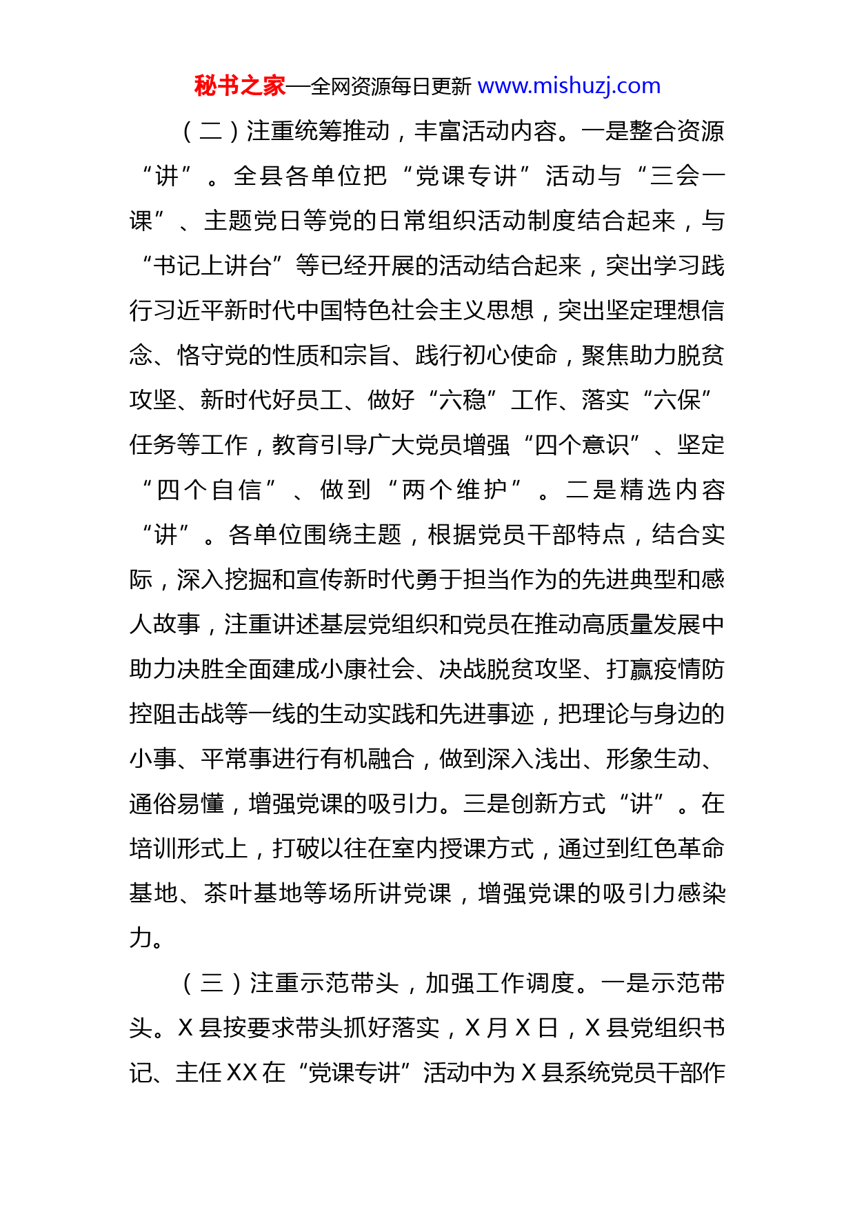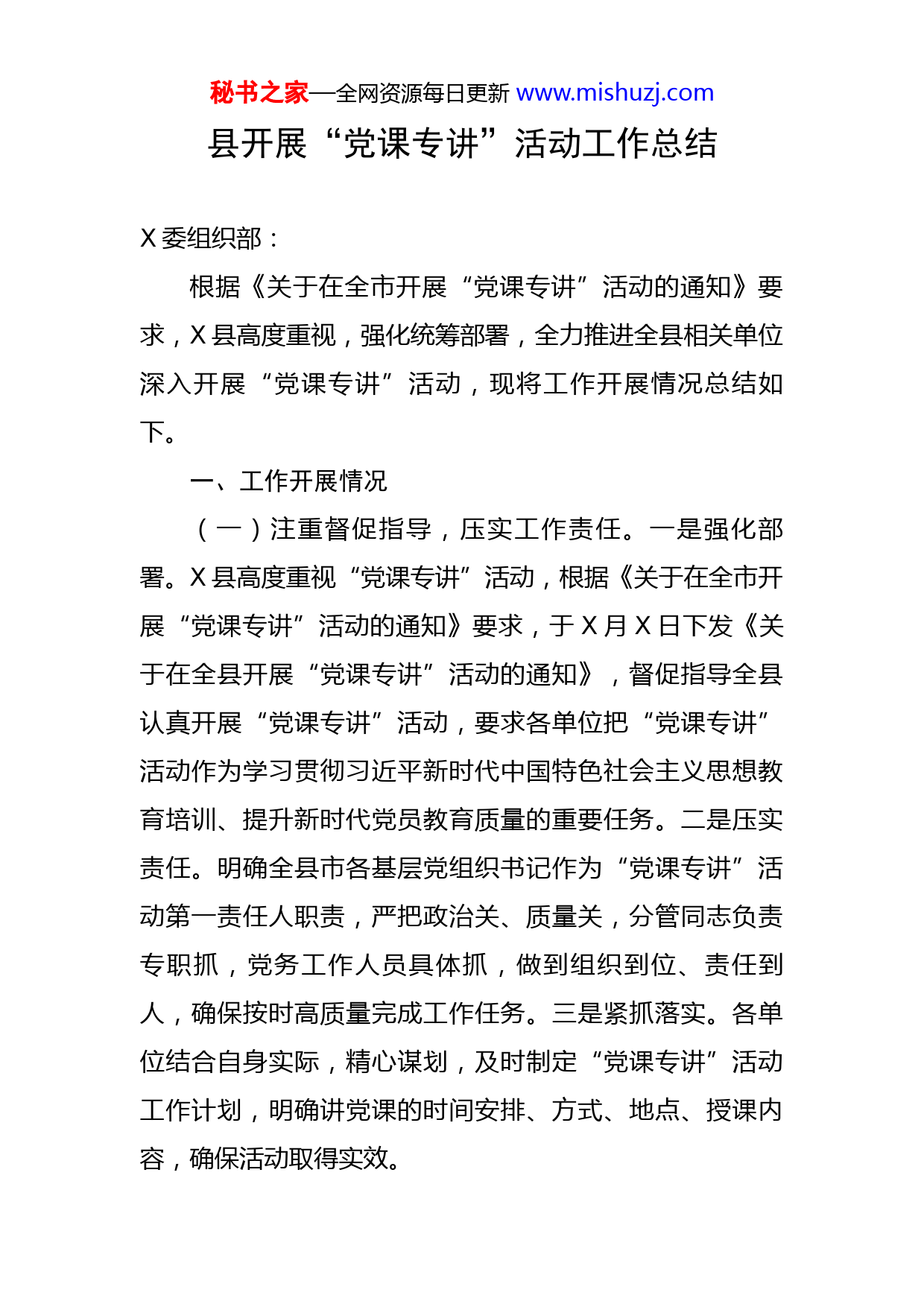 秘书之家—全网资源每日更新www.mishuzj.com县开展“党课专讲”活动工作总结X委组织部:根据《关于在全市开展“党课专讲”活动的通知》要求,X县高度重视,强化统筹部署,全力推进全县相关单位深入开展“党课专讲”活动,现将工作开展情况总结如下。一、工作开展情况(一)注重督促指导,压实工作责任。一是强化部署。X县高度重视“党课专讲”活动,根据《关于在全市开展“党课专讲”活动的通知》要求,于X月X日下发《关于在全县开展“党课专讲”活动的通知》,督促指导全县认真开展“党课专讲”活动,要求各单位把“党课专讲”活动作为学习贯彻习近平新时代中国特色社会主义思想教育培训、提升新时代党员教育质量的重要任务。二是压实责任。明确全县市各基层党组织书记作为“党课专讲”活动第一责任人职责,严把政治关、质量关,分管同志负责专职抓,党务工作人员具体抓,做到组织到位、责任到人,确保按时高质量完成工作任务。三是紧抓落实。各单位结合自身实际,精心谋划,及时制定“党课专讲”活动工作计划,明确讲党课的时间安排、方式、地点、授课内容,确保活动取得实效。秘书之家—全网资源每日更新www.mishuzj.com(二)注重统筹推动,丰富活动内容。一是整合资源“讲”。全县各单位把“党课专讲”活动与“三会一课”、主题党日等党的日常组织活动制度结合起来,与“书记上讲台”等已经开展的活动结合起来,突出学习践行习近平新时代中国特色社会主义思想,突出坚定理想信念、恪守党的性质和宗旨、践行初心使命,聚焦助力脱贫攻坚、新时代好员工、做好“六稳”工作、落实“六保”任务等工作,教育引导广大党员增强“四个意识”、坚定“四个自信”、做到“两个维护”。二是精选内容“讲”。各单位围绕主题,根据党员干部特点,结合实际,深入挖掘和宣传新时代勇于担当作为的先进典型和感人故事,注重讲述基层党组织和党员在推动高质量发展中助力决胜全面建成小康社会、决战脱贫攻坚、打赢疫情防控阻击战等一线的生动实践和先进事迹,把理论与身边的小事、平常事进行有机融合,做到深入浅出、形象生动、通俗易懂,增强党课的吸引力。三是创新方式“讲”。在培训形式上,打破以往在室内授课方式,通过到红色革命基地、茶叶基地等场所讲党课,增强党课的吸引力感染力。(三)注重示范带头,加强工作调度。一是示范带头。X县按要求带头抓好落实,X月X日,X县党组织书记、主任XX在“党课专讲”活动中为X县系统党员干部作秘书之家—全网资源每日更新www.mishuzj.com专题辅导报告;X月X日,X县机关党支部书记XX以“聚焦问题精准发力,推进党建工作提质增效”主题,为X县系统党员干部讲党课。二是强化调度。X县结合“书记宣讲”活动,分别在X月、X月、X月下发工作提示,督促指导全县按时间进度开展好“党课专讲”活动。截止目前,全县累计讲党课人数XX人,各级党委(党组)书记讲党课XX人,各级党委(党组)班子成员讲党课XX人,党总支(党支部)书记讲党课XX人,先进典型模范人物讲党课XX人,累计讲党课XX次,覆盖党员XX人,拍摄党课视频XX部。二、存在问题及下步打算全县组织开展“党课专讲”虽取得一定成效,但还存在一些问题,如党课课件录制技术缺乏,上报视频质量不高;部分单位开展活动形式单一,深挖不够;典型经验总结不够等问题。下步,X县认真贯彻落实《中国共产党支部工作条例(试行)》《中国共产党党员教育管理工作条例》《2019—2023年全国党员教育培训工作规划》,针对在开展“党课专讲”活动中存在的问题,加大统筹指导力度,建立健全各级党组织讲党课的制度体系,推动党内经常性教育取得更多实质性成果。
