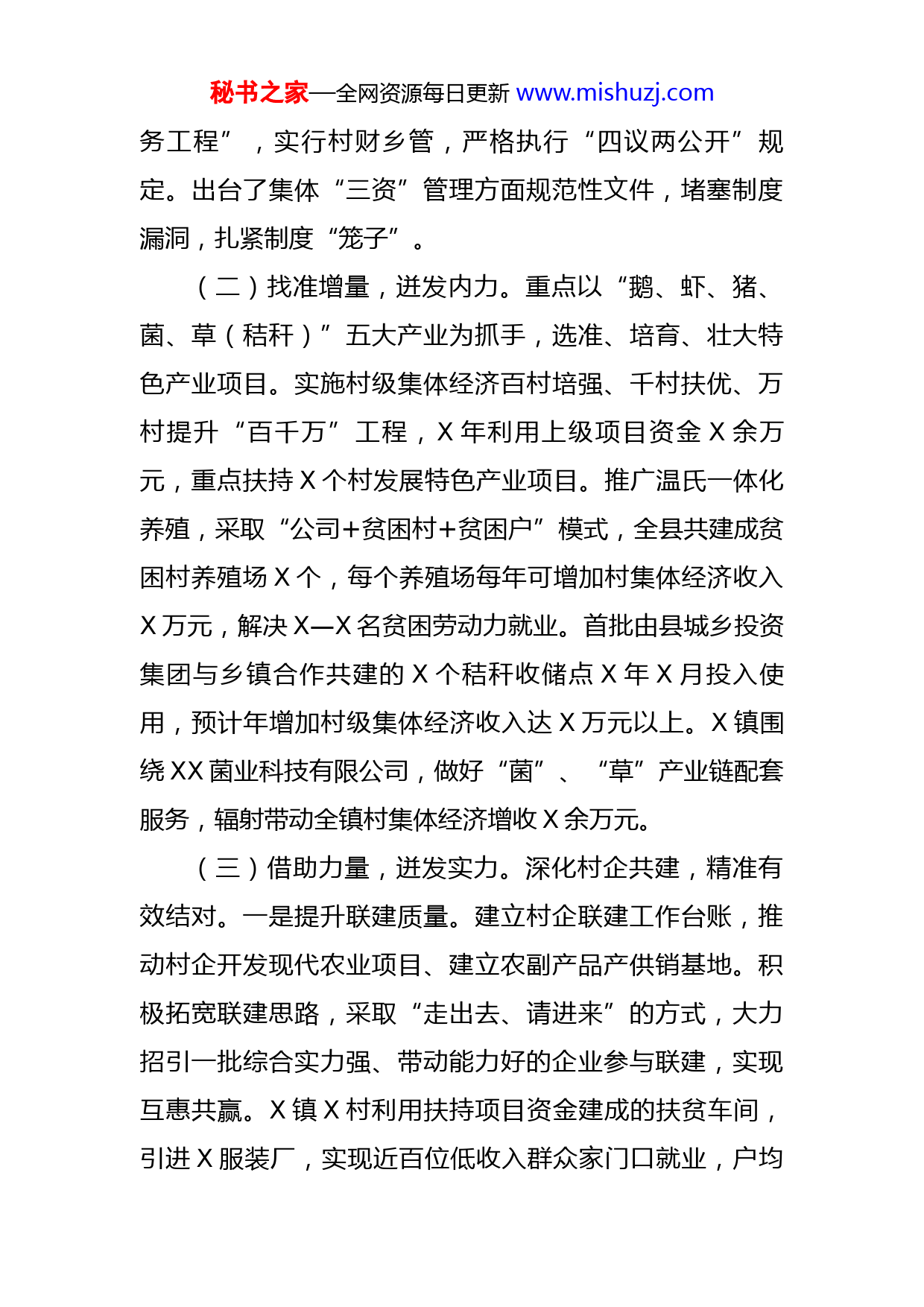 秘书之家—全网资源每日更新www.mishuzj.com县扶持壮大村级集体经济情况汇报近年来,X县把扶持壮大村级集体经济作为提升农村基层党组织组织力的重要工作来抓,立足县情实际,加大政策扶持,积极探索乡村振兴、产业发展新路径,通过盘活存量、找准增量、借助力量、紧跟流量、壮大体量“五量迸发”模式,着力破解村级集体经济发展难题。结合“党建引领助振兴、村企联建促发展”三年行动计划,推深做实村企联建,取得了较好成效。X年全县村级集体经济经营性收入达X万元以上的村X个,占X%;X万元以上的村为X个,占X%,较X年实现“零”的突破。X年X月,全省村级集体经济X片观摩现场会在我县召开。一、主要做法(一)盘活存量,迸发潜力。全面开展农村集体“三资”清理,建立台账,核实存量,掌握经营状况,确保农村集体“三资”真实准确,通过清产核资,摸清家底。通过农村产权交易平台,对闲置房产、机械设备及“四荒”等资产资源,采取承包租赁、有偿转让、公开拍卖、入股联营等方式开发利用,增加村级集体经济收入X余万元。X镇东风村结合扫黑除恶专项斗争,依法收回长期被无偿侵占的集体水面资源X亩,通过公开招标租赁,年增加村集体收益X元,实现了资产资源的保值增值。推行“阳光村秘书之家—全网资源每日更新www.mishuzj.com务工程”,实行村财乡管,严格执行“四议两公开”规定。出台了集体“三资”管理方面规范性文件,堵塞制度漏洞,扎紧制度“笼子”。(二)找准增量,迸发内力。重点以“鹅、虾、猪、菌、草(秸秆)”五大产业为抓手,选准、培育、壮大特色产业项目。实施村级集体经济百村培强、千村扶优、万村提升“百千万”工程,X年利用上级项目资金X余万元,重点扶持X个村发展特色产业项目。推广温氏一体化养殖,采取“公司+贫困村+贫困户”模式,全县共建成贫困村养殖场X个,每个养殖场每年可增加村集体经济收入X万元,解决X—X名贫困劳动力就业。首批由县城乡投资集团与乡镇合作共建的X个秸秆收储点X年X月投入使用,预计年增加村级集体经济收入达X万元以上。X镇围绕XX菌业科技有限公司,做好“菌”、“草”产业链配套服务,辐射带动全镇村集体经济增收X余万元。(三)借助力量,迸发实力。深化村企共建,精准有效结对。一是提升联建质量。建立村企联建工作台账,推动村企开发现代农业项目、建立农副产品产供销基地。积极拓宽联建思路,采取“走出去、请进来”的方式,大力招引一批综合实力强、带动能力好的企业参与联建,实现互惠共赢。X镇X村利用扶持项目资金建成的扶贫车间,引进X服装厂,实现近百位低收入群众家门口就业,户均秘书之家—全网资源每日更新www.mishuzj.com增收约X万元,促进了村集体经济发展。二是创新联建形式。积极整合村企资金、人才、技术等要素资源,使各类资源发挥最大化作用。围绕“村企联建、村校联谋、村专联动”三联互通模式,主动对接X大学、X大学等高校院所合作平台,充分发挥X农业大学蔬菜、畜禽等九大产业技术联盟优势,在产业谋划、项目建设、品牌推广等方面共创共赢。三是细化联建举措。切实提高村企结对匹配度,找准产业发展方向,按照“一村一品”制定产业发展计划。X乡X村与本地企业合作共建无花果、桑葚种植及深加工项目,年可增加集体经济收入X万元以上。通过做好产业跟踪服务,壮大集体经济实力,推进各项公益事业,让村企联建成果惠及广大群众。(四)紧跟流量,迸发活力。持续优化企业发展环境,成立由县委、县政府主要负责同志为组长的五大主导产业发展领导小组,建立“一产业一专班”工作机制,全程帮办服务,制定完善产业发展扶持政策,实行“一企一策”。通过合作共建、配套服务等参与服务企业,增加集体经济收入。X镇率先成立了以X个贫困村集体资产入股的企业——X农兴农业发展有限公司参与X菌类秸秆收储、经营,以及建设双孢菇包装盒生产线和冷藏制冰厂X个配套车间,可为入股村年创收约X万元。在X镇重点打造特色龙虾小镇,投资X亿元建设占地X亩集冷链、物秘书之家—全网资源每日更新www.mishuzj.com流、仓储、加工于一体的小龙虾交易中心,建成年交易额X亿元的X区域核心交易市场。在全县谋划建设X个特色农产品交易市场,串联农产品生产、储存、流通和销售链条。(五)壮大体量,迸发动力。加大招商引资力度,X以来,已签约农业类或相关产业项目X个,合同总投资X亿元,其中投资X亿元X化工一期项目年加工秸秆X万吨,有力推动全县秸秆综合利用。注重培育相对独立的集体经济发展经营主体,承接产业项目建设、特色农产品销售、发展物业经济等经营业务,涌现出了X县农兴农业发展有限公司、X县前好形象保洁服务有限公司等一批经营实体,壮大了村级集体经济实力。鼓励村级股份经济合作社开展实体化运作,对闲置或低效利用的集体经营性资产,采取入股或租赁方式投入到新型经营主体,按照一定比例分红获利。X年,全县村级集体经济经营性收入达X万元,村均收益X万元以上。二、存在问题及建议1、认识程度不高,思路不清。少数村干部对如何发展农村集体经济存有模糊认识,对如何发展集体经济束手无策,“等、靠、要”思想突出。还有少数群众集体观念淡薄,对集体事务漠不关心,不管不问。2、村级集体经济发展潜力挖掘不充分。农村仍有大量秘书之家—