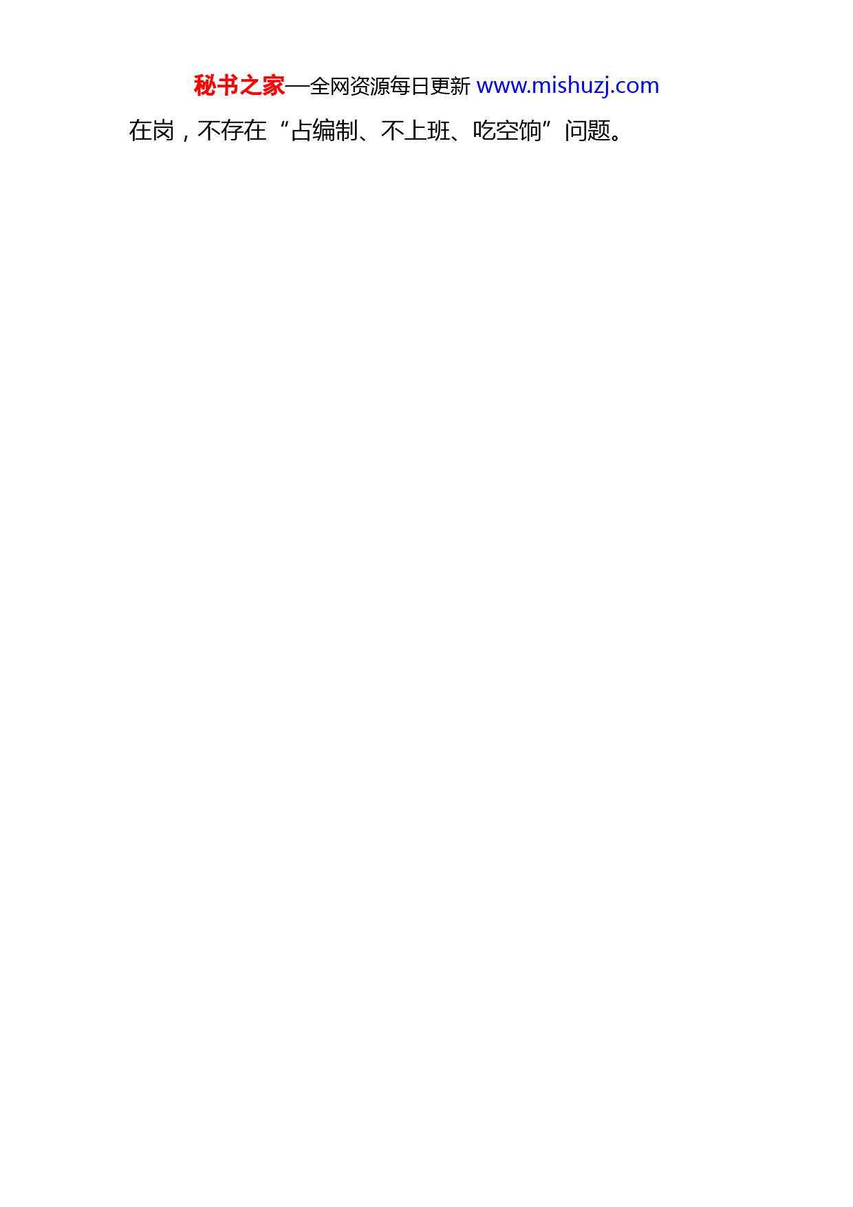秘书之家—全网资源每日更新www.mishuzj.com县政府办公室关于“吃空饷”治理落实情况的自查报告根据县机构编制委员会办公室、人力资源和社会保障局、财政局联合下发《关于印发<X县机关事业单位“吃空饷”问题治理落实工作实施方案>的通知》(西编办发【2016】13号)要求,我办对所有在编人员进行排查,现将有关情况报告如下:一、核定人员编制情况根据《关于印发X县人民政府办公室主要职责岗位和人员编制规定的通知》(西政办发【2015】26号)核定办公室行政编制29名(含政府领导7名),后勤事业编制11名。X县机构编制委员会下发《关于调整X县信息中心机构编制事项的通知》(西编发【2015】34号)核定信息中心全额预算事业编制13名。X县机构编制委员会《关于X县政务中心增加事业编制的通知》(西编发【2015】27号】)核定政务中心全额预算事业编制6名。二、现有在编人员情况我办实有在编职工45名,其中行政人员25名,空编4名;后勤事业人员9名,空编2名;信息中心人员7名,空编6名;政务中心人员4名,空编2名。在编人员全部秘书之家—全网资源每日更新www.mishuzj.com在岗,不存在“占编制、不上班、吃空饷”问题。