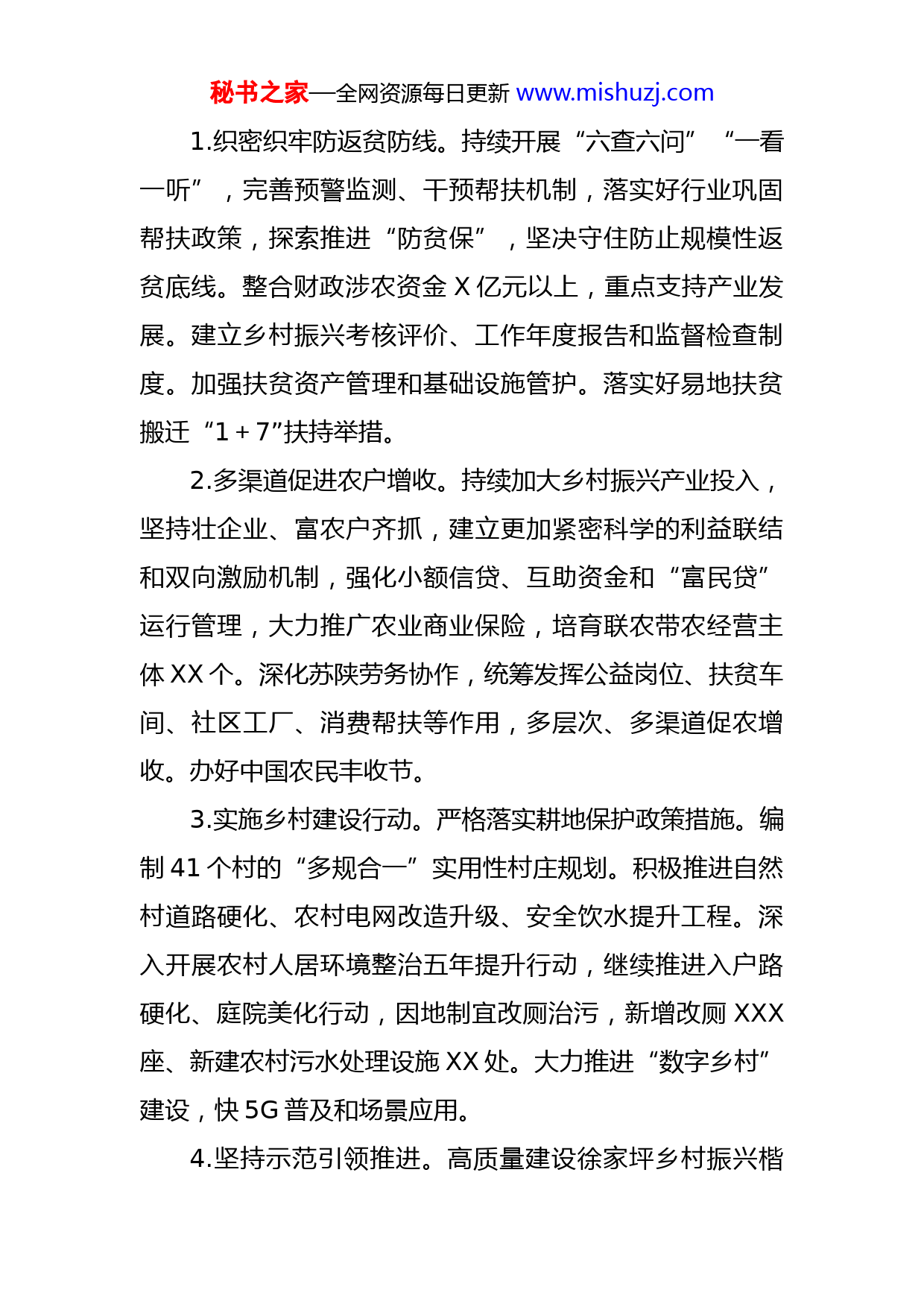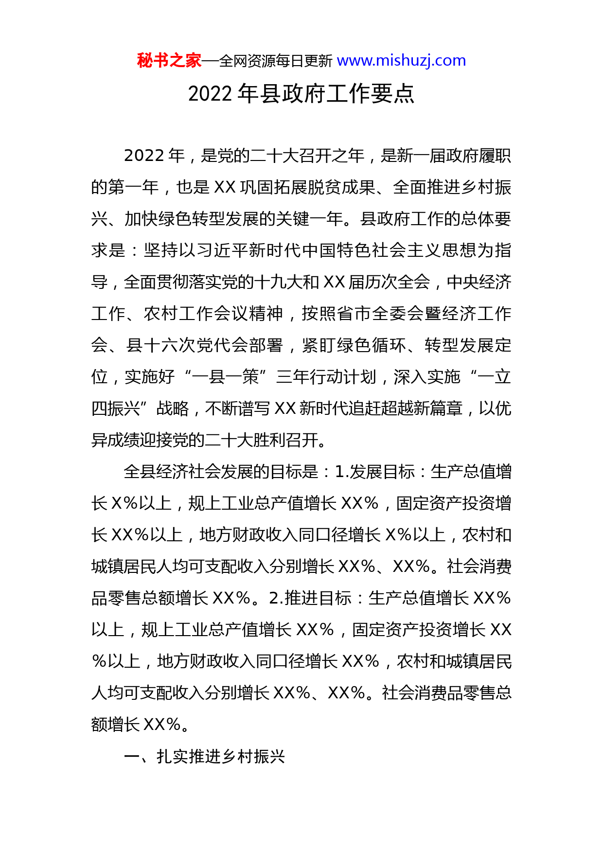 秘书之家—全网资源每日更新www.mishuzj.com2022年县政府工作要点2022年,是党的二十大召开之年,是新一届政府履职的第一年,也是XX巩固拓展脱贫成果、全面推进乡村振兴、加快绿色转型发展的关键一年。县政府工作的总体要求是:坚持以习近平新时代中国特色社会主义思想为指导,全面贯彻落实党的十九大和XX届历次全会,中央经济工作、农村工作会议精神,按照省市全委会暨经济工作会、县十六次党代会部署,紧盯绿色循环、转型发展定位,实施好“一县一策”三年行动计划,深入实施“一立四振兴”战略,不断谱写XX新时代追赶超越新篇章,以优异成绩迎接党的二十大胜利召开。全县经济社会发展的目标是:1.发展目标:生产总值增长X%以上,规上工业总产值增长XX%,固定资产投资增长XX%以上,地方财政收入同口径增长X%以上,农村和城镇居民人均可支配收入分别增长XX%、XX%。社会消费品零售总额增长XX%。2.推进目标:生产总值增长XX%以上,规上工业总产值增长XX%,固定资产投资增长XX%以上,地方财政收入同口径增长XX%,农村和城镇居民人均可支配收入分别增长XX%、XX%。社会消费品零售总额增长XX%。一、扎实推进乡村振兴秘书之家—全网资源每日更新www.mishuzj.com1.织密织牢防返贫防线。持续开展“六查六问”“一看一听”,完善预警监测、干预帮扶机制,落实好行业巩固帮扶政策,探索推进“防贫保”,坚决守住防止规模性返贫底线。整合财政涉农资金X亿元以上,重点支持产业发展。建立乡村振兴考核评价、工作年度报告和监督检查制度。加强扶贫资产管理和基础设施管护。落实好易地扶贫搬迁“1+7”扶持举措。2.多渠道促进农户增收。持续加大乡村振兴产业投入,坚持壮企业、富农户齐抓,建立更加紧密科学的利益联结和双向激励机制,强化小额信贷、互助资金和“富民贷”运行管理,大力推广农业商业保险,培育联农带农经营主体XX个。深化苏陕劳务协作,统筹发挥公益岗位、扶贫车间、社区工厂、消费帮扶等作用,多层次、多渠道促农增收。办好中国农民丰收节。3.实施乡村建设行动。严格落实耕地保护政策措施。编制41个村的“多规合一”实用性村庄规划。积极推进自然村道路硬化、农村电网改造升级、安全饮水提升工程。深入开展农村人居环境整治五年提升行动,继续推进入户路硬化、庭院美化行动,因地制宜改厕治污,新增改厕XXX座、新建农村污水处理设施XX处。大力推进“数字乡村”建设,快5G普及和场景应用。4.坚持示范引领推进。高质量建设徐家坪乡村振兴楷秘书之家—全网资源每日更新www.mishuzj.com模,在基础设施建设、发展产业增收、农村人居环境整治、基层社会治理等方面发挥好示范引领作用。每镇办选择1-2个村打造乡村振兴整村推进示范样板。出台村干部引领村集体经济发展激励考核制度。坚持“富口袋”“富脑袋”齐抓,深化“五治”融合和“网格化”治理,着力增强群众自我发展能力、提升综合治理水平。二、强化发展动力支撑5.全力推进项目建设。紧盯“四个一批”,建立包抓项目述责述效制度,逐月梳理问题、下沉指导服务、限时协调解决,缩短项目周期、压茬推进实施、保障投资额度。全年实施重点建设项目XX个、年度投资XX亿元以上。发挥好中央投资撬动作用,加快专项债券发行使用,全县固定资产投资增长XX%以上。6.增强谋划争跑能力。深度论证“十四五”规划重大项目,做实做细前期工作,提高项目谋划质量和申报成功率。健全完善项目争跑落实奖惩考核机制,争取更多项目列入上级投资计划。强化政策指导、考核调度、评审反馈机制,动态完善“谋划、储备、招引、在建、新开、投产”六张清单。全年谋划储备XXX万元以上项目XXX个,其中亿元以上项目XX个。7.扩大招引融资实效。不断优化提升营商环境,坚持全员抓招商引资,突出以商招商,建强专兼职招商队伍,建秘书之家—全网资源每日更新www.mishuzj.com立后备招商资源、招商项目储备库;完善招引项目行业政策联审、签约审查机制。积极推进“市带县”模式,增强县城投公司投融建能力。全面完成工业园区改革。落实好延期还本付息、信用贷款等政策,支持普惠小微企业发展,力争存贷比达到XX%以上。8.拓展人才供给渠道。支持县职教中心对接用人市场、拓展办学思路,与市场主体深化校企合作,整合师资和培训资源,订单培养城乡富余劳动力。开展好“企业家东部行、干部高校行”活动。加大乡村振兴、科教文卫、经济管理等领域紧缺人才自主培养力度。落实落细人才引进激励政策,加快落实事业单位职员等级晋升制度,加大干部关心关爱力度,充分激发各类人才活力。9.加大科技创新力度。建立健全“产业出题、科技答题”机制,推动产业链创新链双向融合。加快建立完善多元化科技创新投入体系,统筹配置各类创新资源,成立固废综合利用研究院,有效发挥秦创原创新驱动平台孵化载体作用。鼓励企业参与科技创新,加快延链补链强链。强化科技金融服务,加快科技创新成果应用。全年培育科技型中小企业XX家,实施科技项目X个。三、全链培育壮大产业10.大力发展现代农业。健全粮食安全保障体系,新建高标准农田X万亩,建成县级粮食储备库。坚持科技兴秘书之家—全网资源每日更新www.mishuzj.com农、品牌强农,建设标准化基地,健全农产品质量溯源和冷链物流体系。
