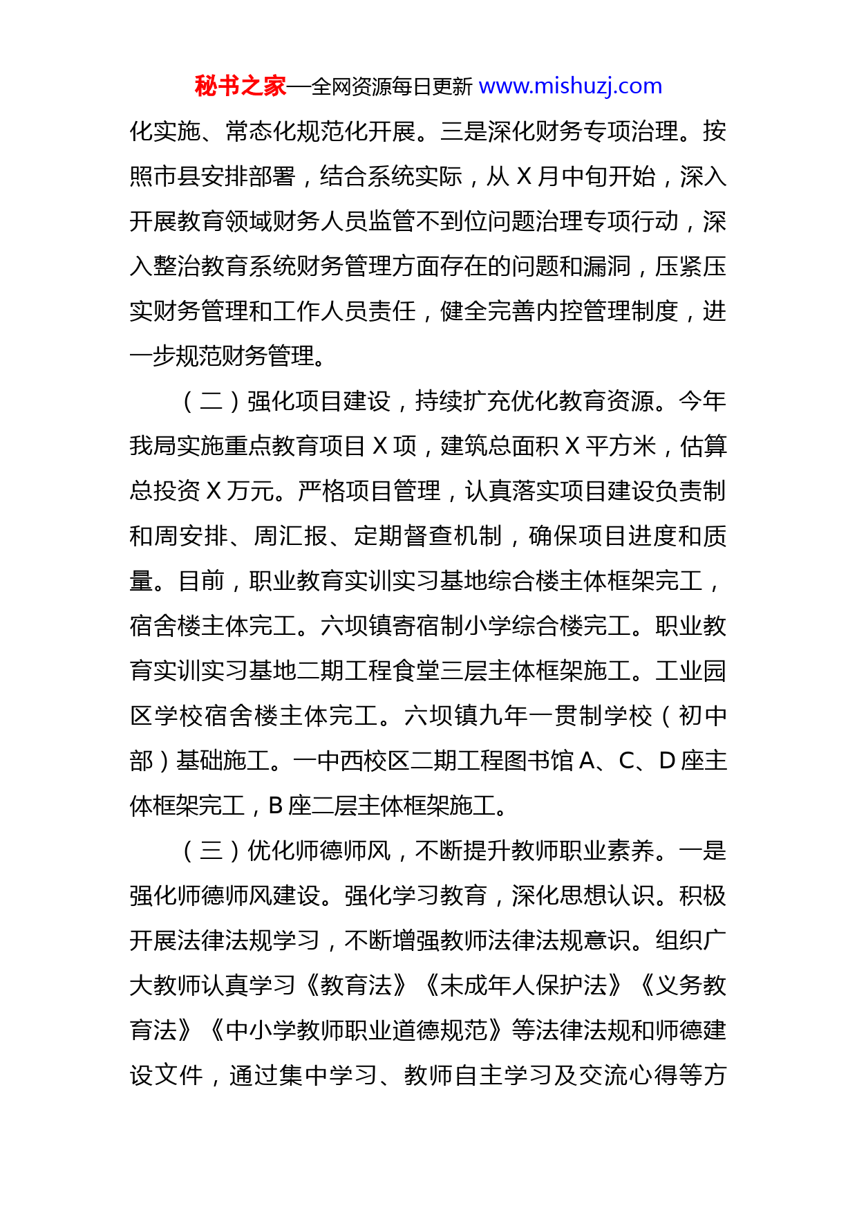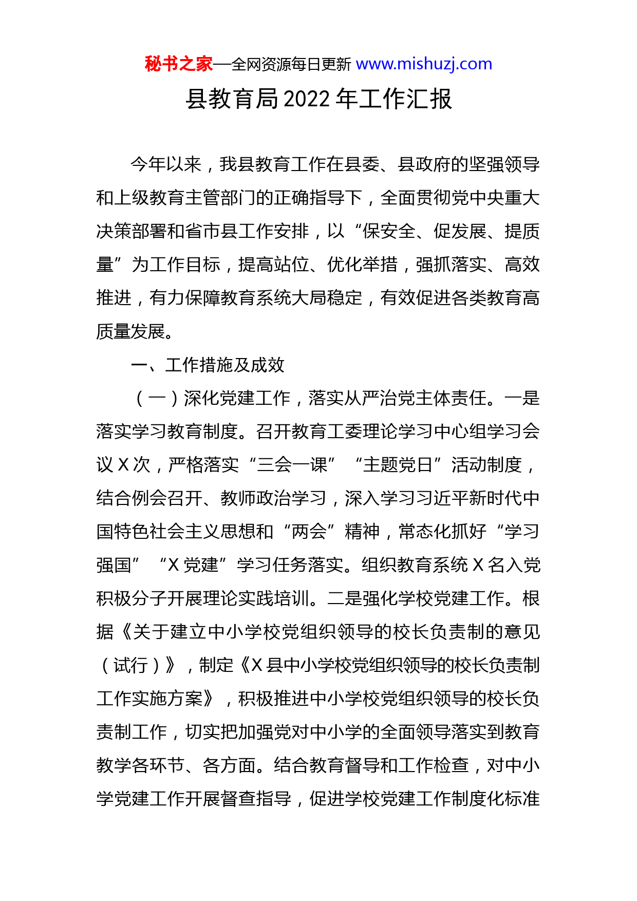 秘书之家—全网资源每日更新www.mishuzj.com县教育局2022年工作汇报今年以来,我县教育工作在县委、县政府的坚强领导和上级教育主管部门的正确指导下,全面贯彻党中央重大决策部署和省市县工作安排,以“保安全、促发展、提质量”为工作目标,提高站位、优化举措,强抓落实、高效推进,有力保障教育系统大局稳定,有效促进各类教育高质量发展。一、工作措施及成效(一)深化党建工作,落实从严治党主体责任。一是落实学习教育制度。召开教育工委理论学习中心组学习会议X次,严格落实“三会一课”“主题党日”活动制度,结合例会召开、教师政治学习,深入学习习近平新时代中国特色社会主义思想和“两会”精神,常态化抓好“学习强国”“X党建”学习任务落实。组织教育系统X名入党积极分子开展理论实践培训。二是强化学校党建工作。根据《关于建立中小学校党组织领导的校长负责制的意见(试行)》,制定《X县中小学校党组织领导的校长负责制工作实施方案》,积极推进中小学校党组织领导的校长负责制工作,切实把加强党对中小学的全面领导落实到教育教学各环节、各方面。结合教育督导和工作检查,对中小学党建工作开展督查指导,促进学校党建工作制度化标准秘书之家—全网资源每日更新www.mishuzj.com化实施、常态化规范化开展。三是深化财务专项治理。按照市县安排部署,结合系统实际,从X月中旬开始,深入开展教育领域财务人员监管不到位问题治理专项行动,深入整治教育系统财务管理方面存在的问题和漏洞,压紧压实财务管理和工作人员责任,健全完善内控管理制度,进一步规范财务管理。(二)强化项目建设,持续扩充优化教育资源。今年我局实施重点教育项目X项,建筑总面积X平方米,估算总投资X万元。严格项目管理,认真落实项目建设负责制和周安排、周汇报、定期督查机制,确保项目进度和质量。目前,职业教育实训实习基地综合楼主体框架完工,宿舍楼主体完工。六坝镇寄宿制小学综合楼完工。职业教育实训实习基地二期工程食堂三层主体框架施工。工业园区学校宿舍楼主体完工。六坝镇九年一贯制学校(初中部)基础施工。一中西校区二期工程图书馆A、C、D座主体框架完工,B座二层主体框架施工。(三)优化师德师风,不断提升教师职业素养。一是强化师德师风建设。强化学习教育,深化思想认识。积极开展法律法规学习,不断增强教师法律法规意识。组织广大教师认真学习《教育法》《未成年人保护法》《义务教育法》《中小学教师职业道德规范》等法律法规和师德建设文件,通过集中学习、教师自主学习及交流心得等方秘书之家—全网资源每日更新www.mishuzj.com式,进一步深化全体教师对教师职业道德规范的认识;将师德教育作为教师培训的必修内容,切实加强对教师队伍的职业道德教育,全县教师法律意识进一步增强,依法执教、依法施教意识显著提升。加强教育警示,增强行动自觉。召开教育系统“清廉校园”建设、教职员工酒驾醉驾赌博失信违纪违法问题集中整治工作安排部署会议暨警示教育大会,通报教育系统违纪违法典型案件,签订《X县教职员工拒绝酒驾醉驾赌博失信承诺书》《X县中小学幼儿园师德师风承诺书》,组织教师开展自查自纠,进一步强化广大教职工师德规范和道德意识。二是推动教师素养提升。加强教师培训,组织教师参加“国培计划(X)”—X市中学历史课骨干教师能力提升培训、小学幼儿园教师培训团队研修项目、全市学前教育课程实施与管理培训等线上线下培训X人次。强化教研教改,开展X年全市小学幼儿园“四新”送教送培“国培计划(X)”—X市送教下乡培训项目X县小学幼儿园送教下乡培训成果展示活动暨X县第六届“名师讲堂”活动、英语“情景式”教学为主题等城乡联盟一体化联片教研活动等,X名教师参加各项教研活动;成立X市大中小学思想政治理论课名师工作室X个,X项思政课题被确定为X省教育科学“十四五”规划X年度学校思想政治工作专项课题,X项课题被省社科联确定为省级资助课题,X项课题被确定为X省教育科学“十四秘书之家—全网资源每日更新www.mishuzj.com五”规划X年度“一带一路”教育国际合作交流专项研究课题。(四)强化质量管理,各类教育健康优质发展。加强幼儿园晋等升级,对拟晋等升级省级示范性幼儿园、省级一类幼儿园和市级标准化幼儿园的X所幼儿园开展县级初评,建立落实包点领导驻点指导、定期督查、全面推动工作机制,切实做好创建相关工作。坚持“以城带乡、以强带弱”“城乡携手、同步提升”,落实幼儿园和中小学定期结对帮扶机制,深化“校对校”对口帮扶,有力推动城乡教育一体化发展、同质化提升。继续发挥诊断考试监测功能,组织初三联考,开展学科研讨,加强校际交流,坚持问题导向,及时查漏补缺,提升复习效率,提高中考复习成效。加强高考备考研考,加强学科教学研究,提升教师“研究课程、引领学生、改革教学”水平,举办高考复习研讨,提升备考质量,着力提高教育质量。严格落实工作要求,认真做好组考工作,普高、职高和中考安全顺利进行。(五)落实教育政策,确保学生公平接受教育。一是巩固义务教育控辍保学成果。按照《X县关于实现巩固拓展脱贫攻坚成果同乡村振兴有效衔接的实施方案》要求,持续抓好控辍保学工作,落实联控联